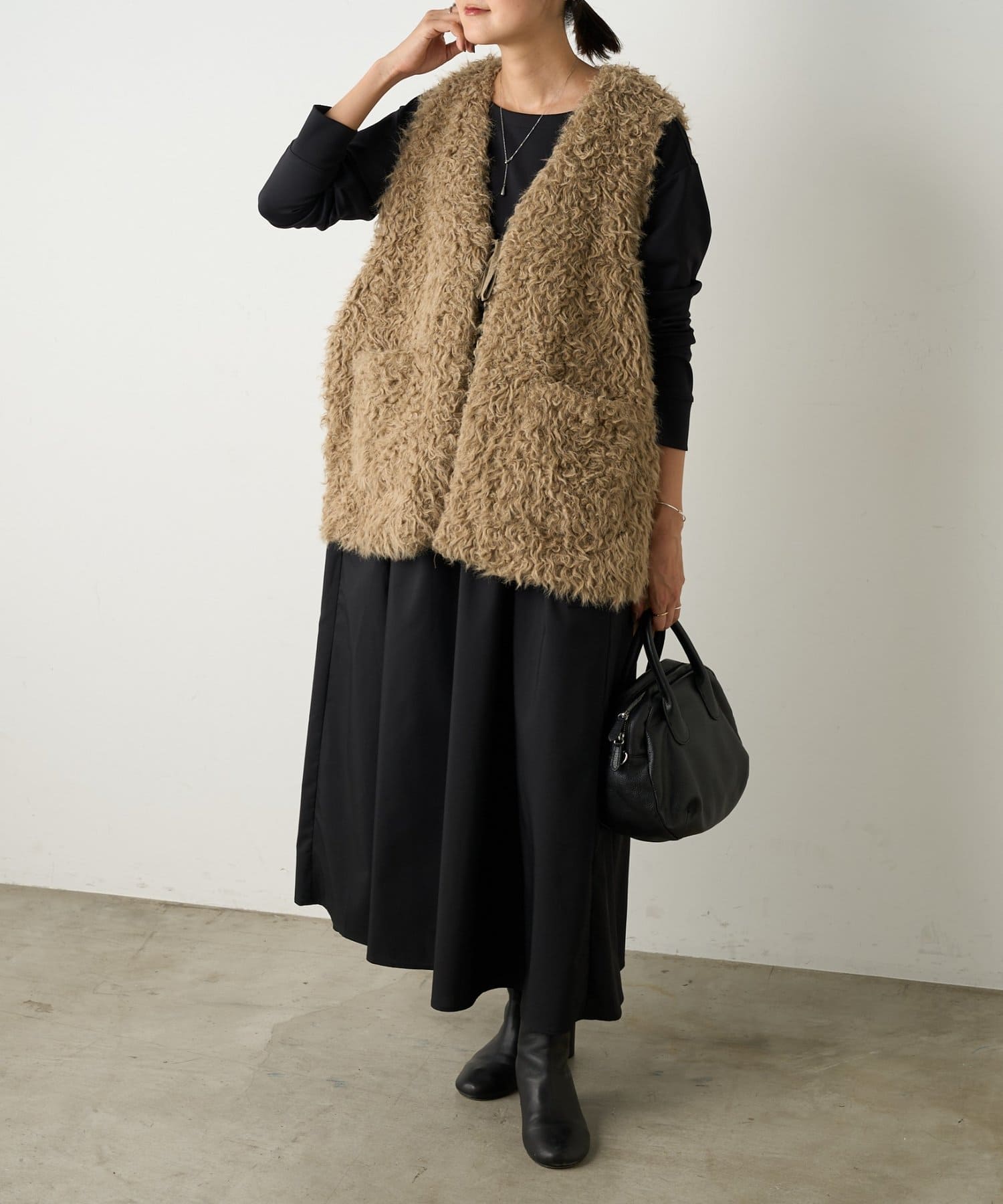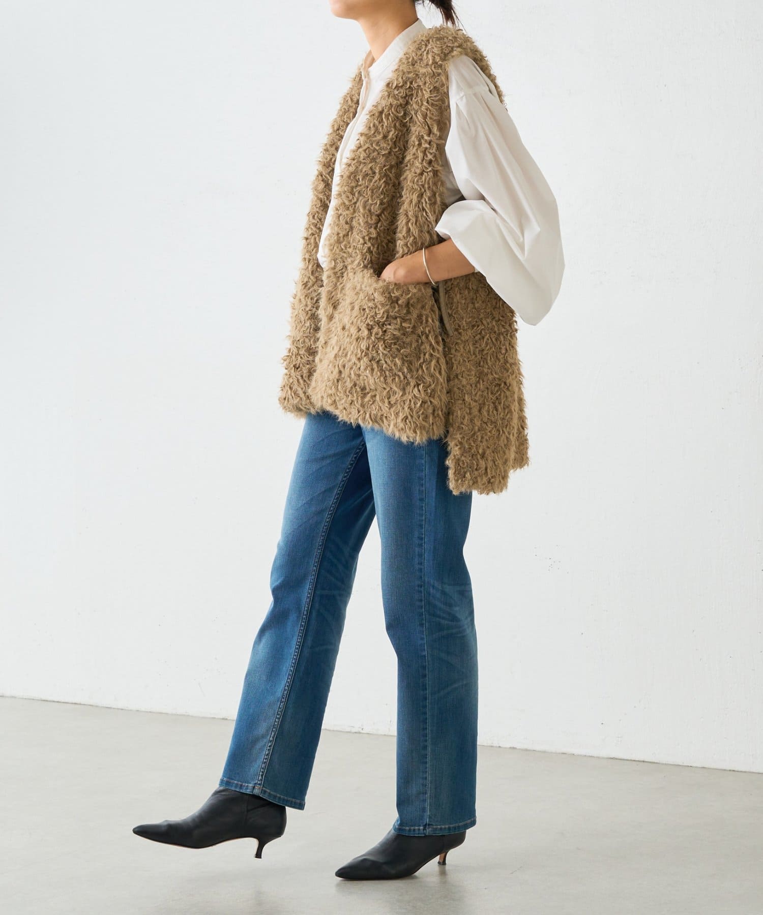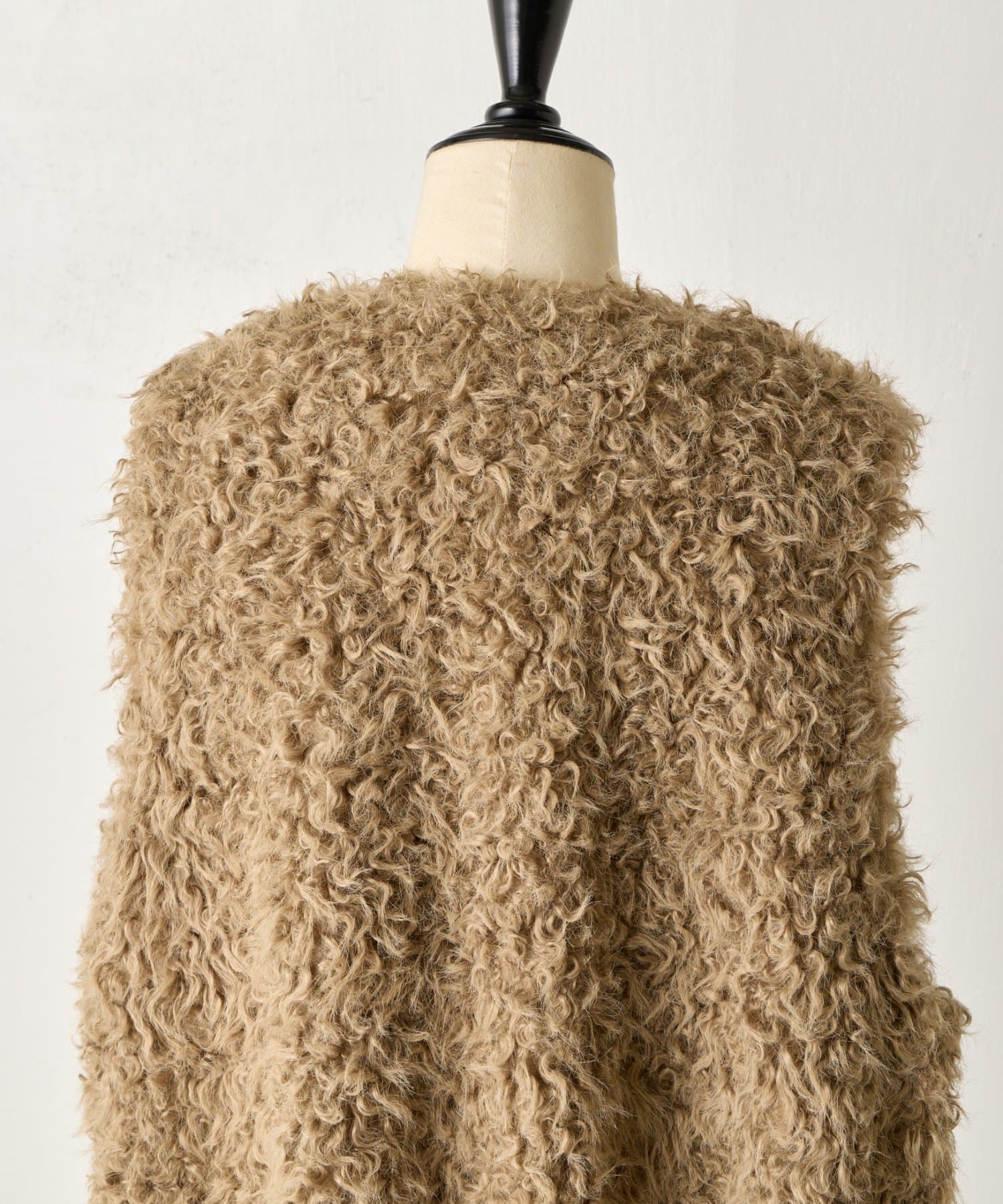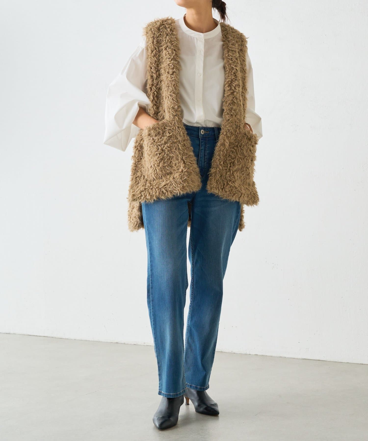 ふんわりとカールしたフェイクファー素材で、季節感と程よい存在感を演出する大人カジュアルなベスト。