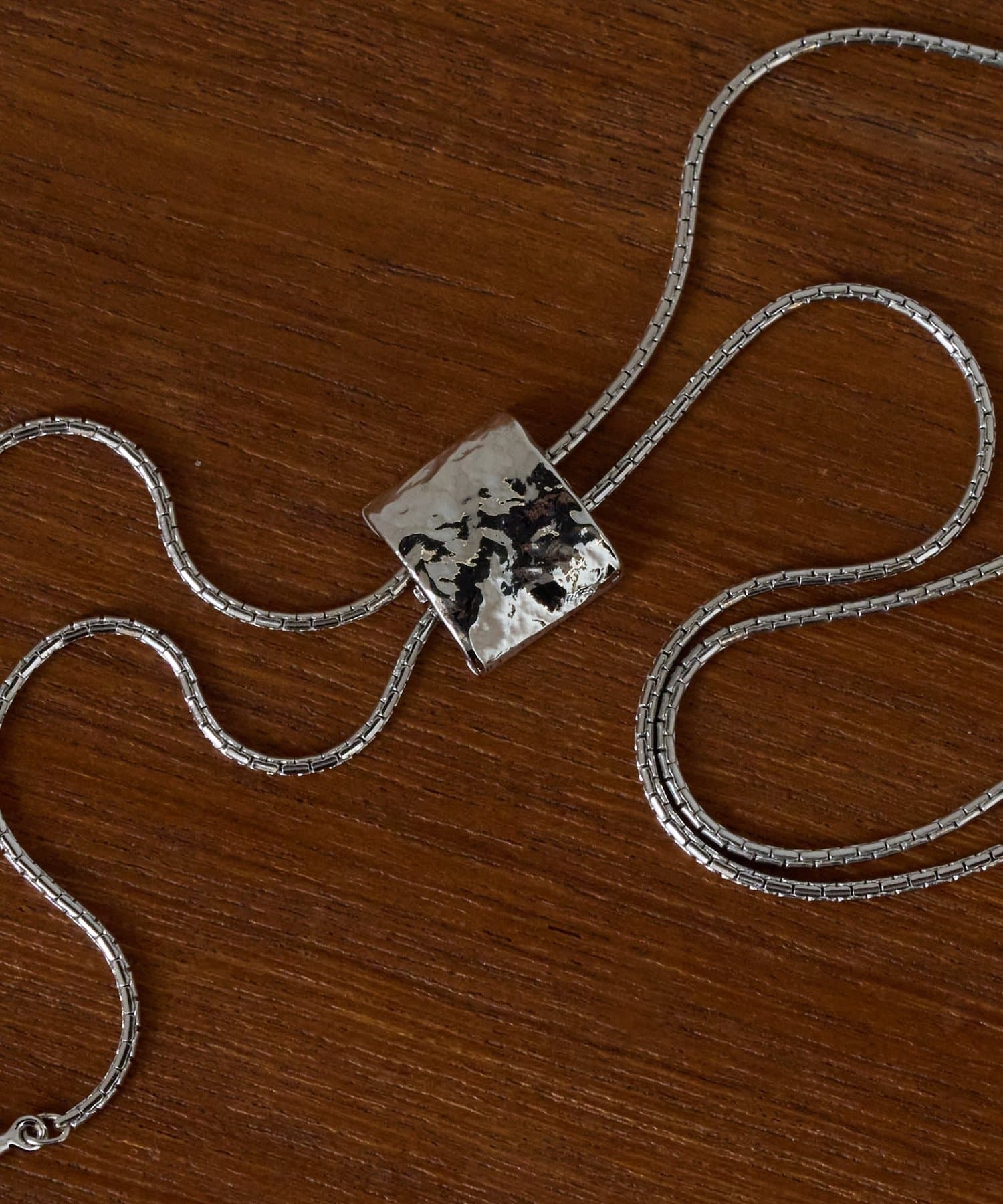 スクエア型のスライダーパーツで長さを自在に調整でき、幅広いスタイリングに合わせやすいデザインです。