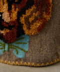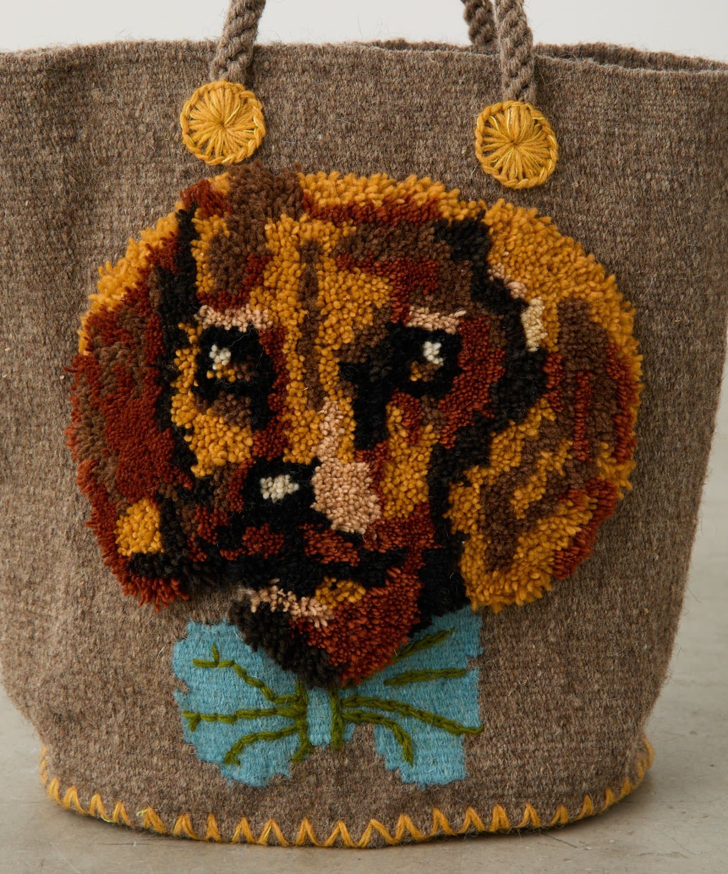 ふっくらと立体的なパンチニードル刺繍で犬の表情を描いた、存在感たっぷりのバッグです。