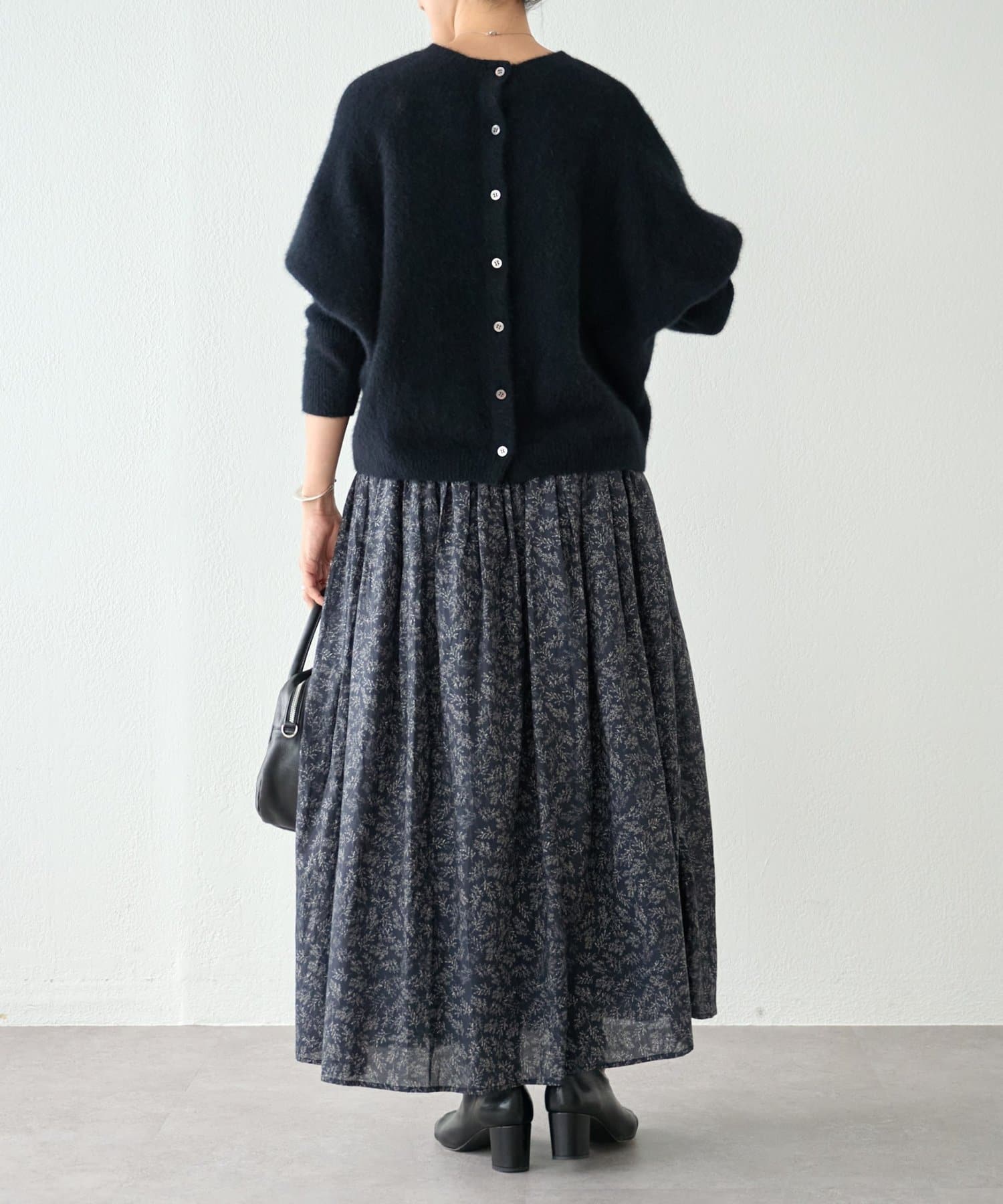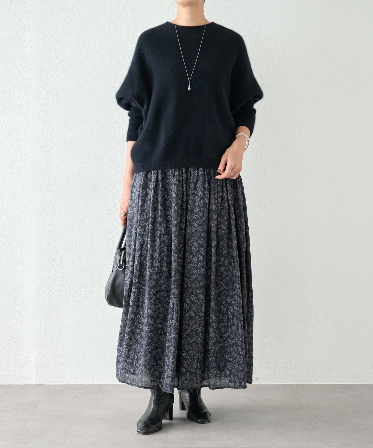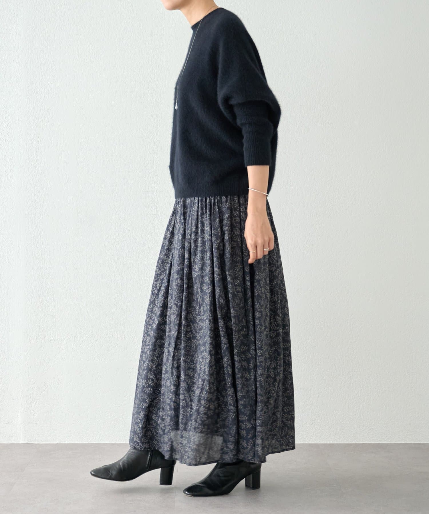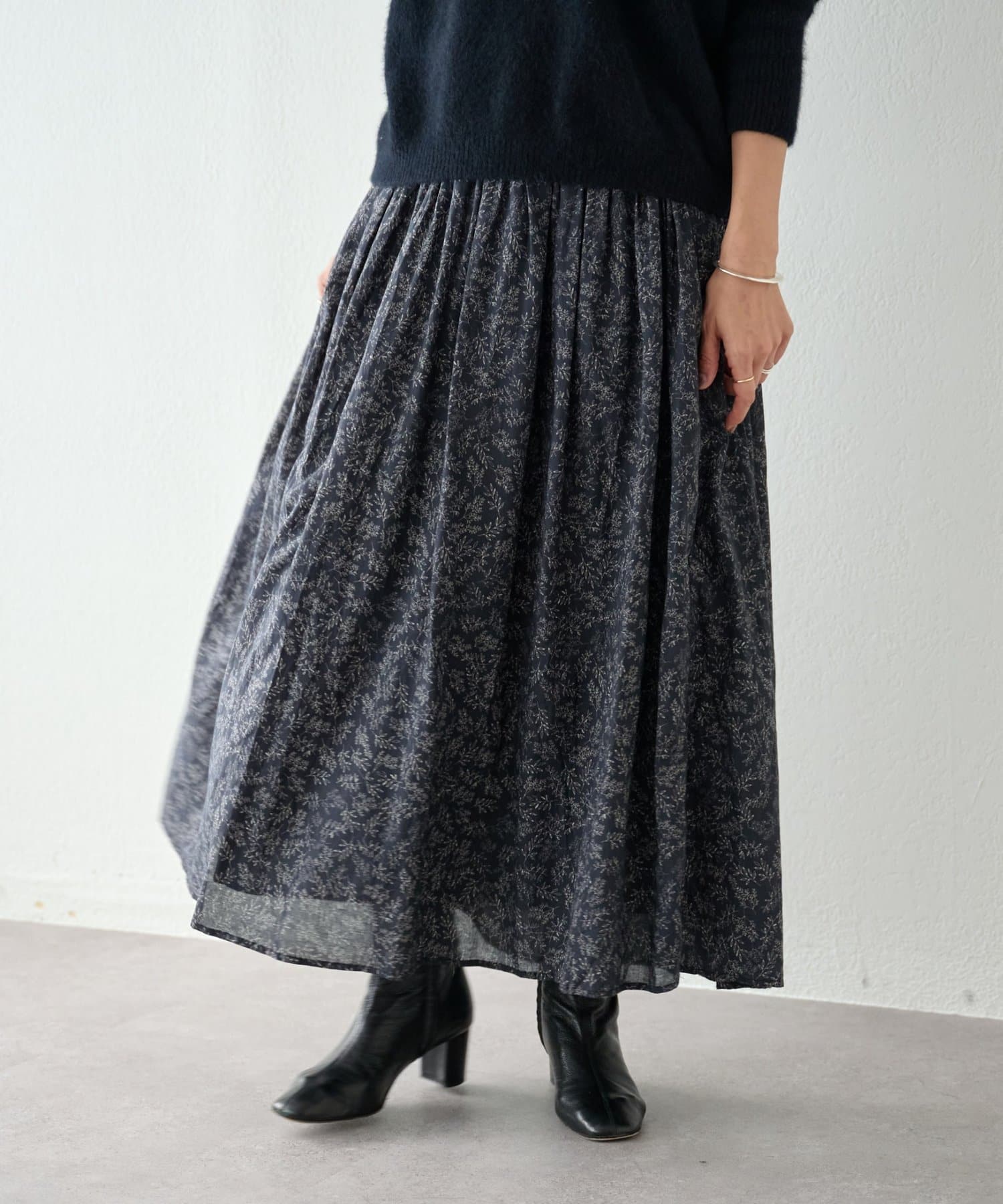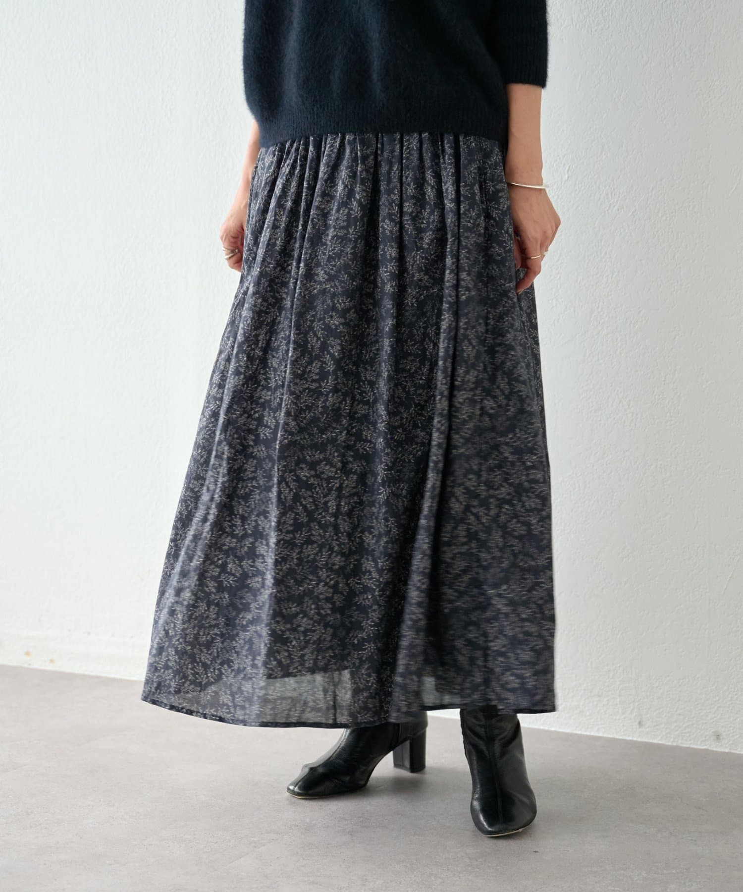 程よい大きさのリーフプリントが、上品な印象で着られるロングスカート。