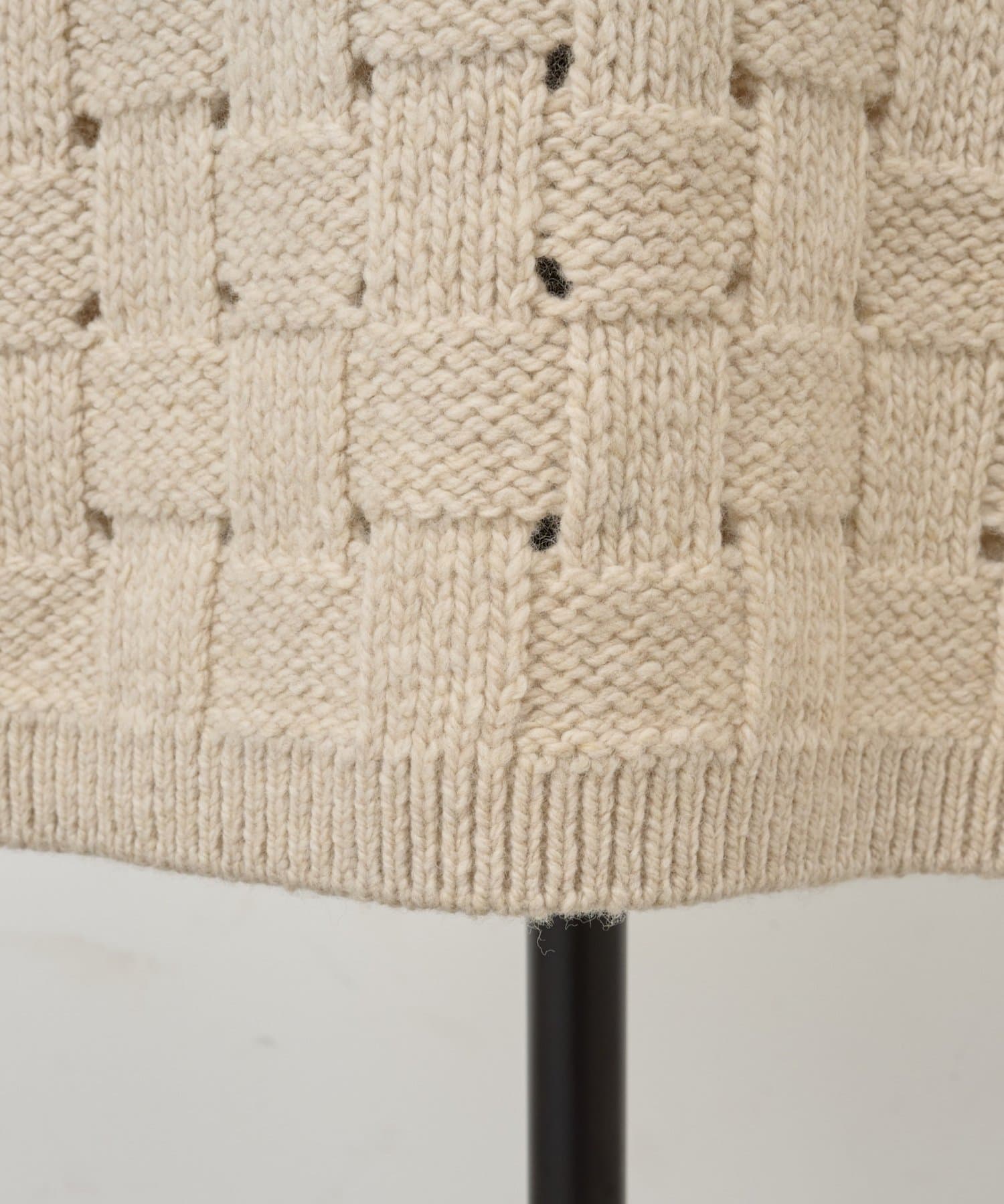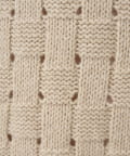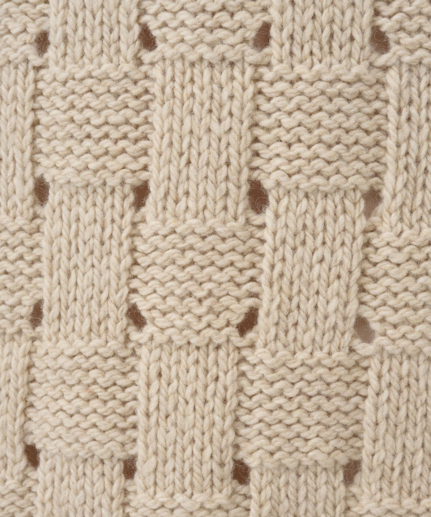 表目と裏目を交互に組み合わせた「かご目編み」が、立体感のある編地を生み出し、存在感のある一枚に仕上がっています。