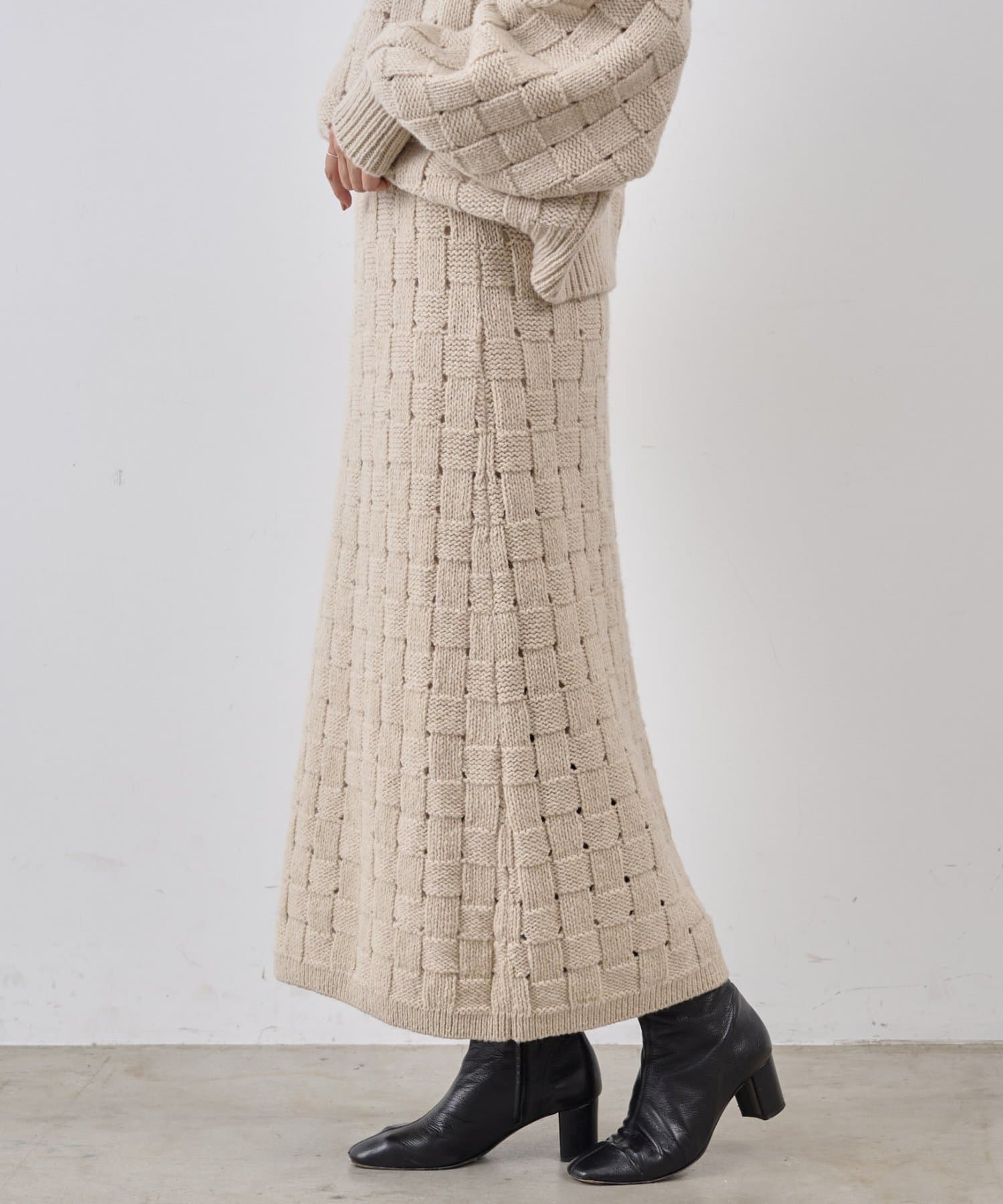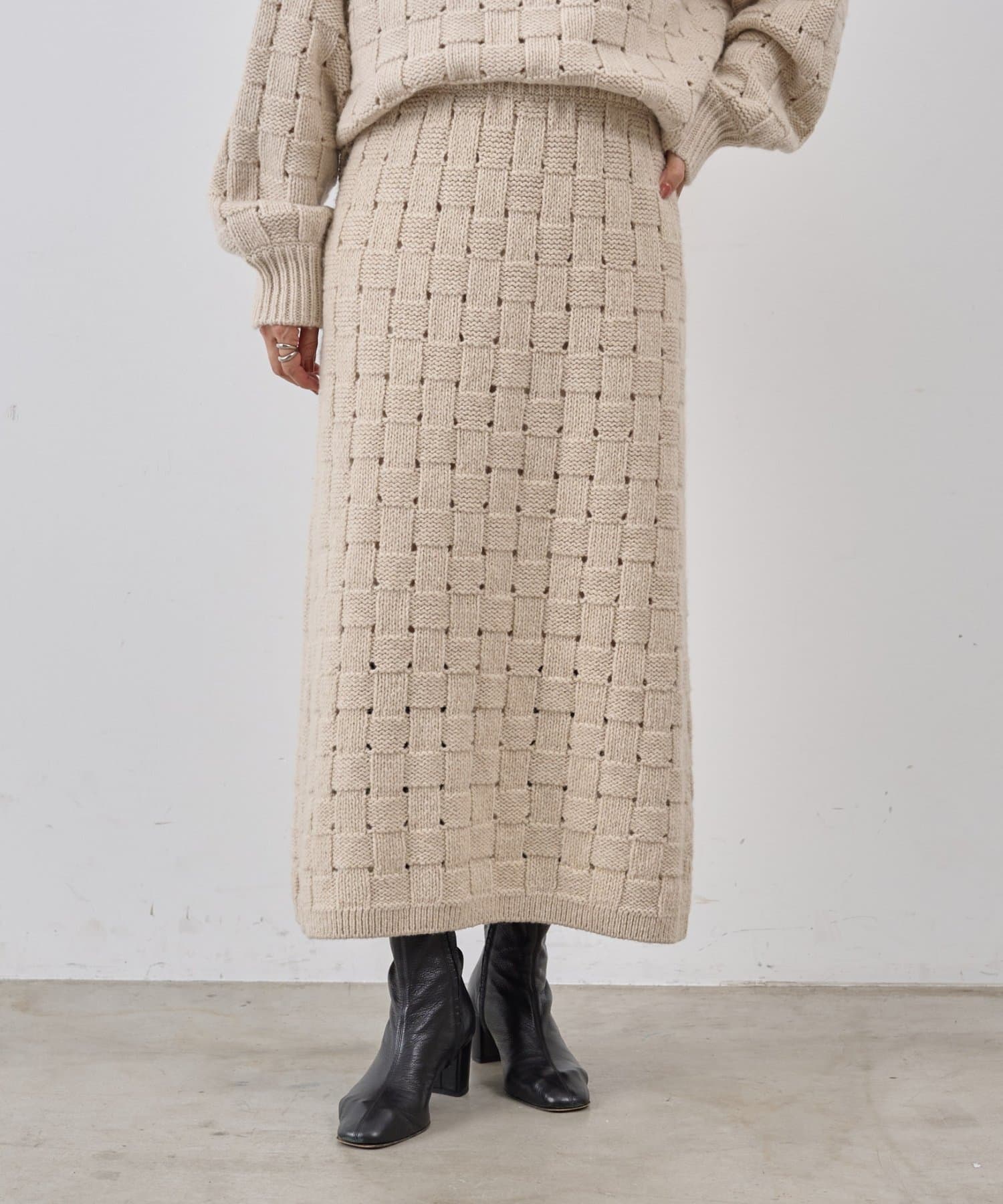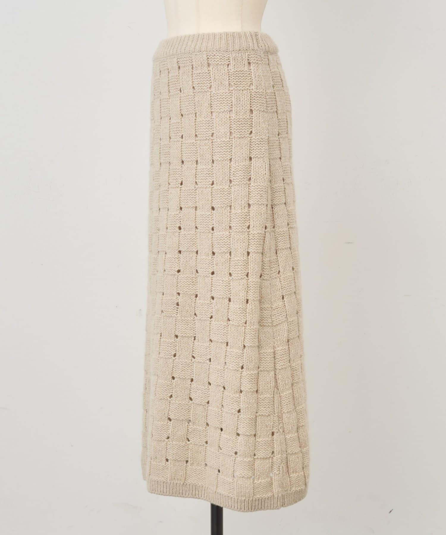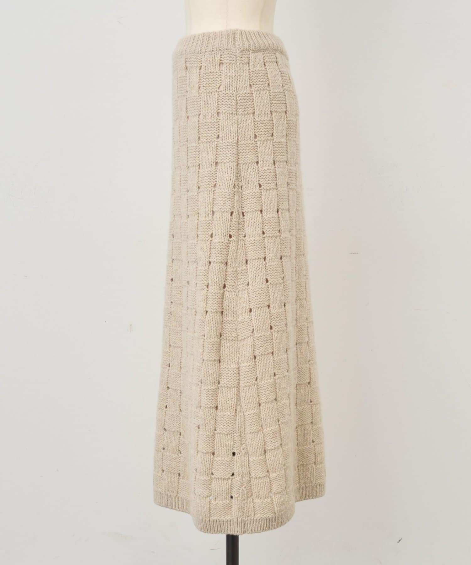 まるでバスケットのような網目が魅力のニットスカート。
