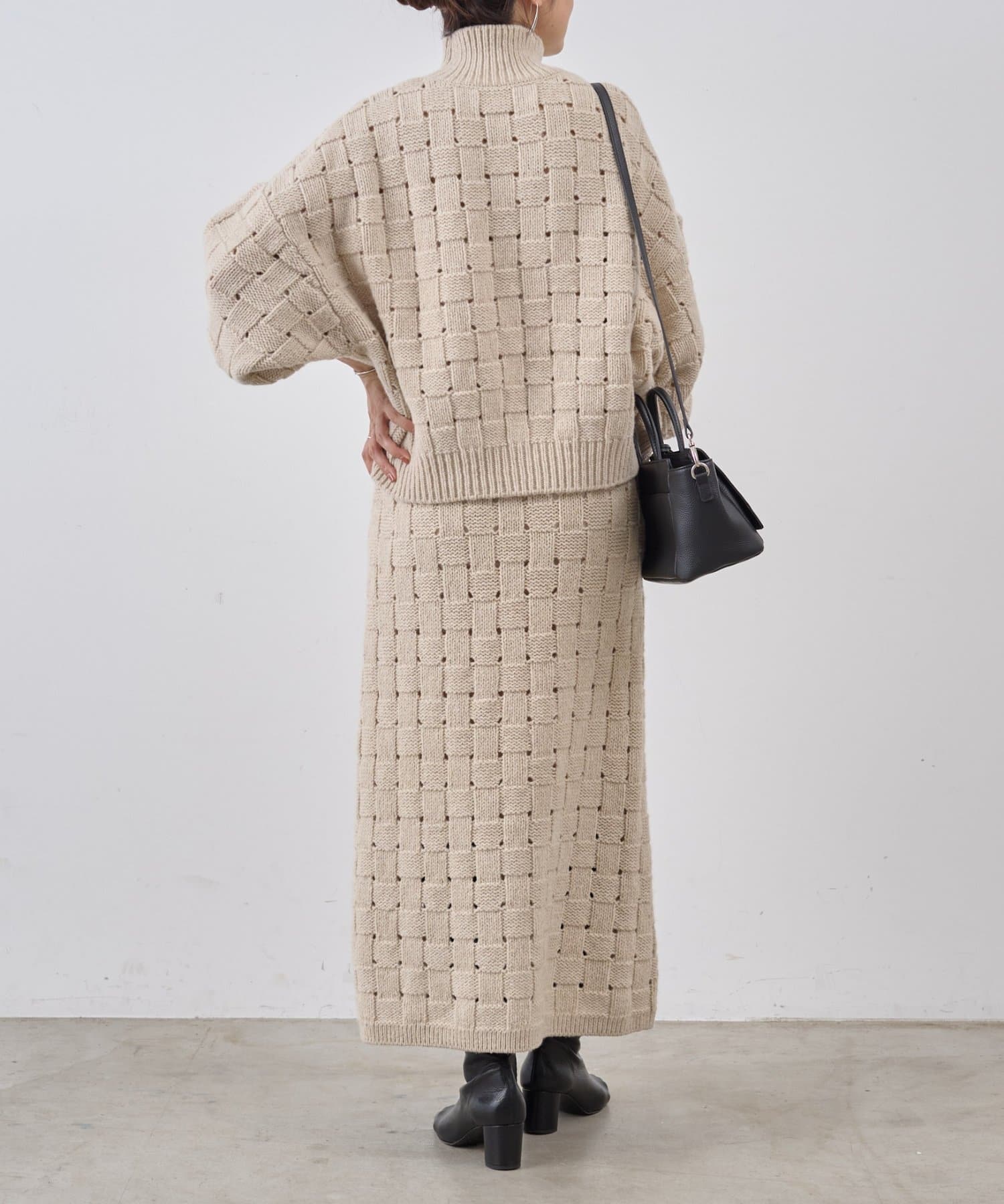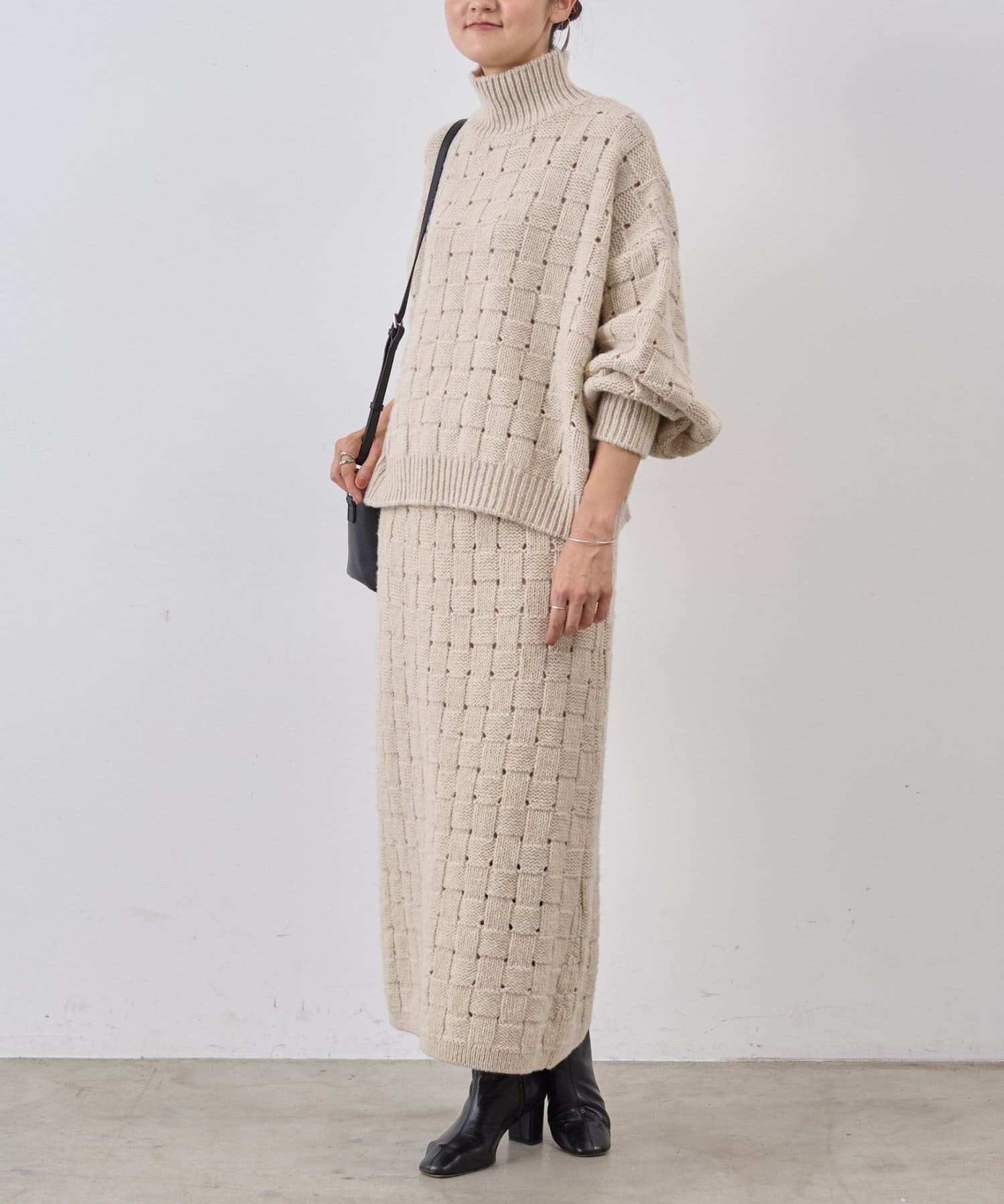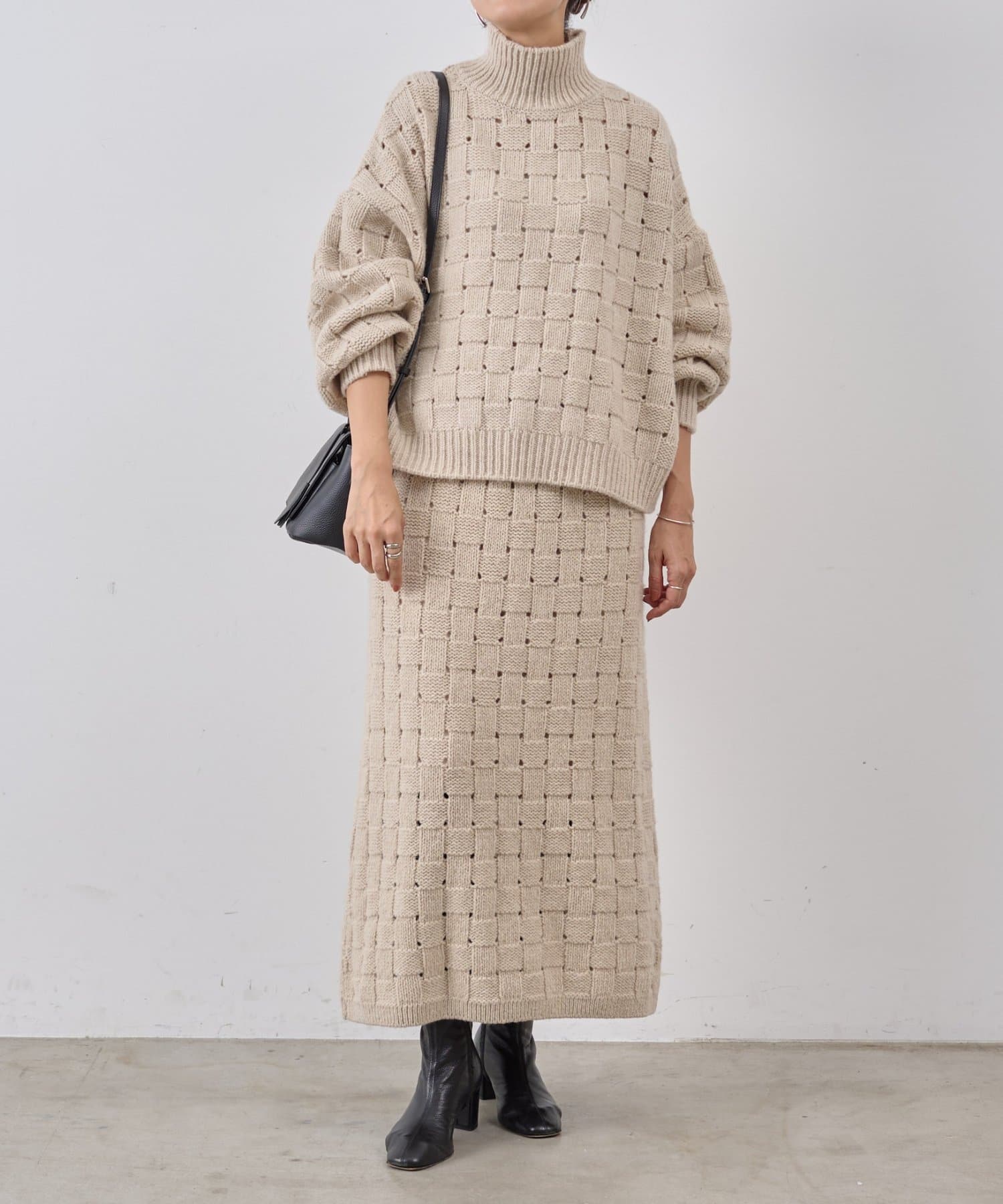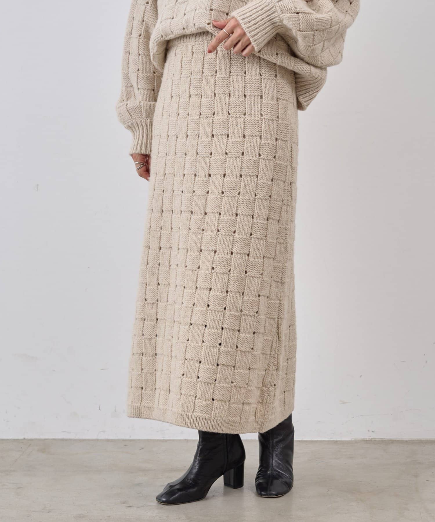 まるでバスケットのような網目が魅力のニットスカート。