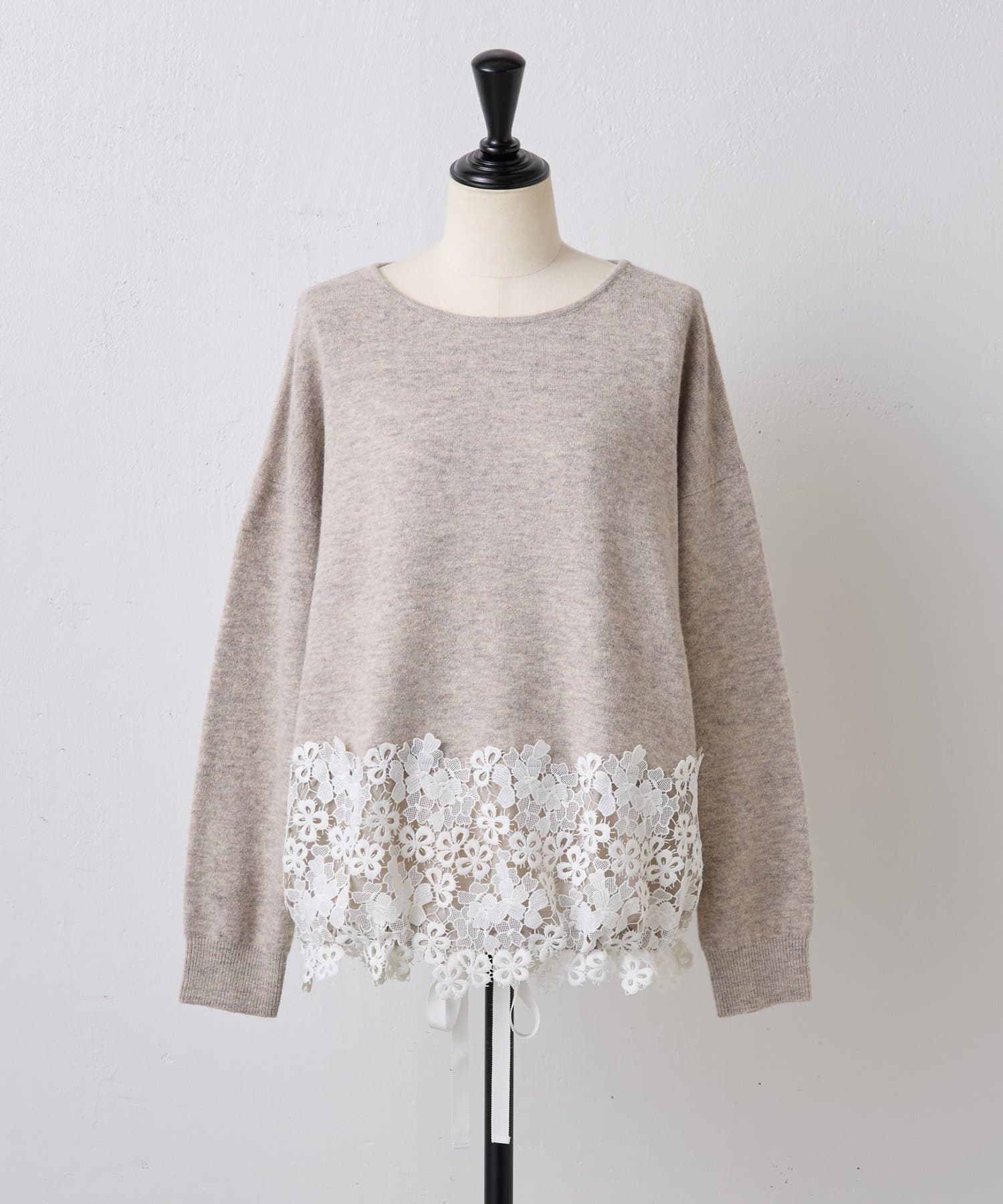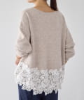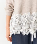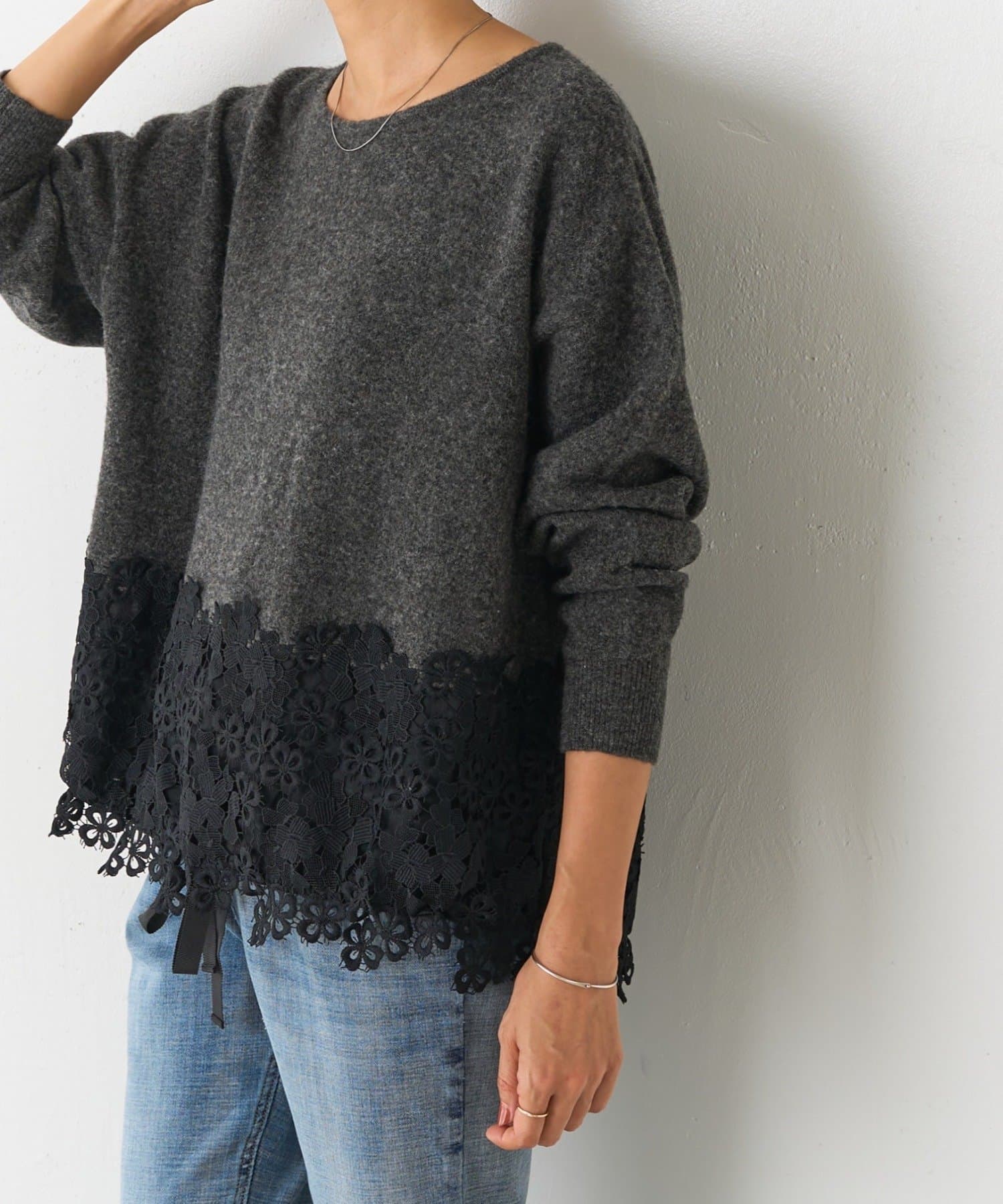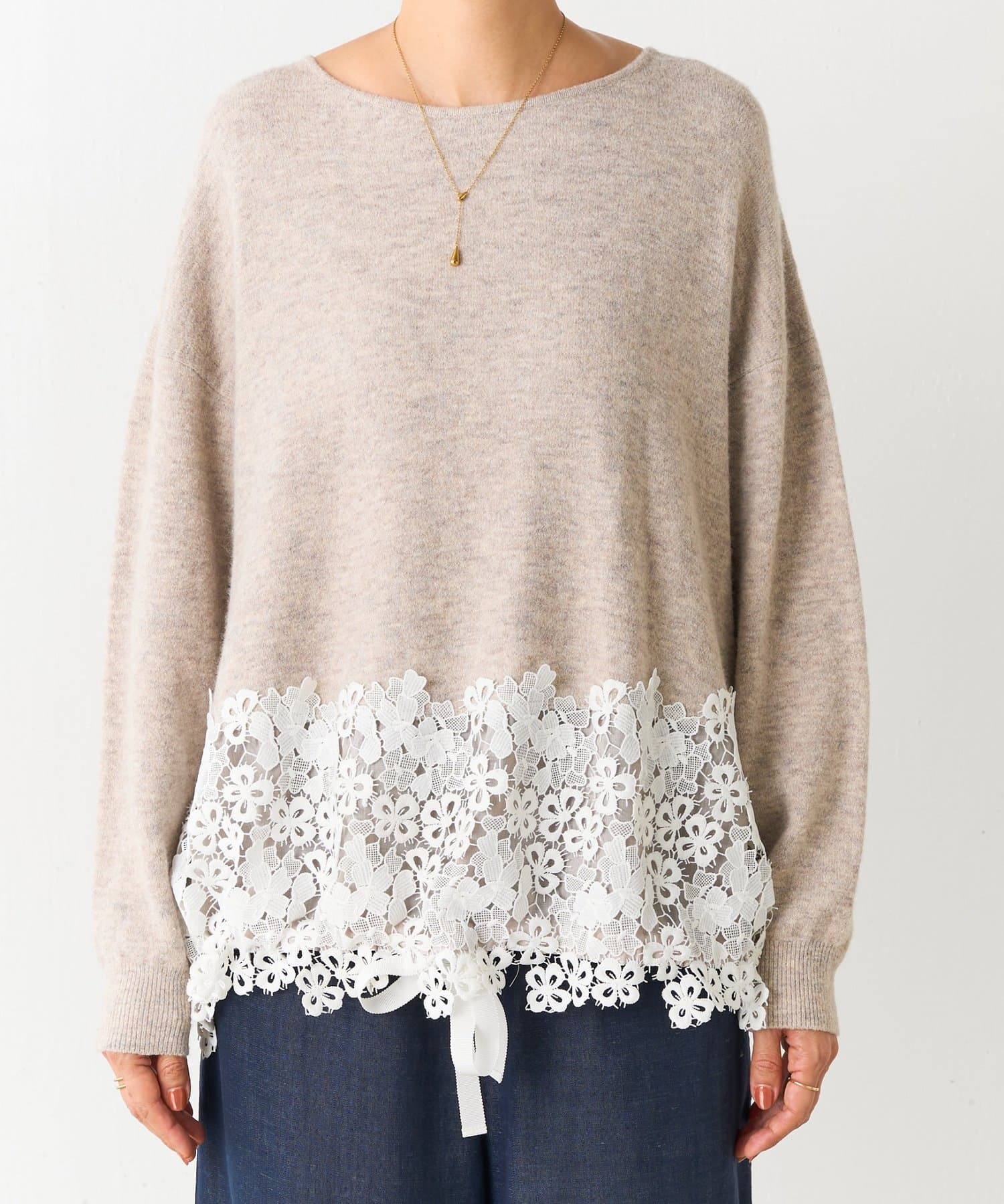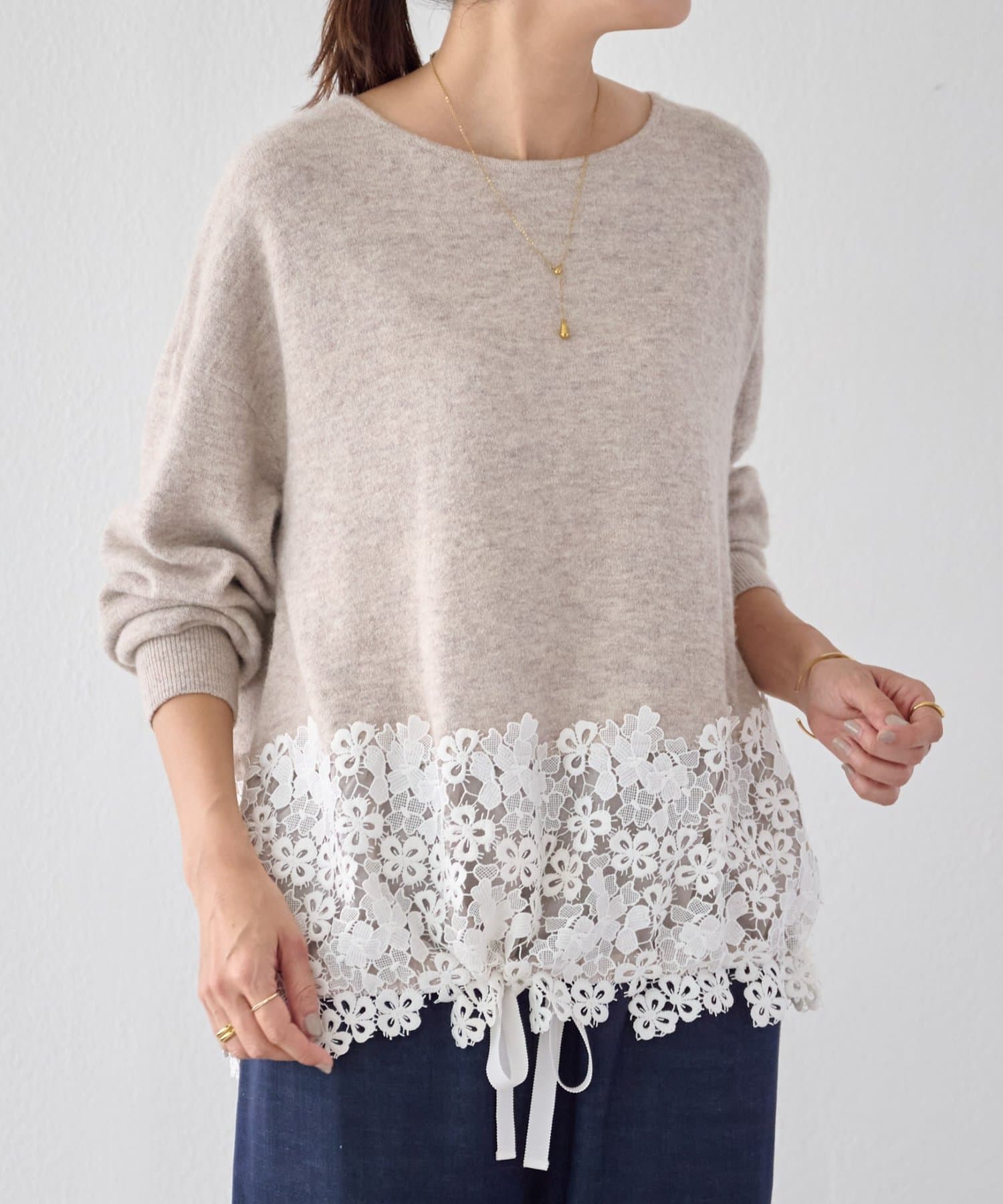 裾に繊細なレースをあしらった、上品な印象のニットプルオーバー。