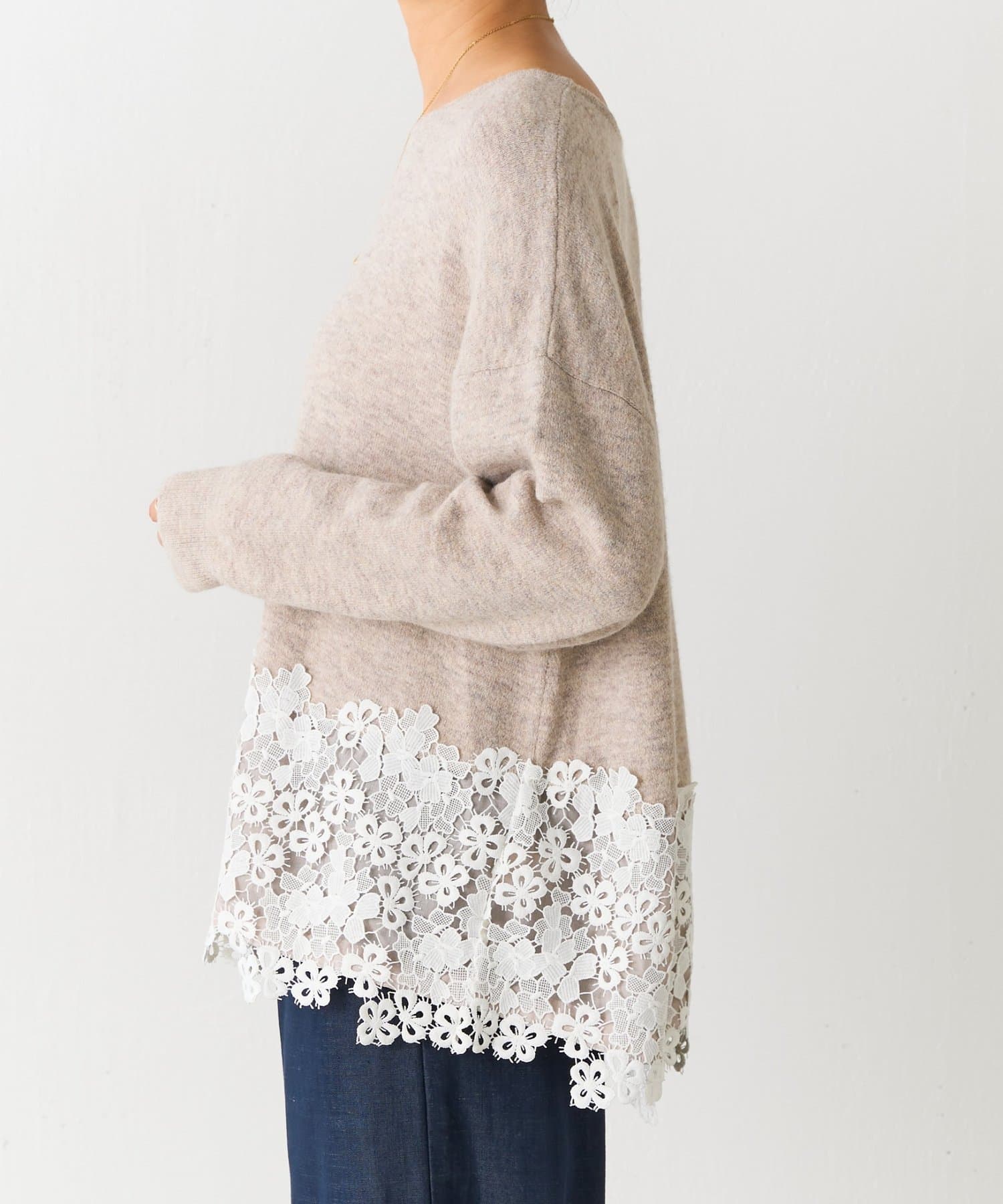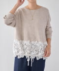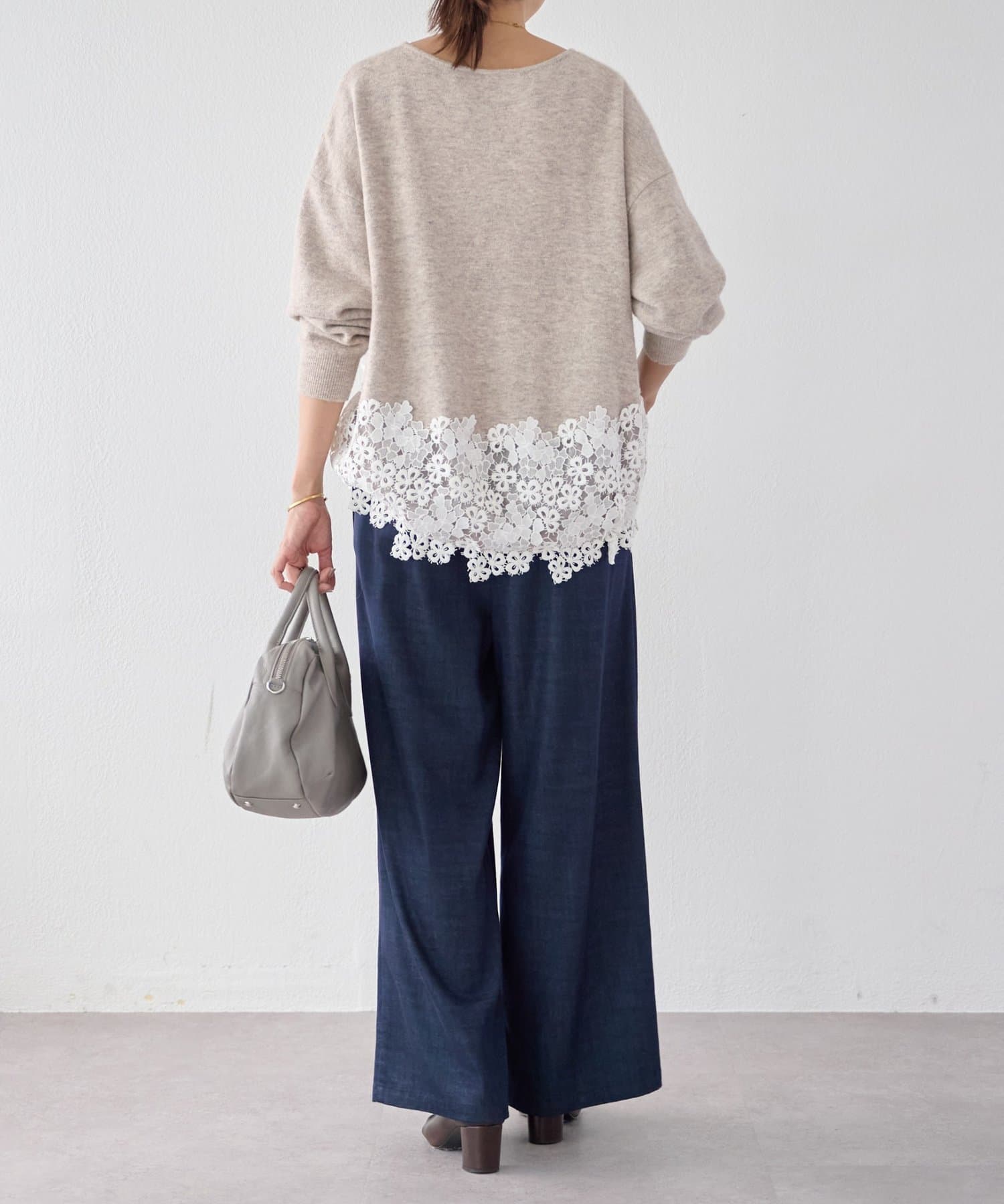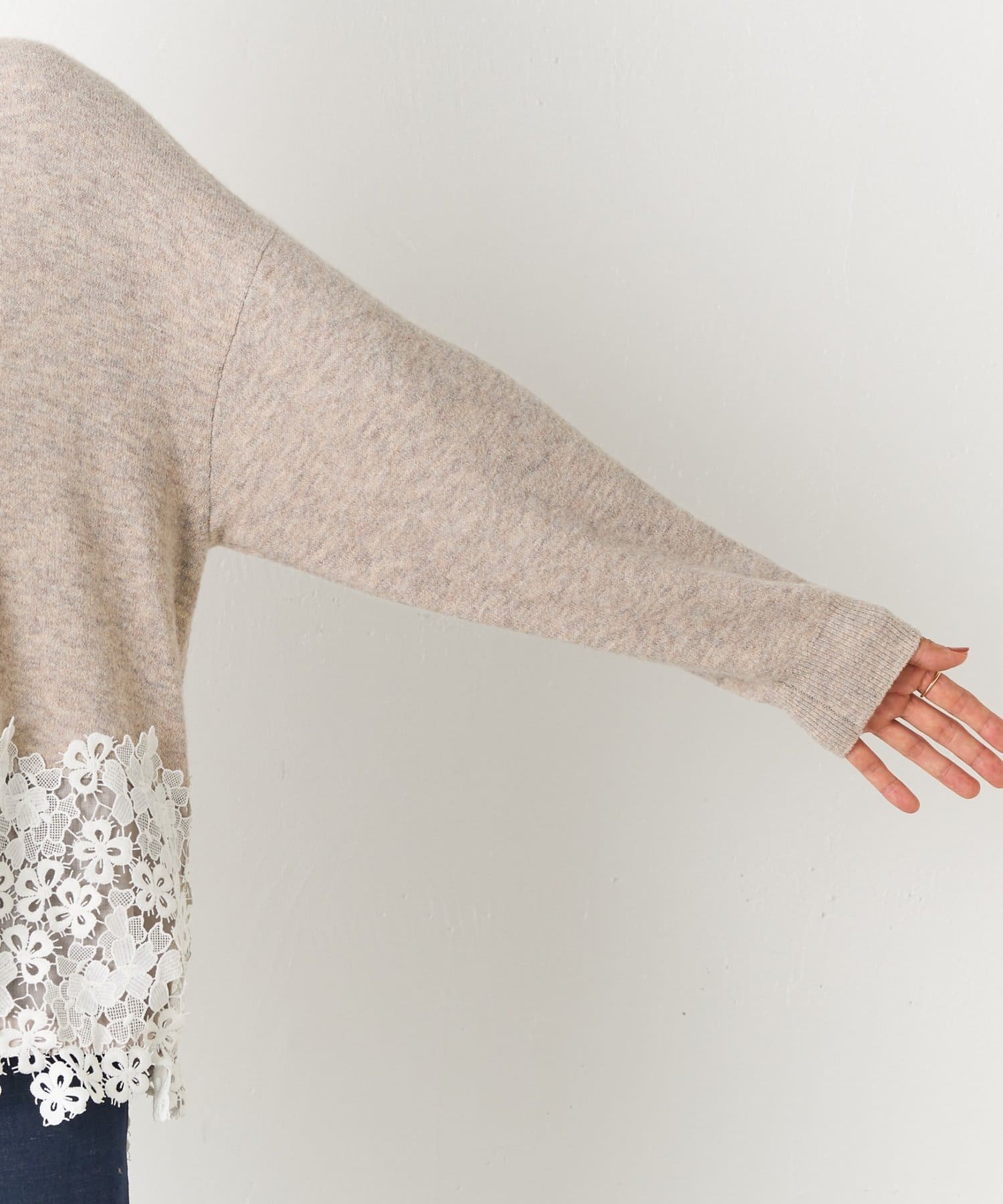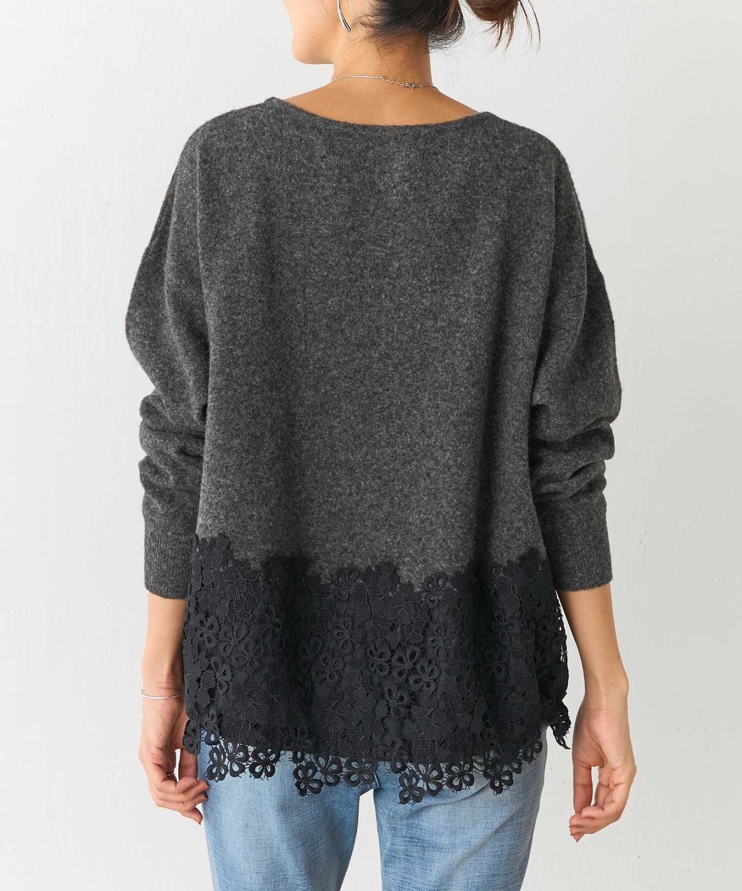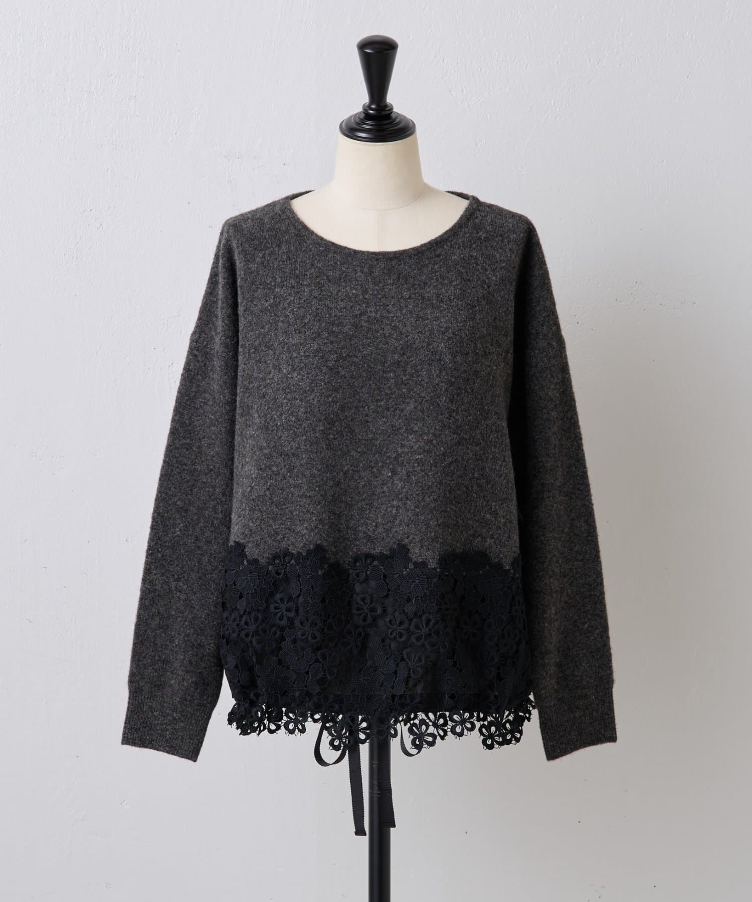 裾に繊細なレースをあしらった、上品な印象のニットプルオーバー。
