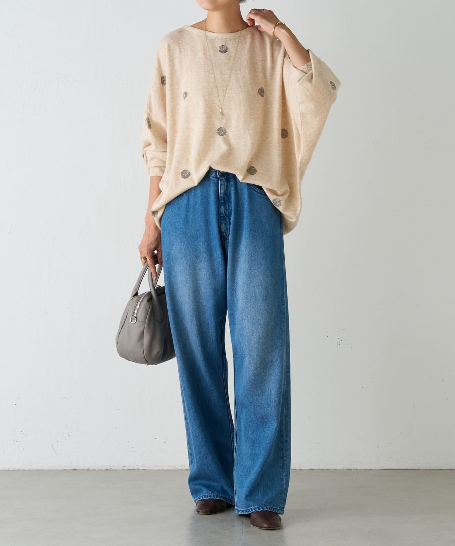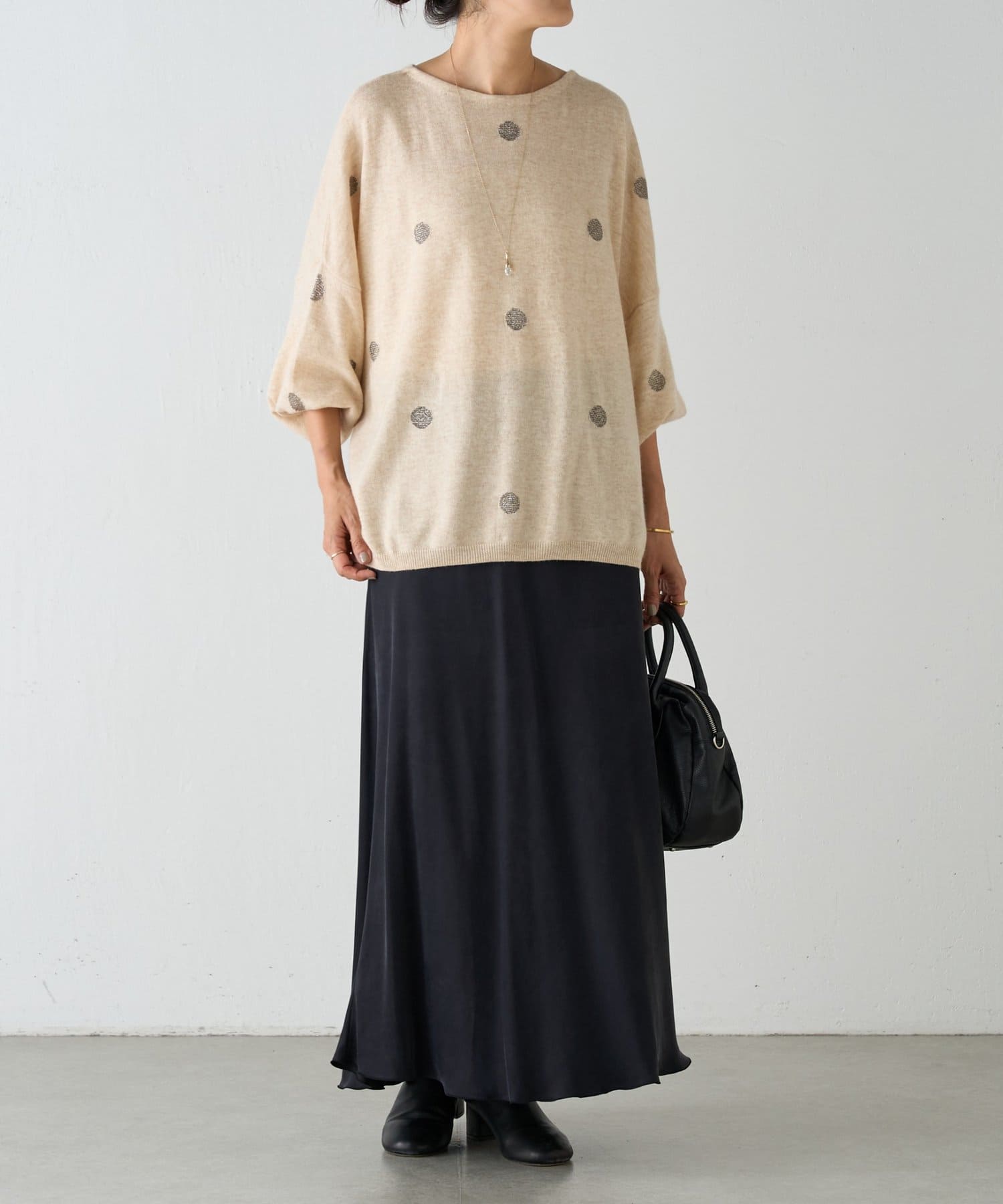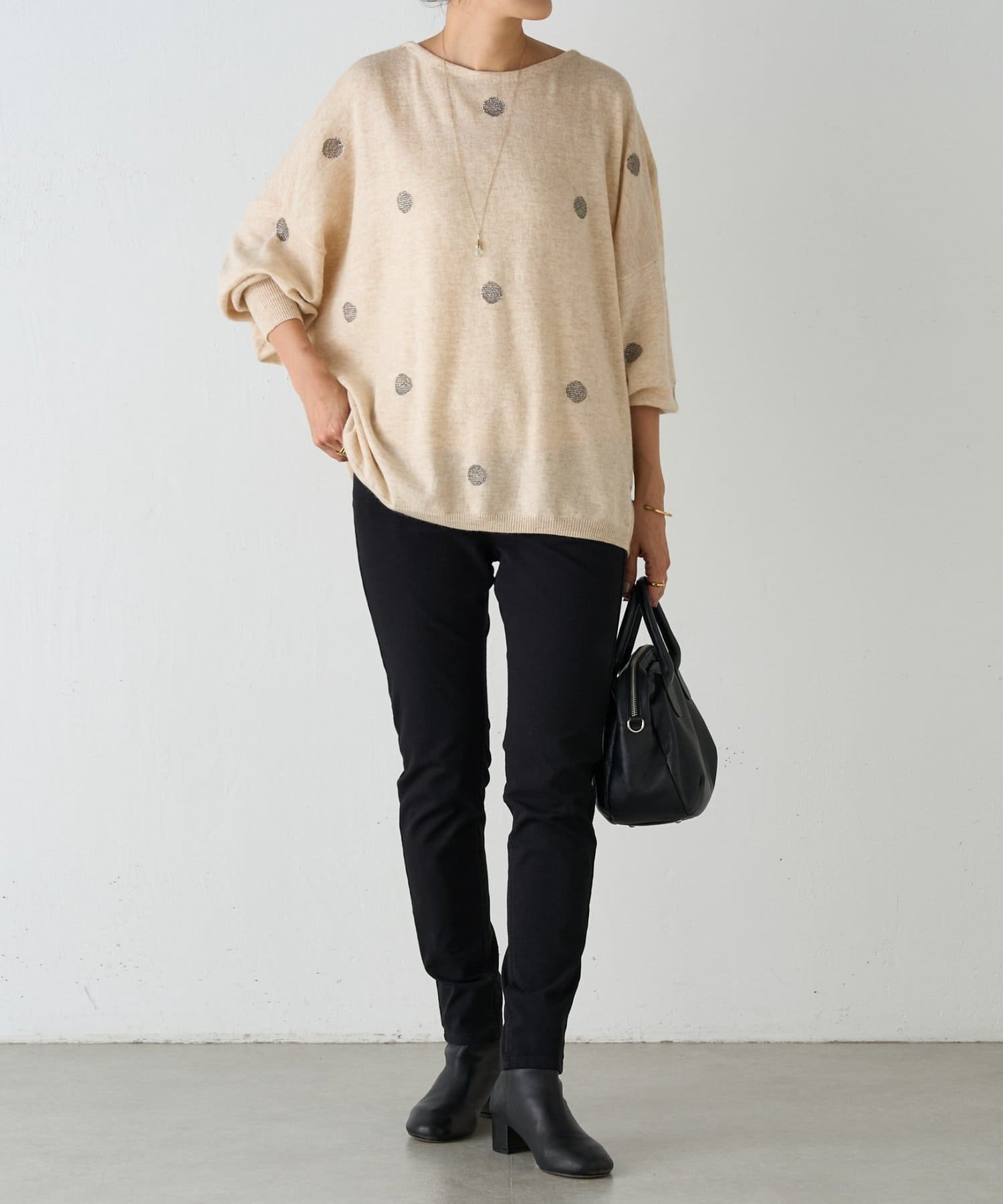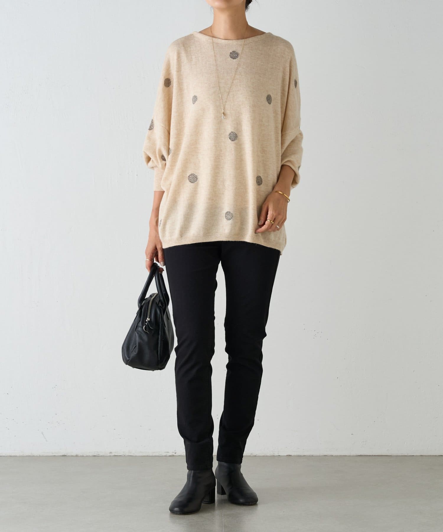 ラメの控えめなニュアンスが、ニットのやさしい印象を引き立てます。