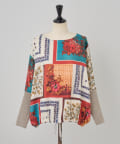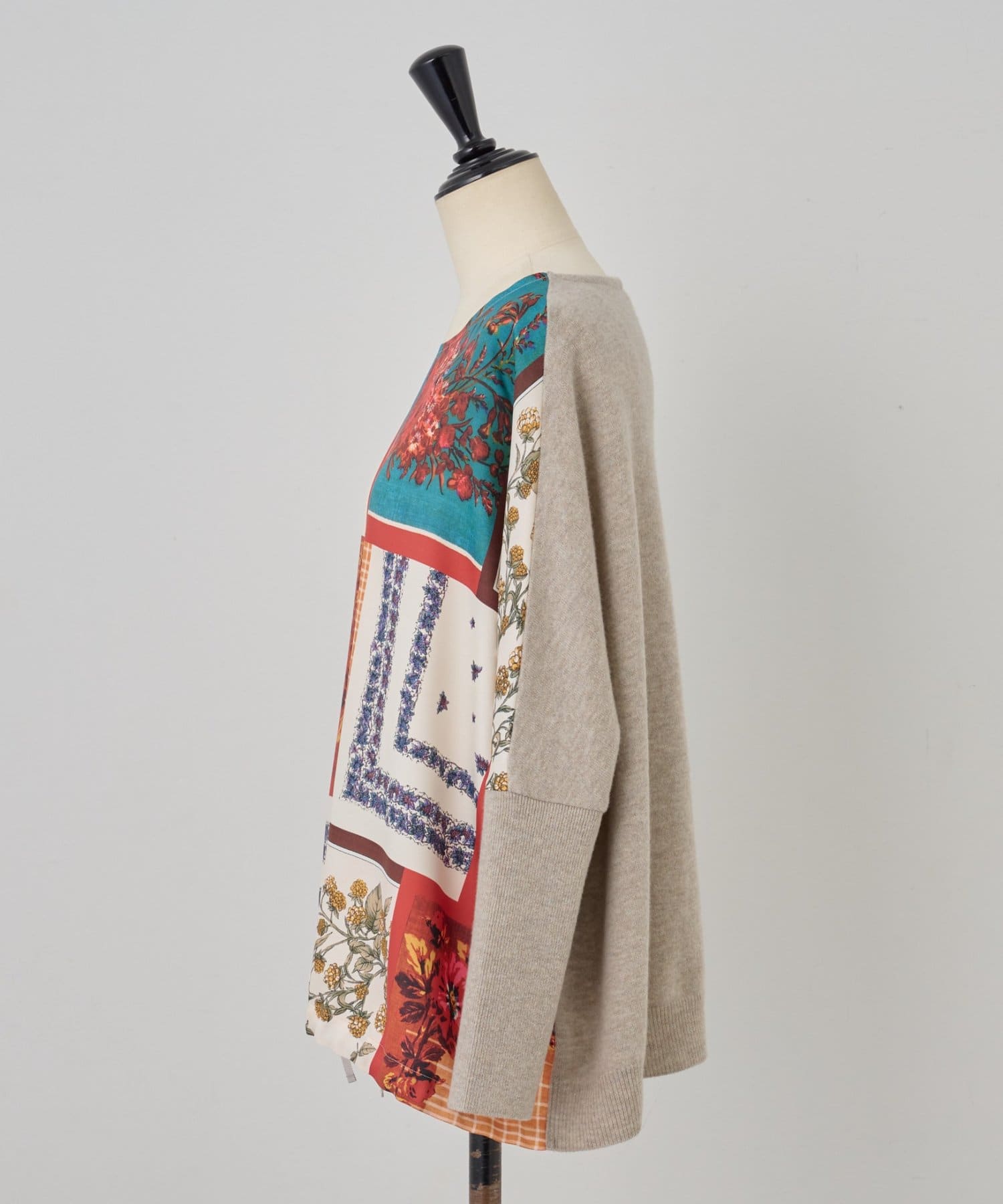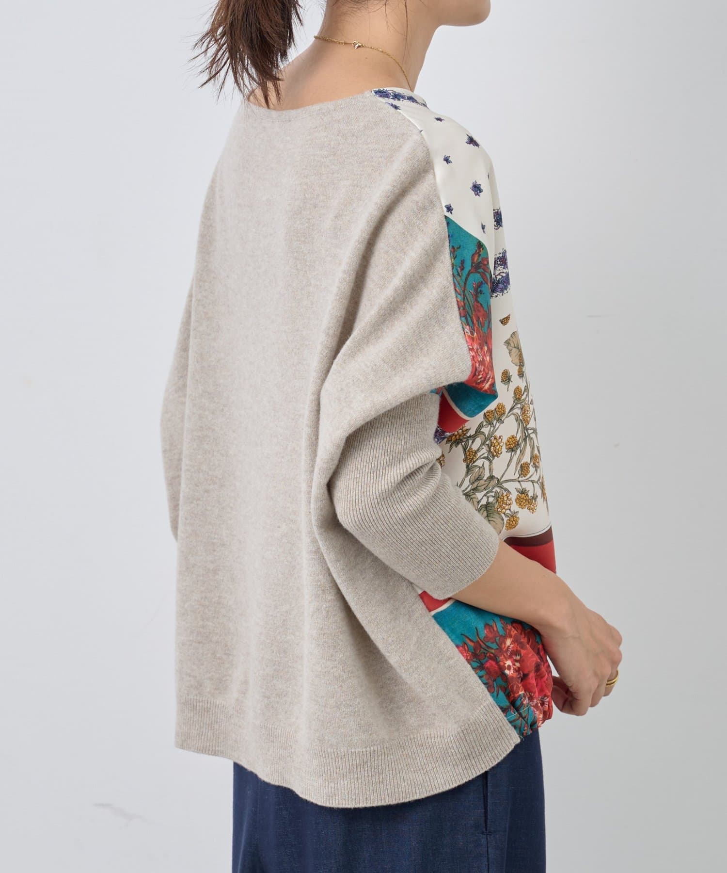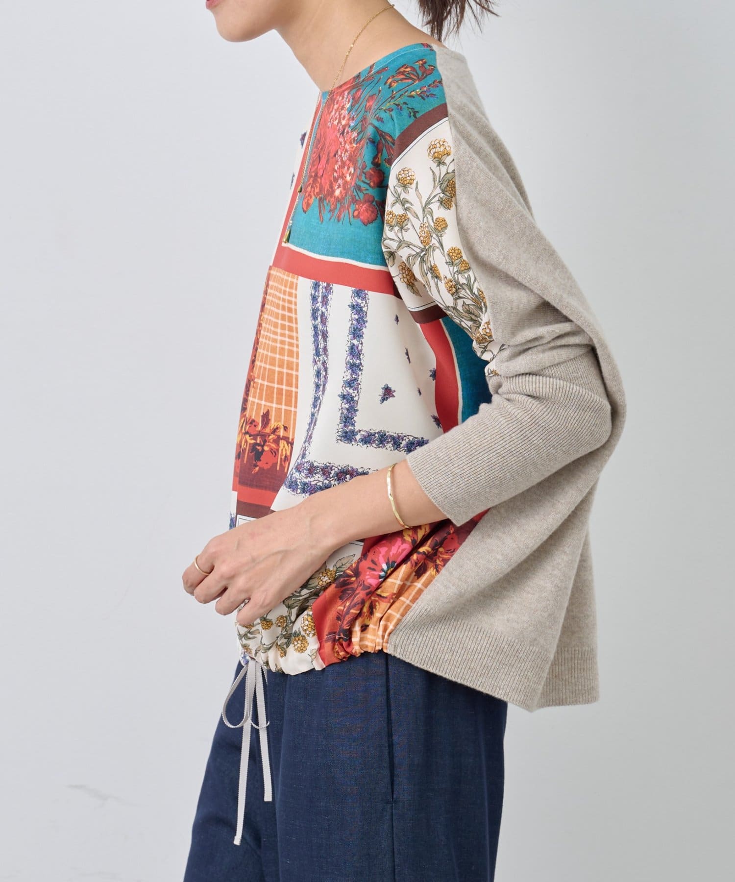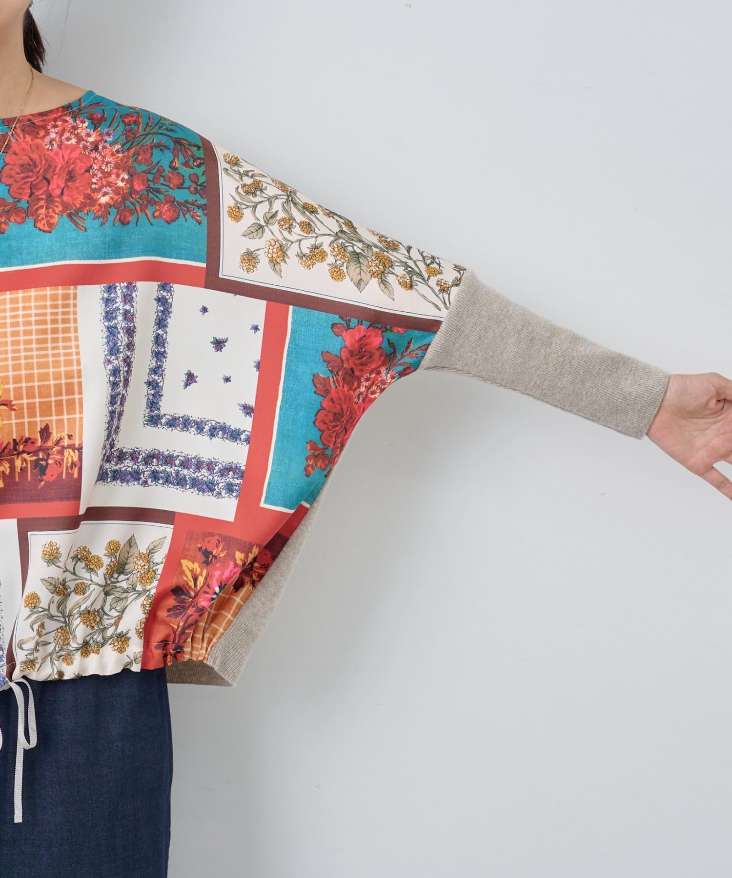 艶のある鮮やかなスカーフを身頃にしたプルオーバーニット。
