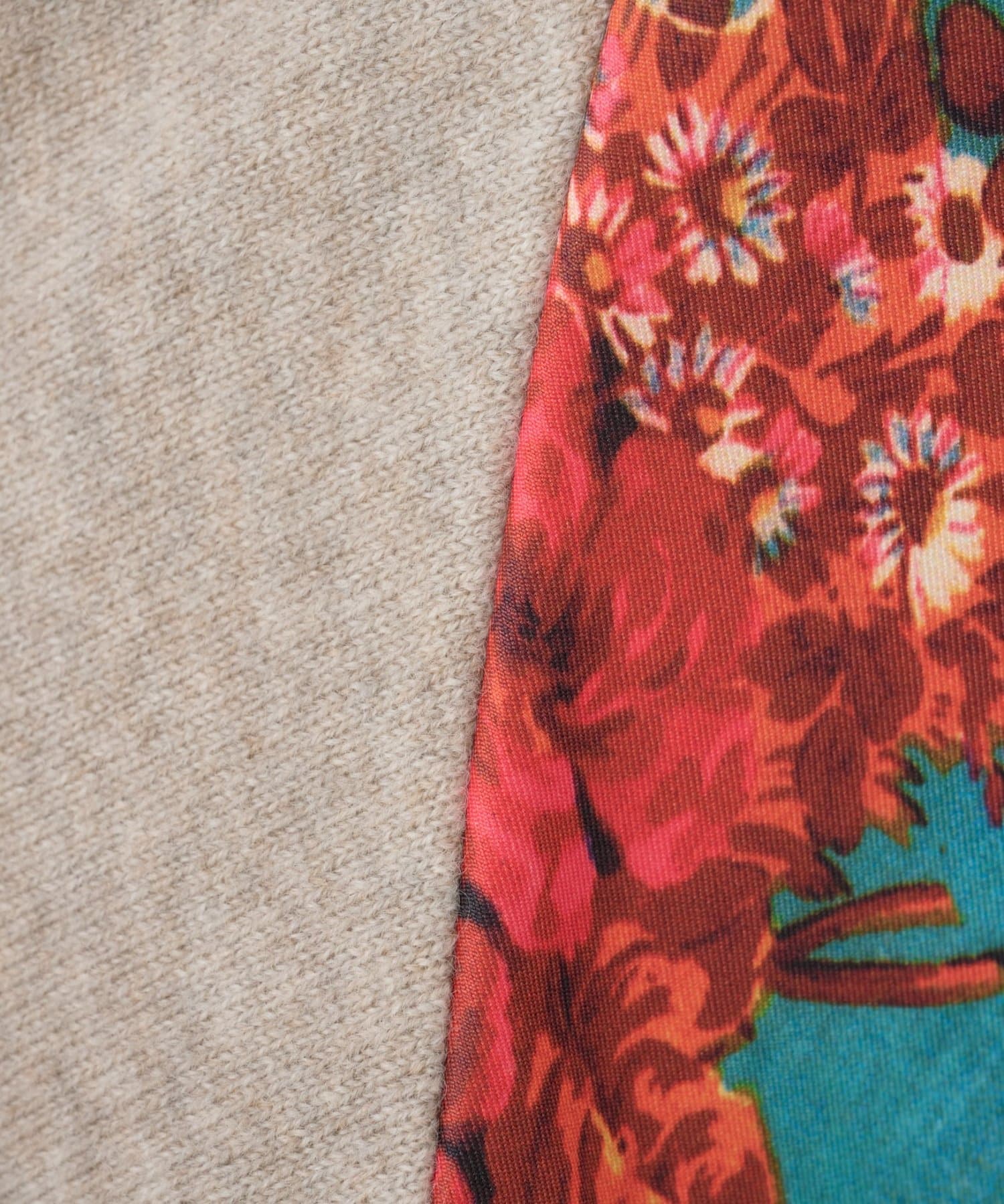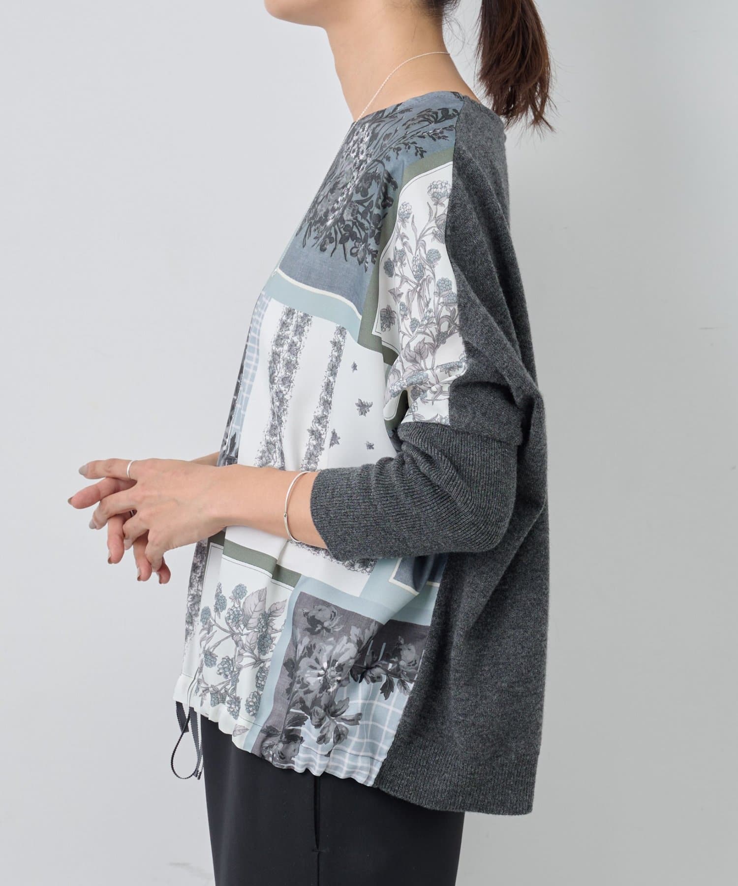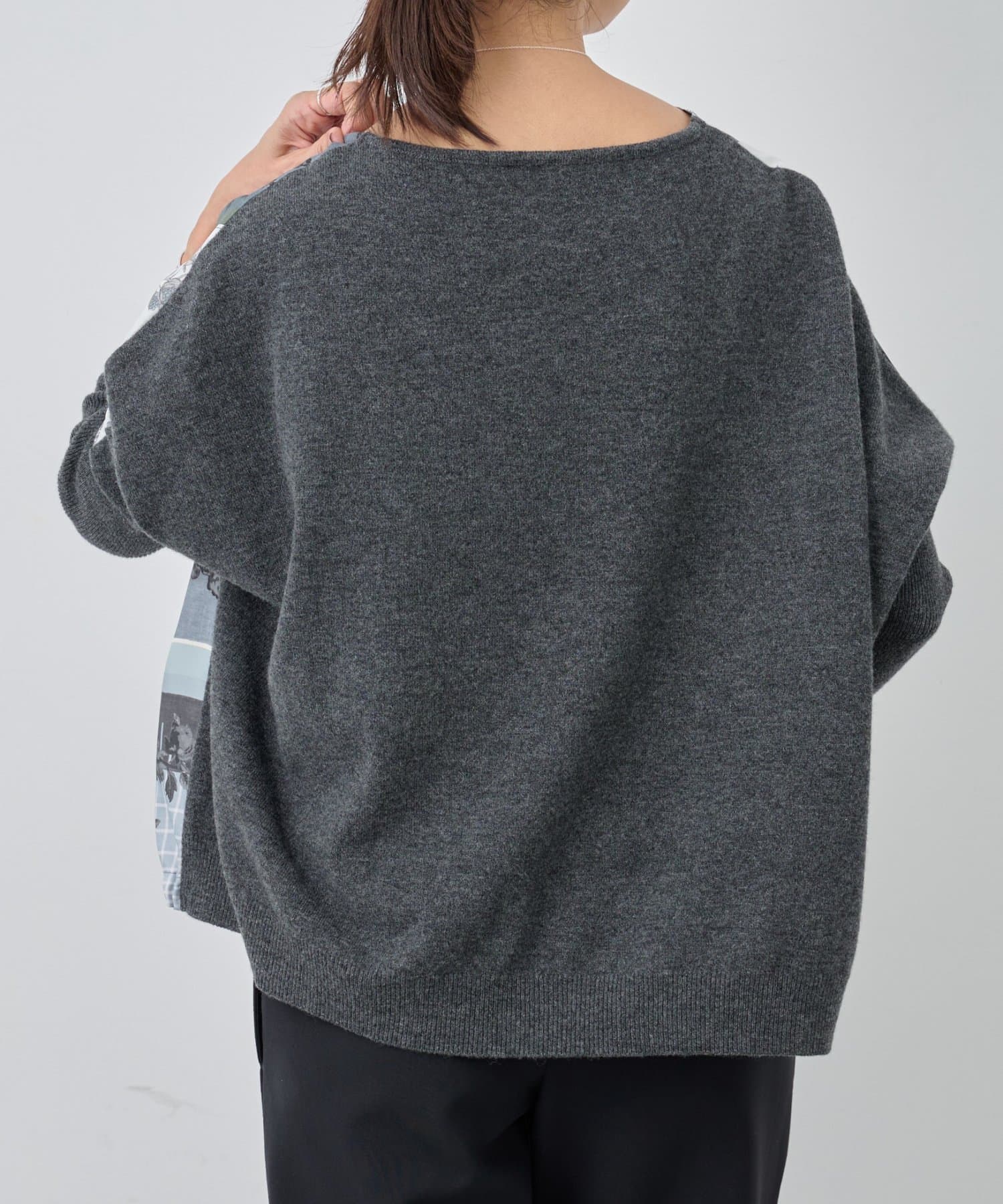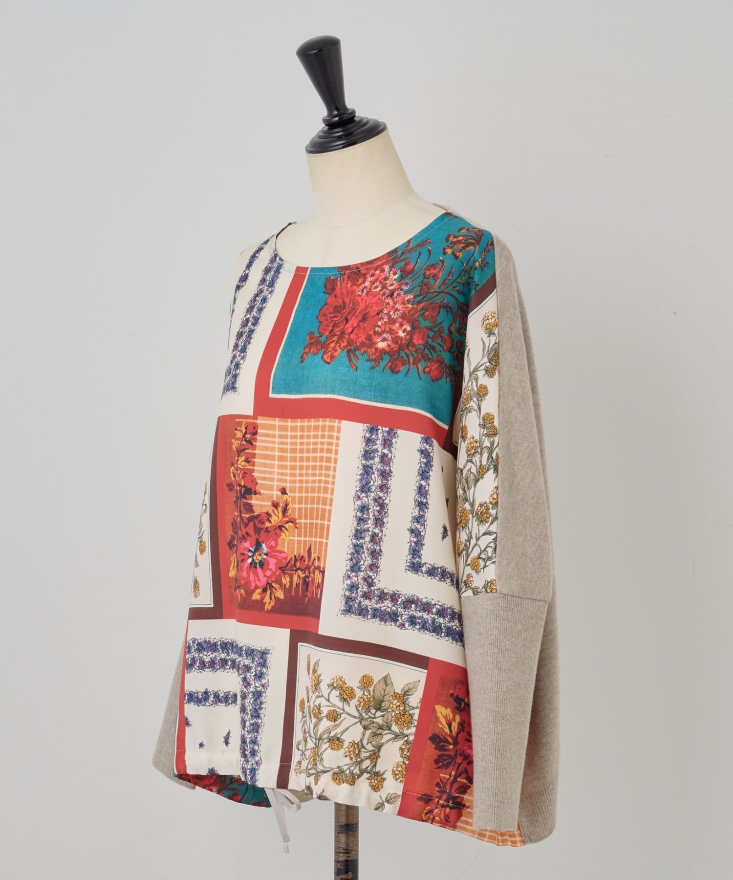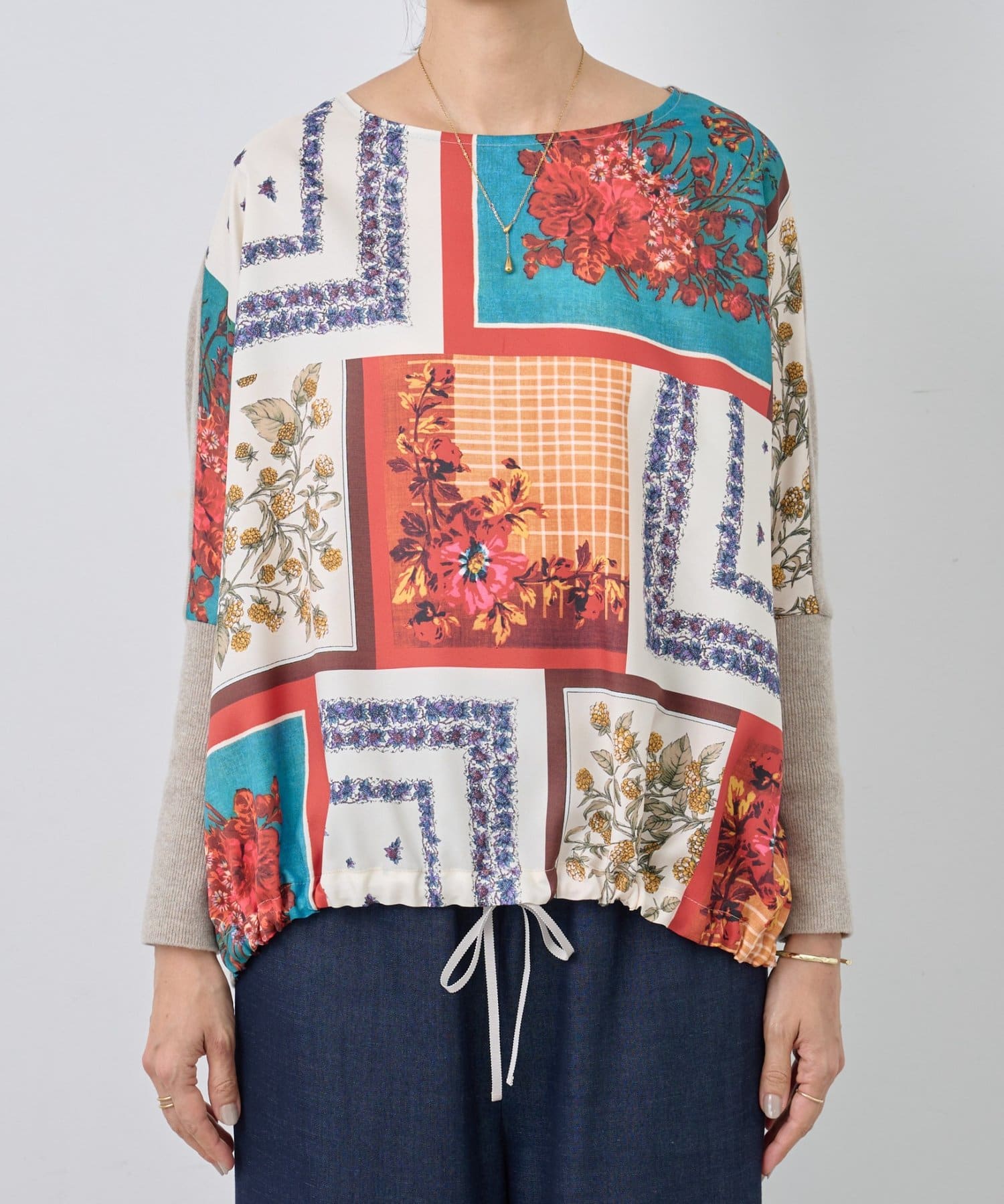 艶のある鮮やかなスカーフを身頃にしたプルオーバーニット。