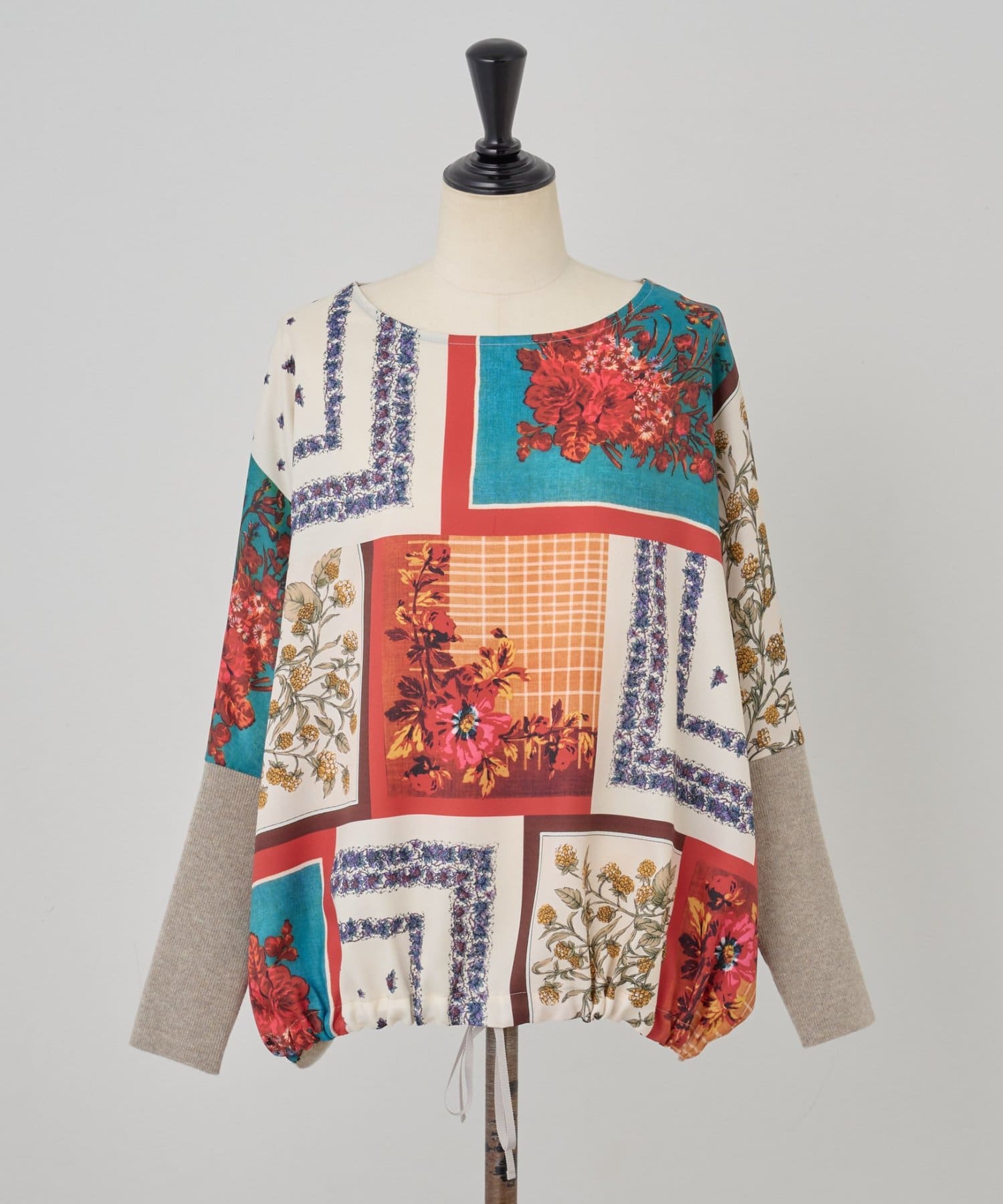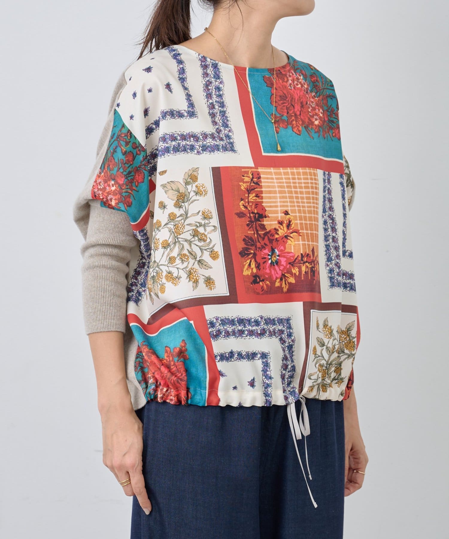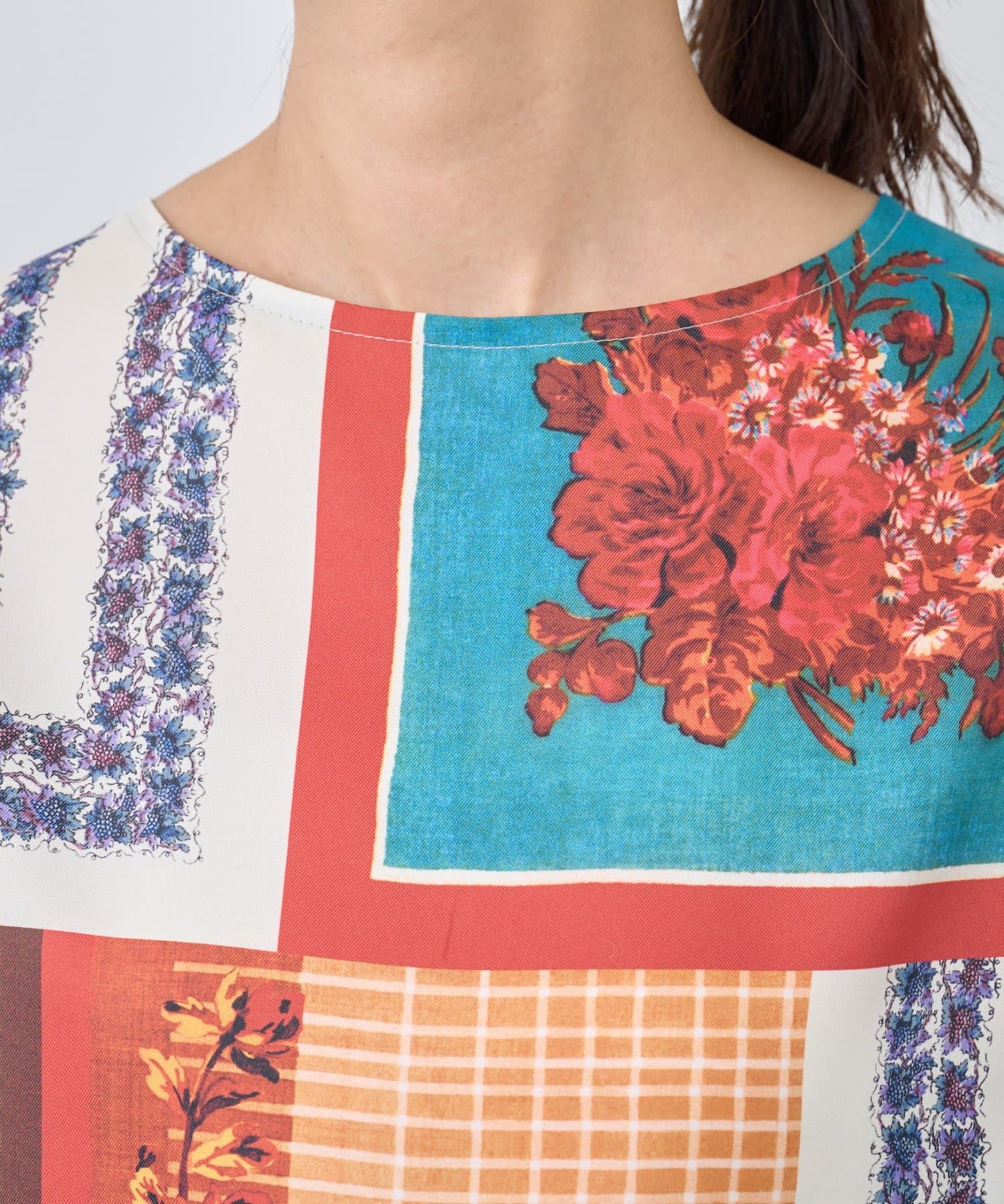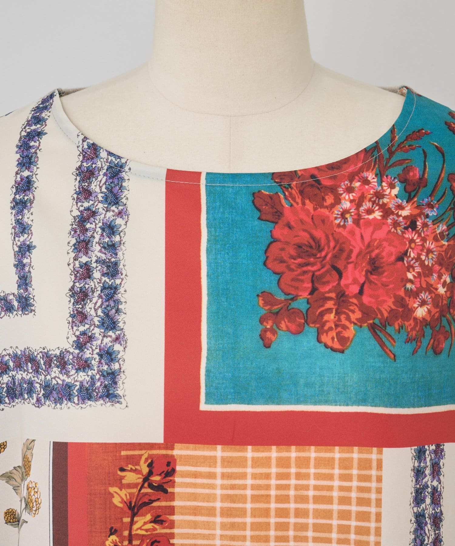 アンティーク調のお花模様のスカーフをパッチワークのように組み合わせてプリント、シンプルなボトムにあわせるだけでお顔周りを華やかにしてくれます。