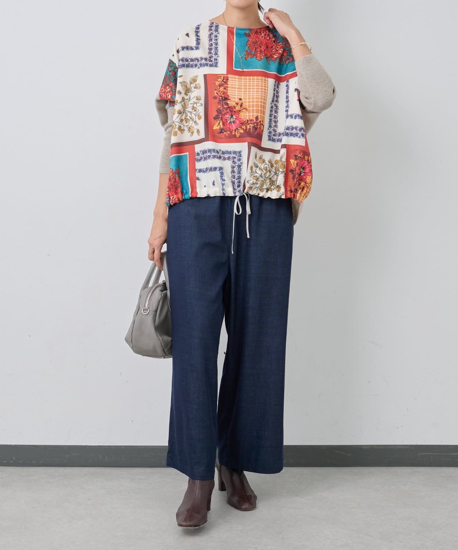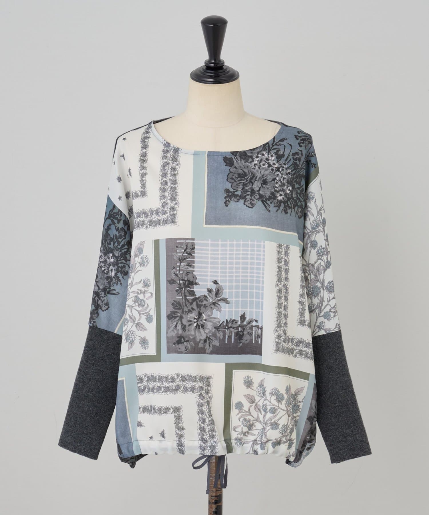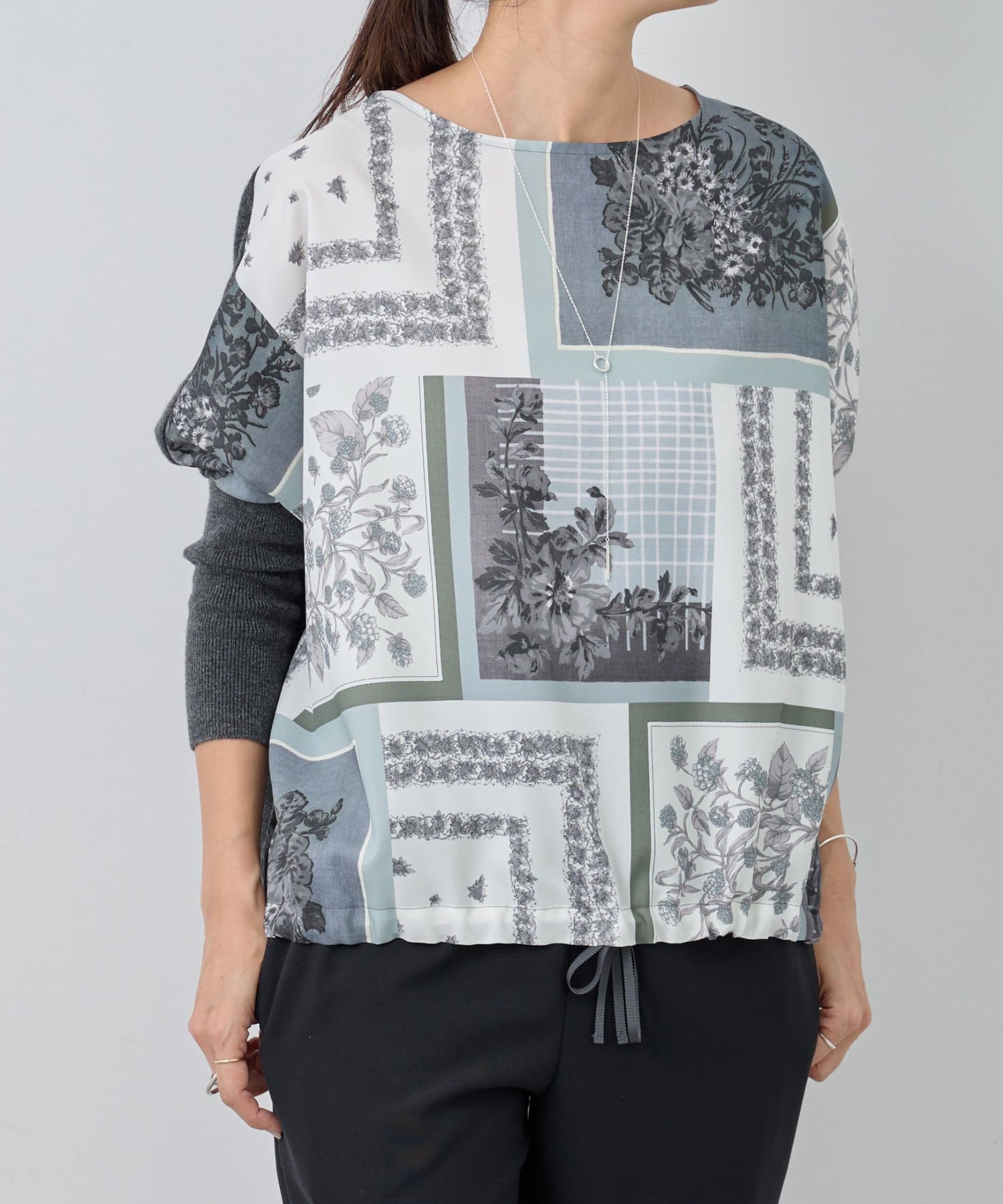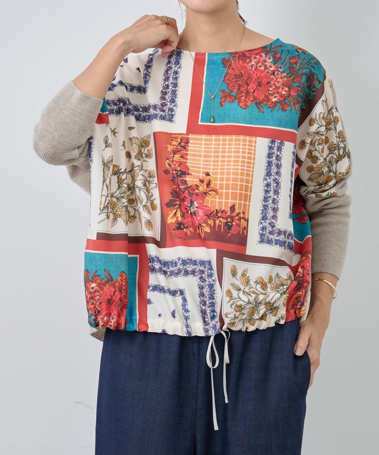 アンティーク調のお花模様のスカーフをパッチワークのように組み合わせてプリント、シンプルなボトムにあわせるだけでお顔周りを華やかにしてくれます。