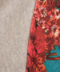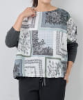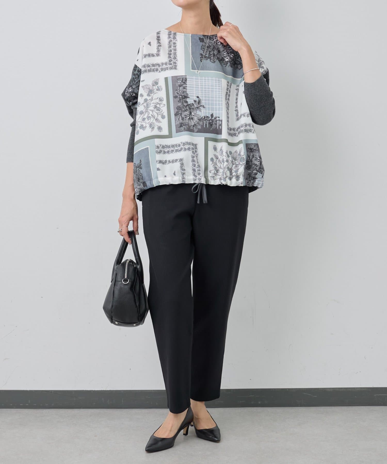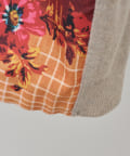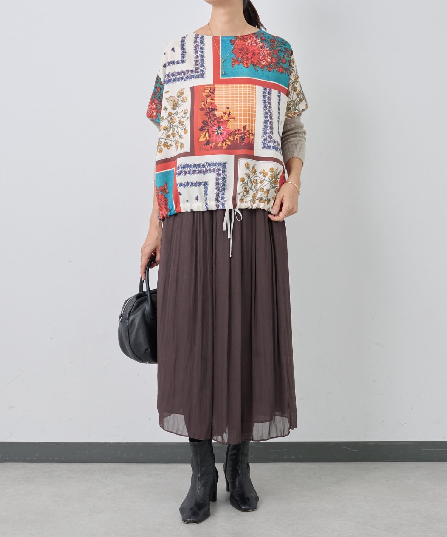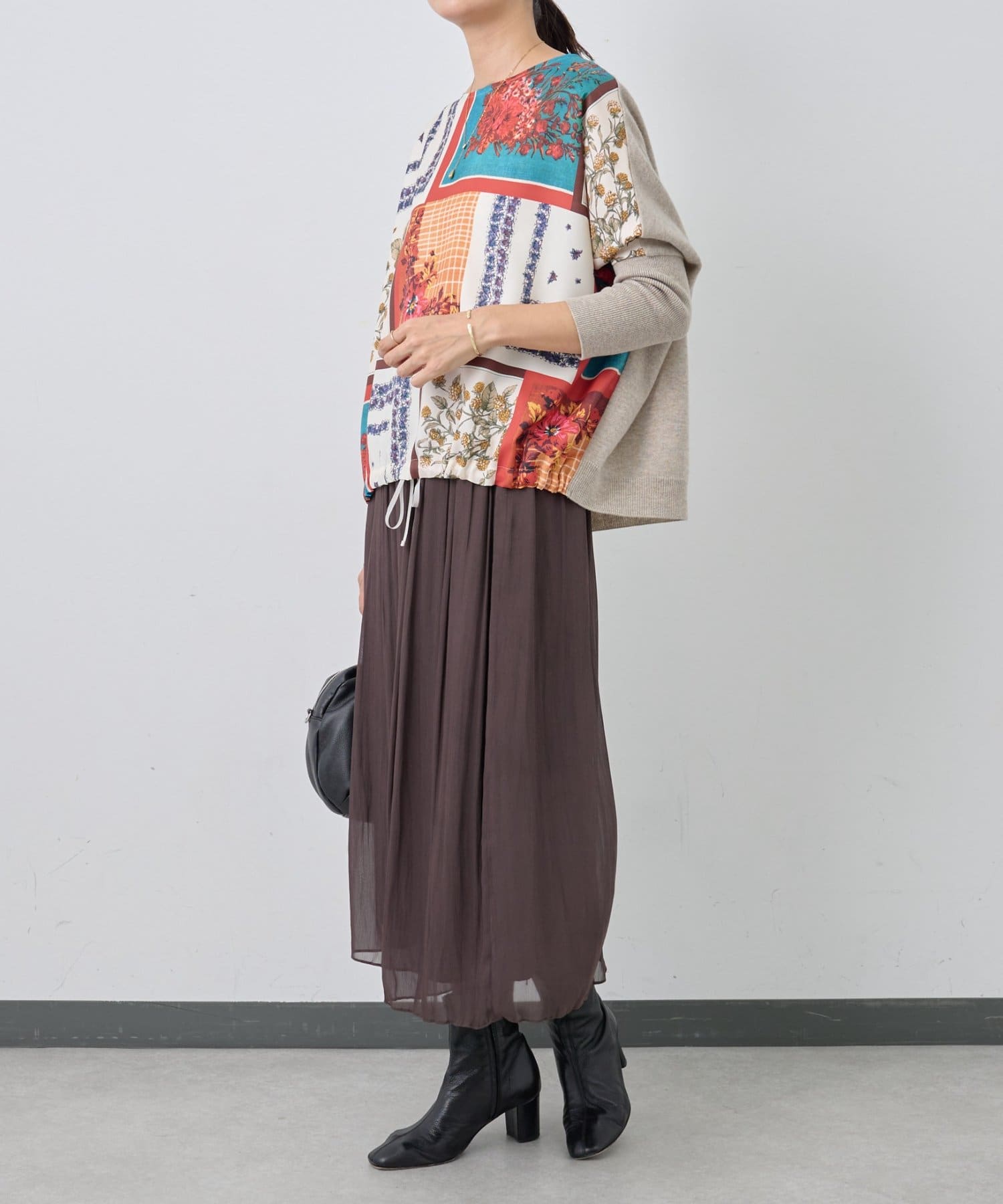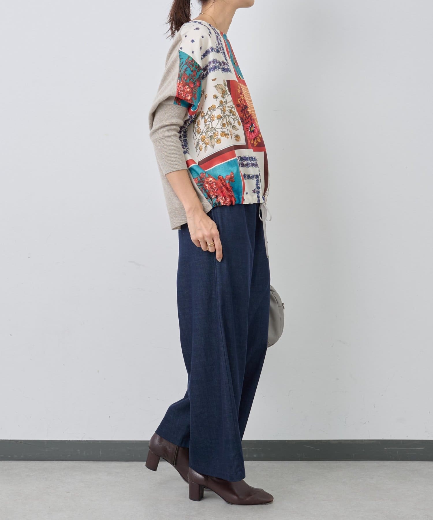 アンティーク調のお花模様のスカーフをパッチワークのように組み合わせてプリント、シンプルなボトムにあわせるだけでお顔周りを華やかにしてくれます。