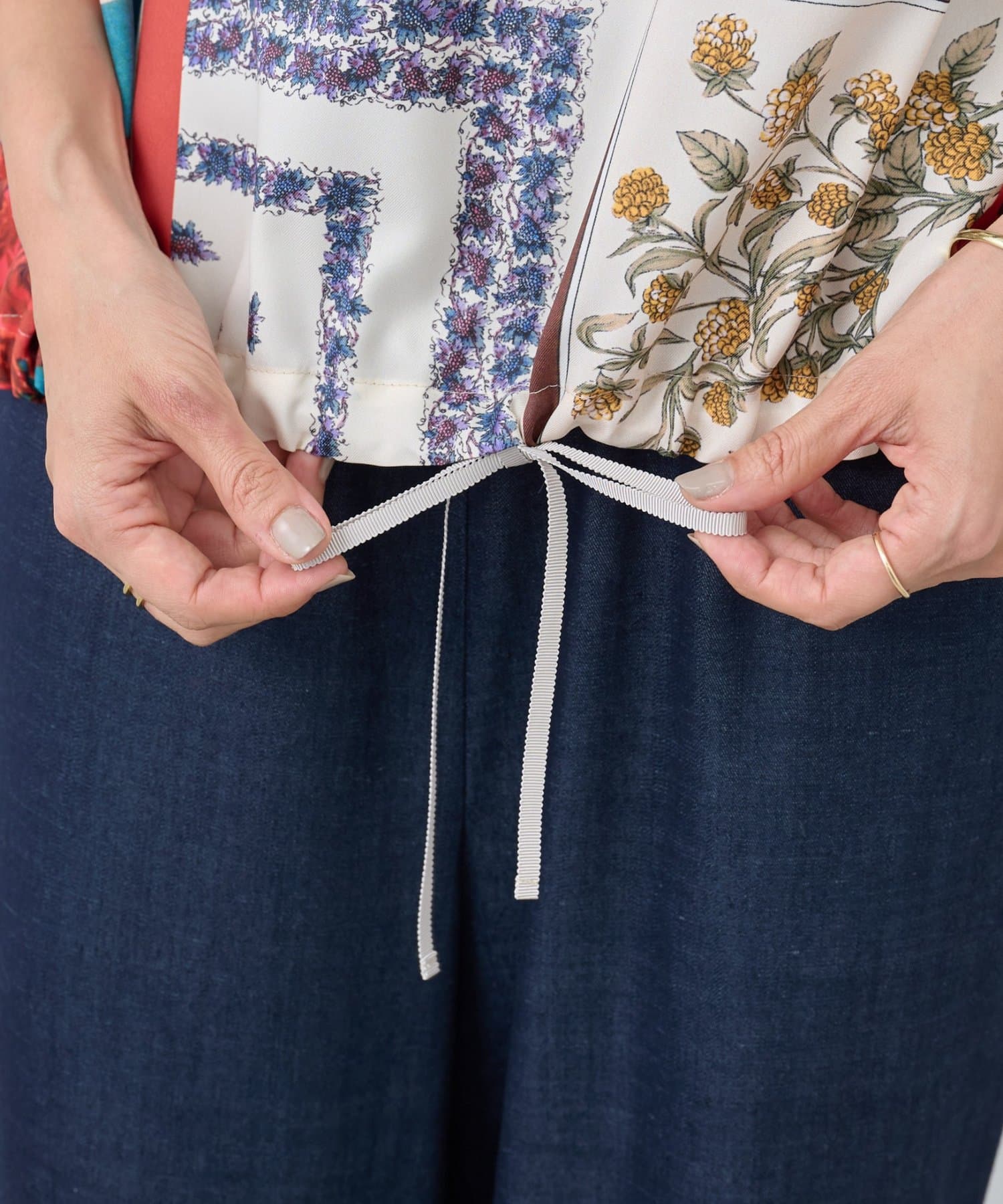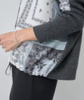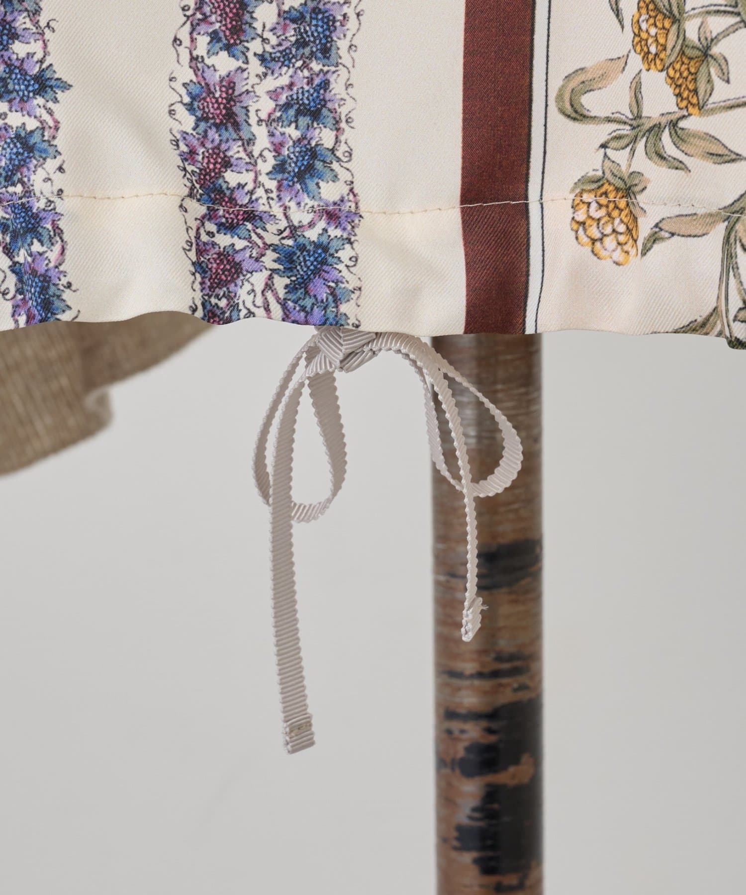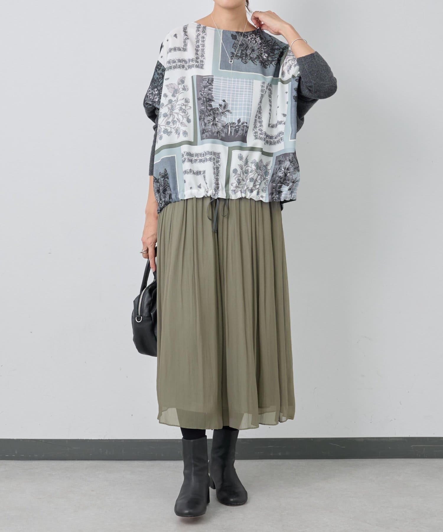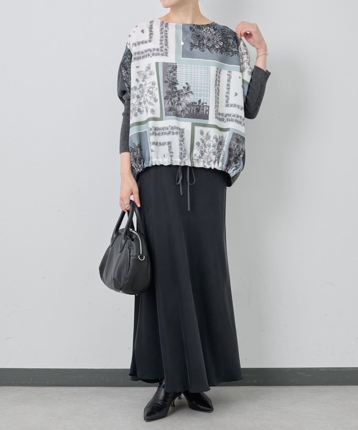 アンティーク調のお花模様のスカーフをパッチワークのように組み合わせてプリント、シンプルなボトムにあわせるだけでお顔周りを華やかにしてくれます。