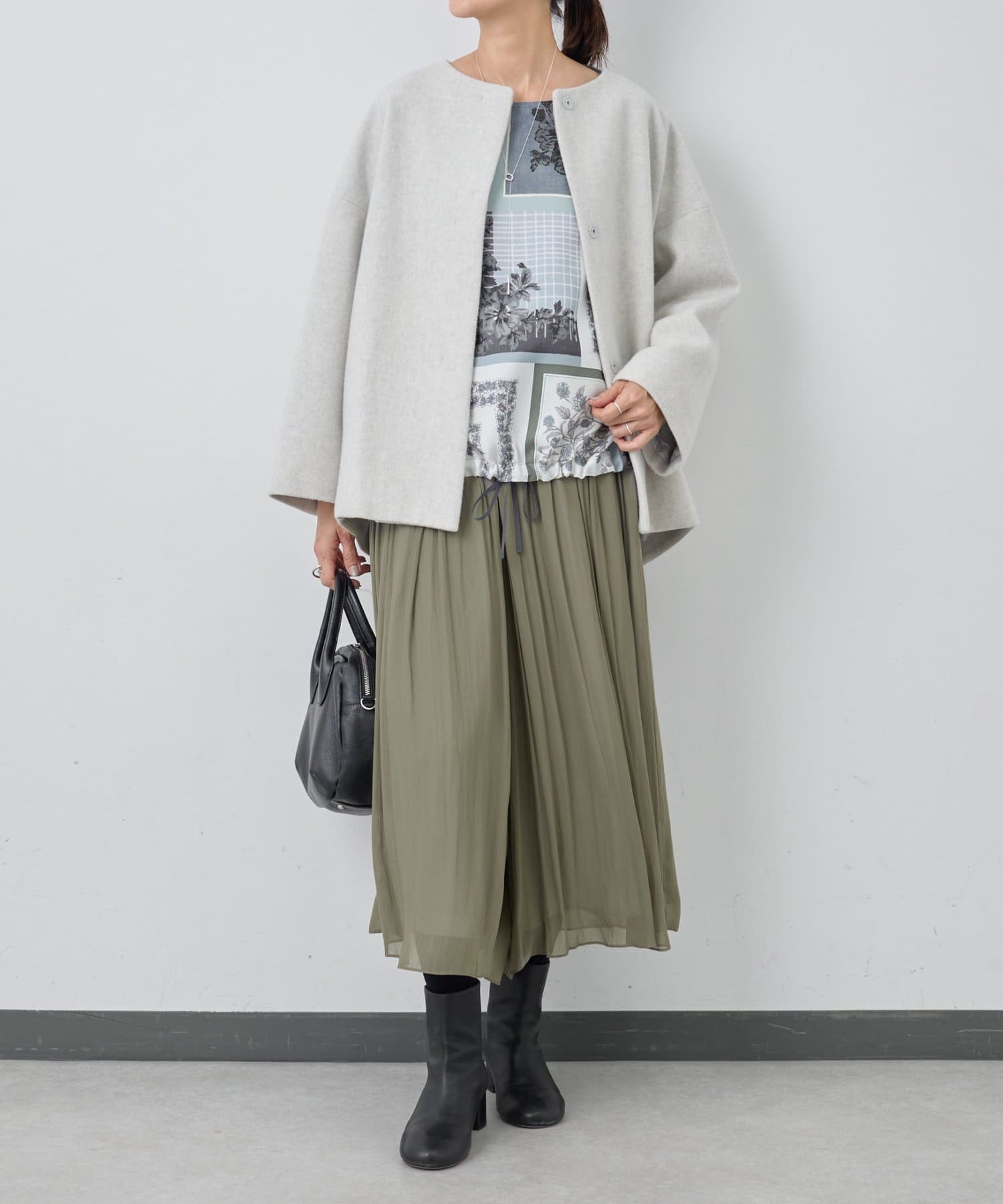 身幅を広めにとり、裾に向かってシェイプするドルマンシルエットで、前身頃のみ裾にリボンがついており、リボンを絞って着丈やシルエットの調整が可能。