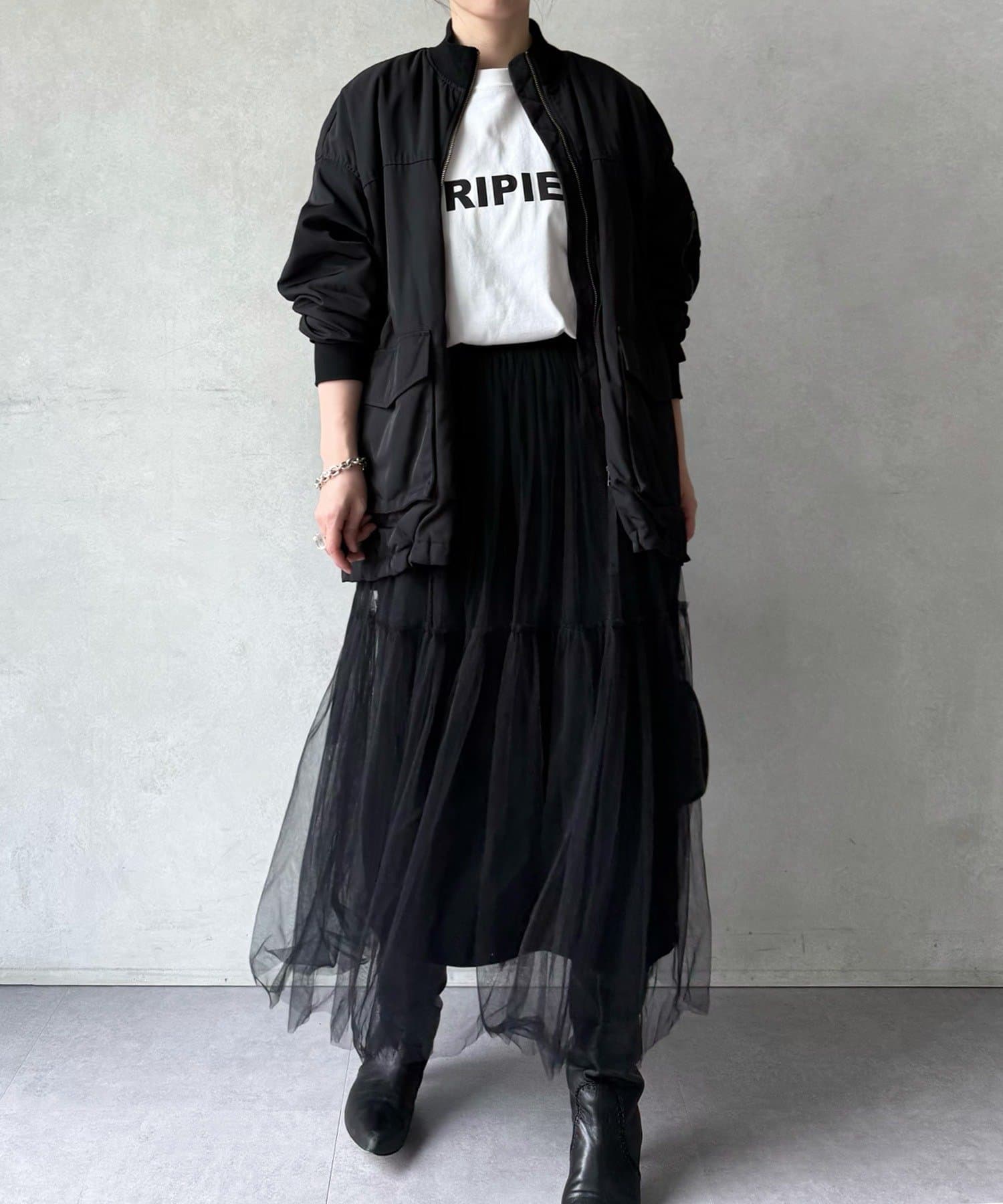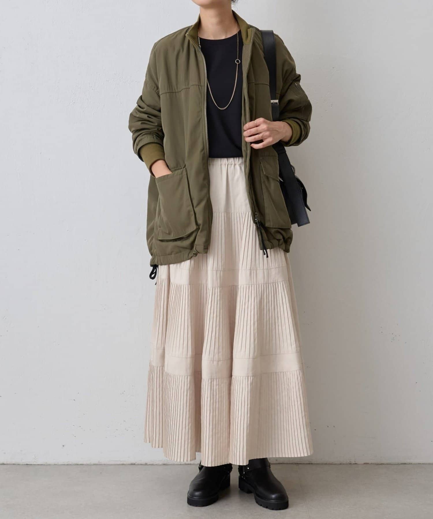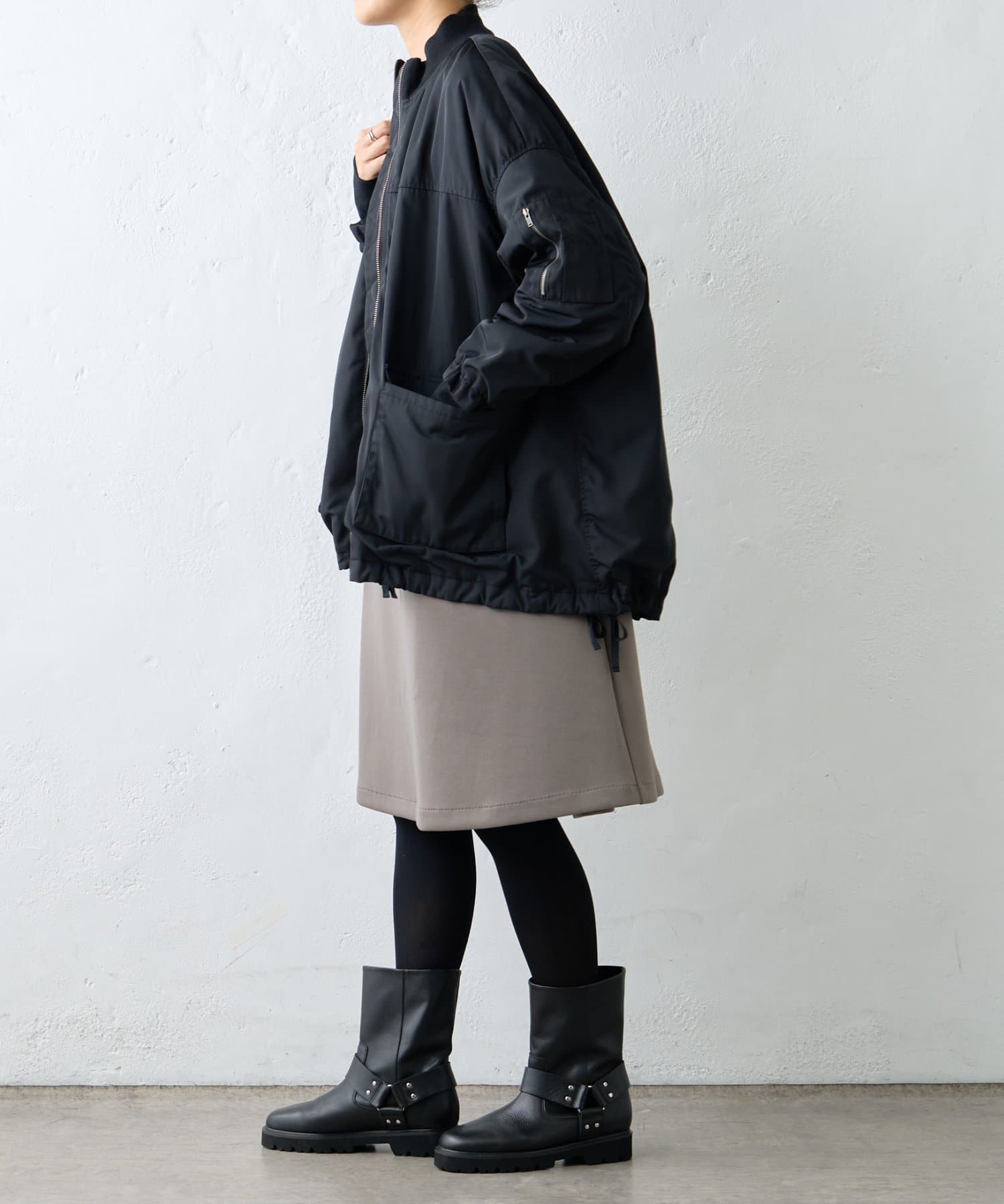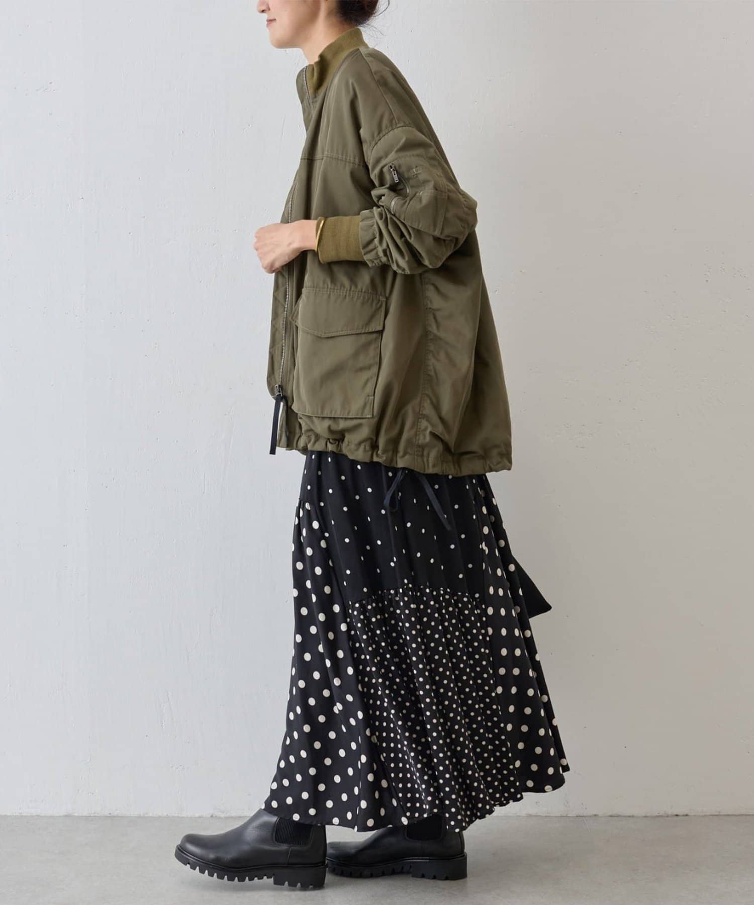 MA-1は初めてで着こなしが難しいかな?と思っていましたが、ビアズリー らしいフェミニンな作りになっているので、スカートでもパンツでも合わせやすいです。