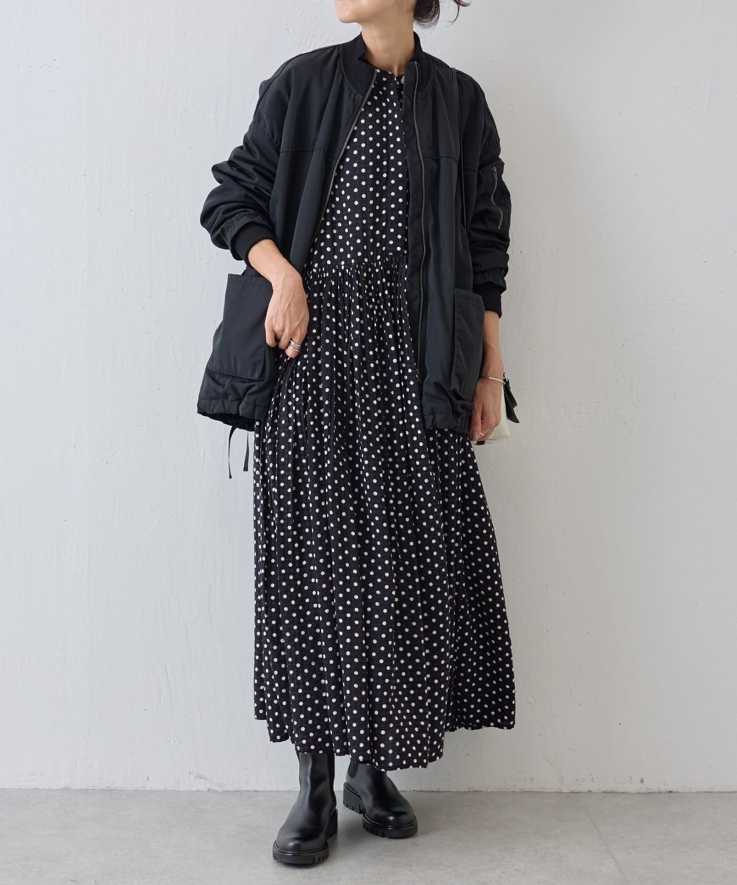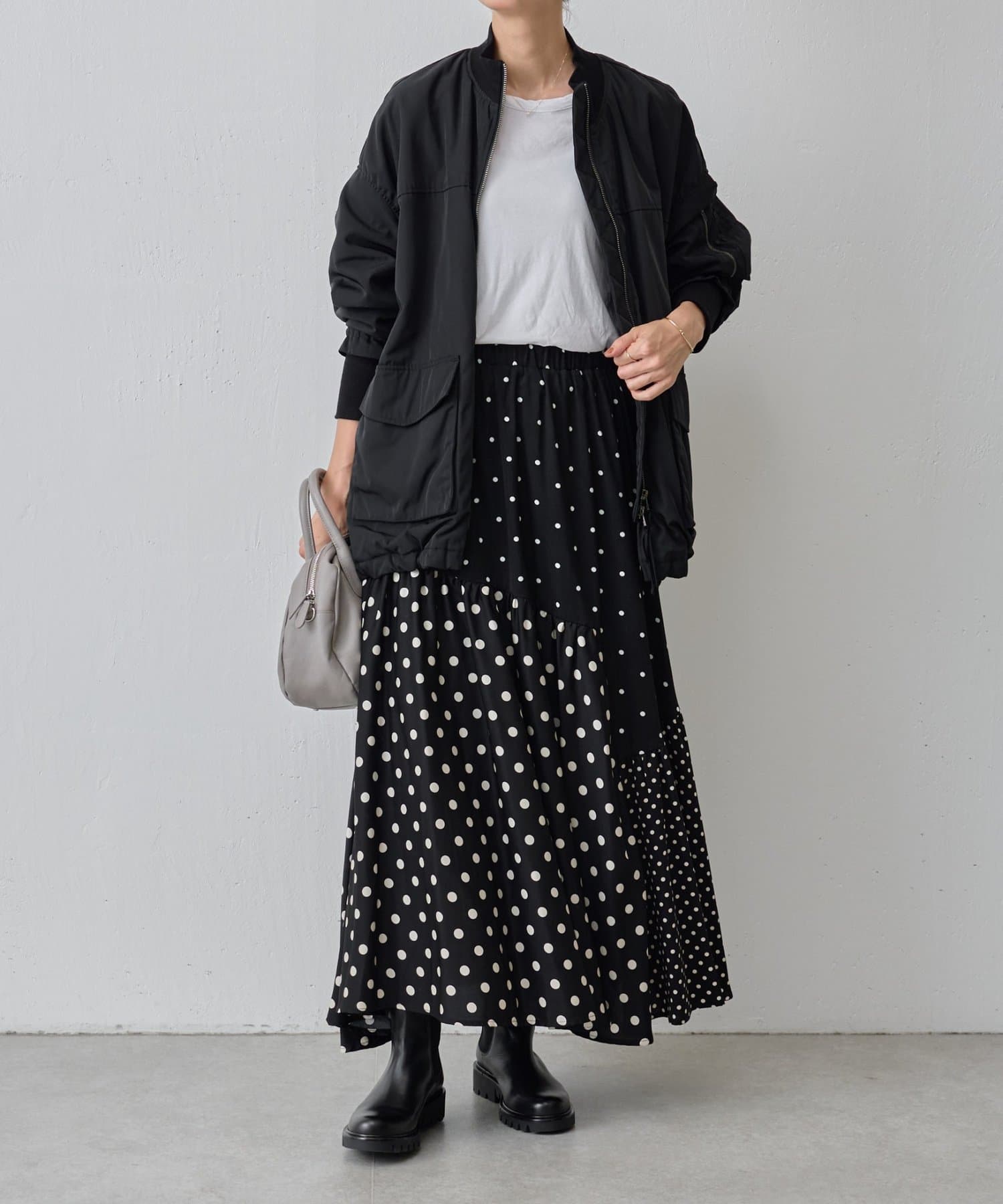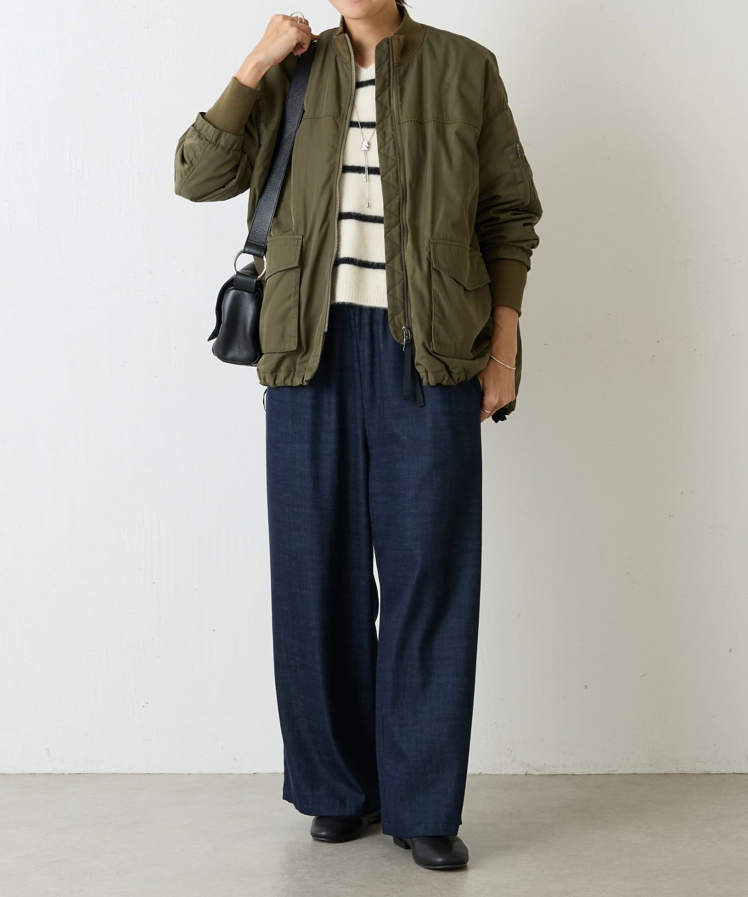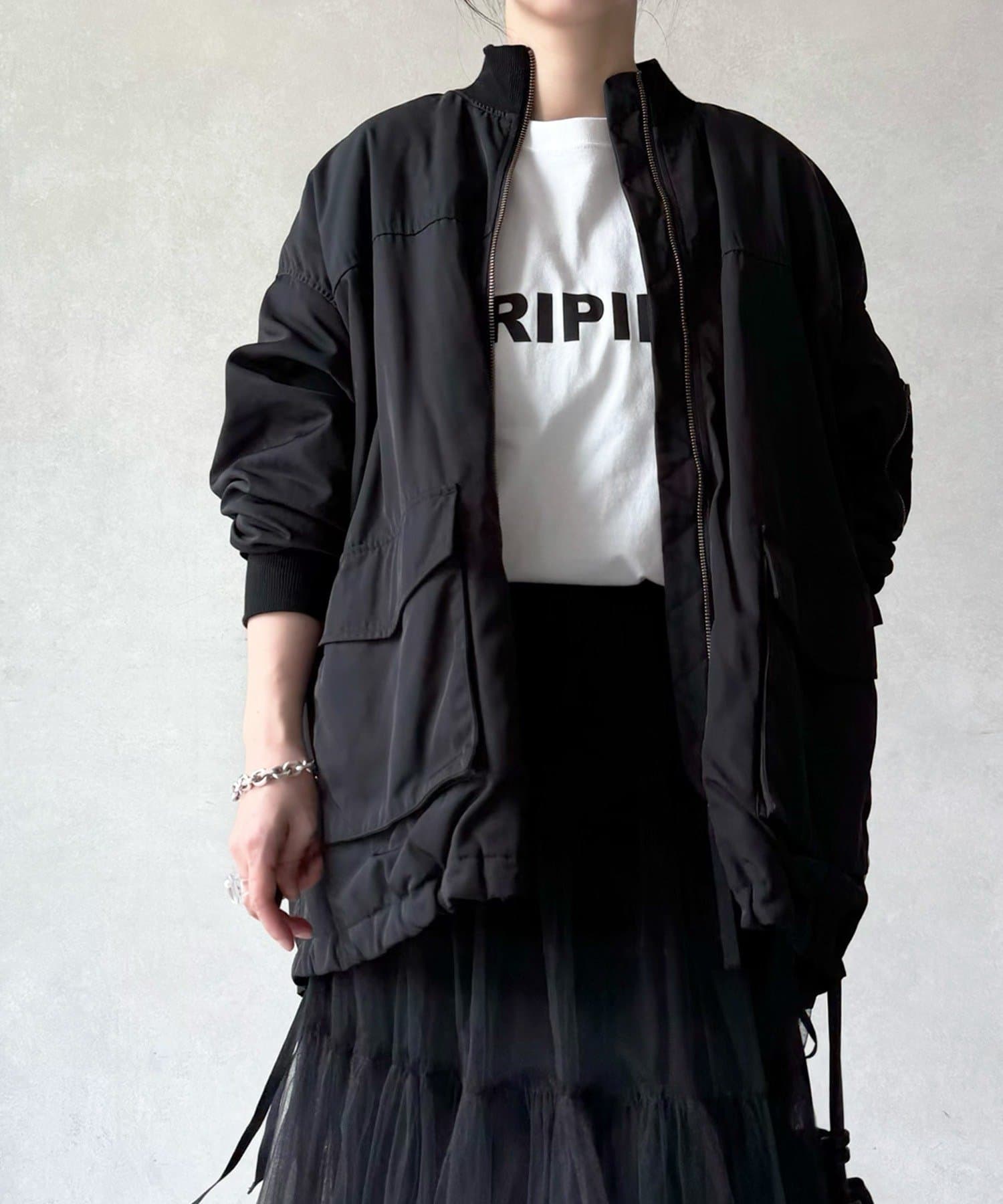 MA-1は初めてで着こなしが難しいかな?と思っていましたが、ビアズリー らしいフェミニンな作りになっているので、スカートでもパンツでも合わせやすいです。