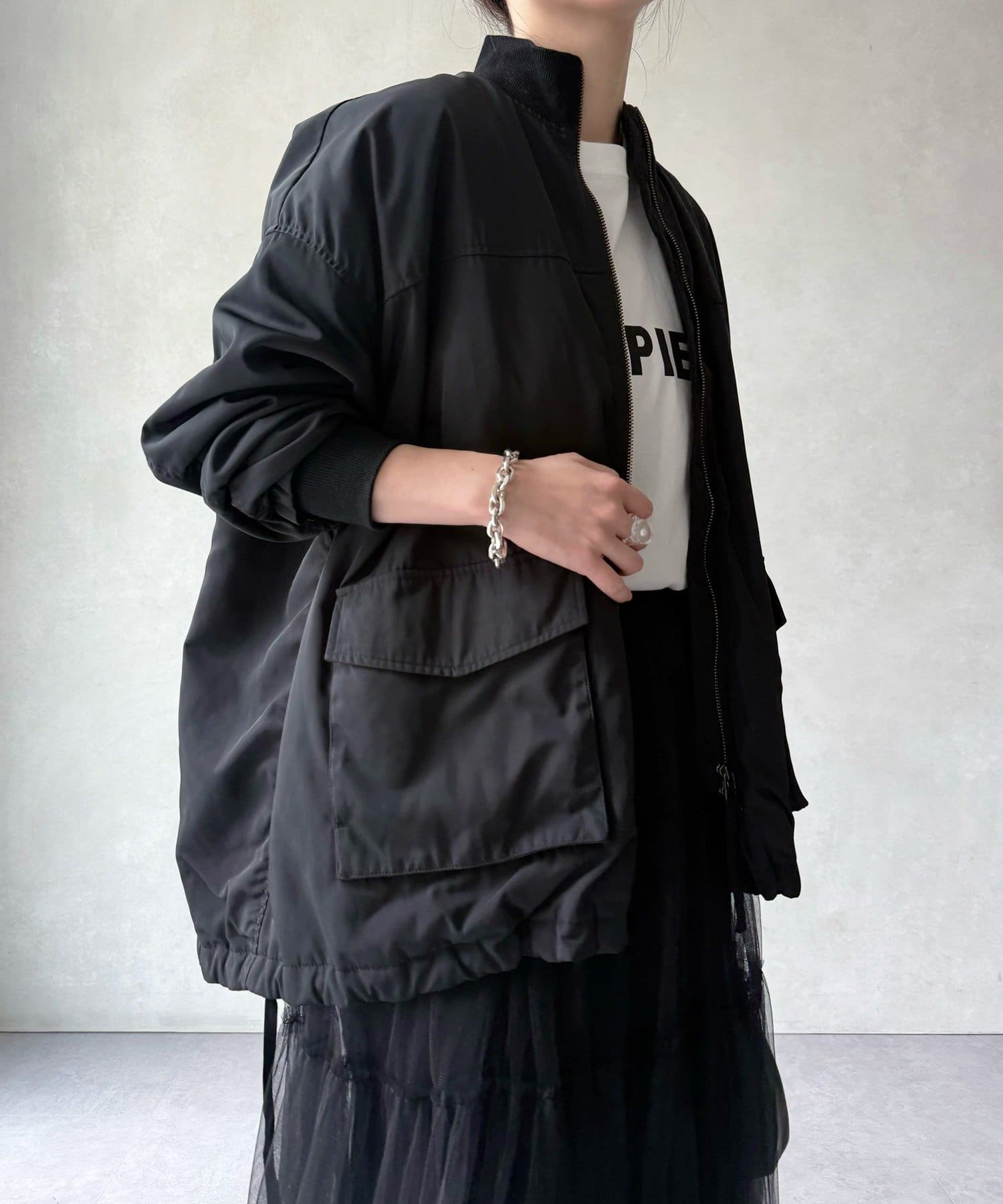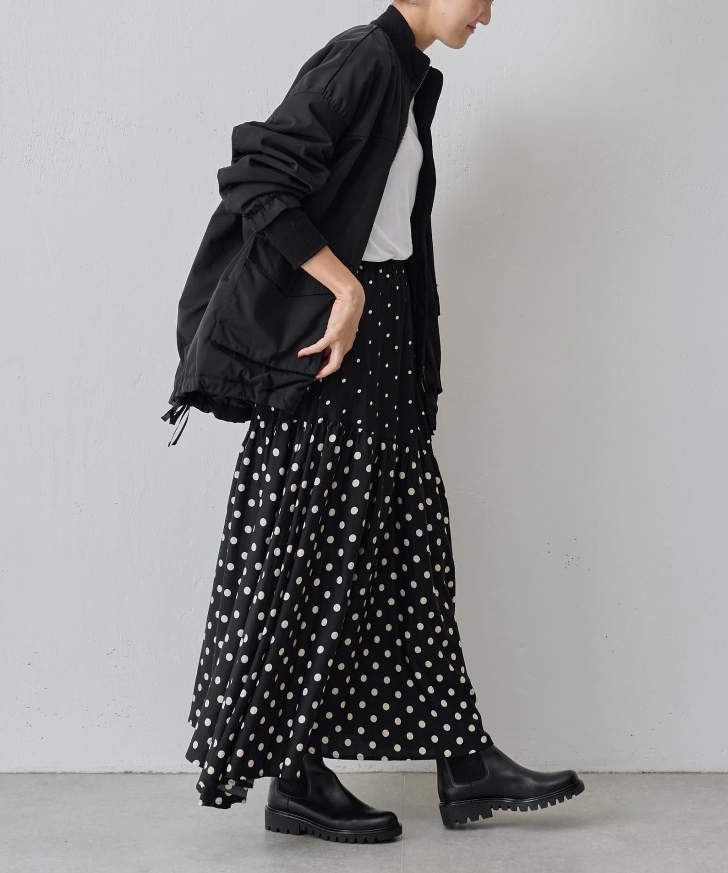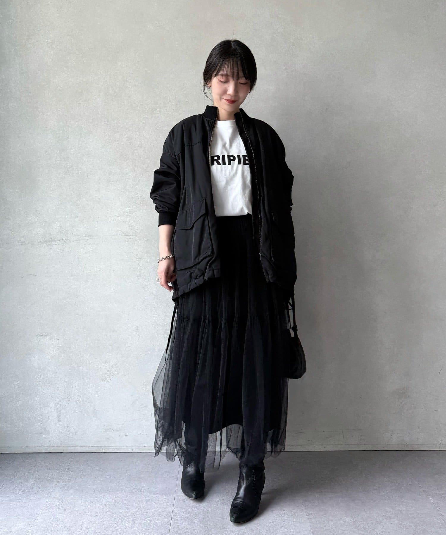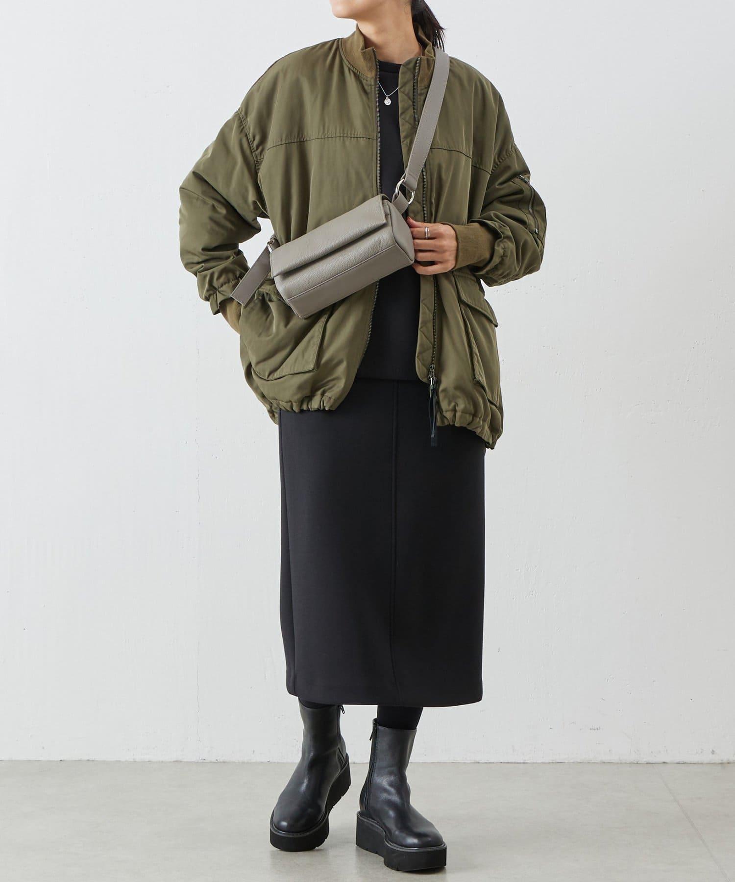 MA-1は初めてで着こなしが難しいかな?と思っていましたが、ビアズリー らしいフェミニンな作りになっているので、スカートでもパンツでも合わせやすいです。