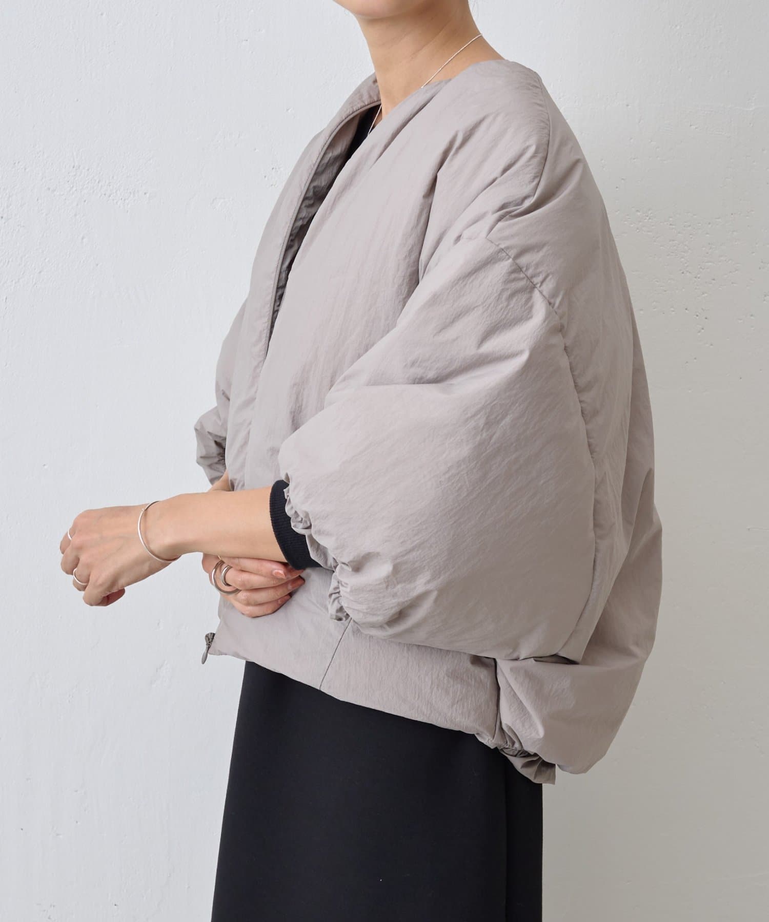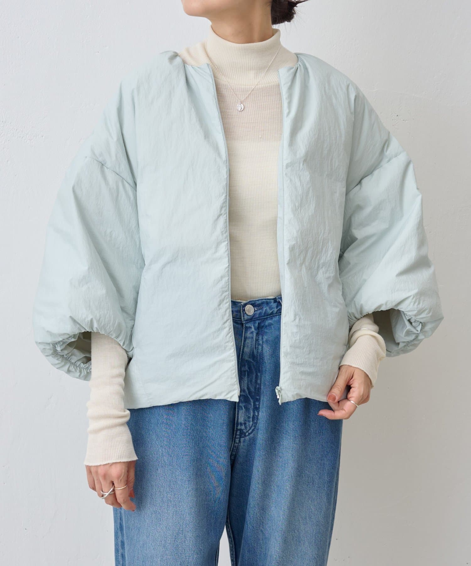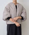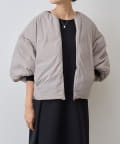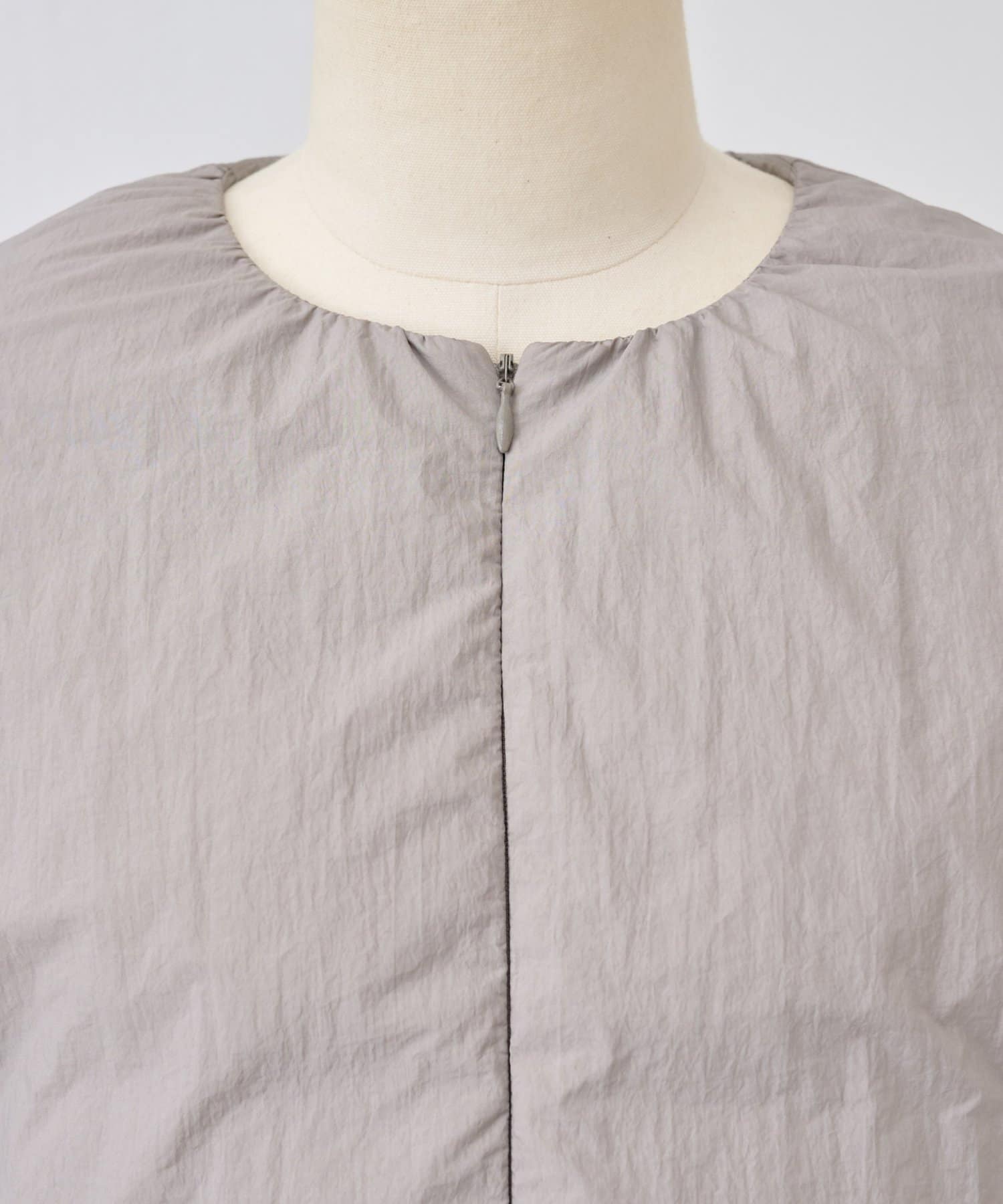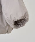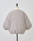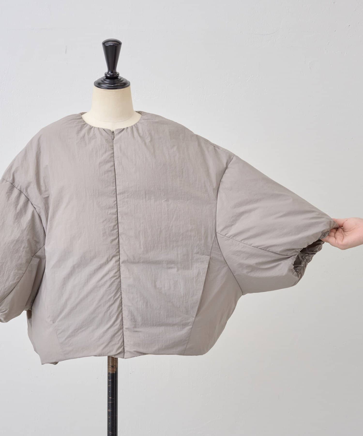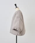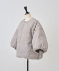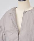 衿元はノーカラーですっきりと、袖口の内側にギャザーを寄せてバルーンシルエットにしています。