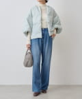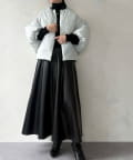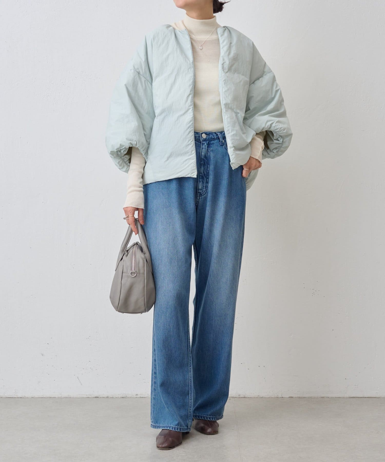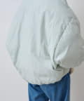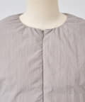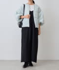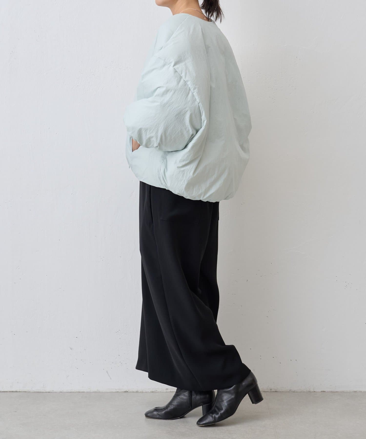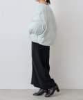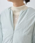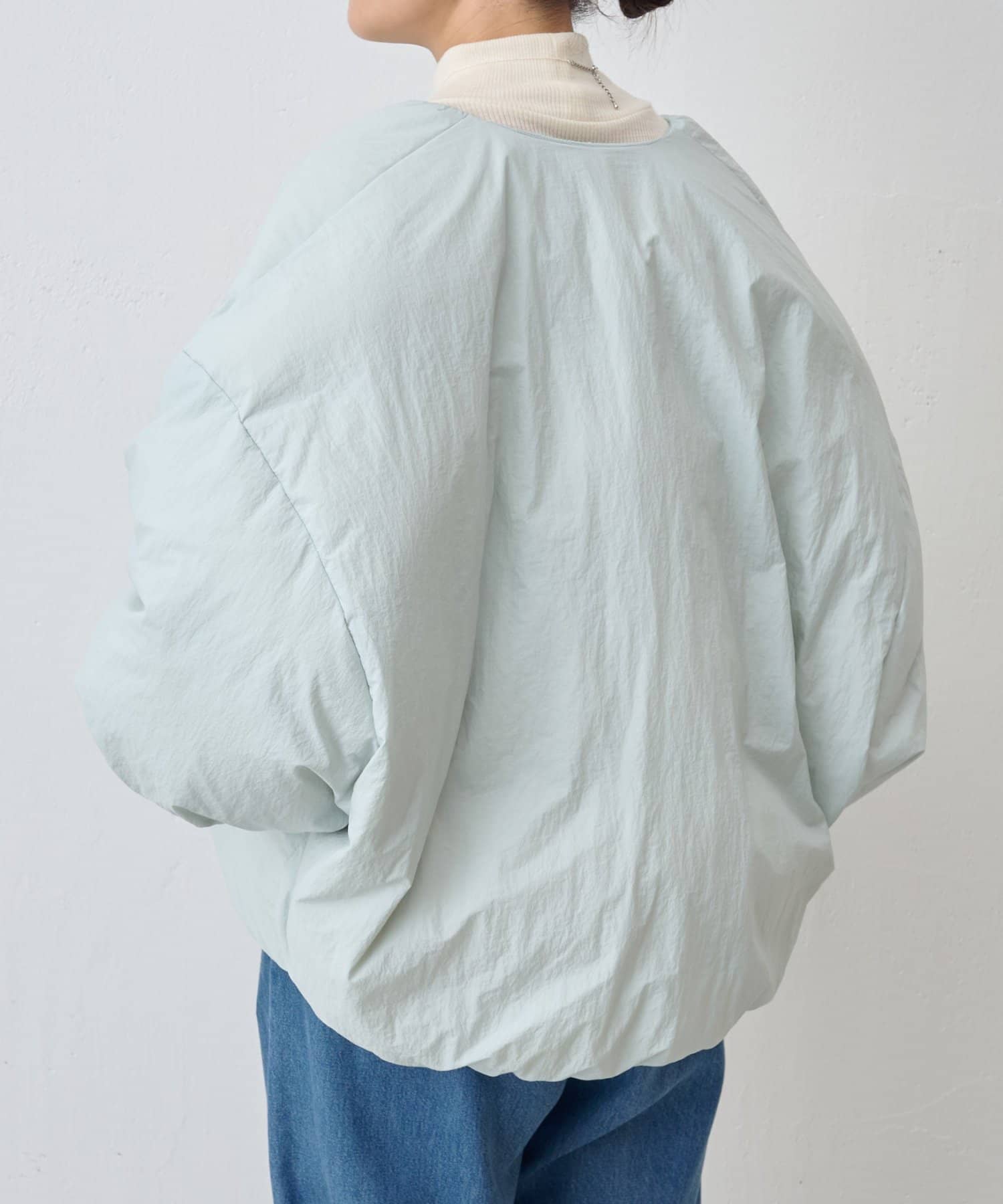 衿元はノーカラーですっきりと、袖口の内側にギャザーを寄せてバルーンシルエットにしています。