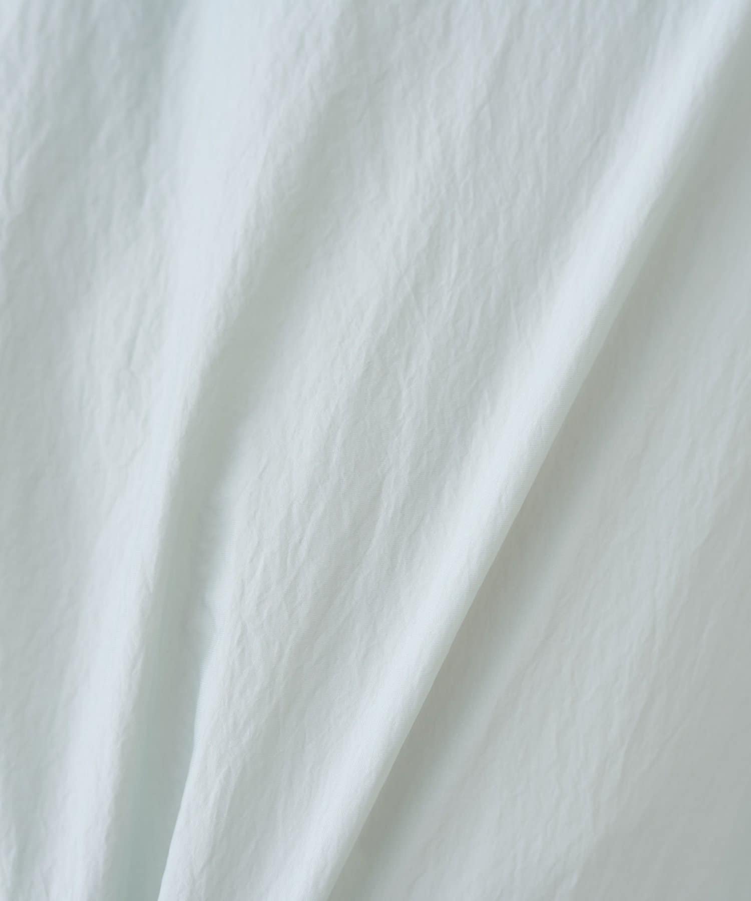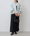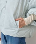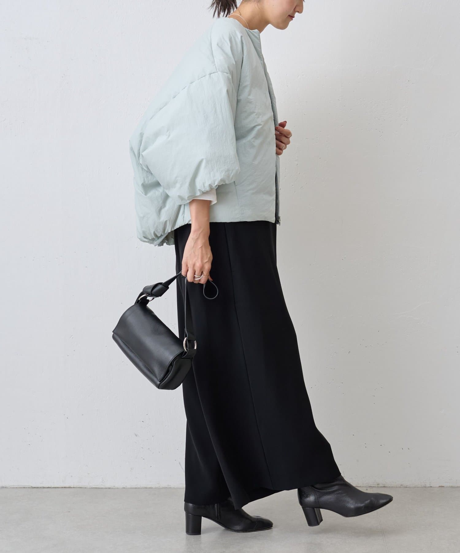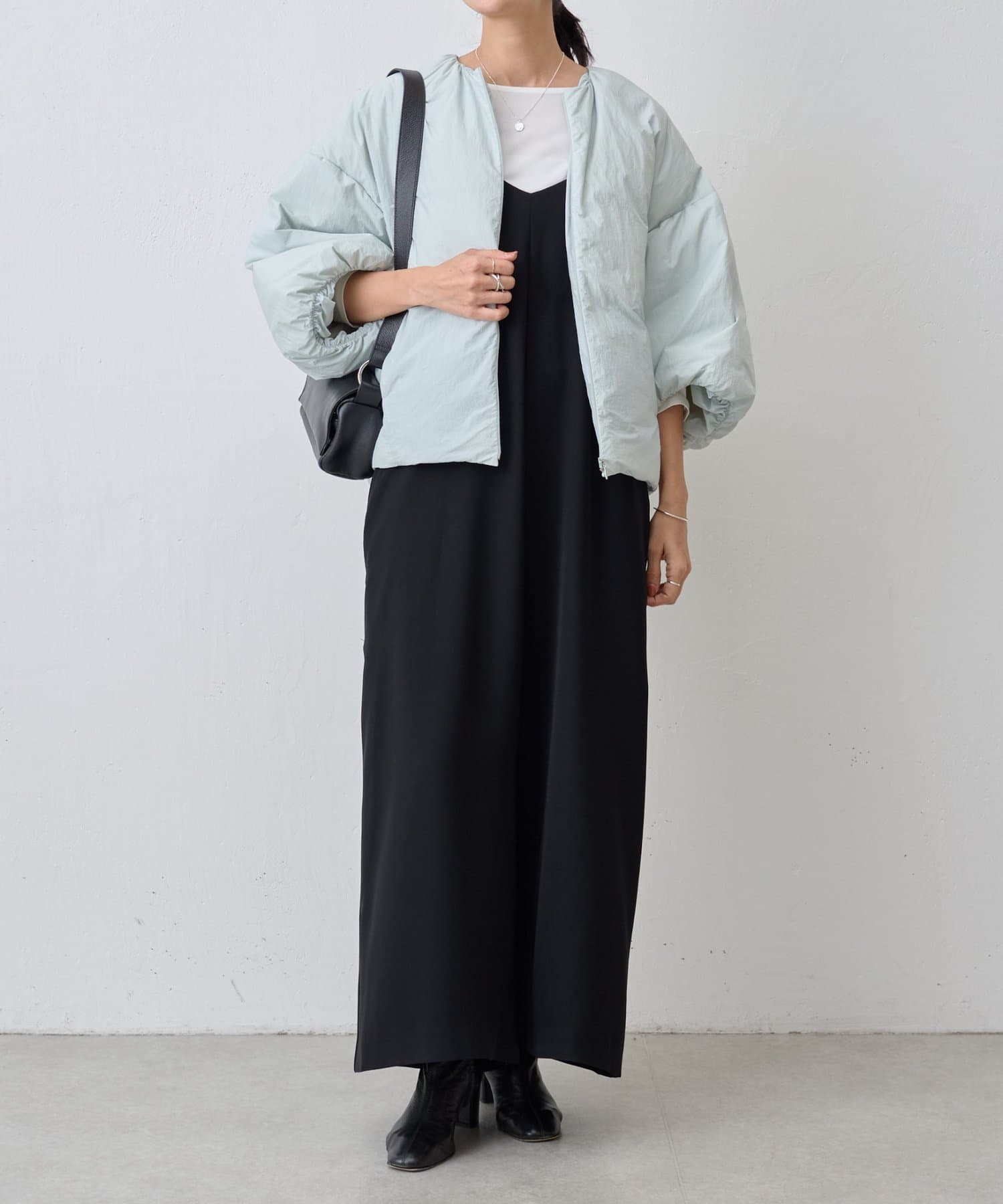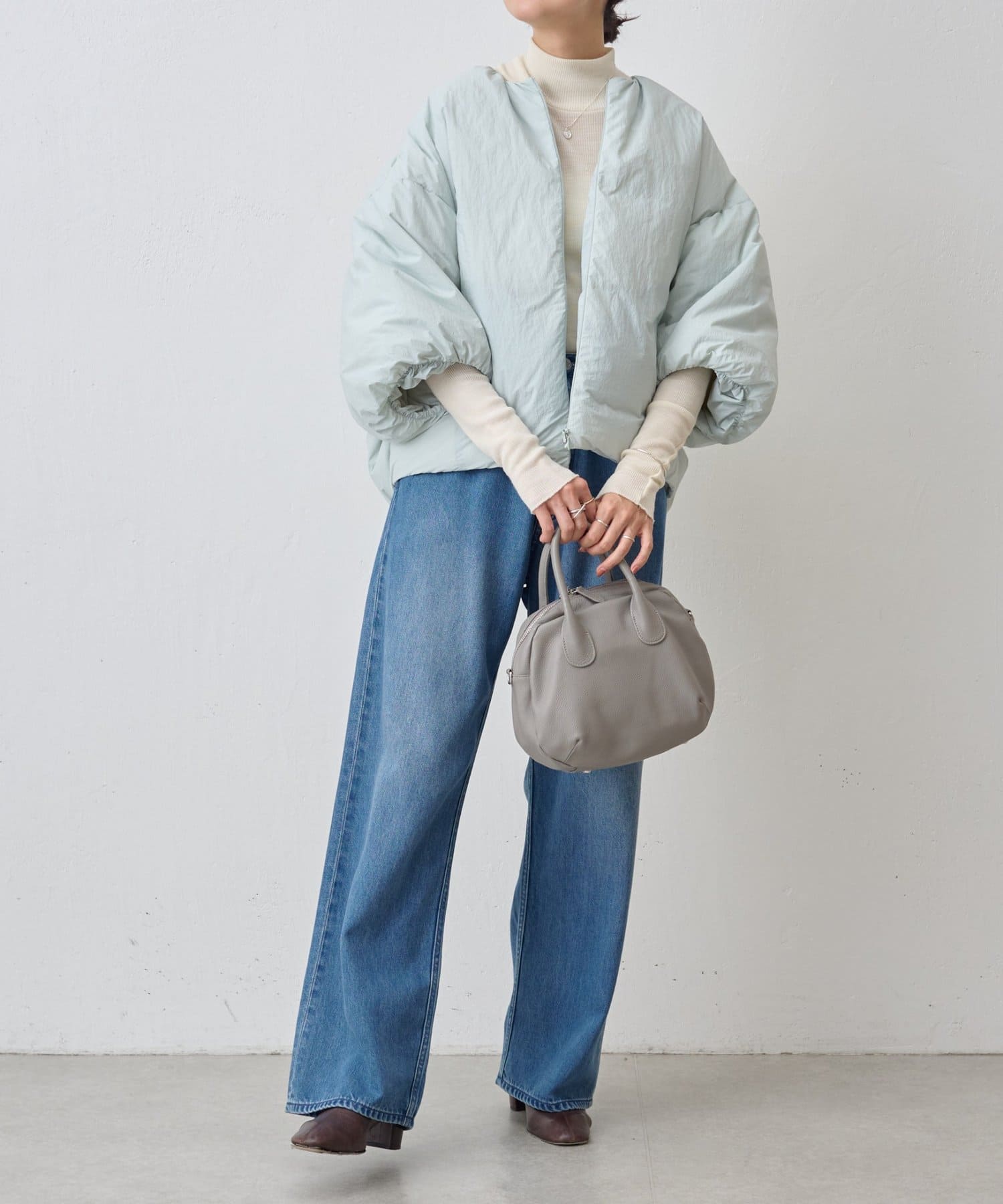 衿元はノーカラーですっきりと、袖口の内側にギャザーを寄せてバルーンシルエットにしています。