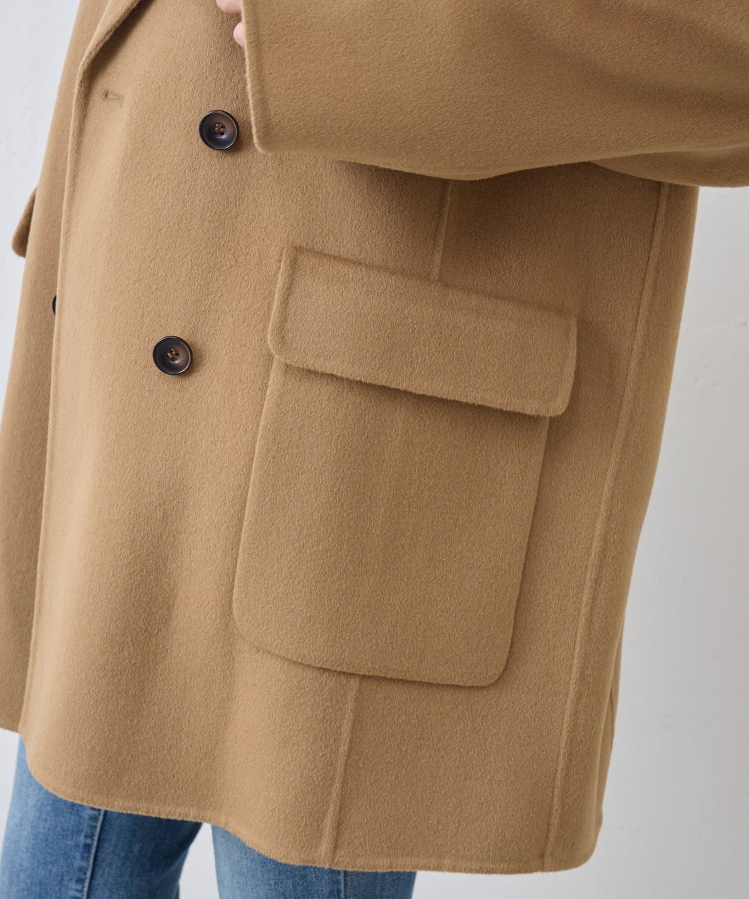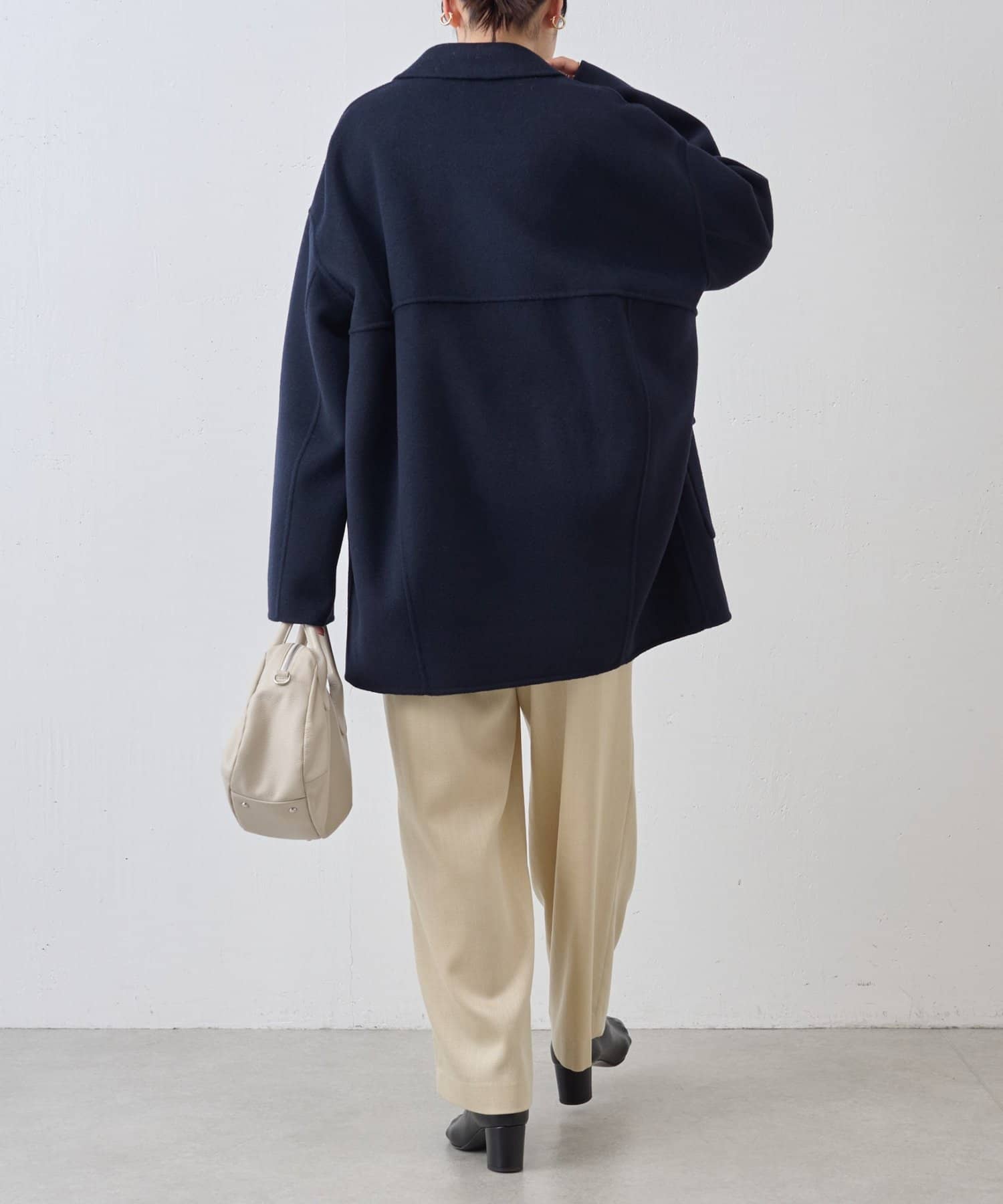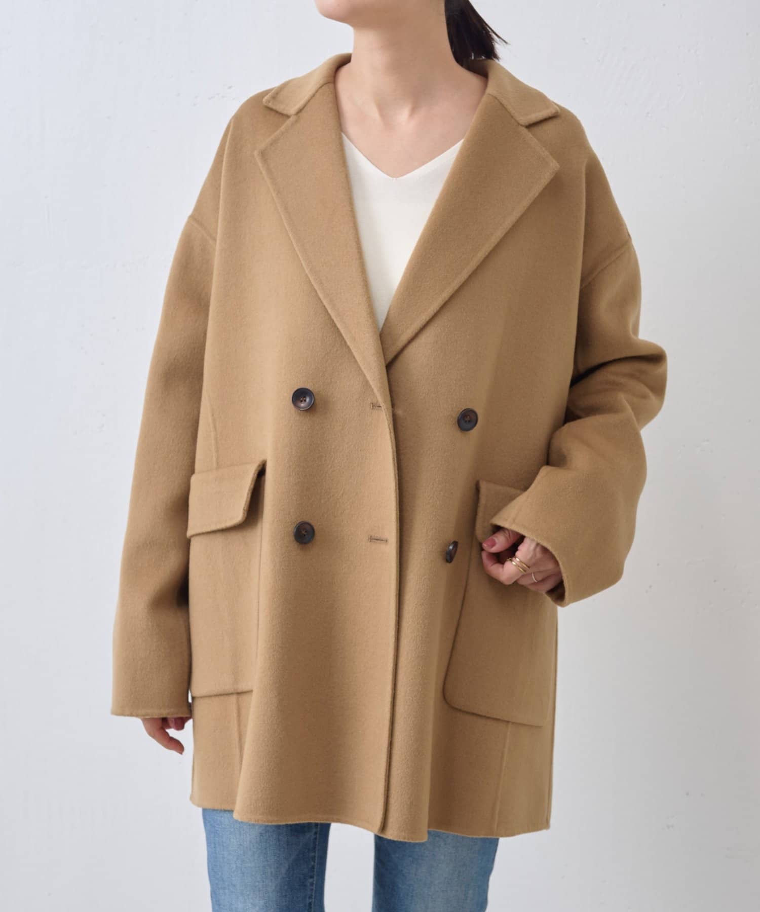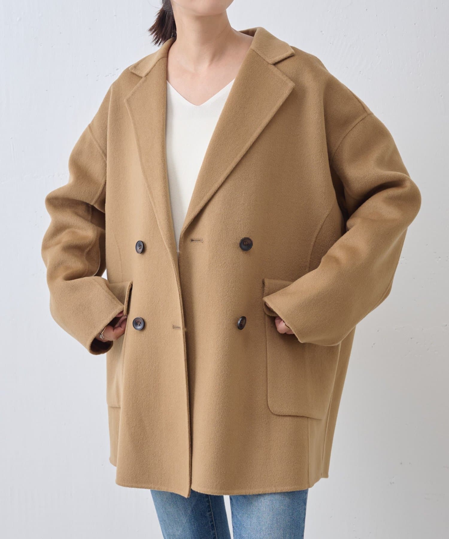 カシミア混のウールを使用し、軽やかであたたかい、リバー仕立てのピーコート。