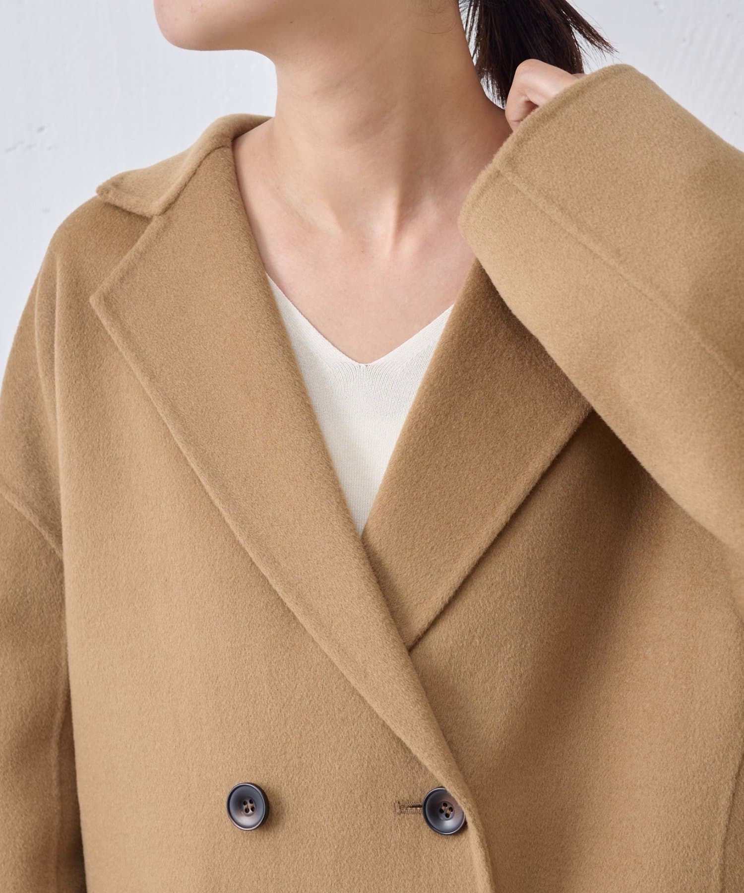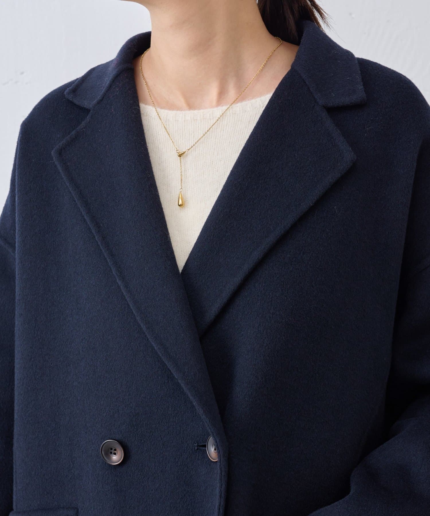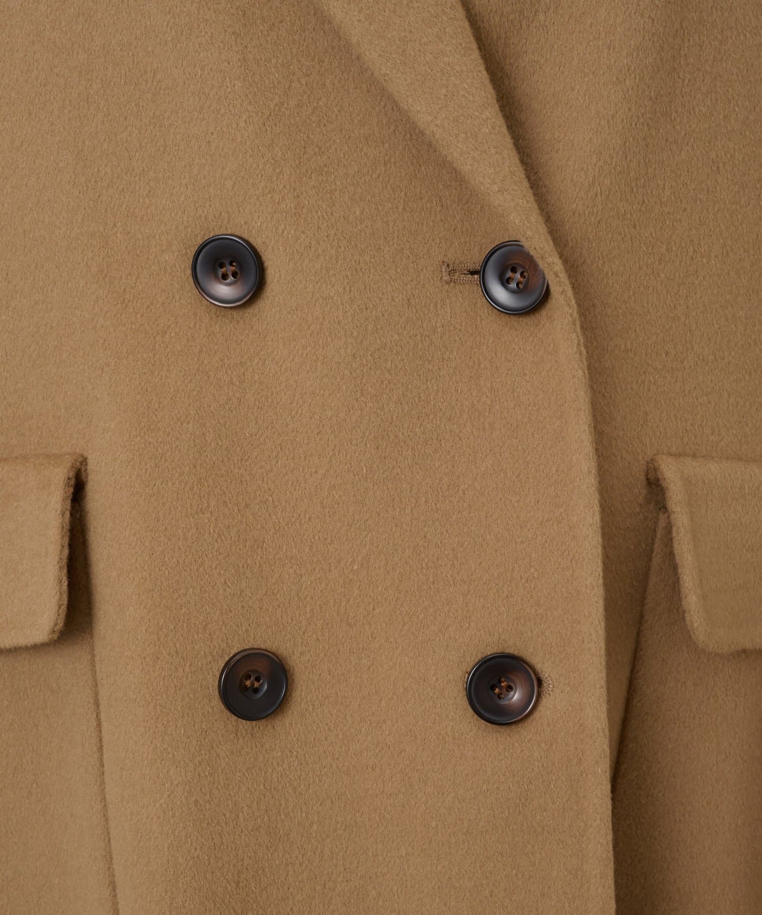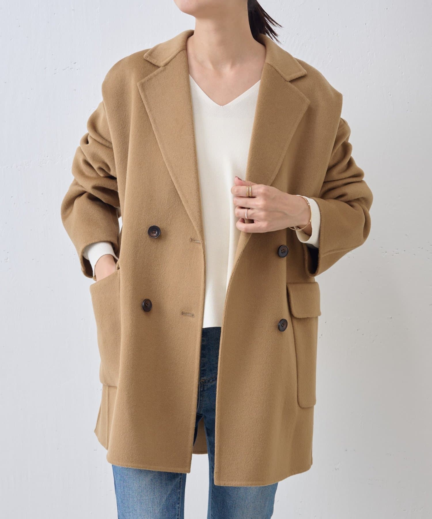 カシミア混のウールを使用し、軽やかであたたかい、リバー仕立てのピーコート。