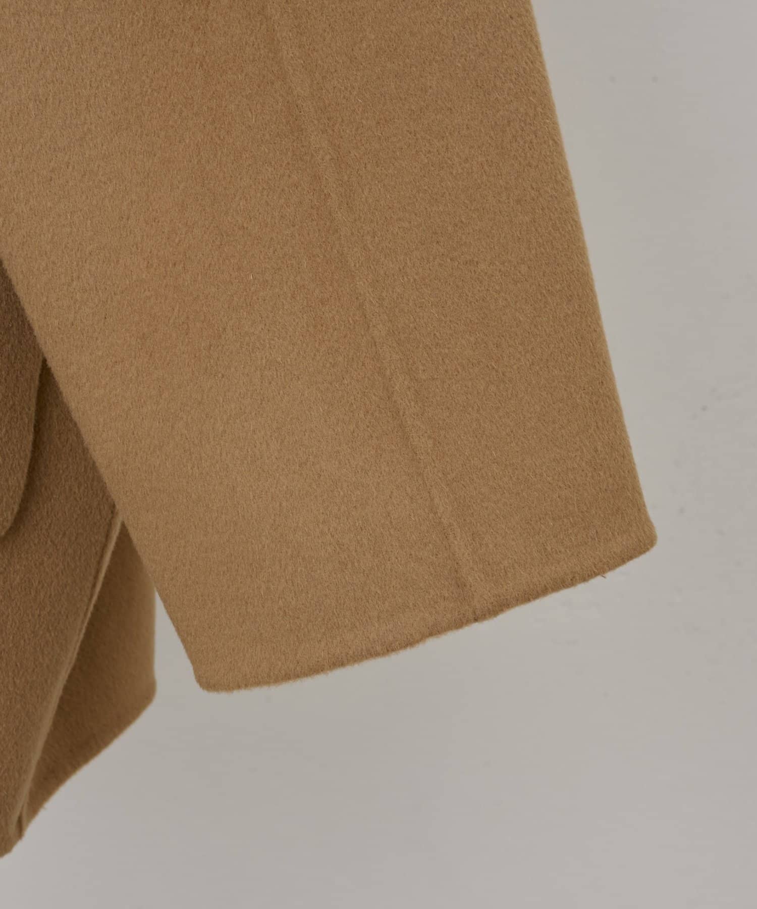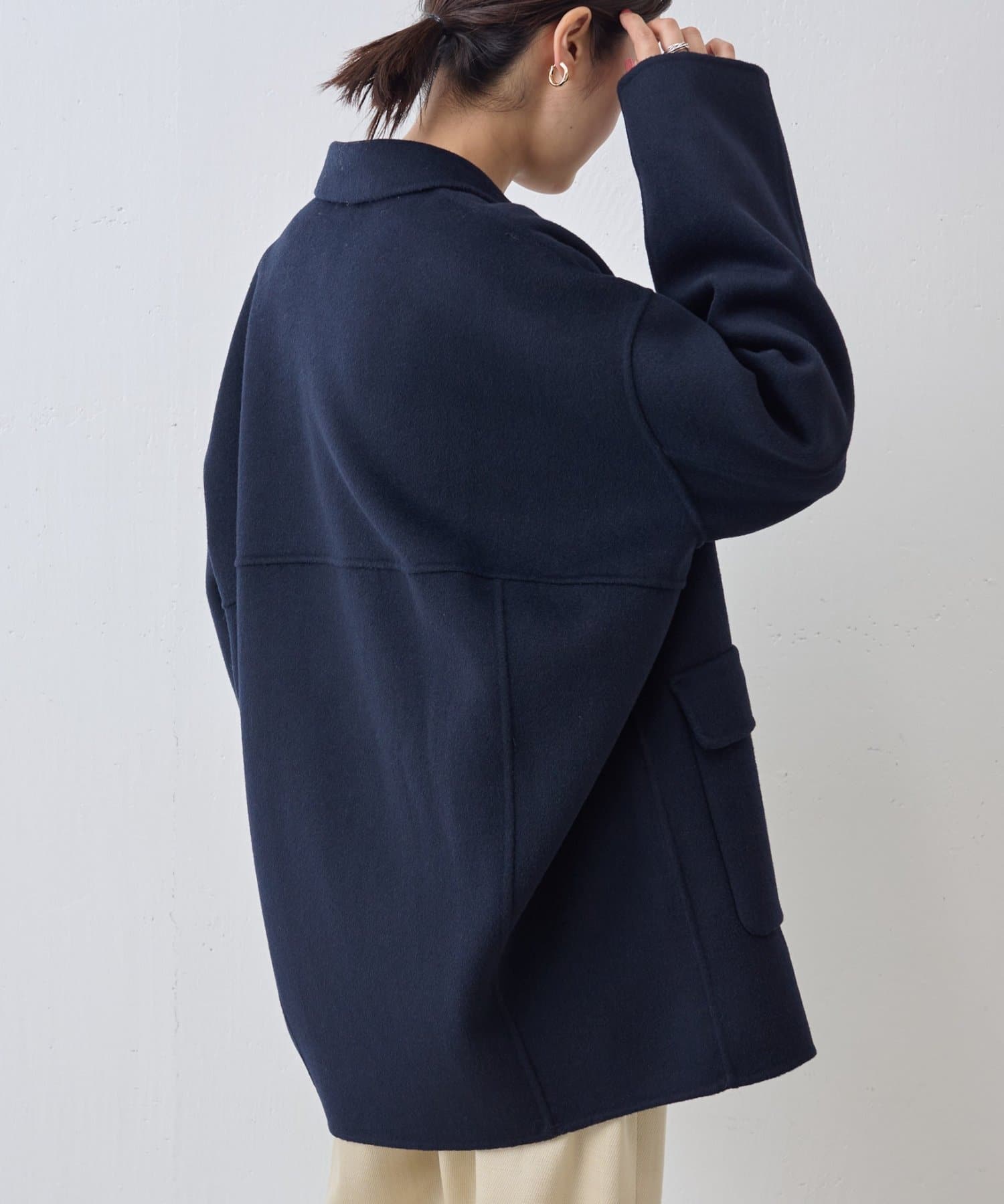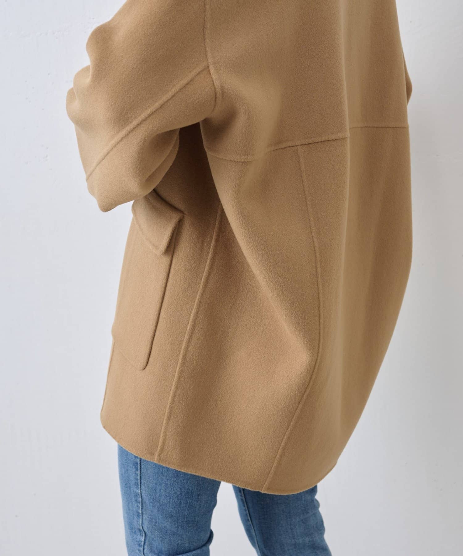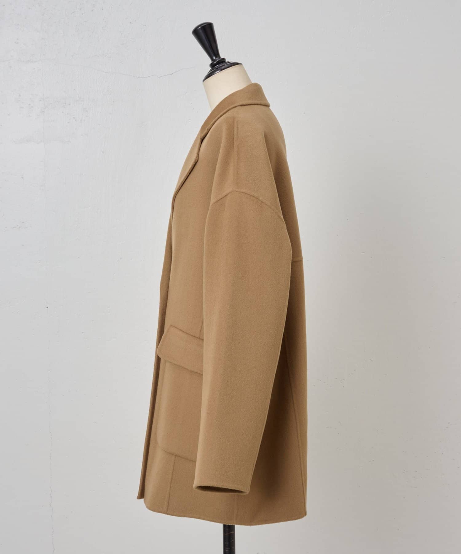 カシミア混のウールを使用し、軽やかであたたかい、リバー仕立てのピーコート。