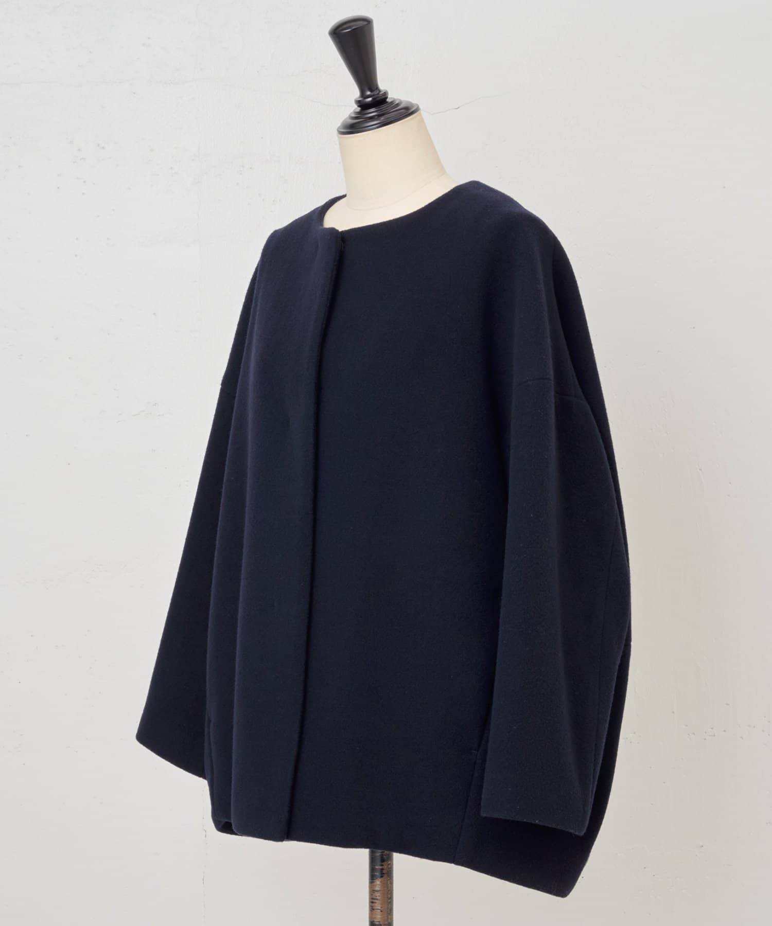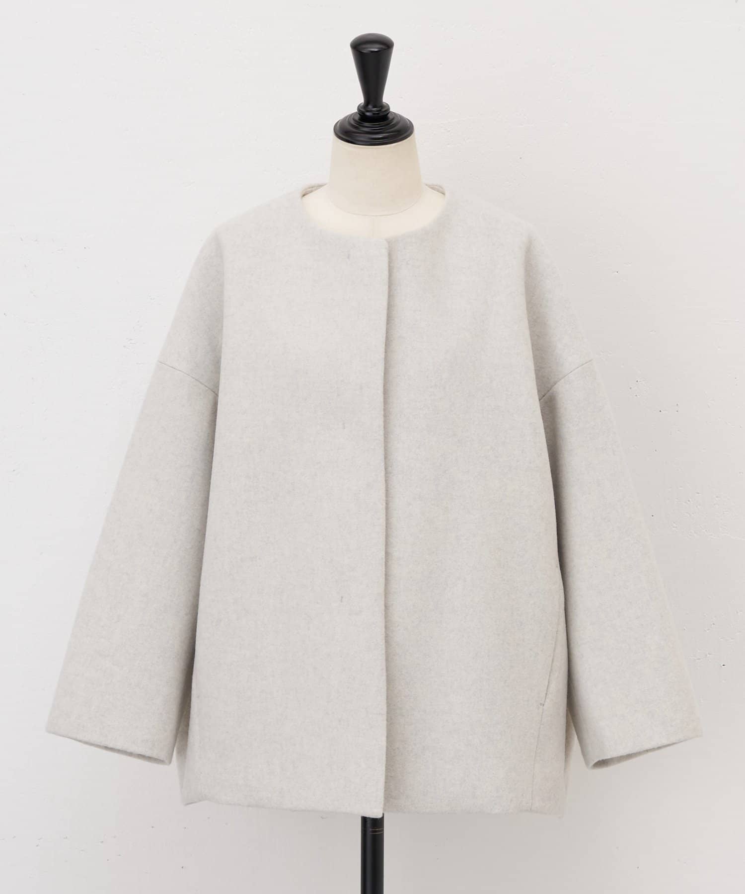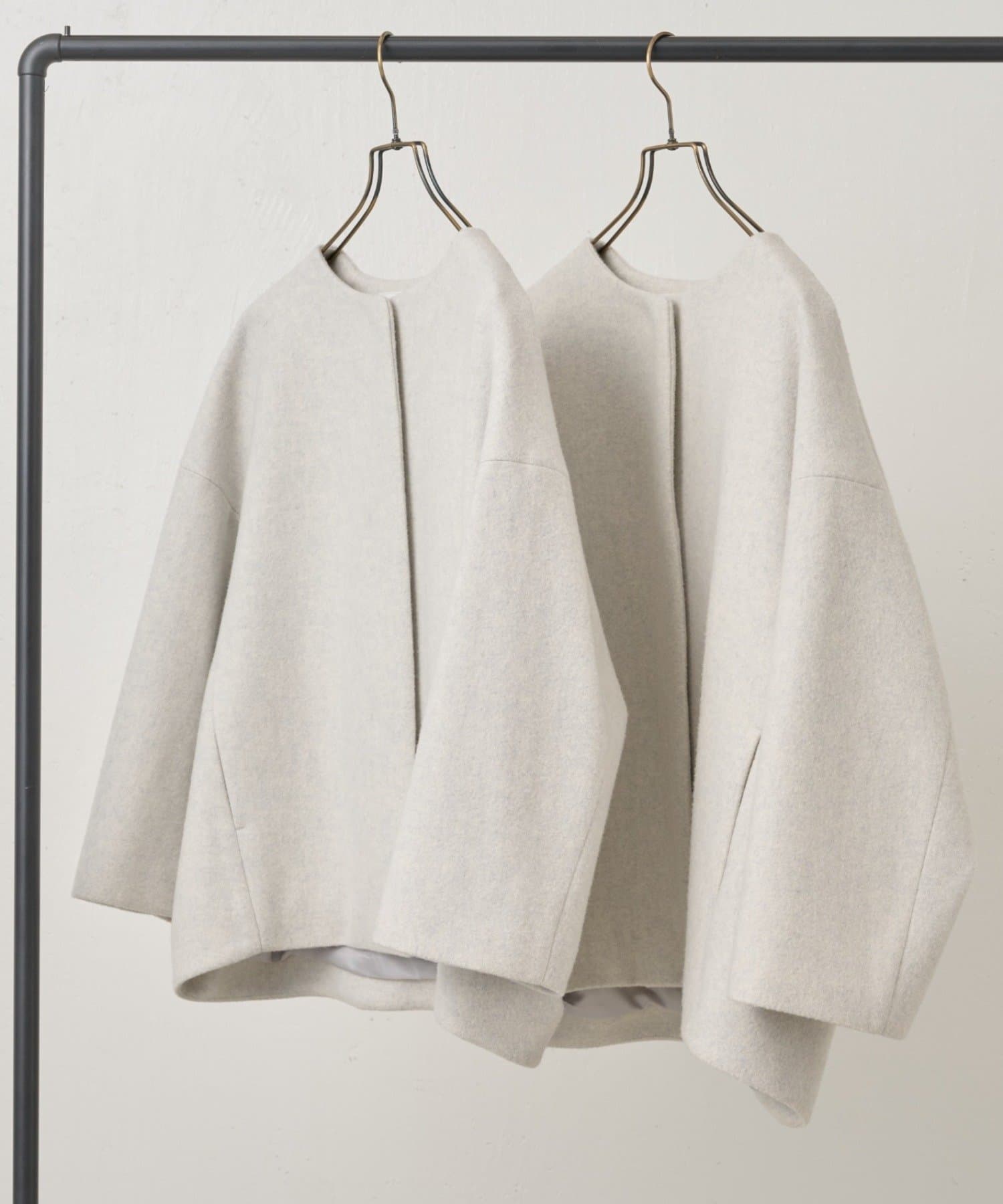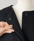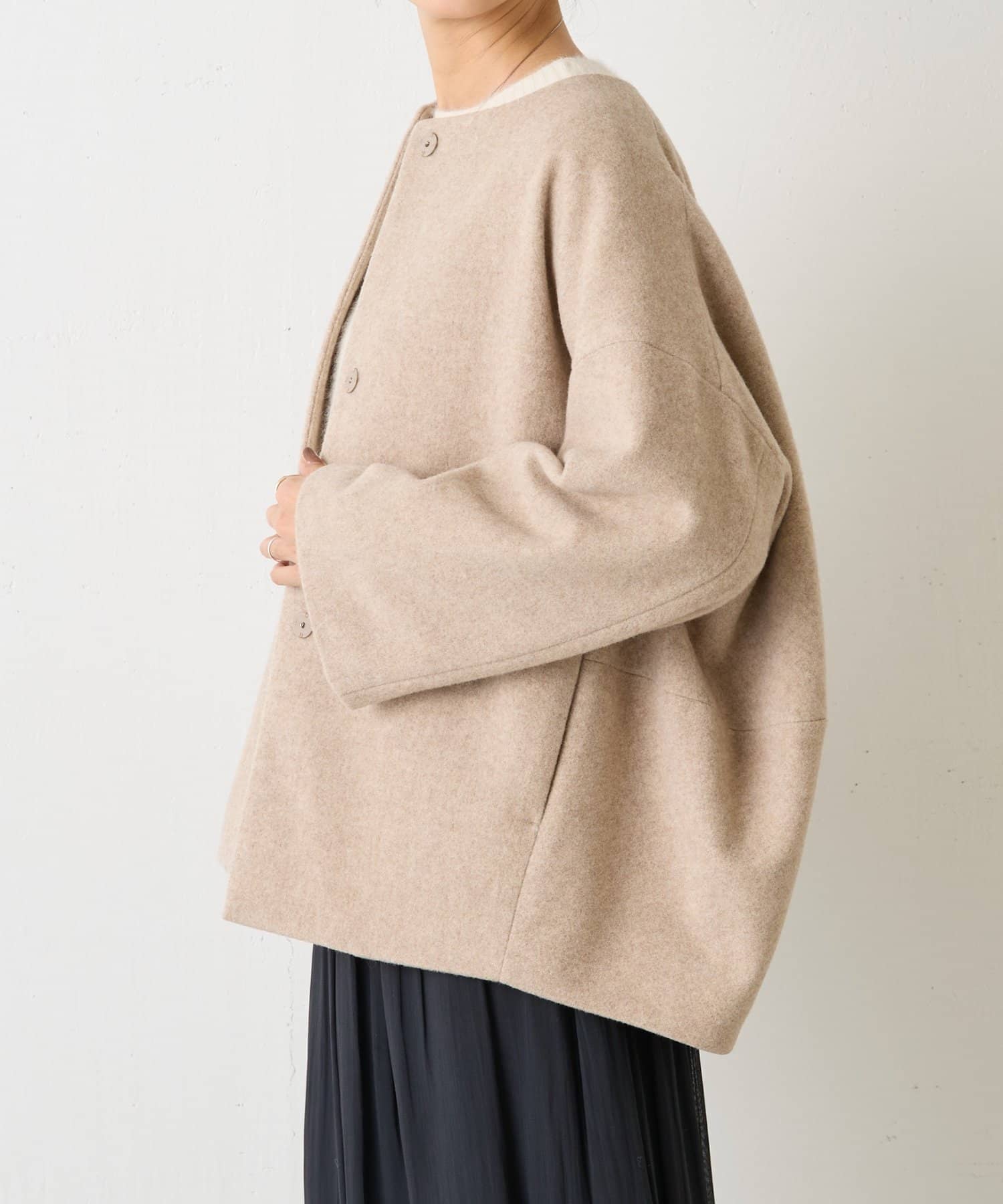 立体感のあるシルエットが魅力のノーカラーコート。