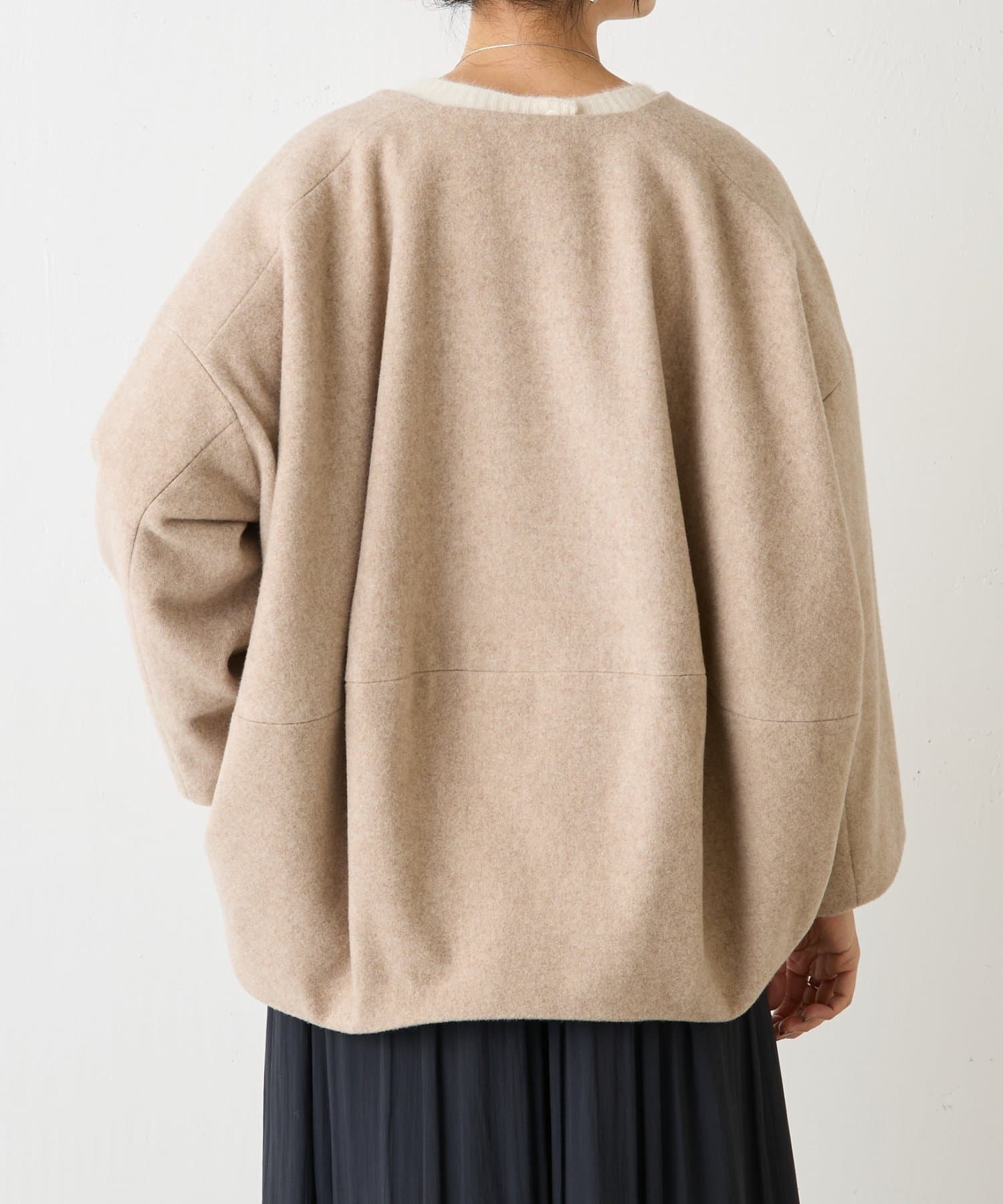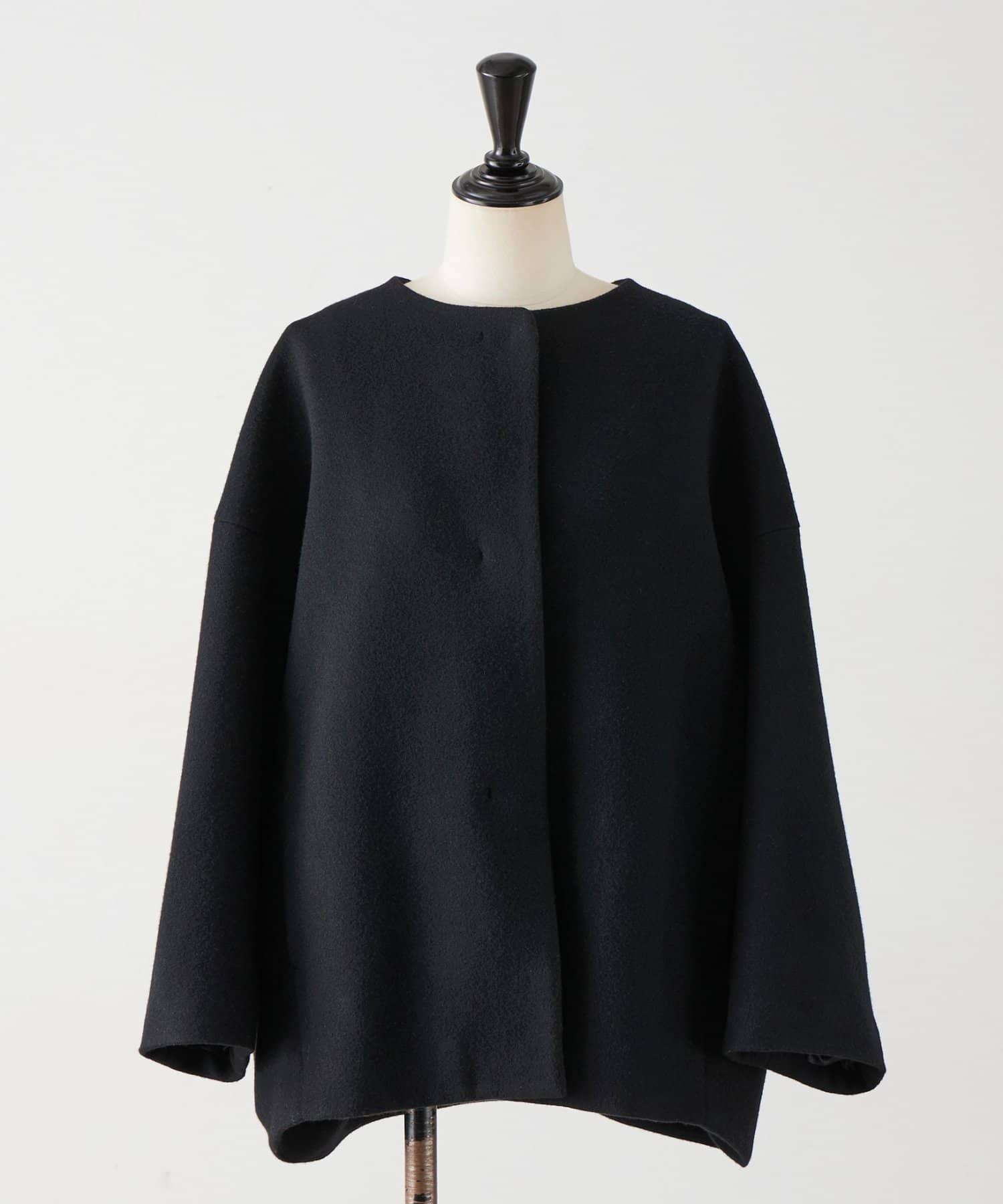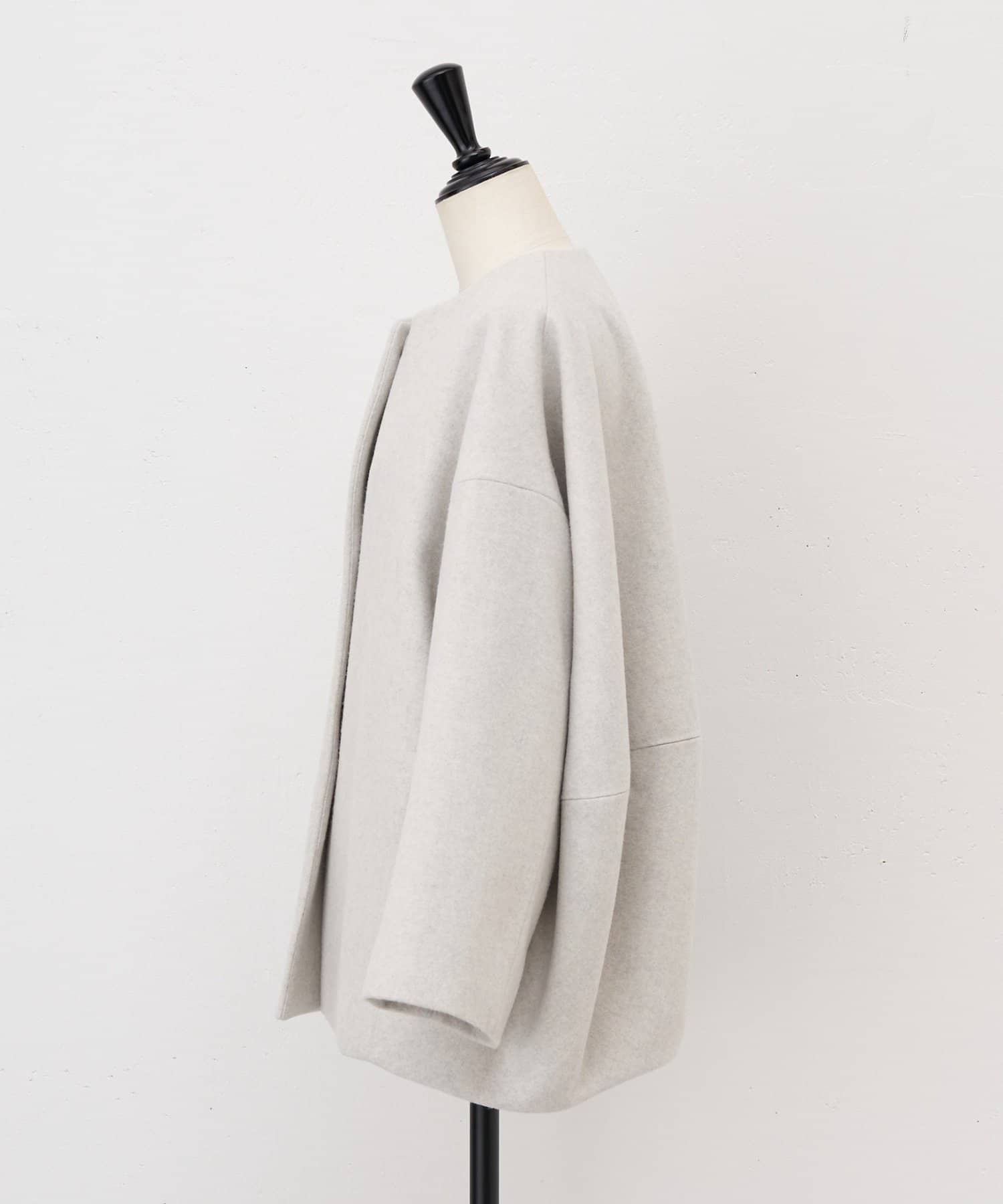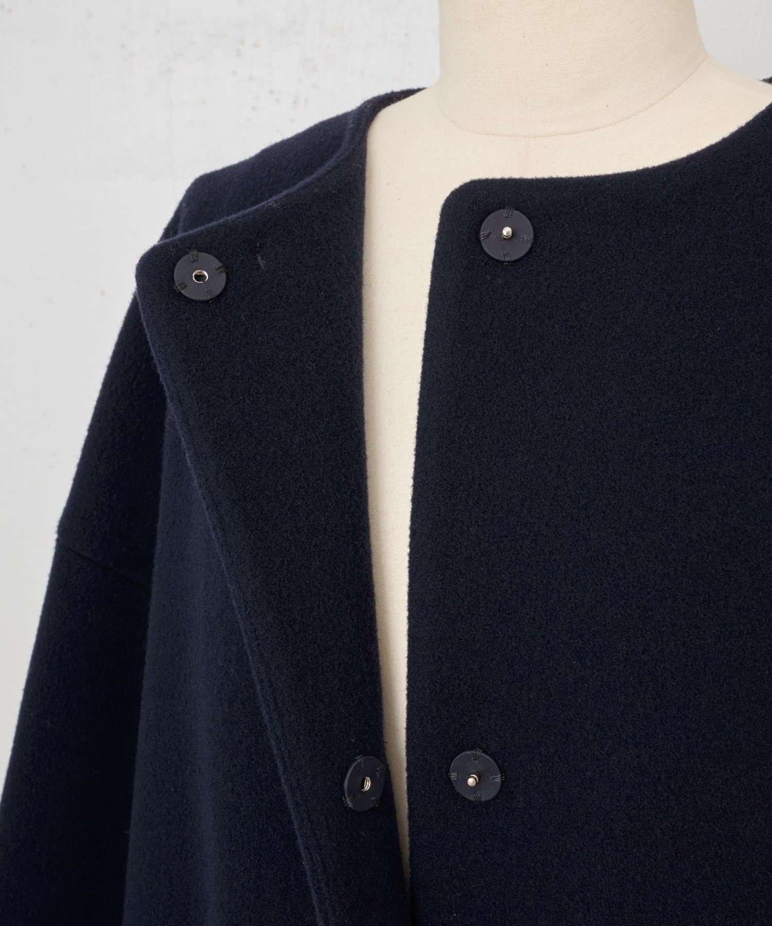 立体感のあるシルエットが魅力のノーカラーコート。