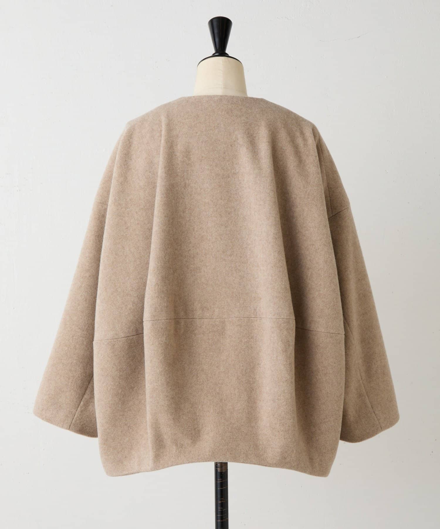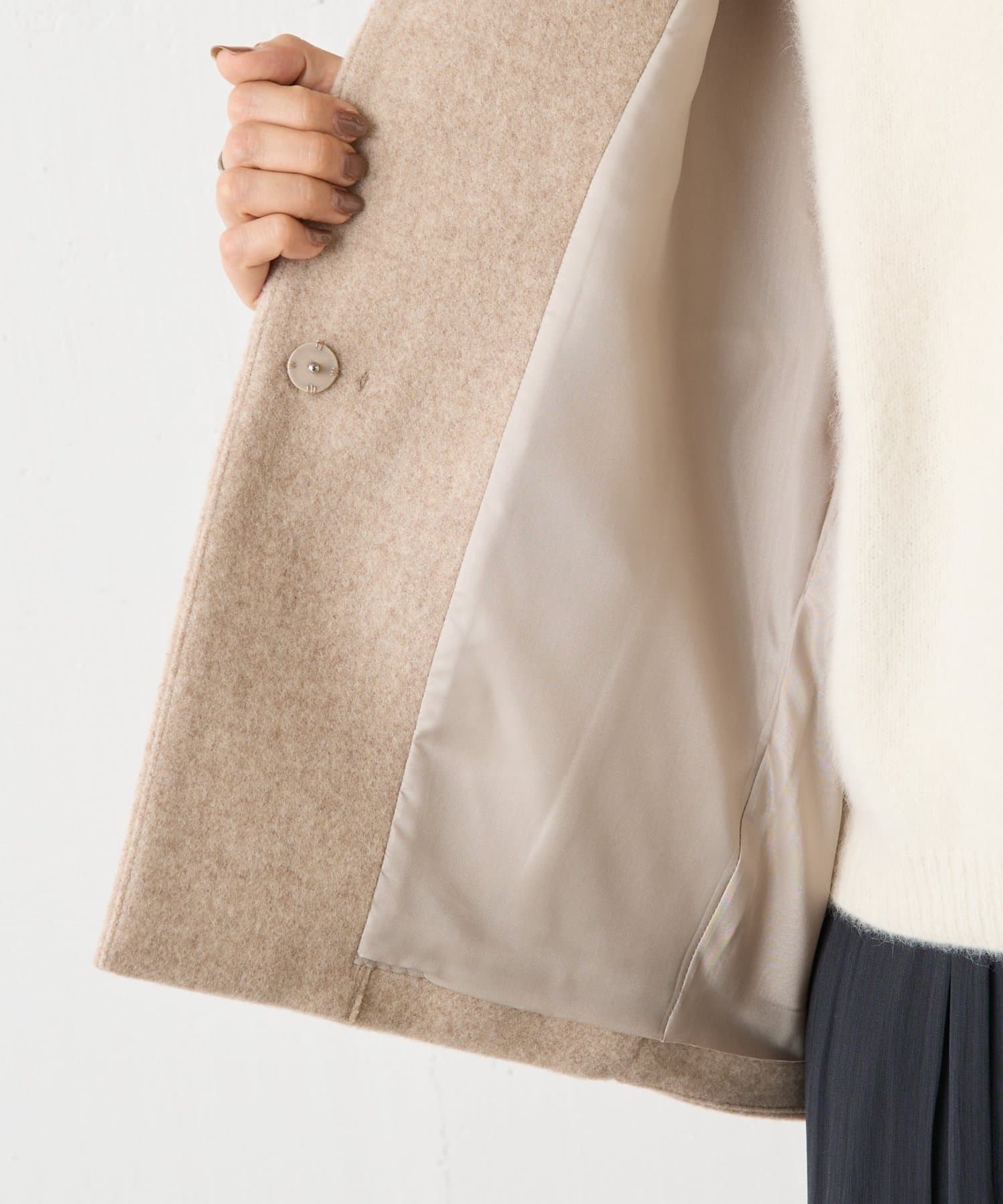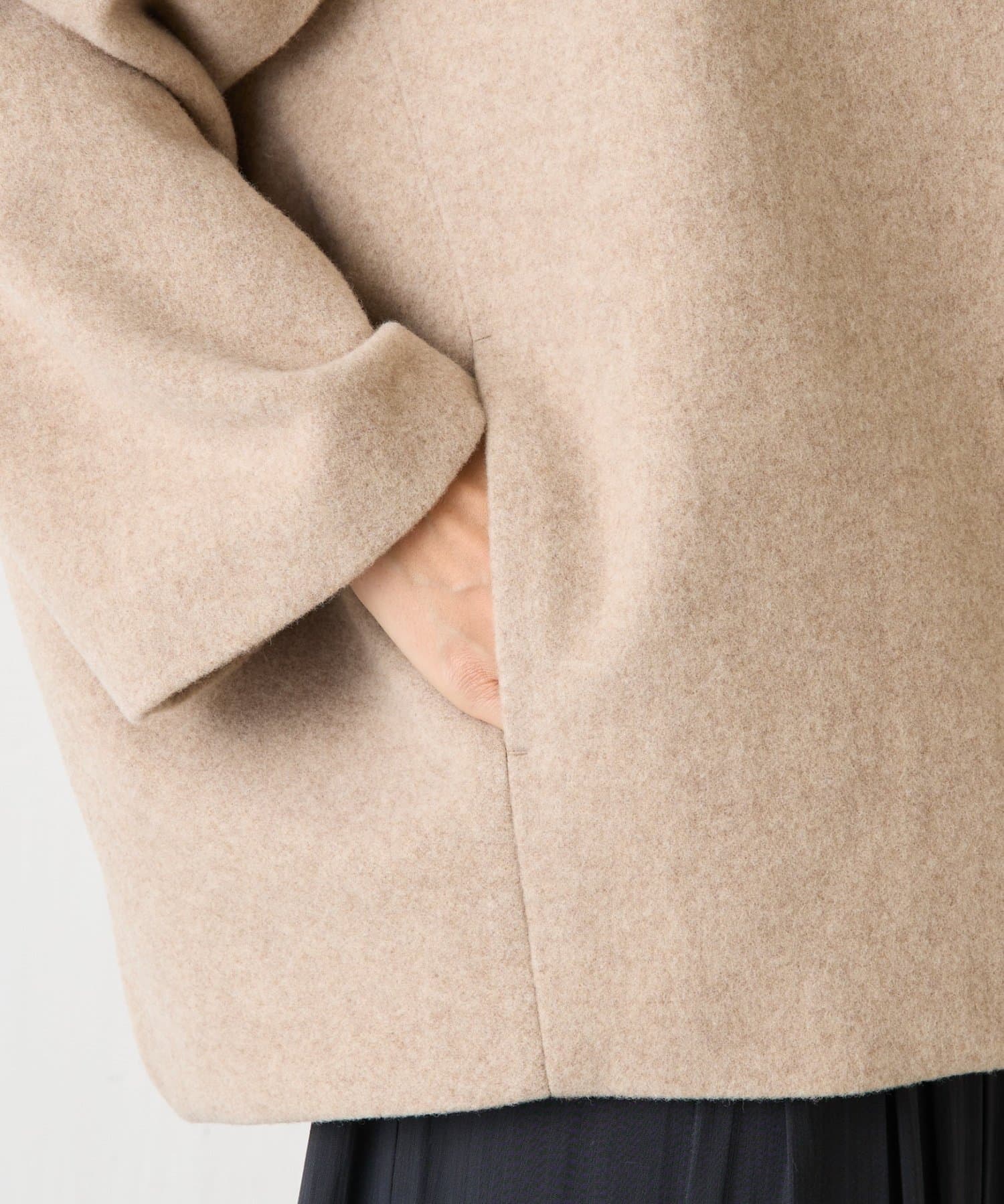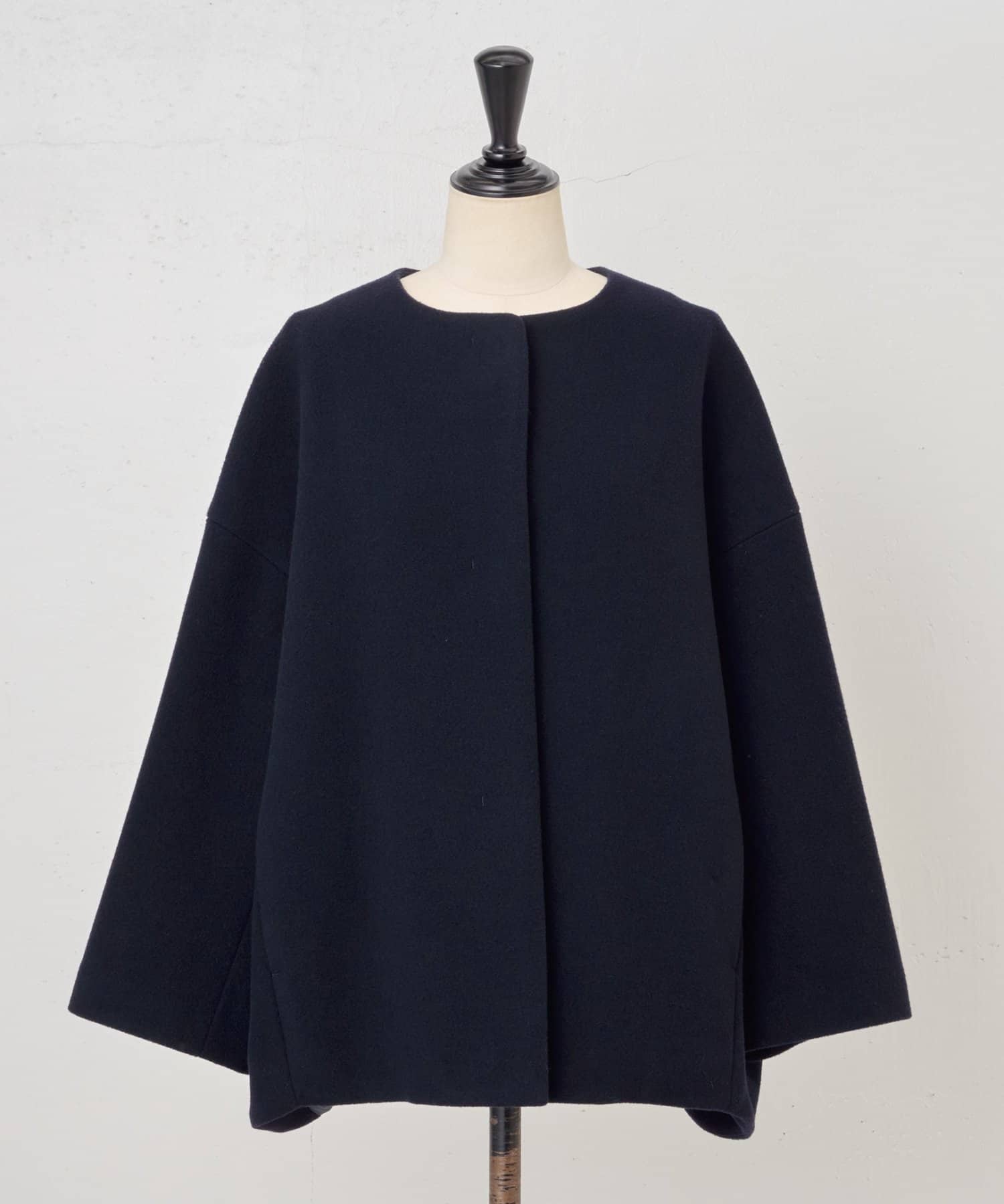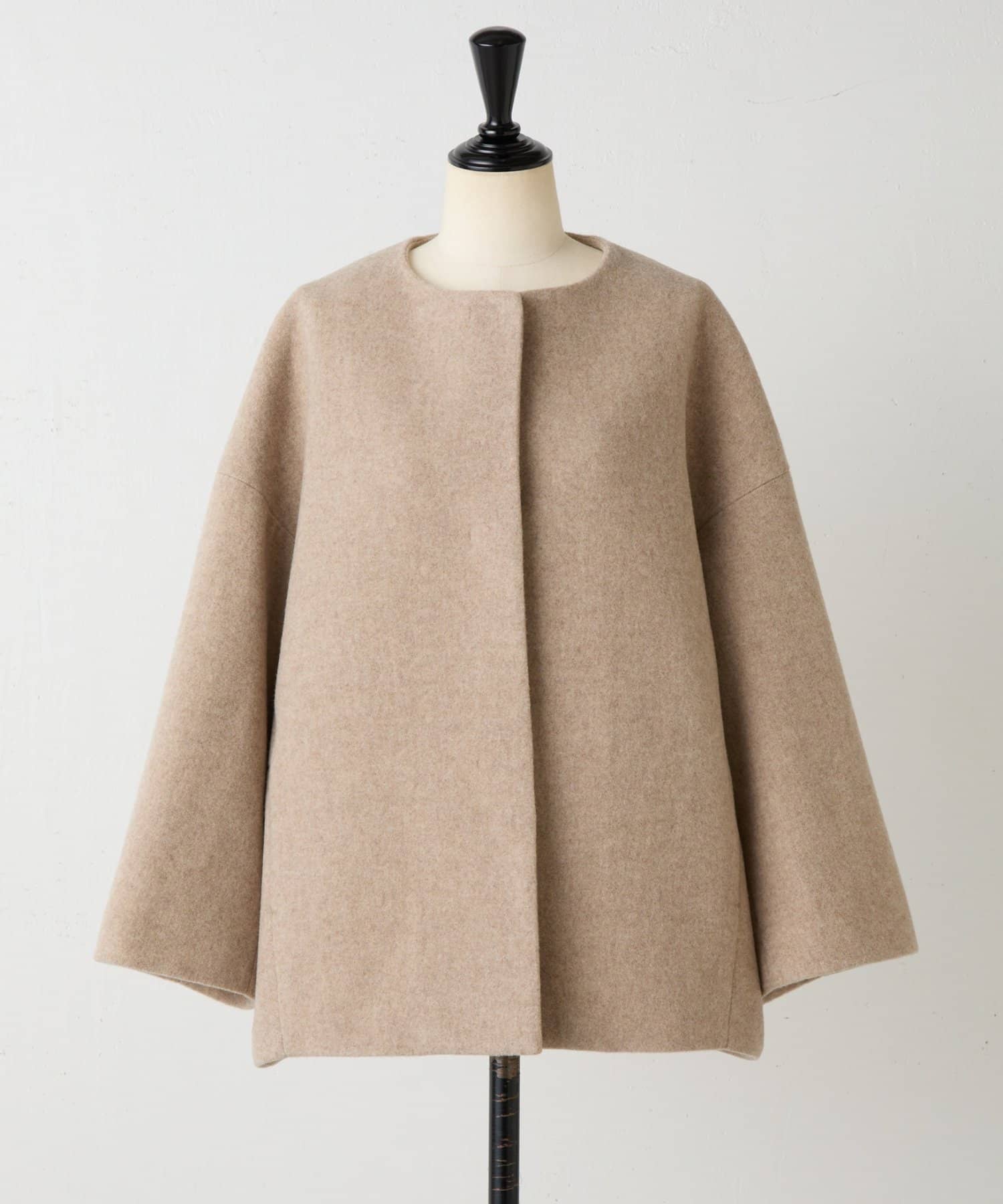 立体感のあるシルエットが魅力のノーカラーコート。