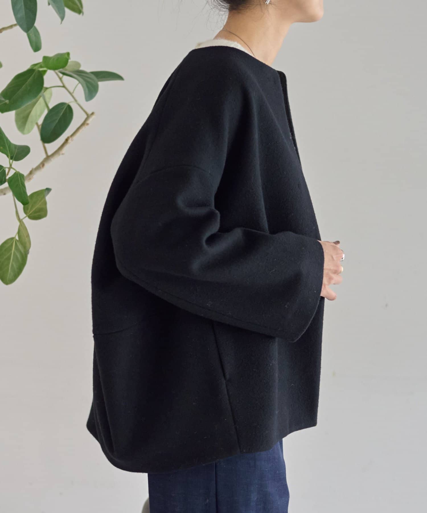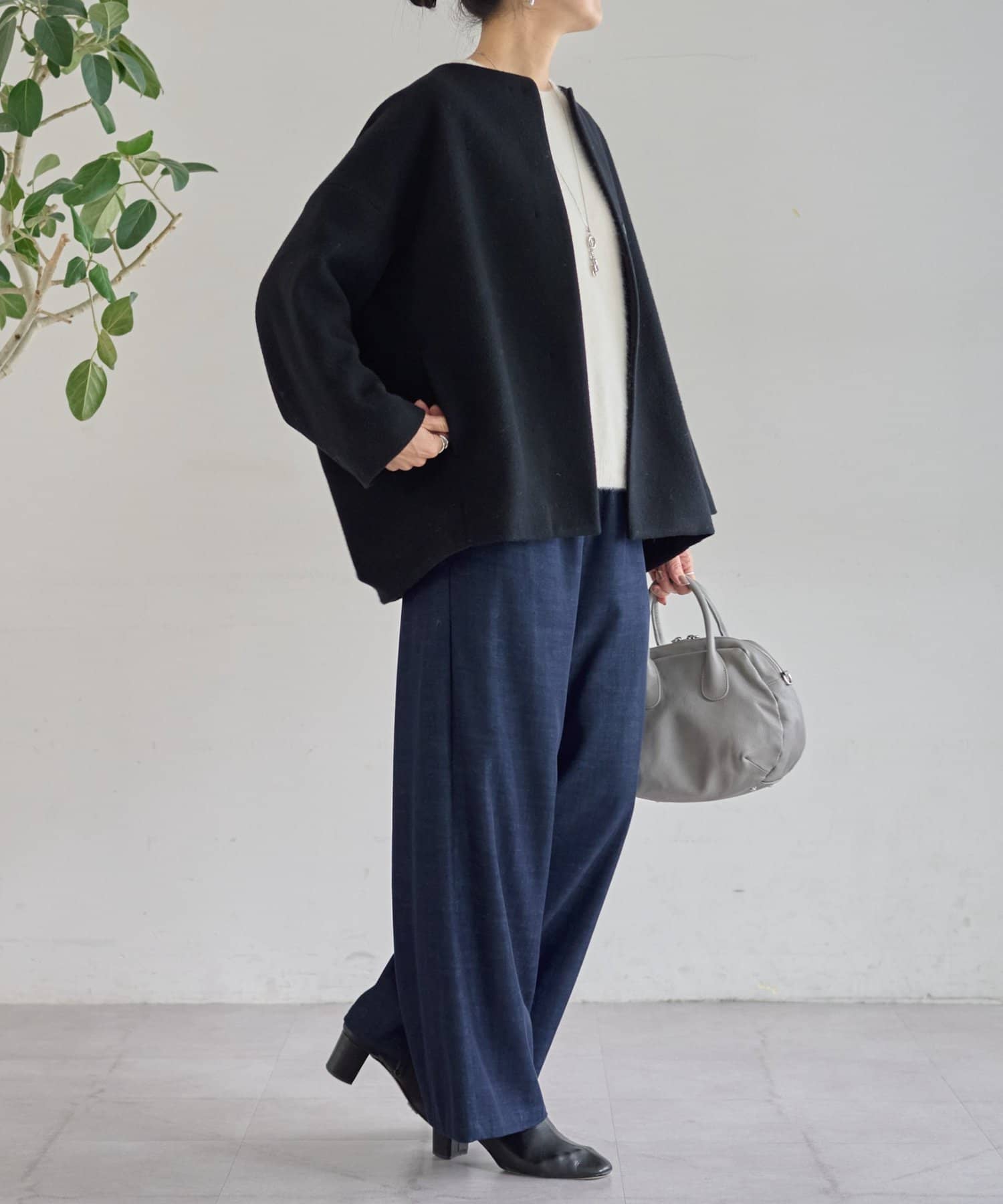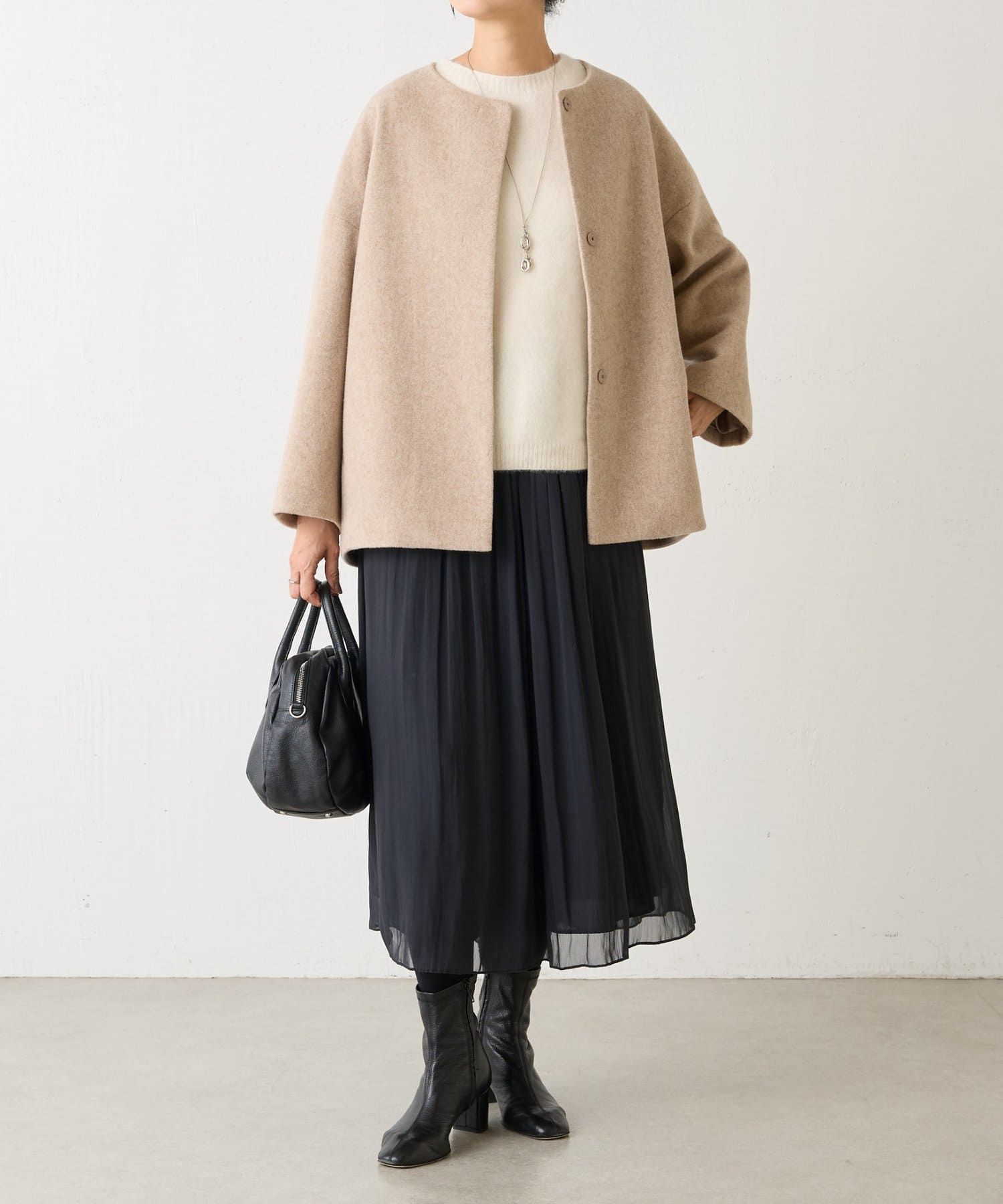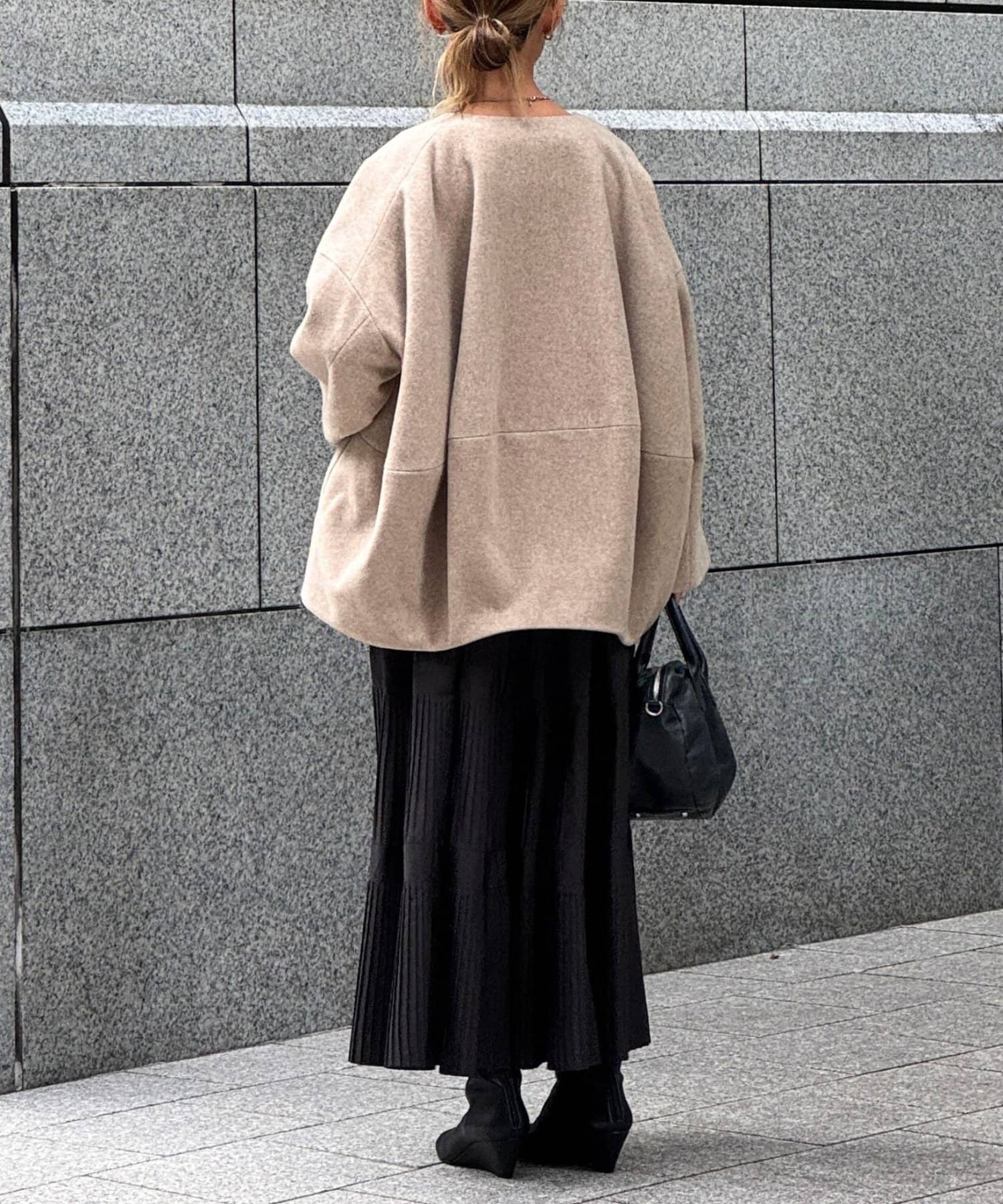 ノーカラー仕様なのでタートルやストールとのレイヤードも楽しめ、秋冬のスタイリングに品よく仕上げてくれます。