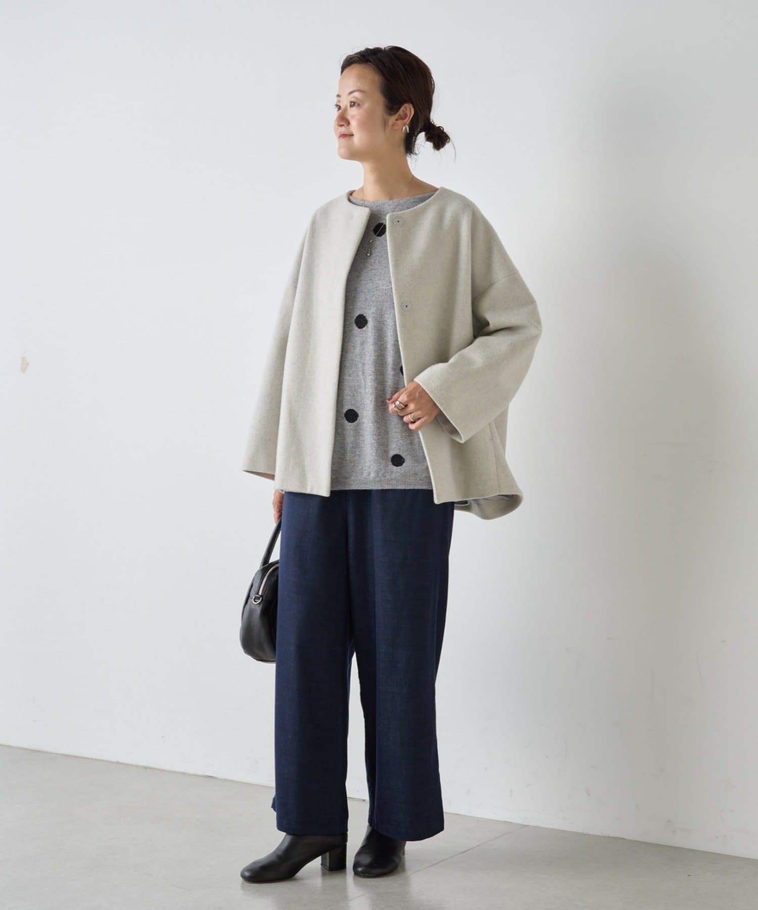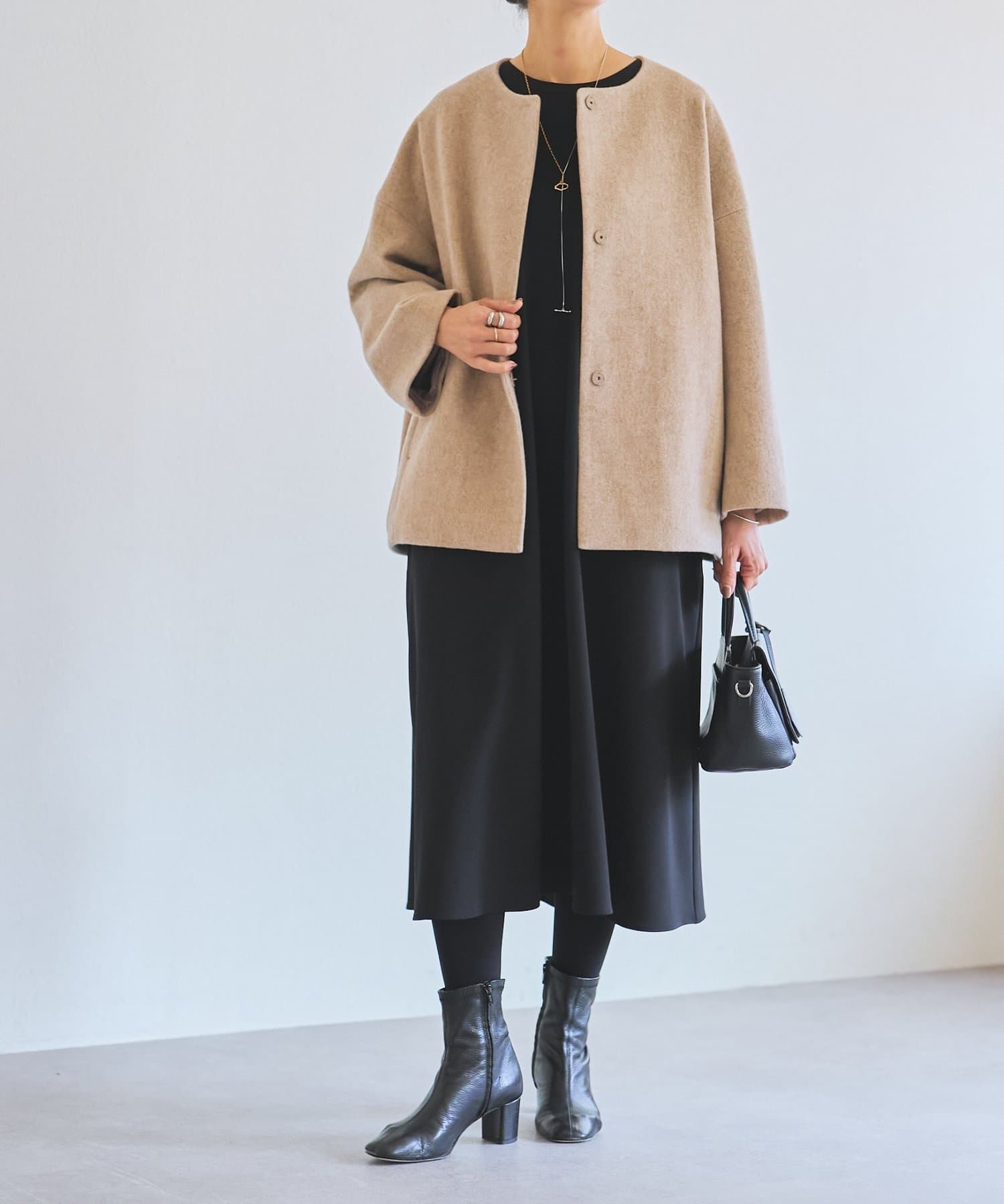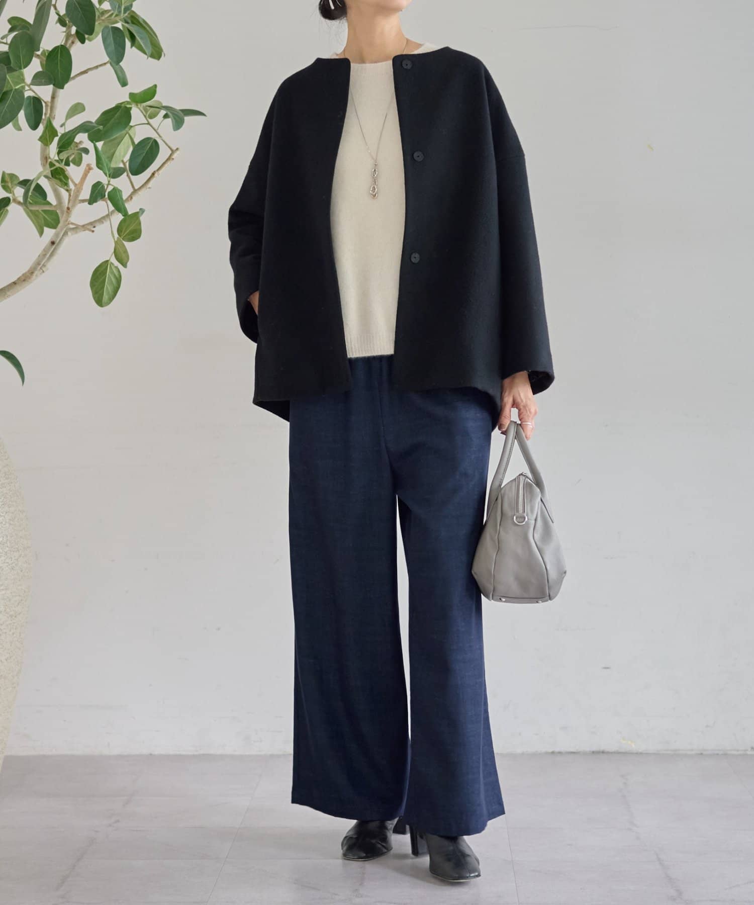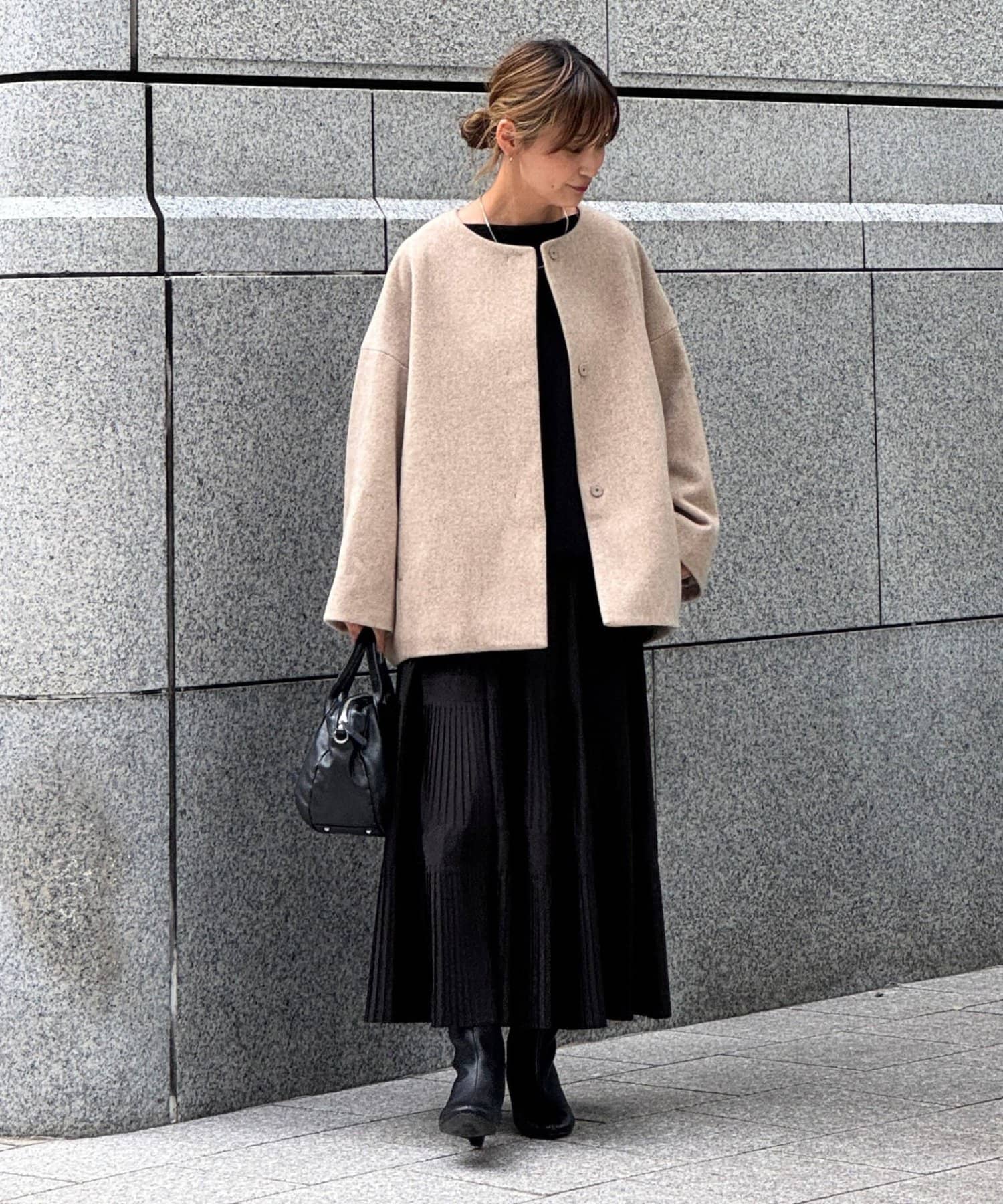 ノーカラー仕様なのでタートルやストールとのレイヤードも楽しめ、秋冬のスタイリングに品よく仕上げてくれます。