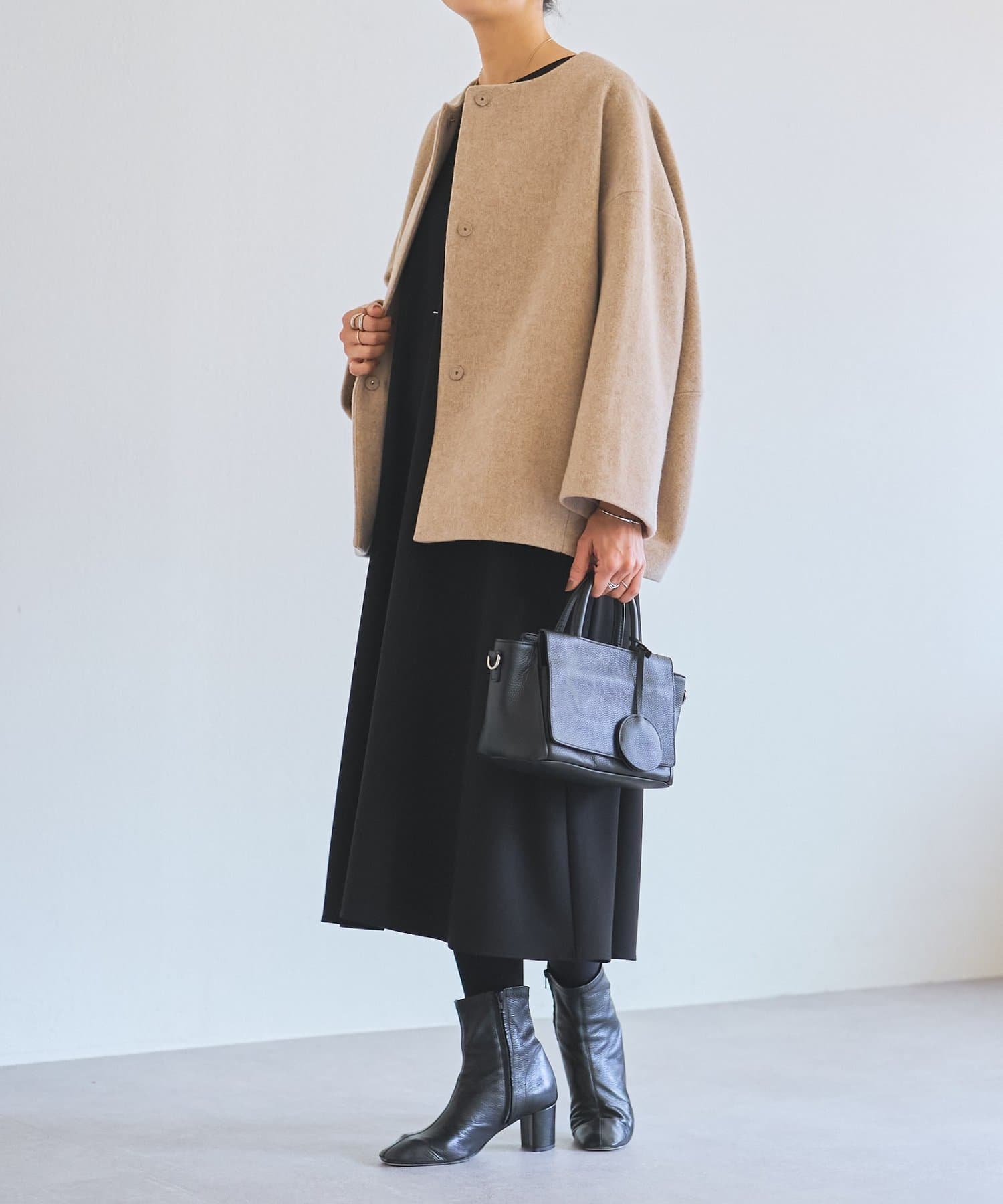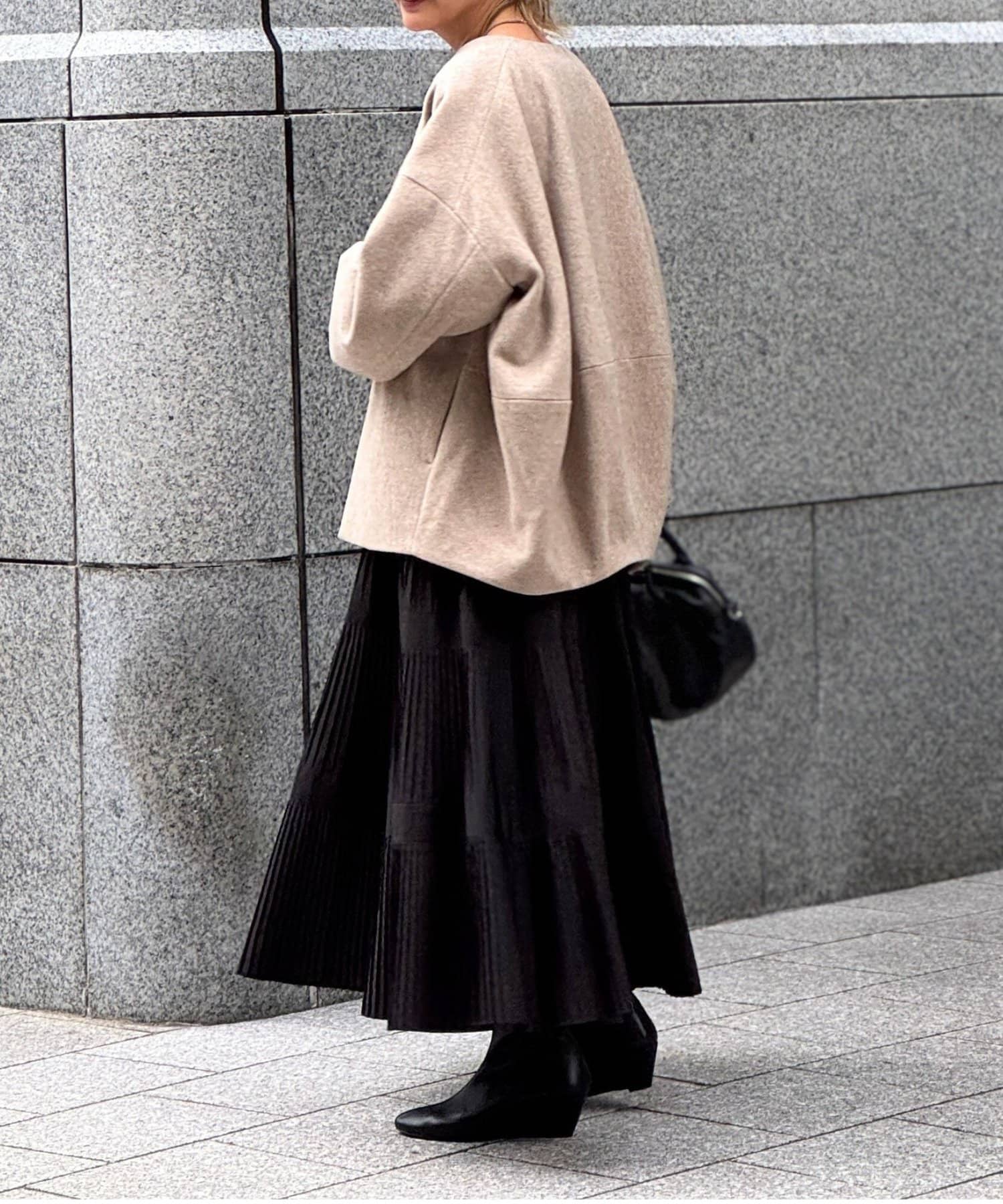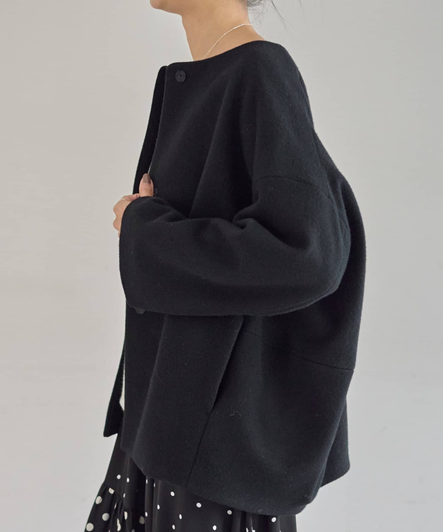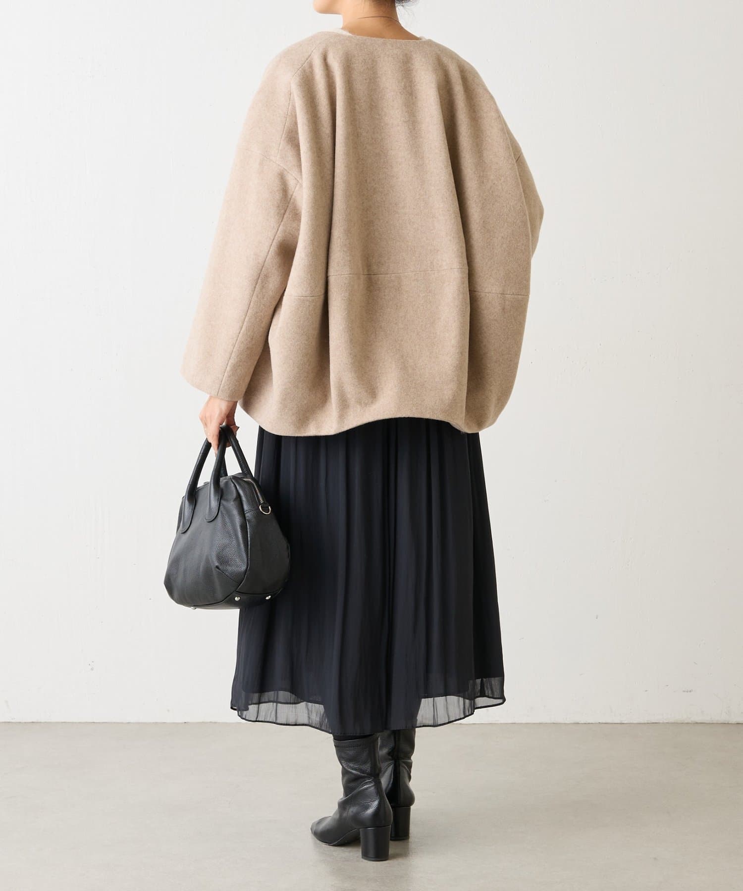 ノーカラー仕様なのでタートルやストールとのレイヤードも楽しめ、秋冬のスタイリングに品よく仕上げてくれます。