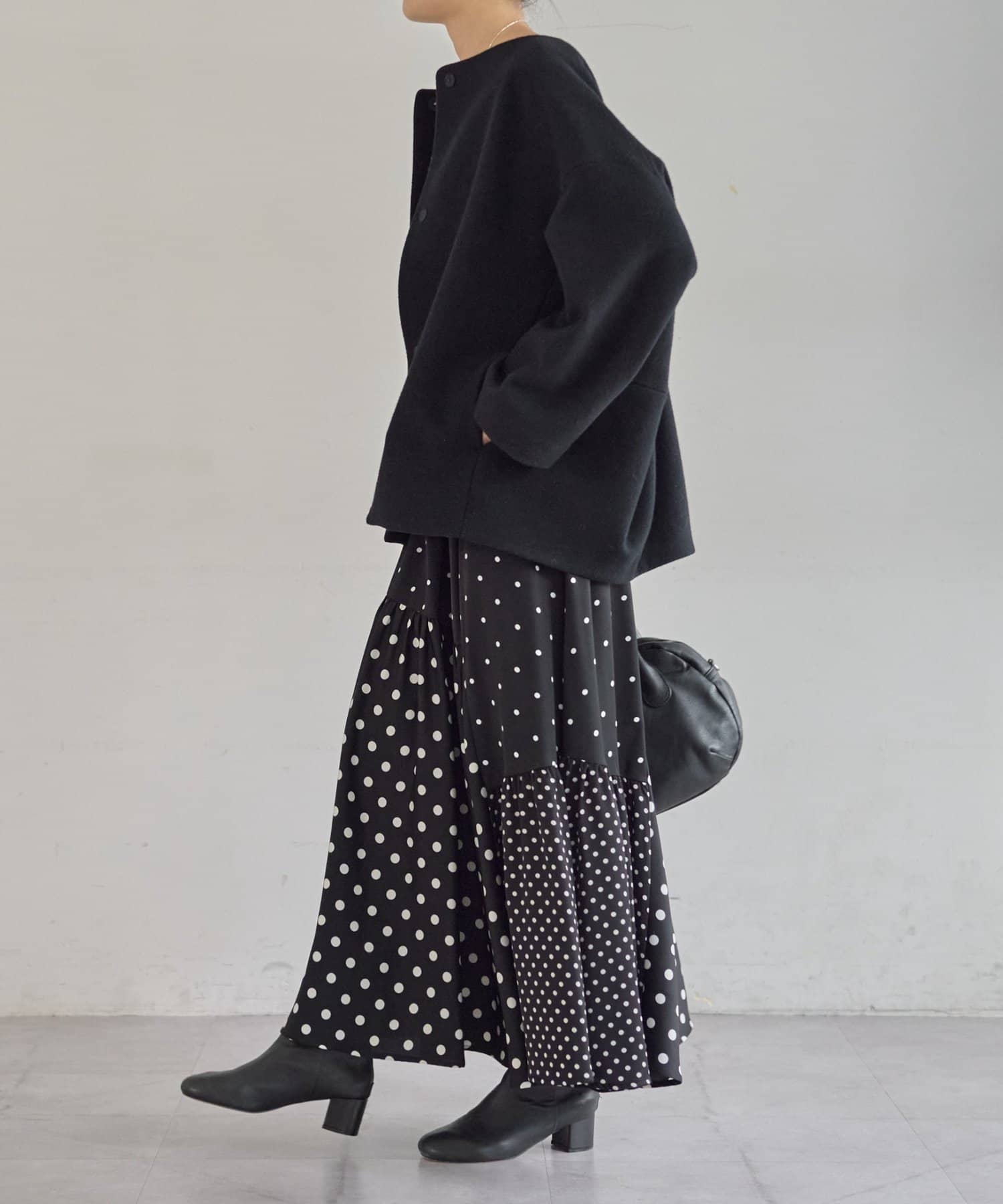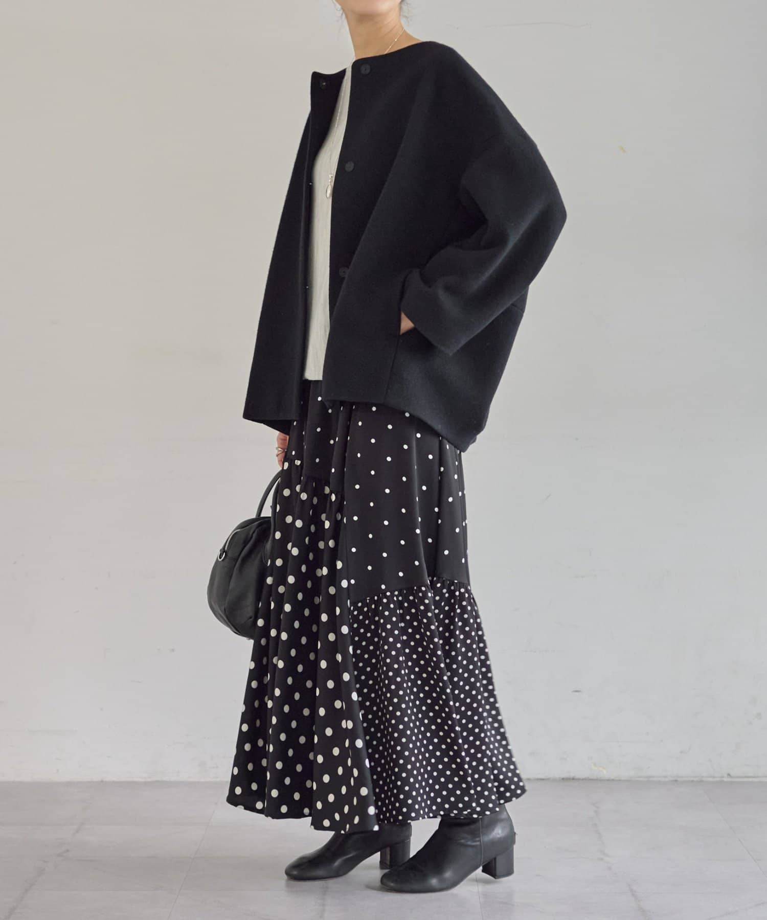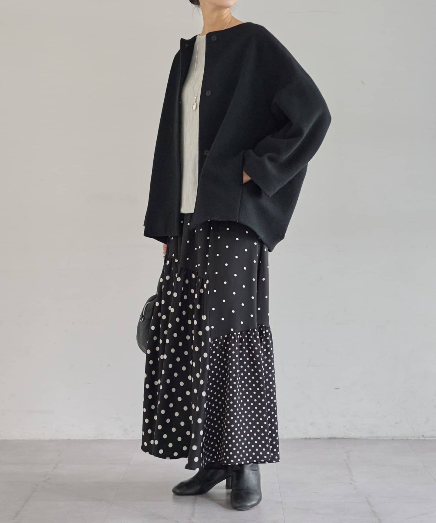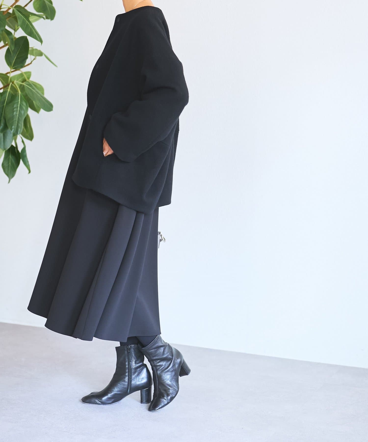 ノーカラー仕様なのでタートルやストールとのレイヤードも楽しめ、秋冬のスタイリングに品よく仕上げてくれます。