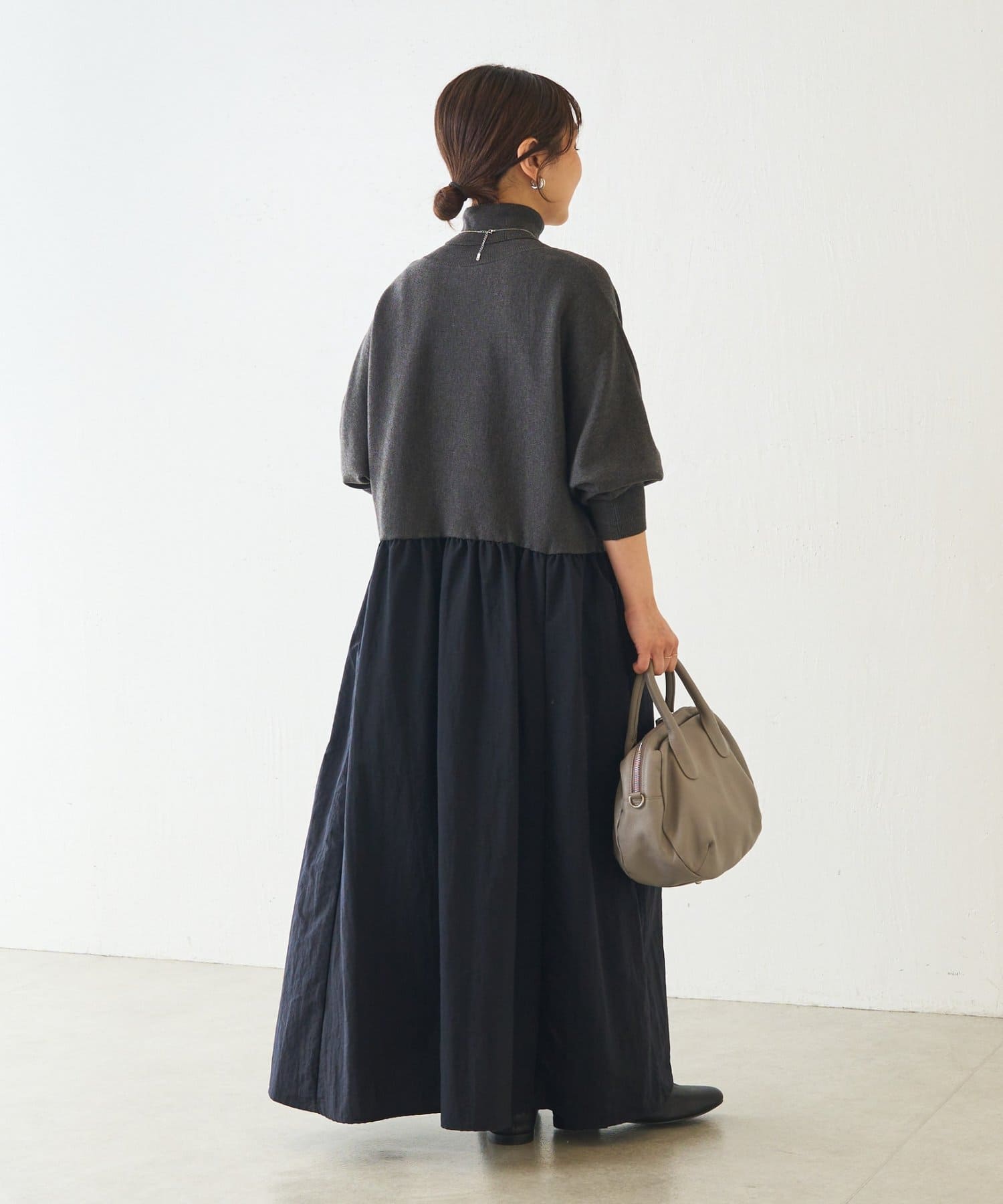 タートルネックニット×布帛のギャザースカートを組み合わせた上品なワンピース。