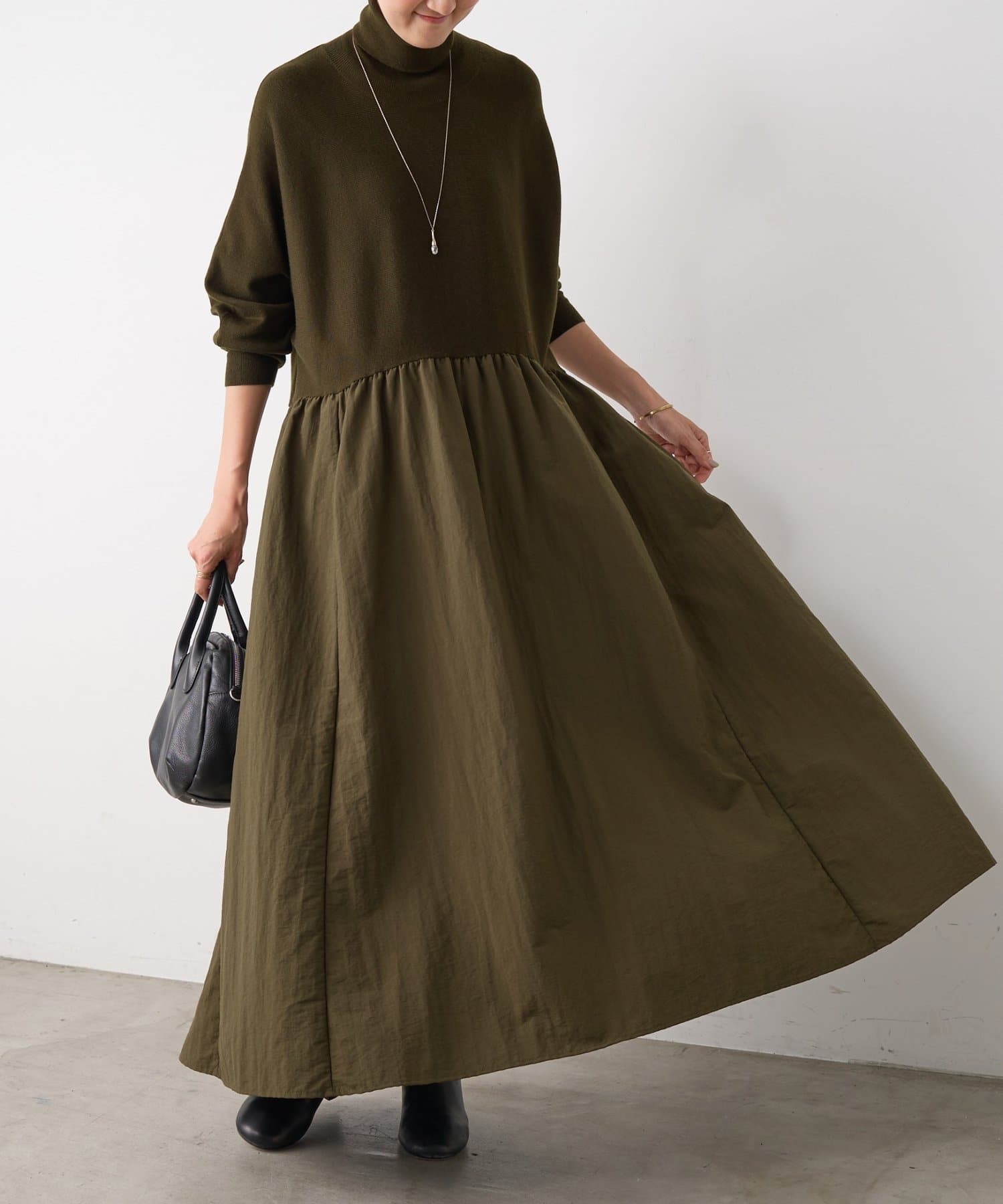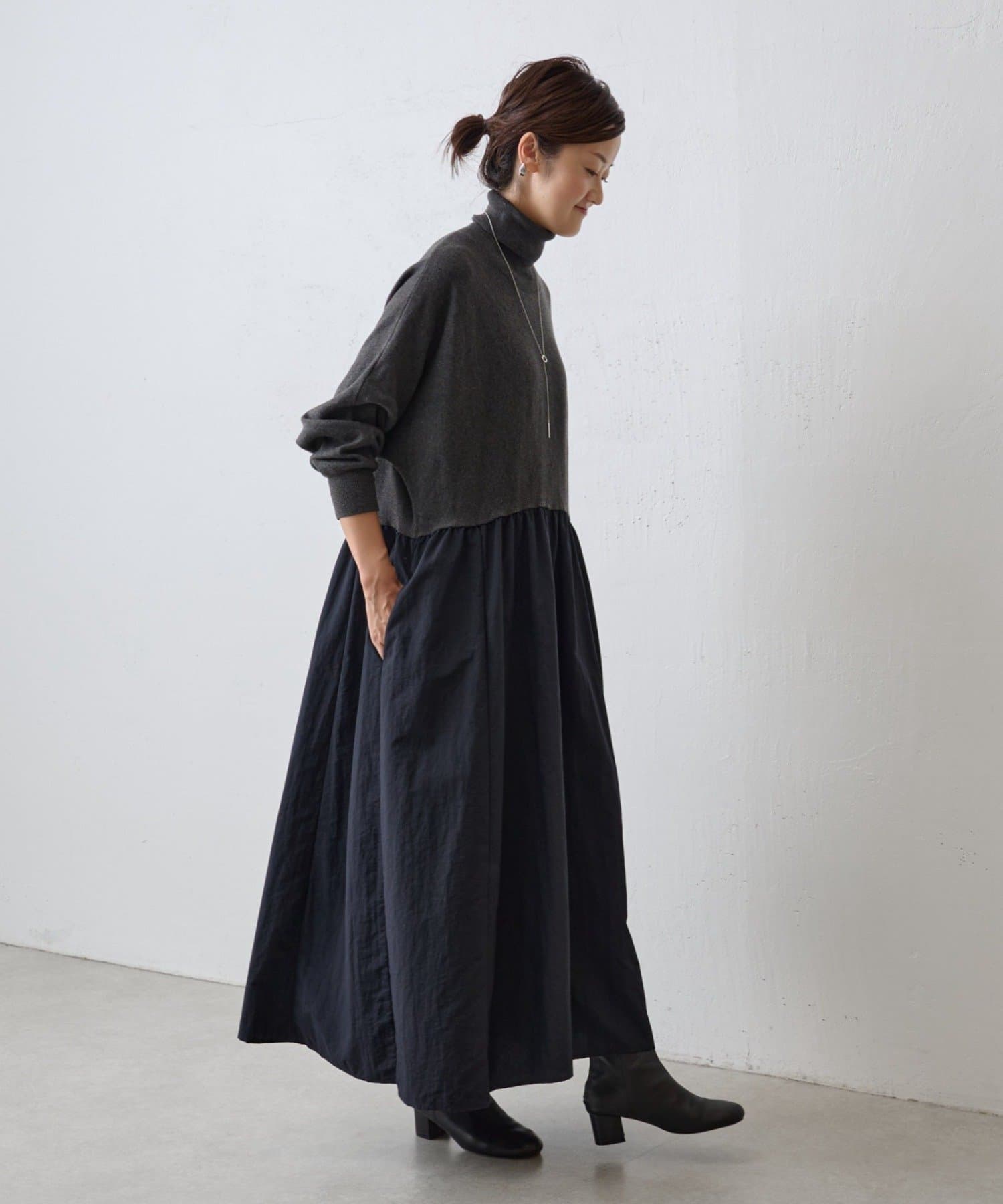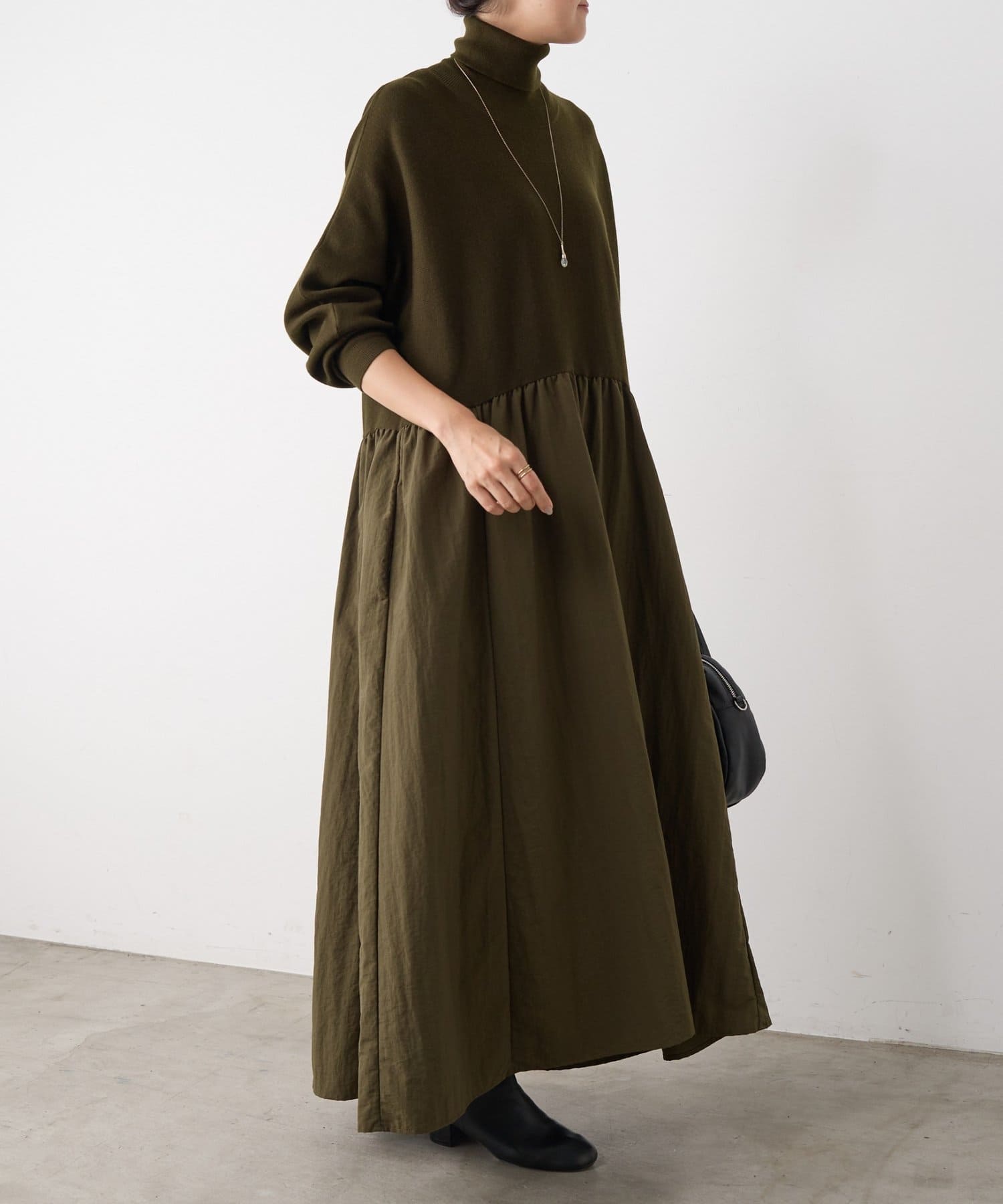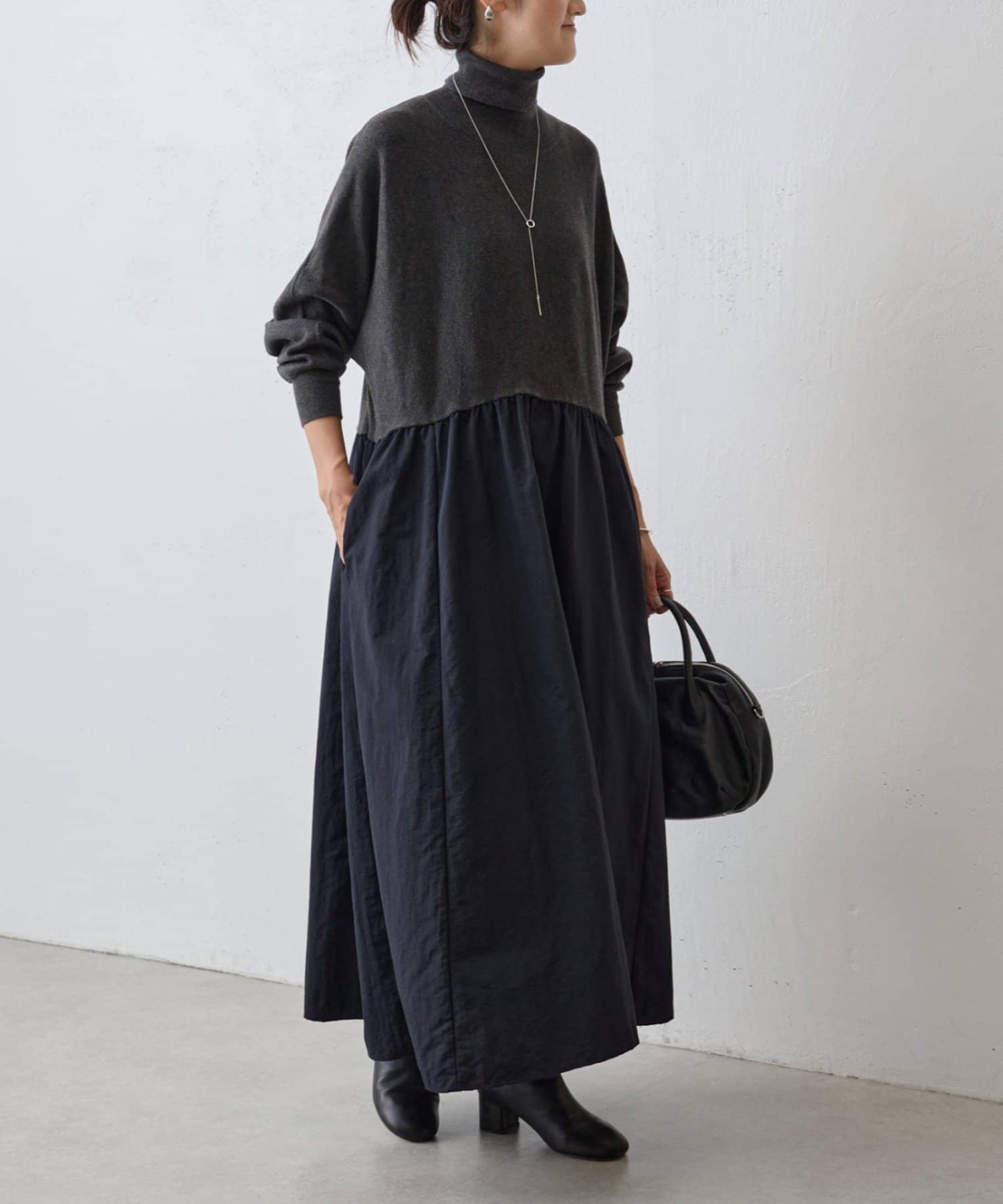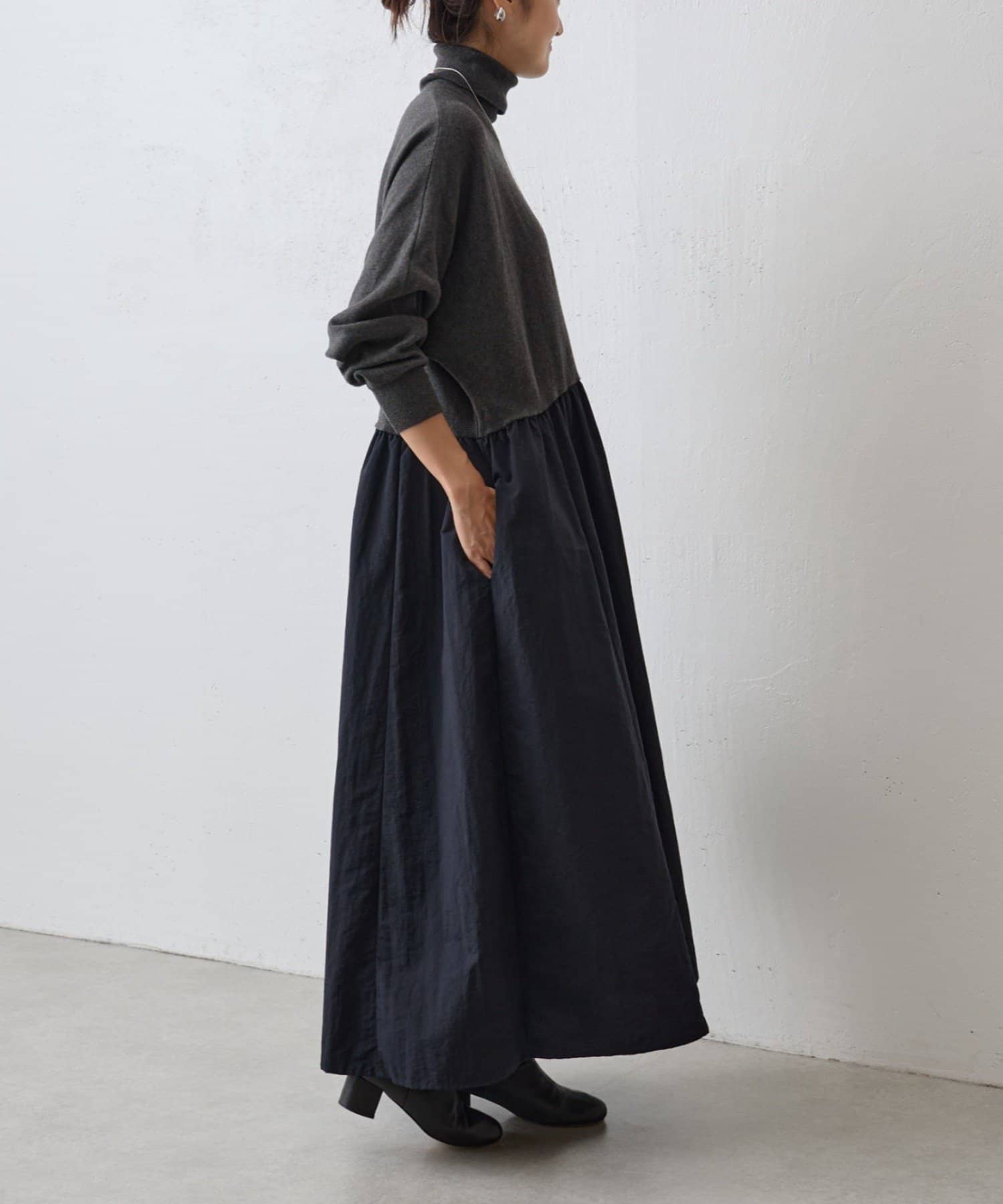 タートルネックニット×布帛のギャザースカートを組み合わせた上品なワンピース。