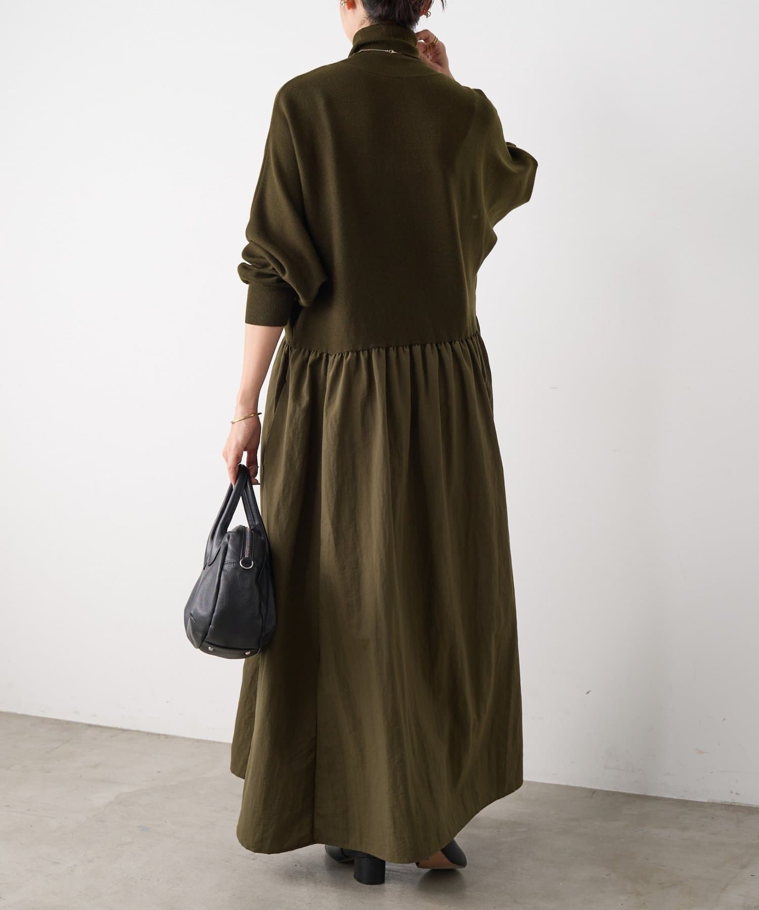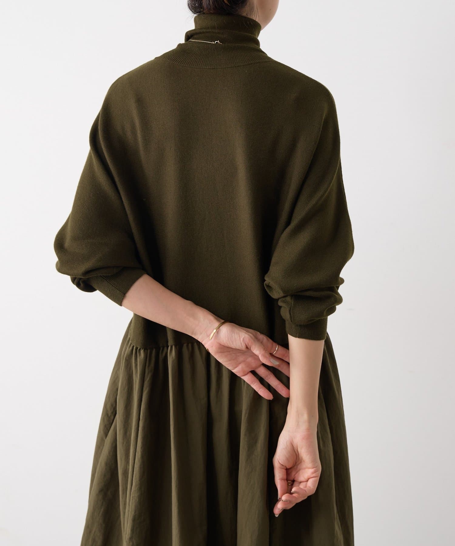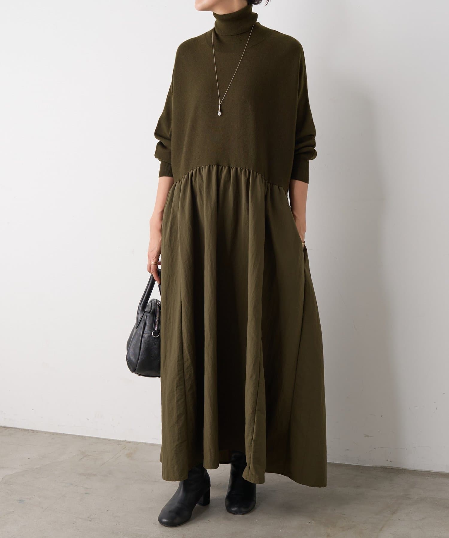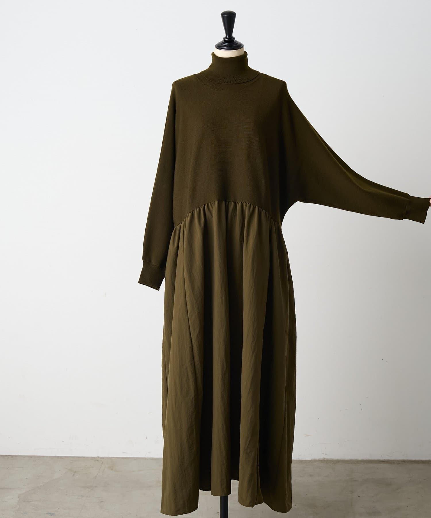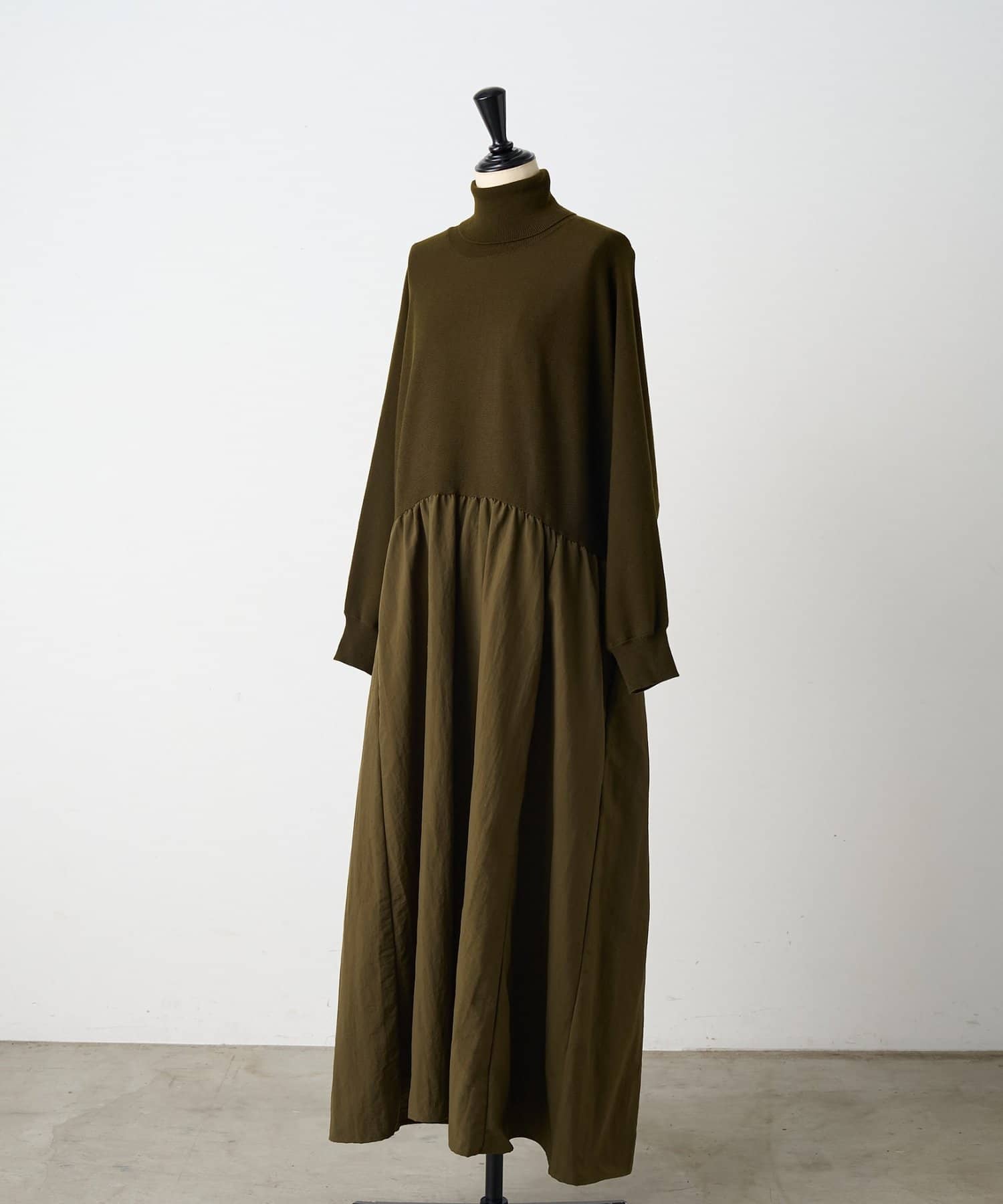 タートルネックニット×布帛のギャザースカートを組み合わせた上品なワンピース。
