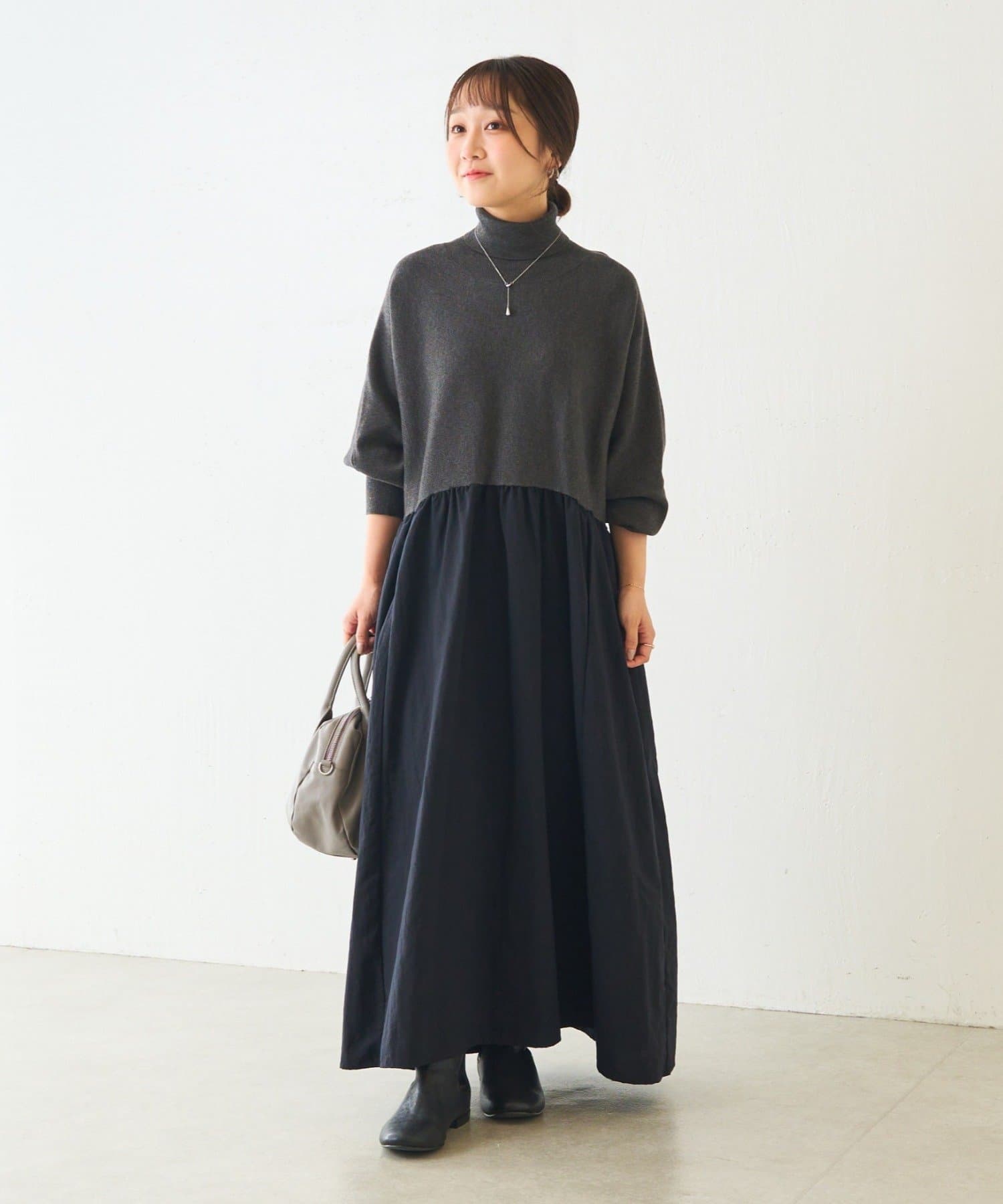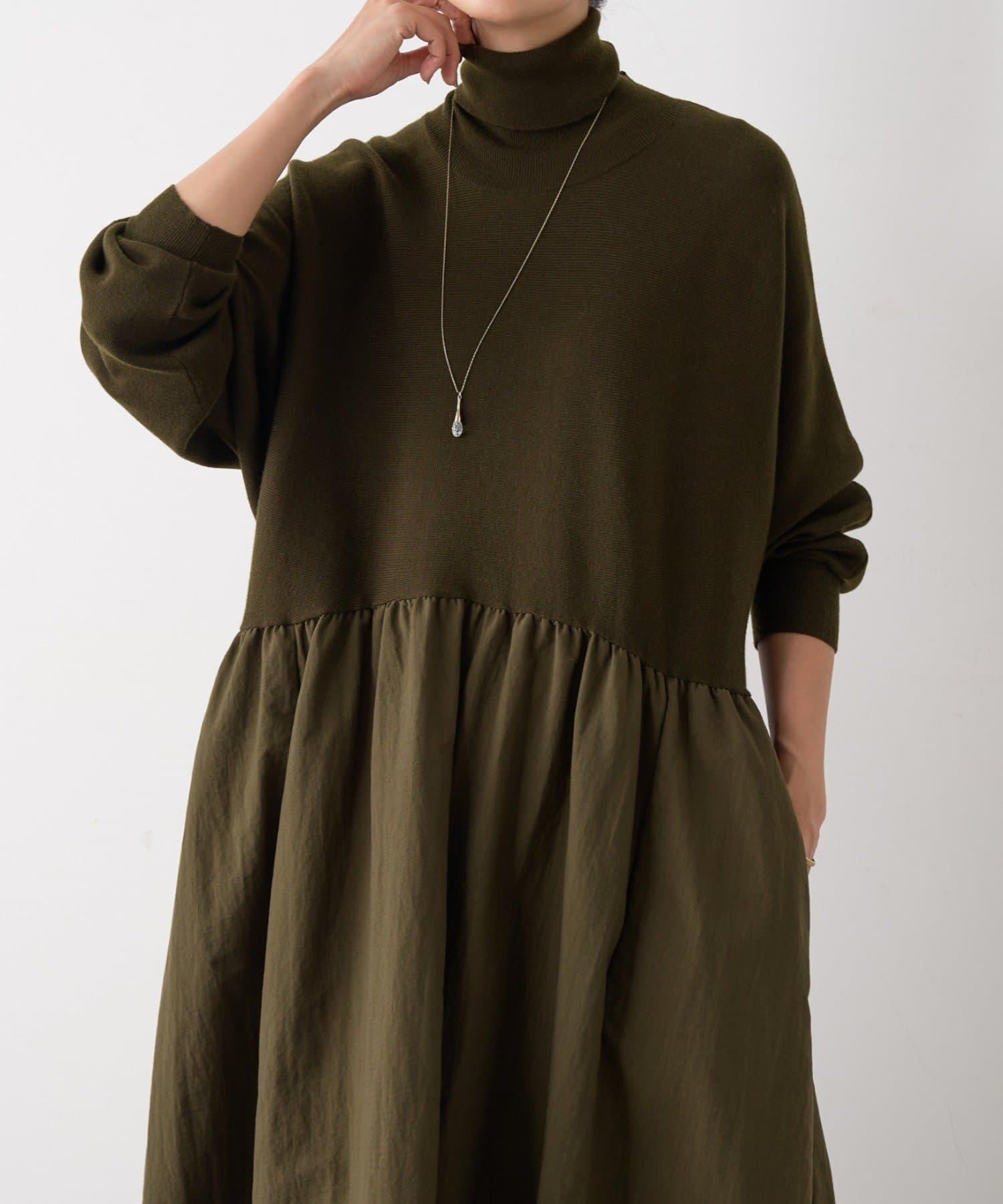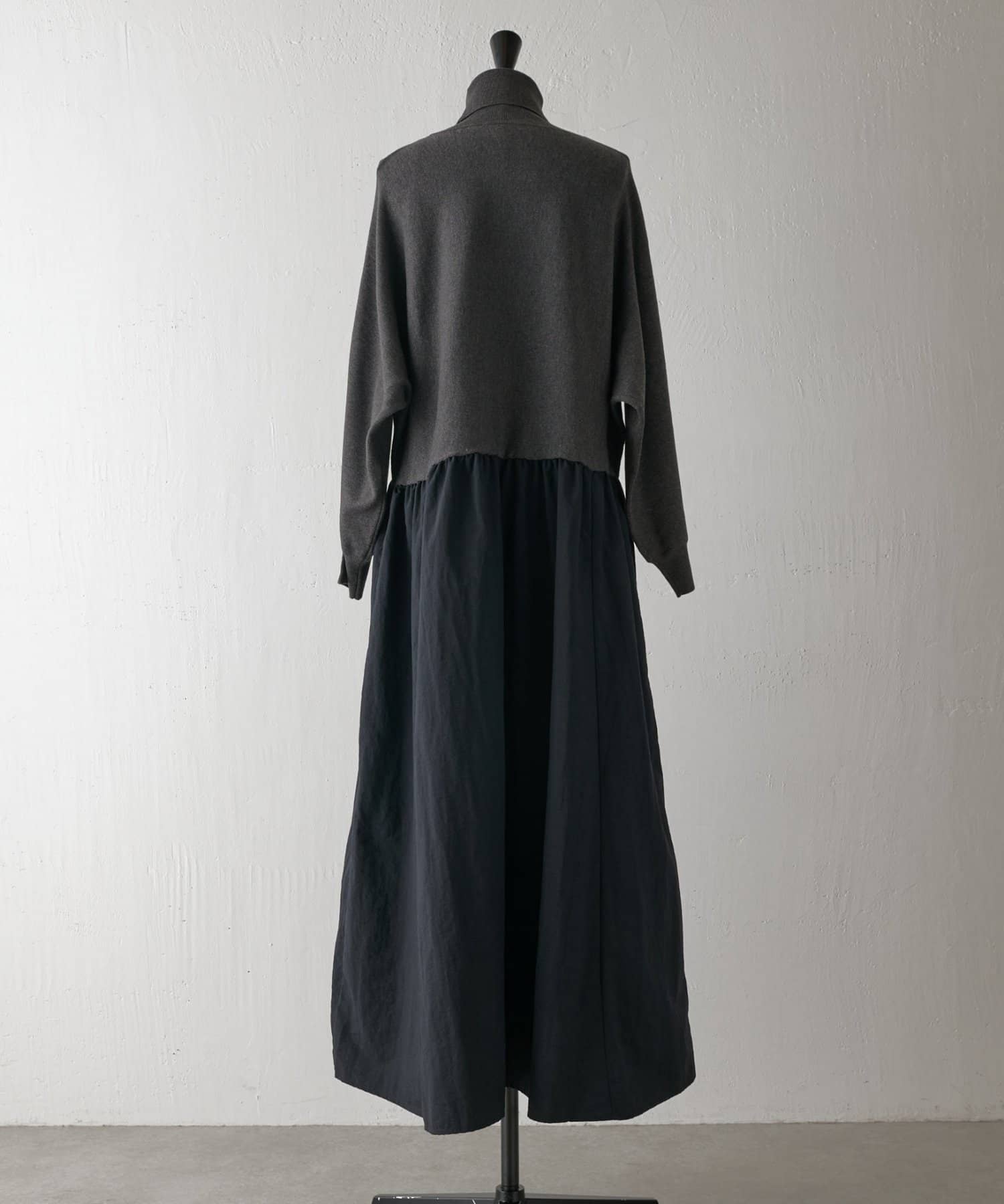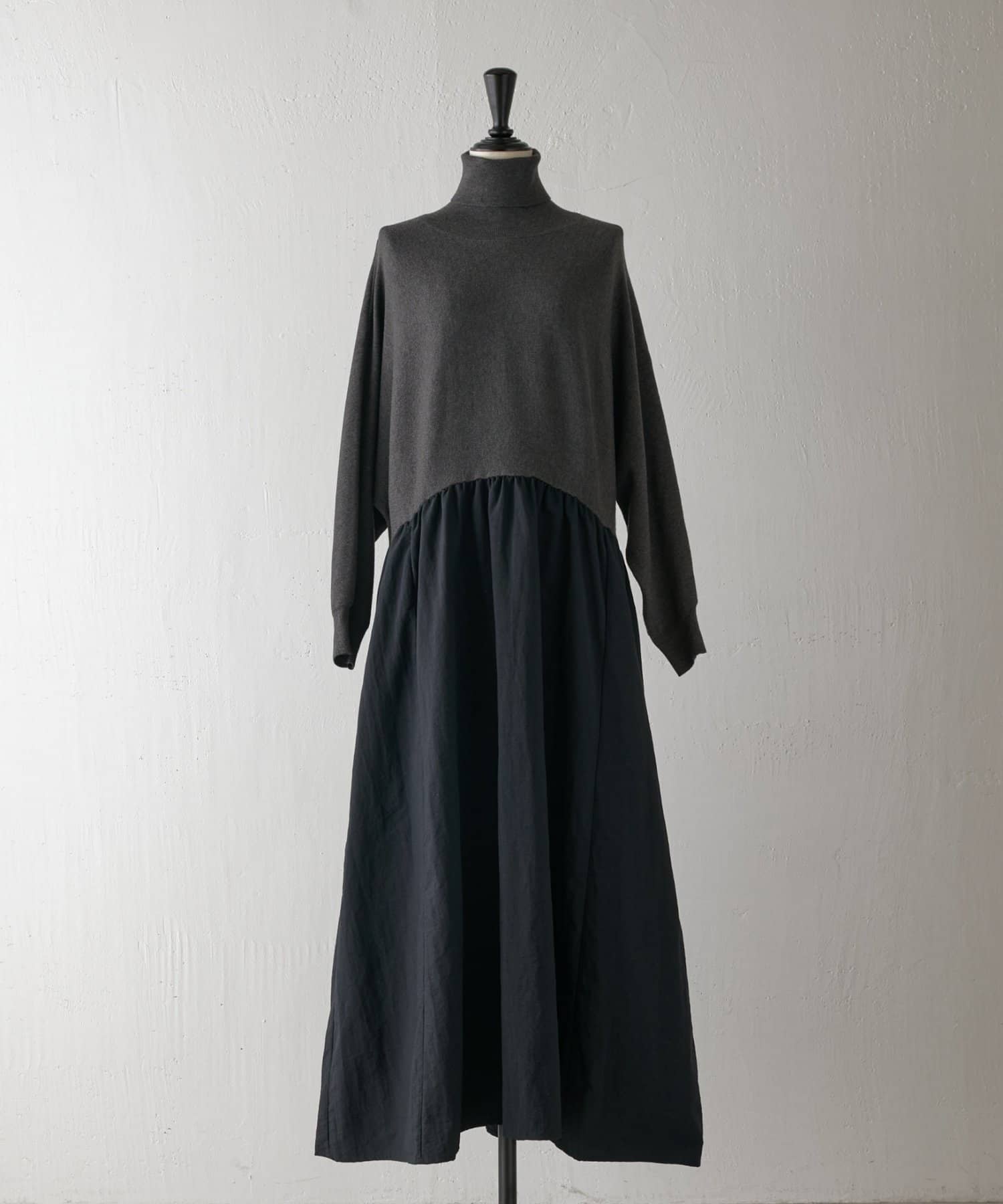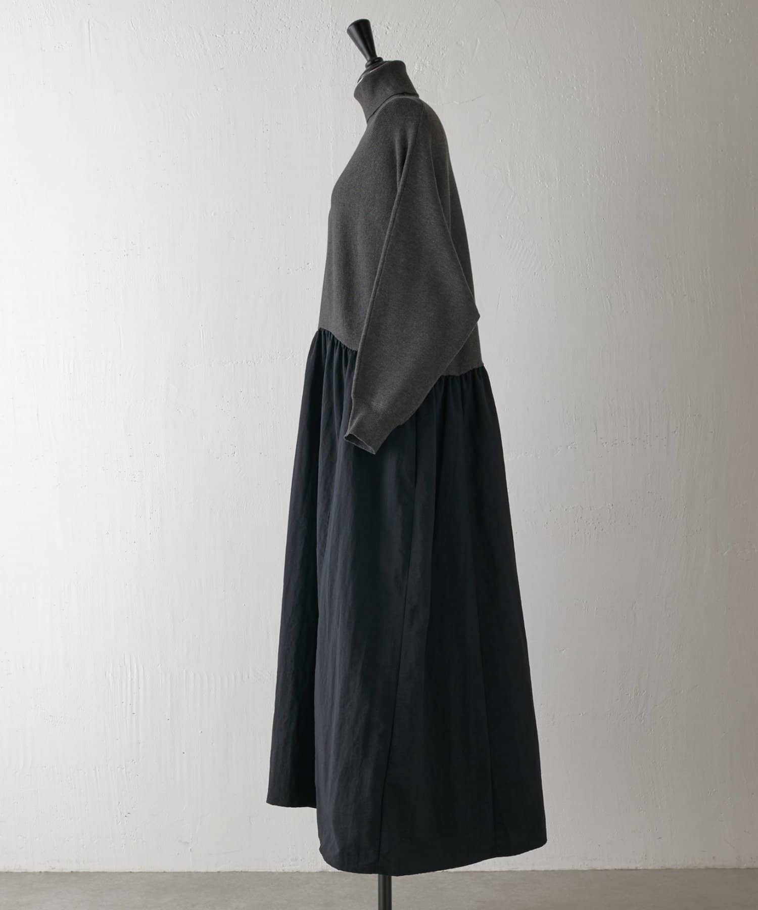 タートルネックニット×布帛のギャザースカートを組み合わせた上品なワンピース。