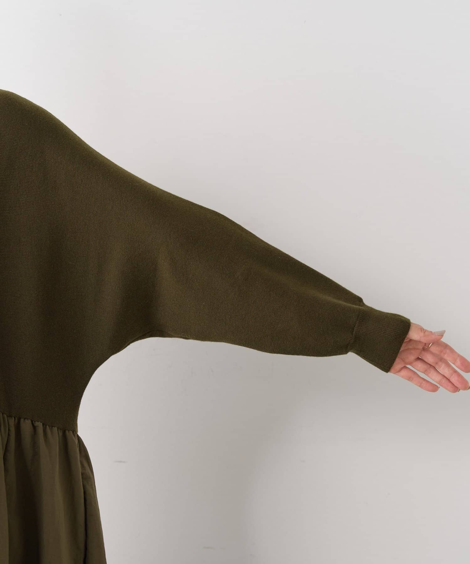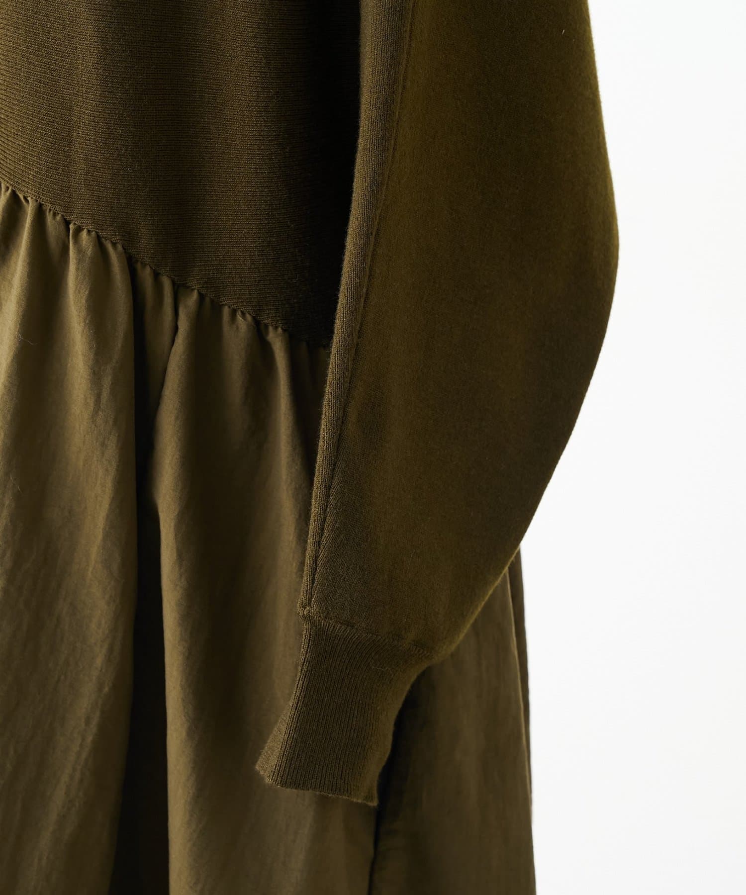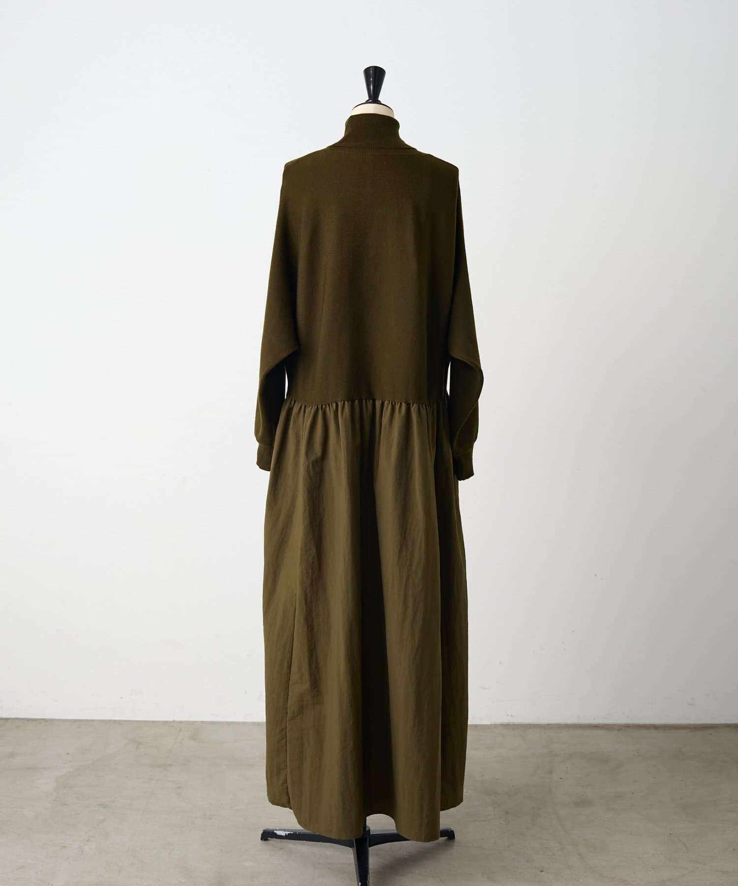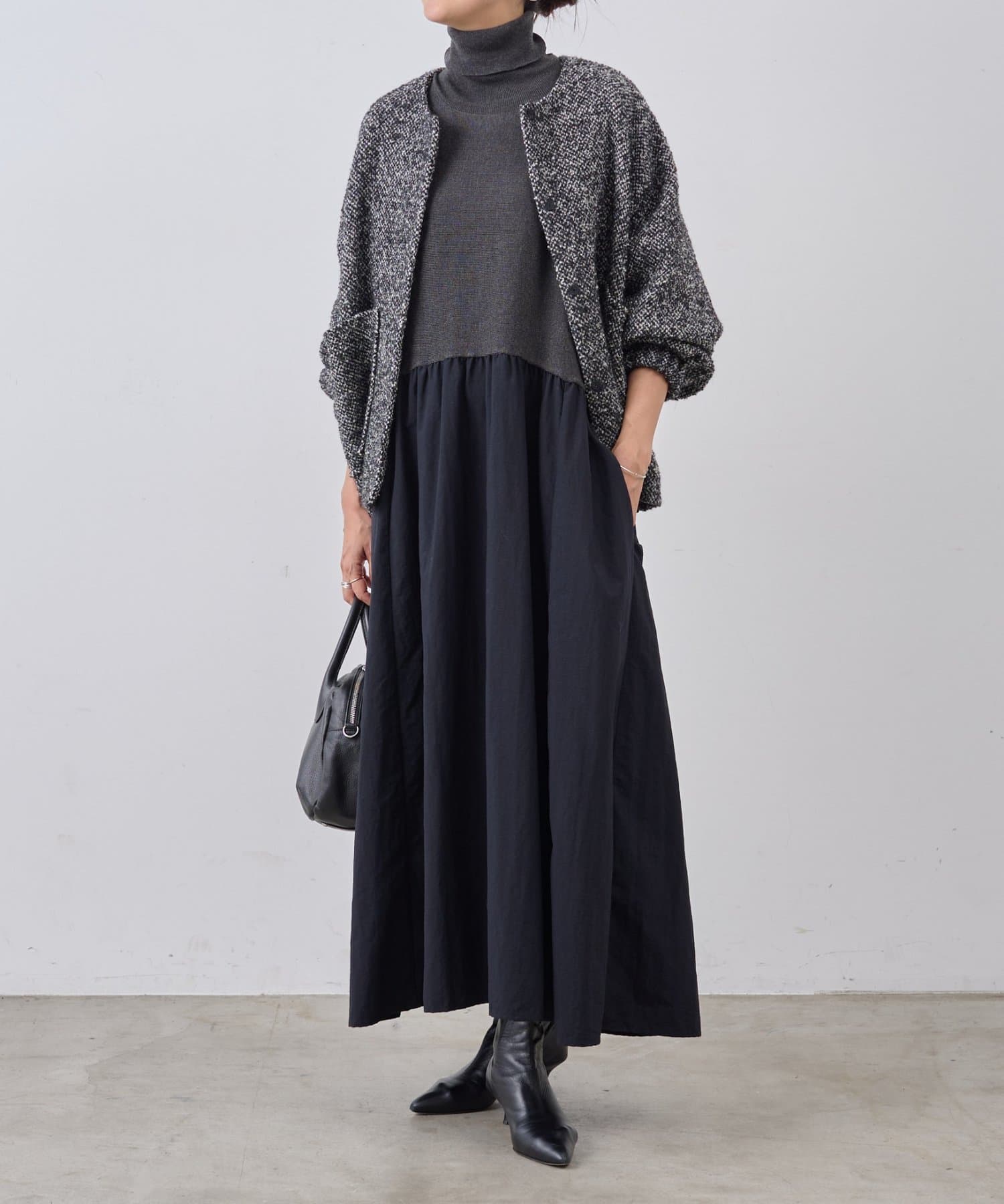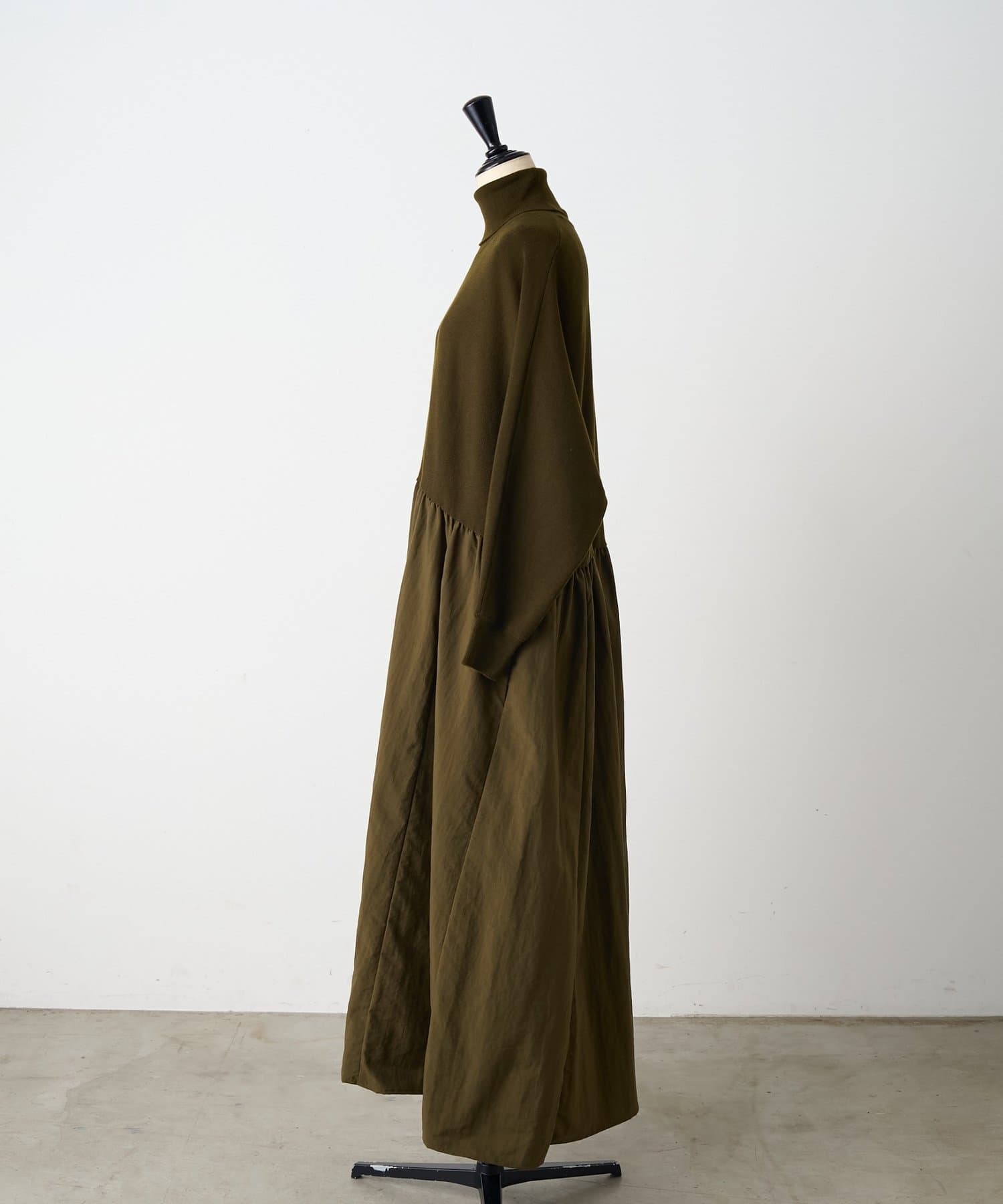 タートルネックニット×布帛のギャザースカートを組み合わせた上品なワンピース。