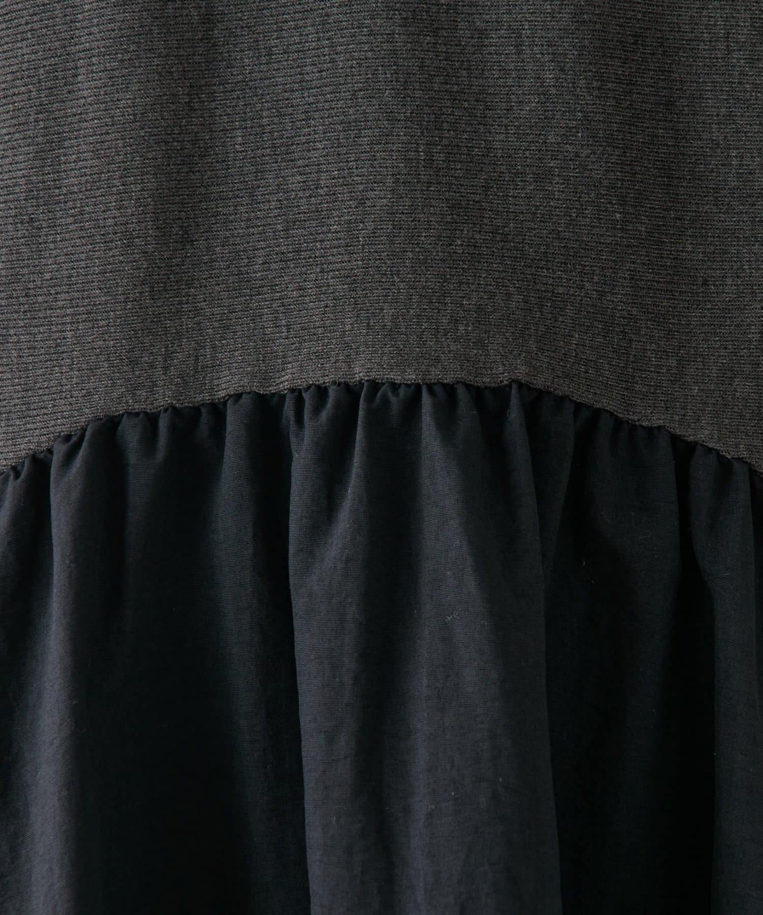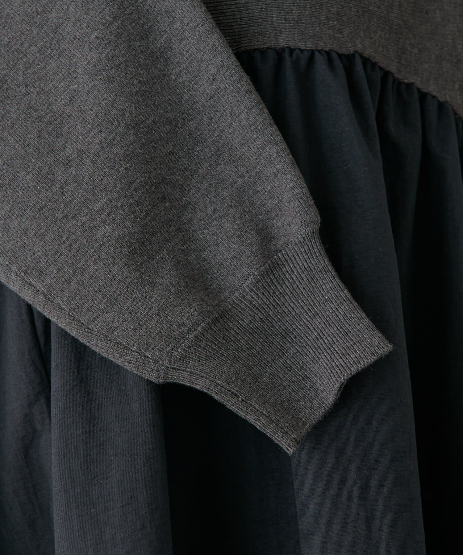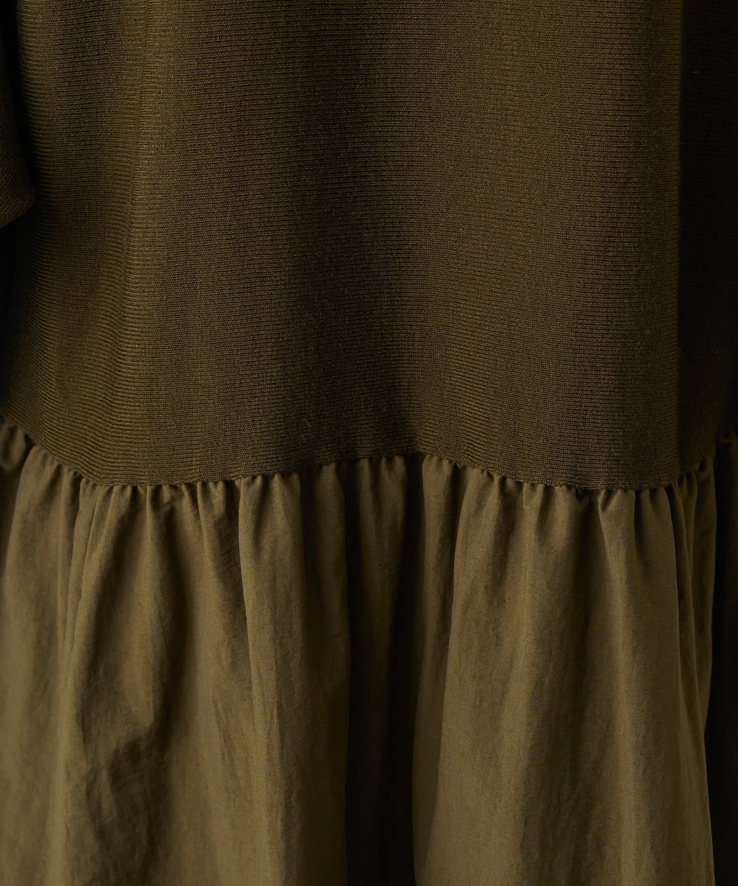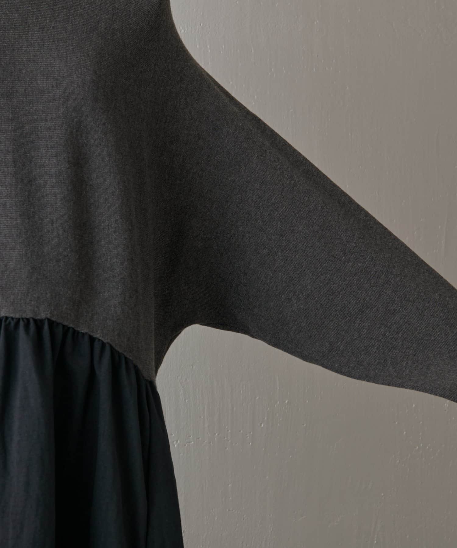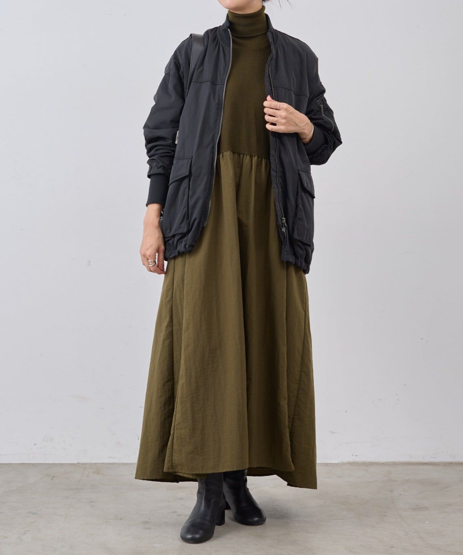 タートルネックニット×布帛のギャザースカートを組み合わせた上品なワンピース。