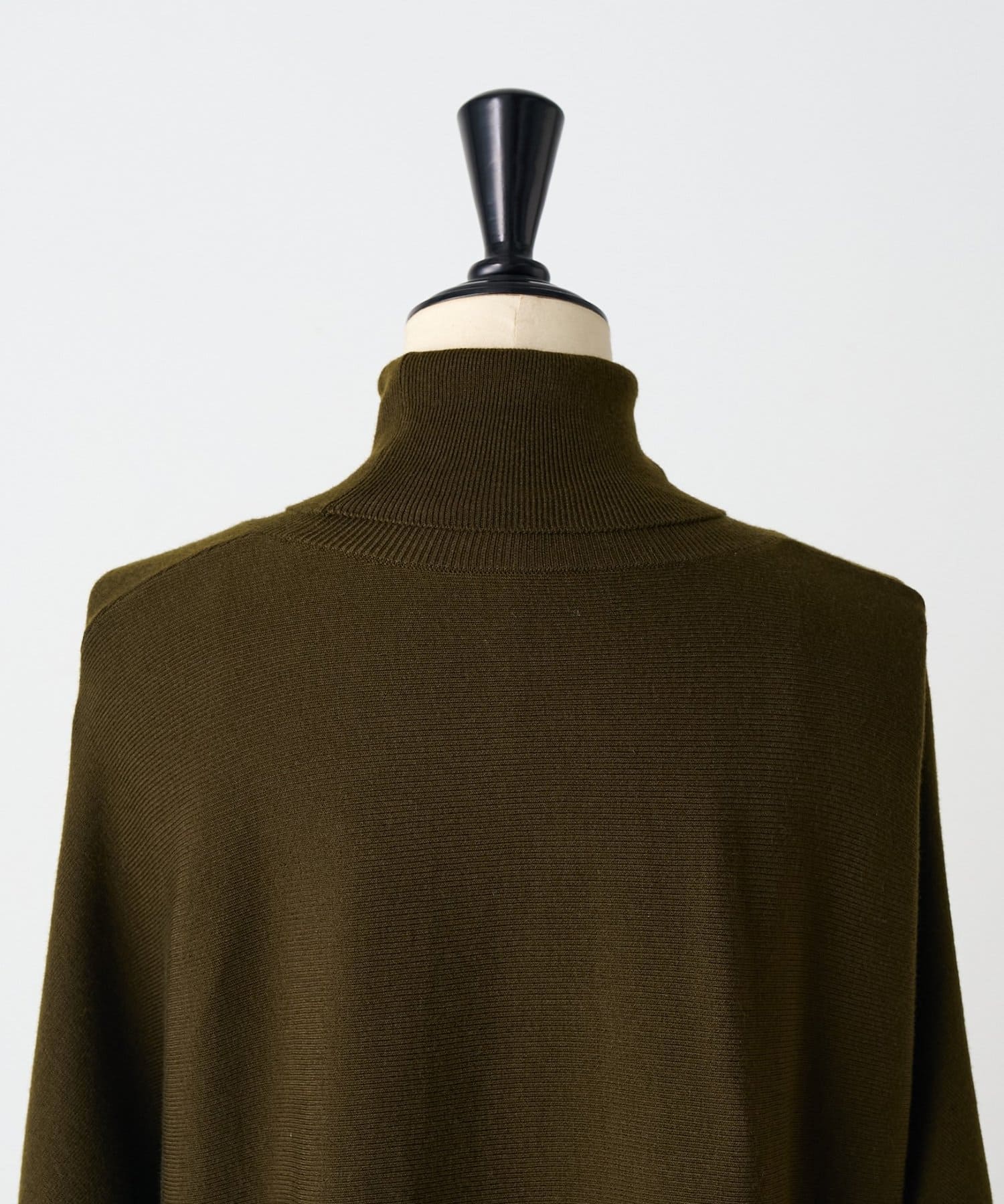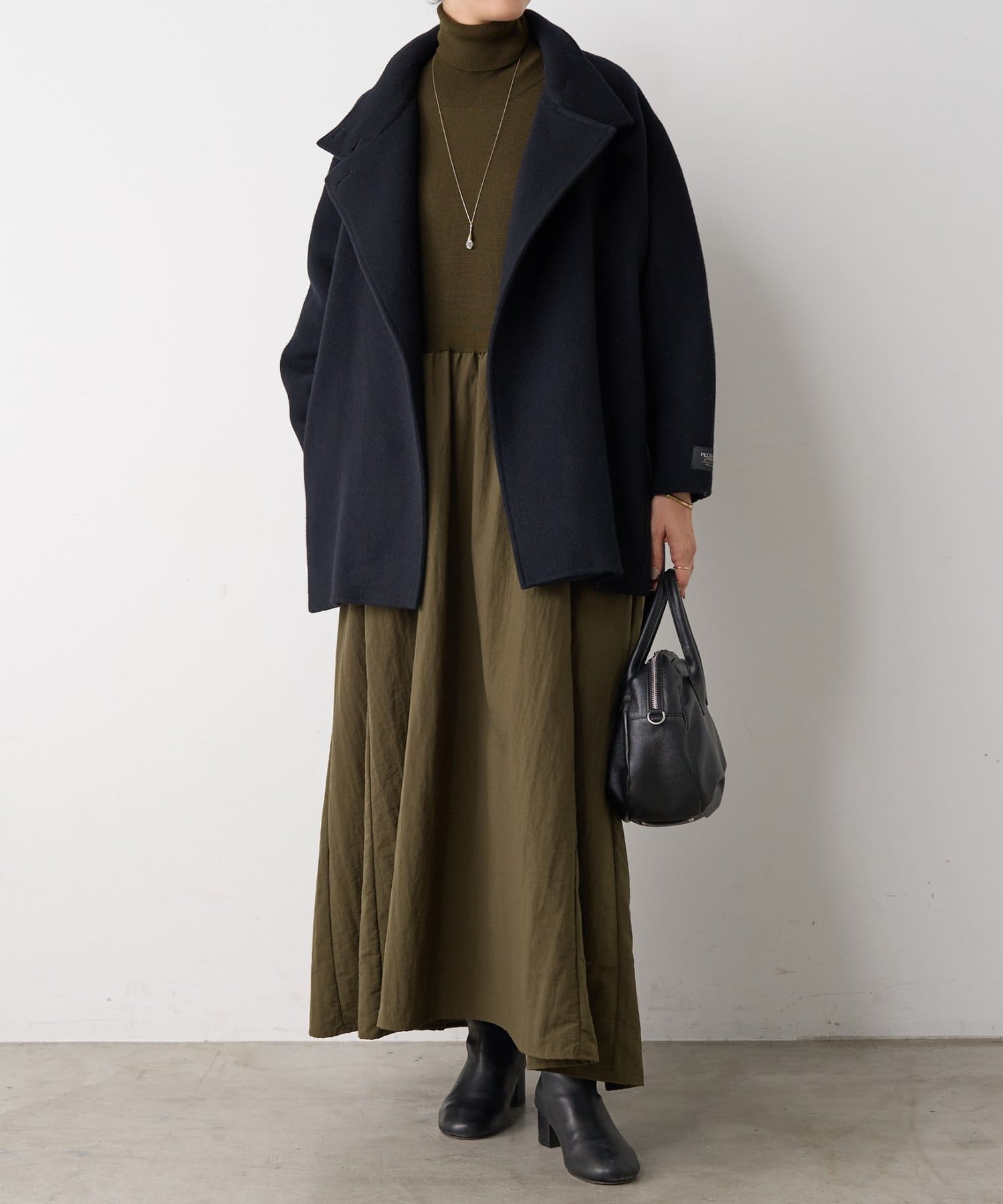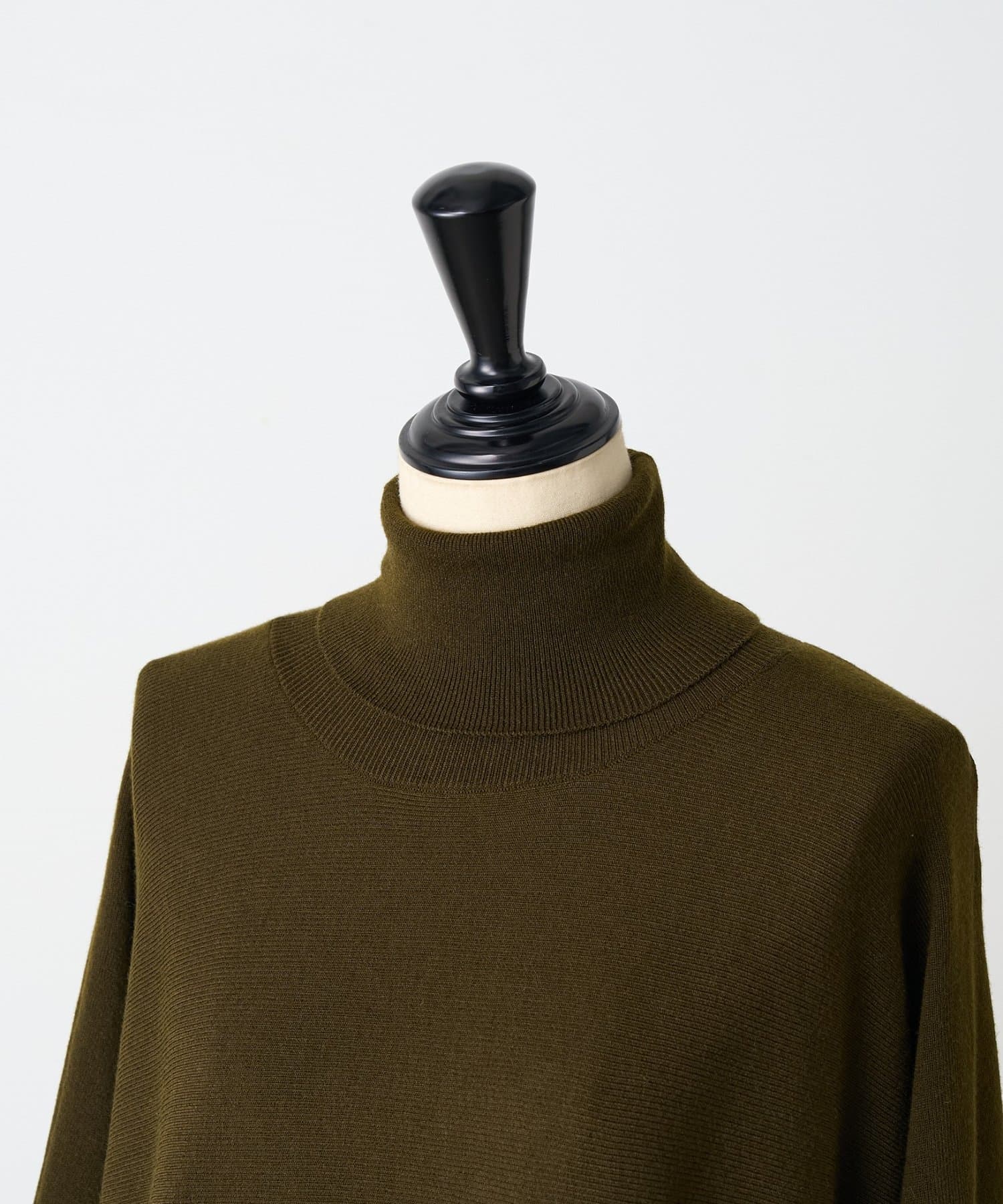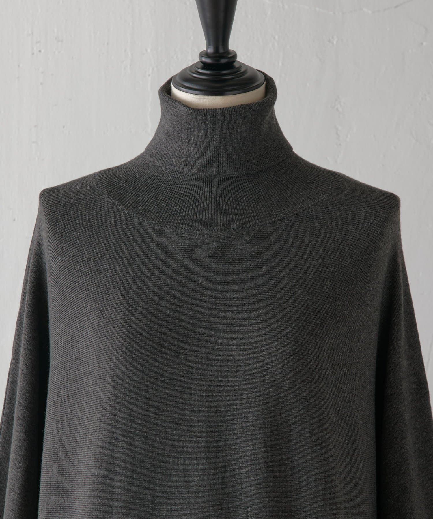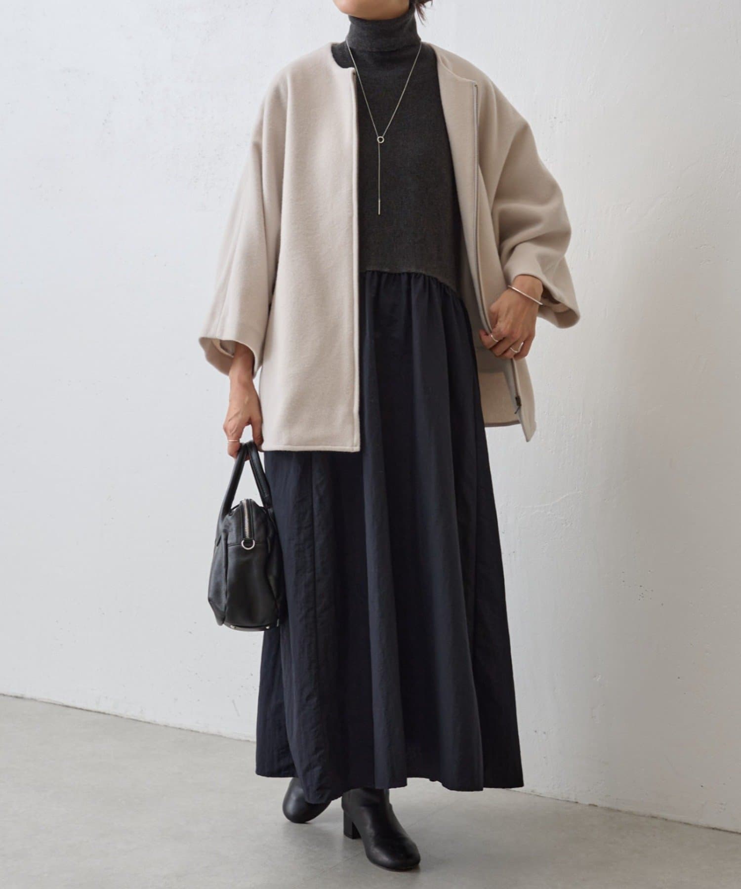 タートルネックニット×布帛のギャザースカートを組み合わせた上品なワンピース。