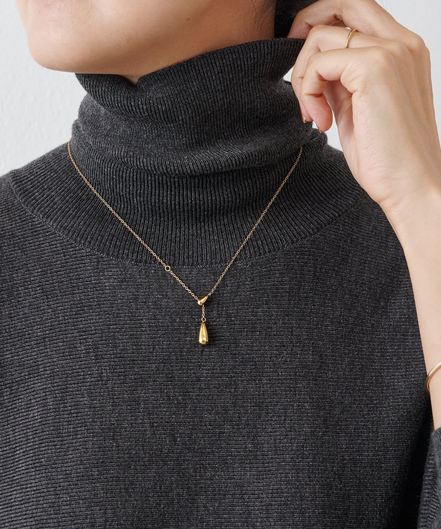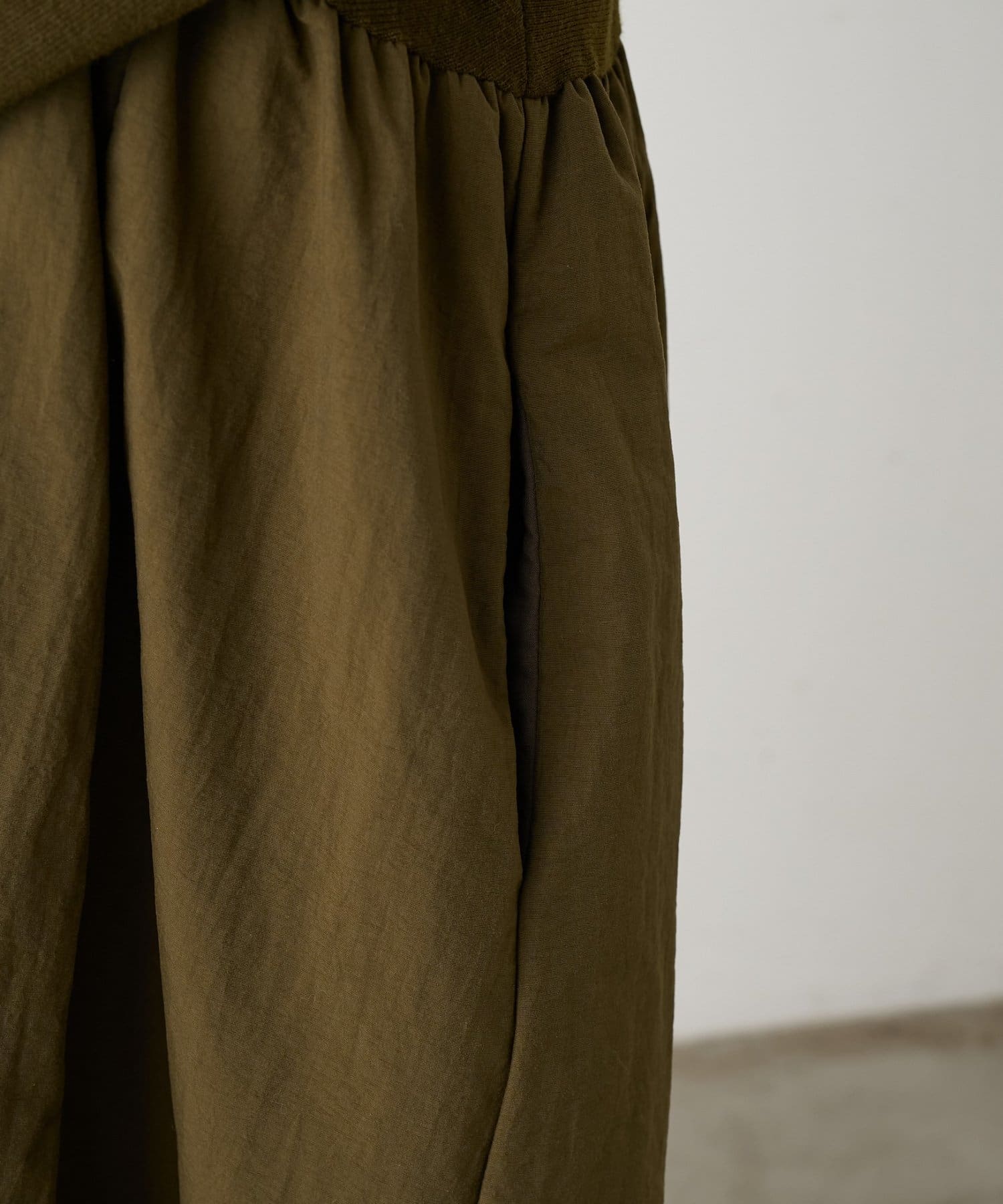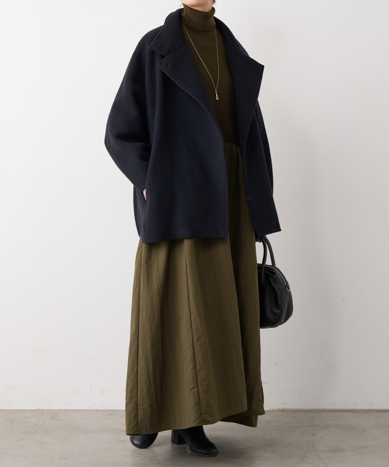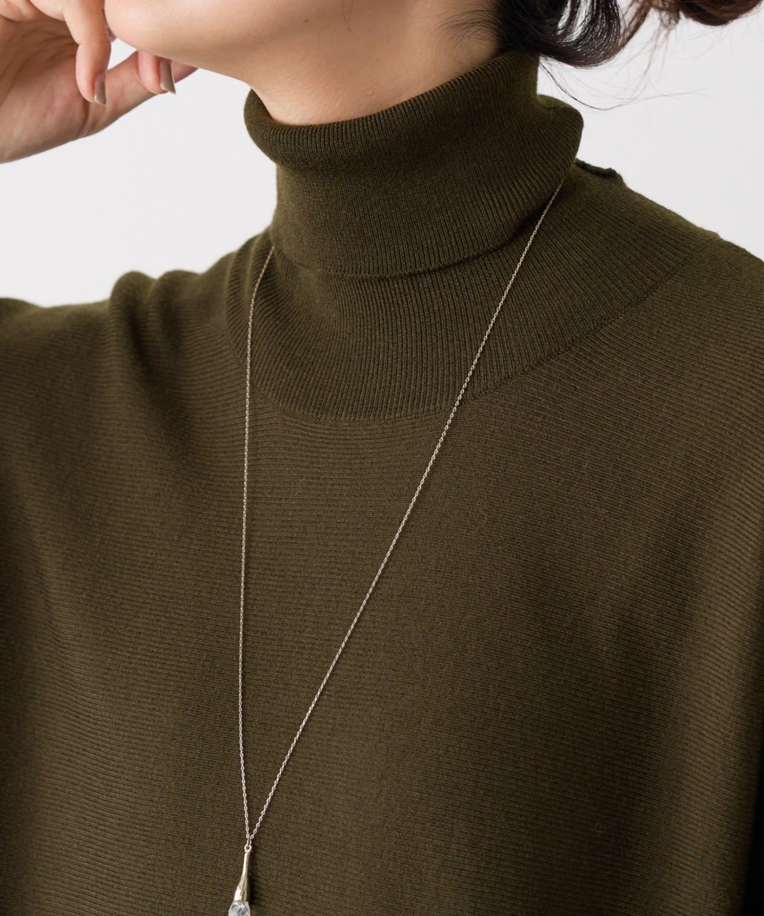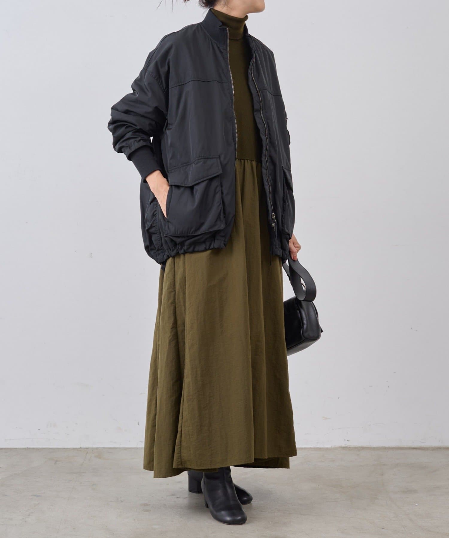 タートルネックニット×布帛のギャザースカートを組み合わせた上品なワンピース。