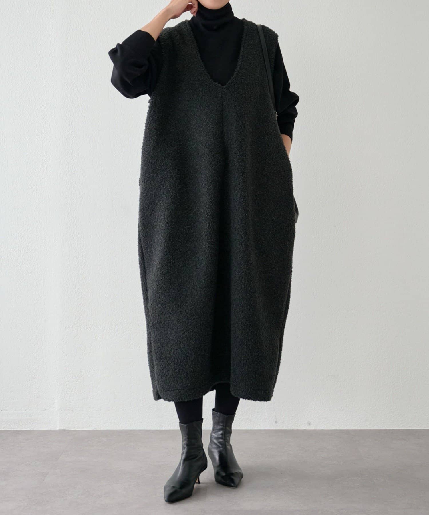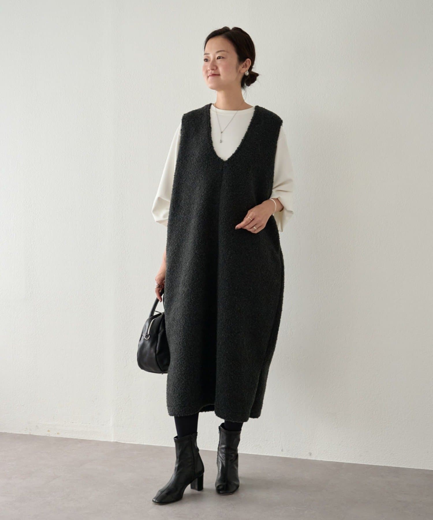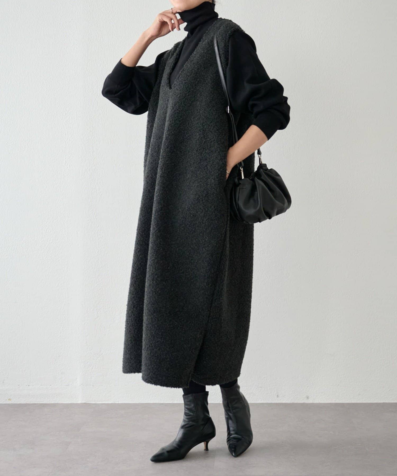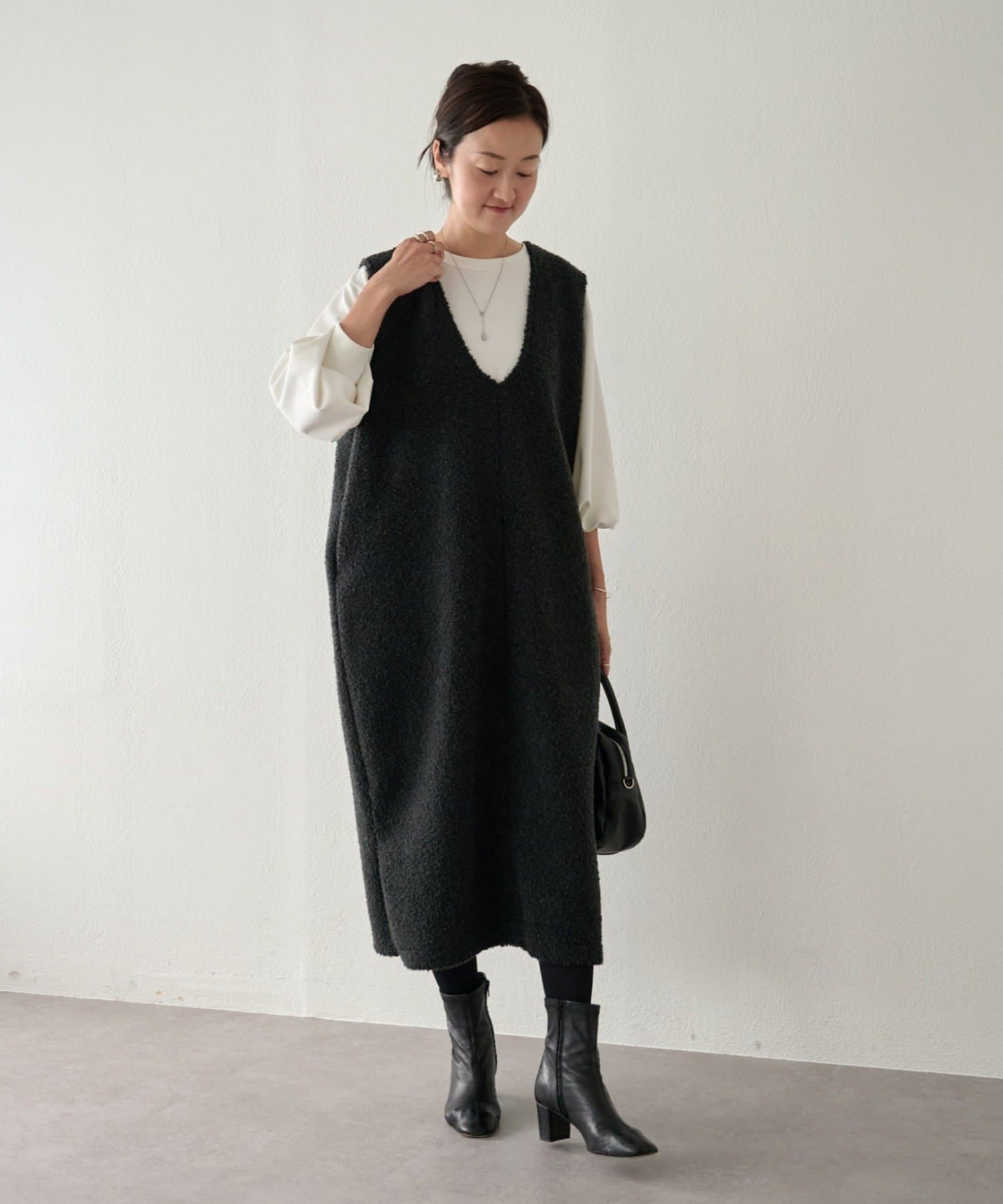 シンプルなVネックのジャンパースカートも、素材をボアにするだけで一気に季節感をまとえます。