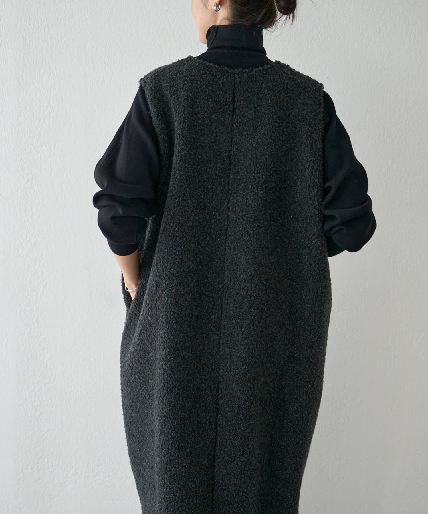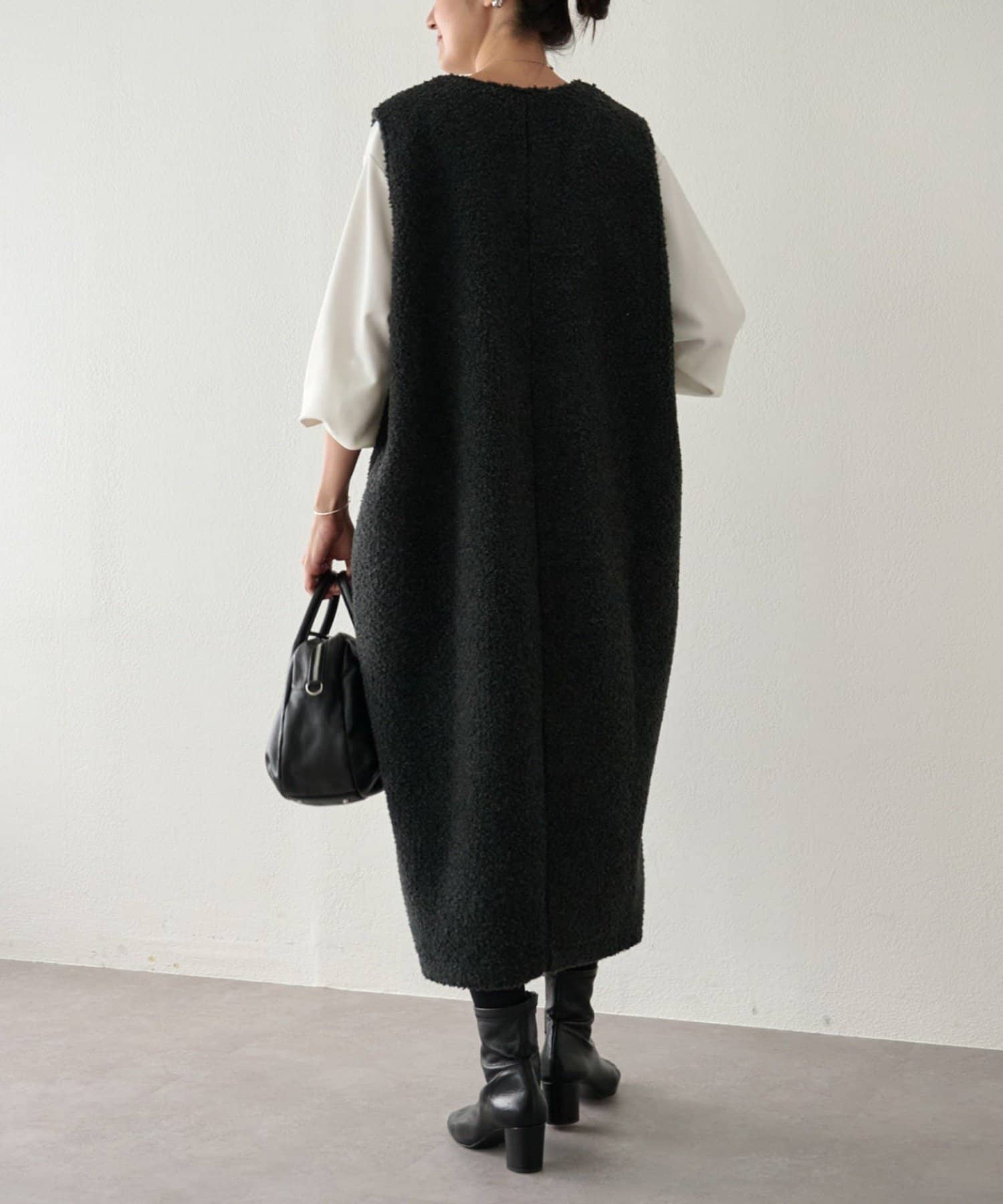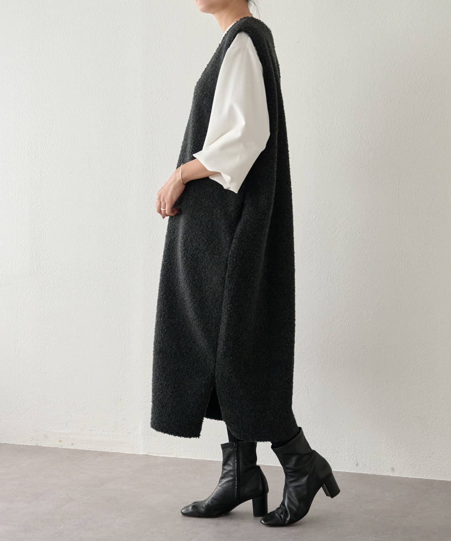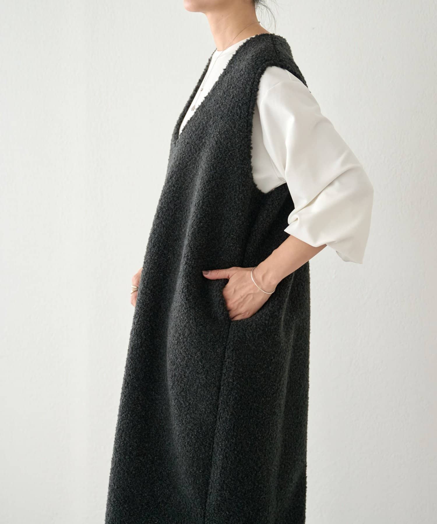 シンプルなVネックのジャンパースカートも、素材をボアにするだけで一気に季節感をまとえます。