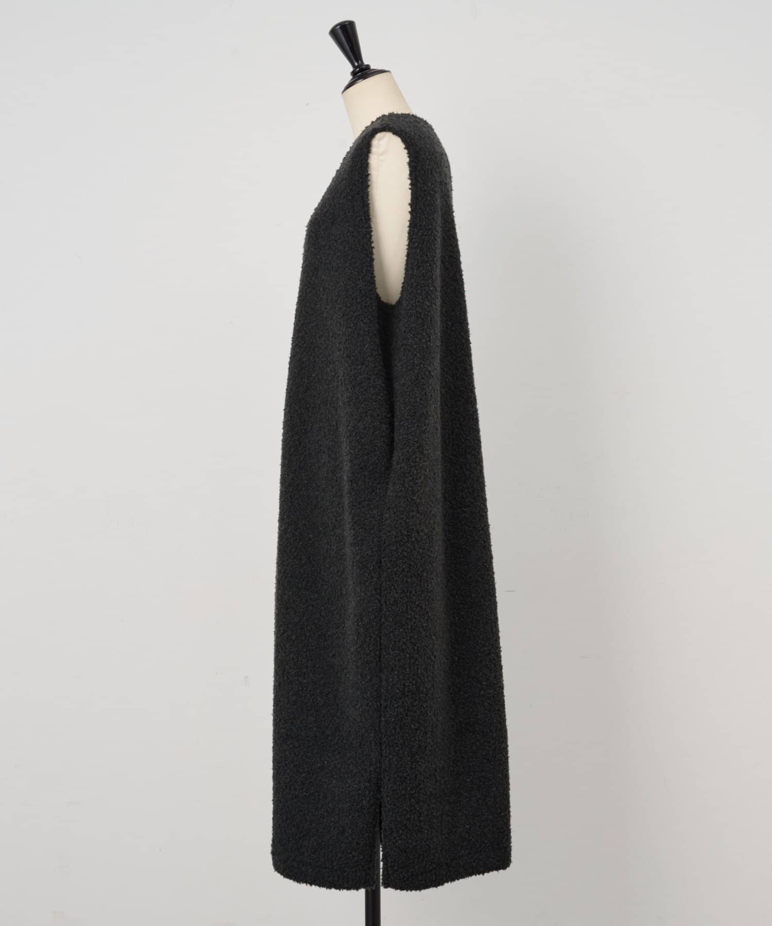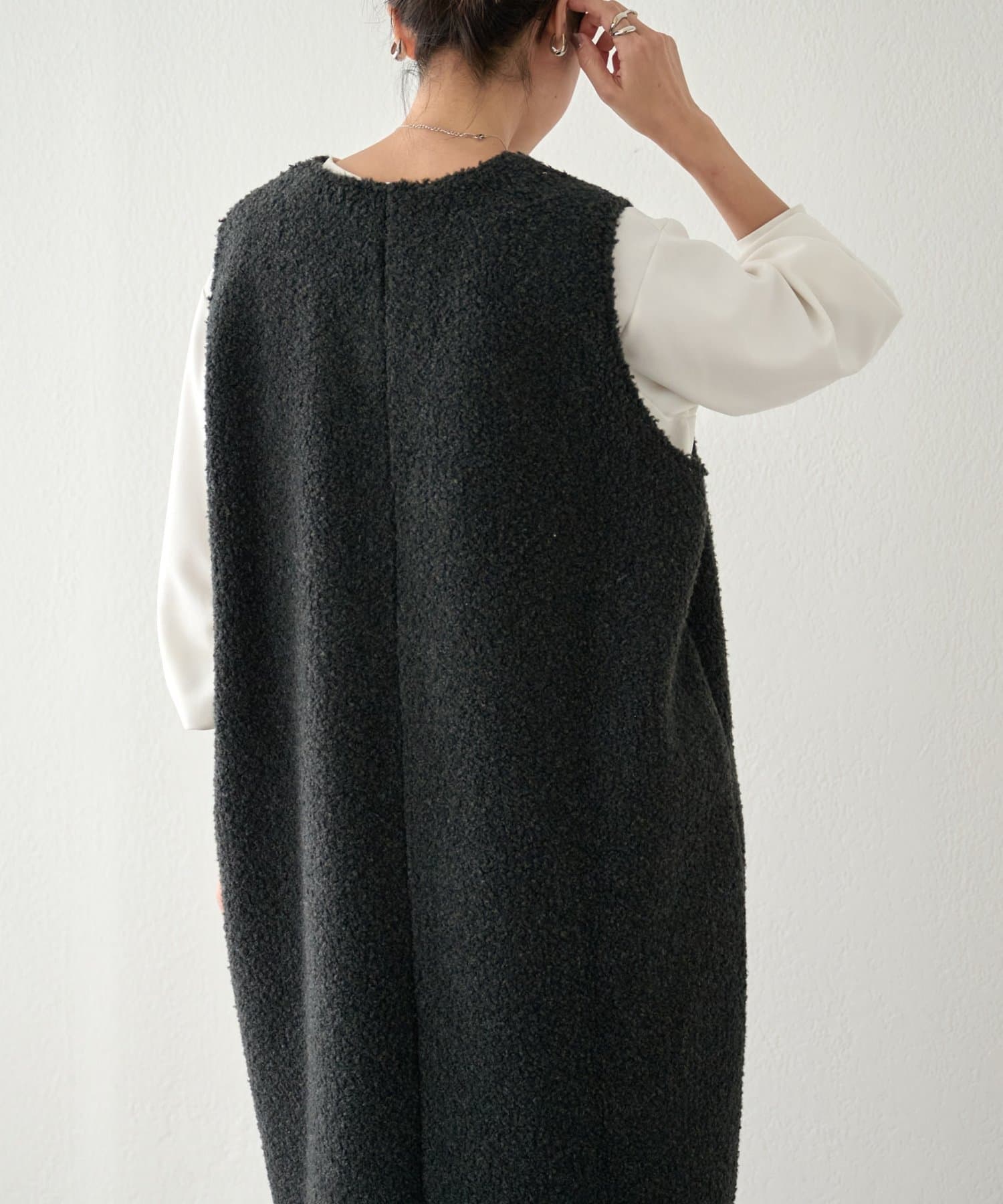 ボア素材を使用したコクーンシルエットのジャンパースカート。