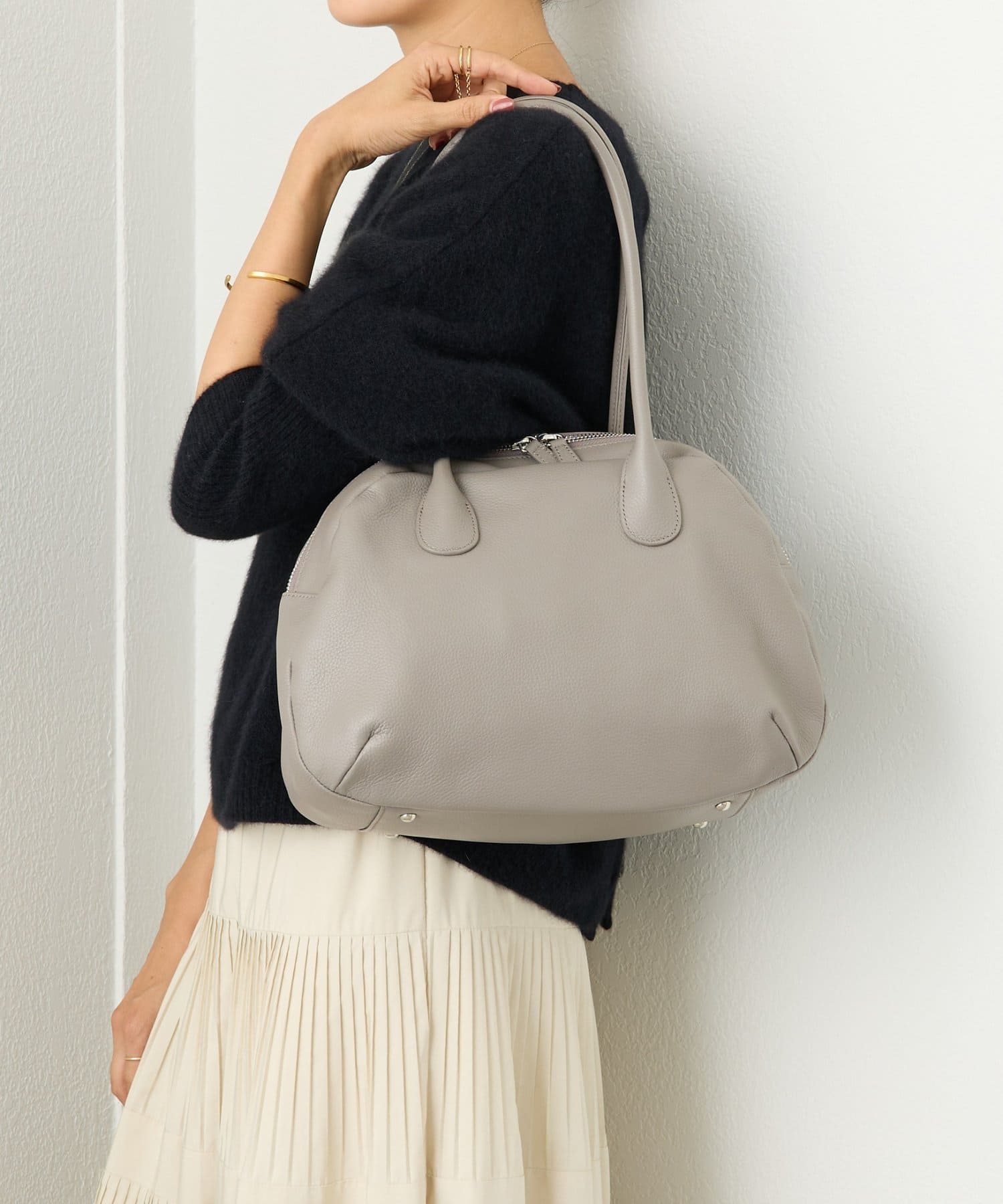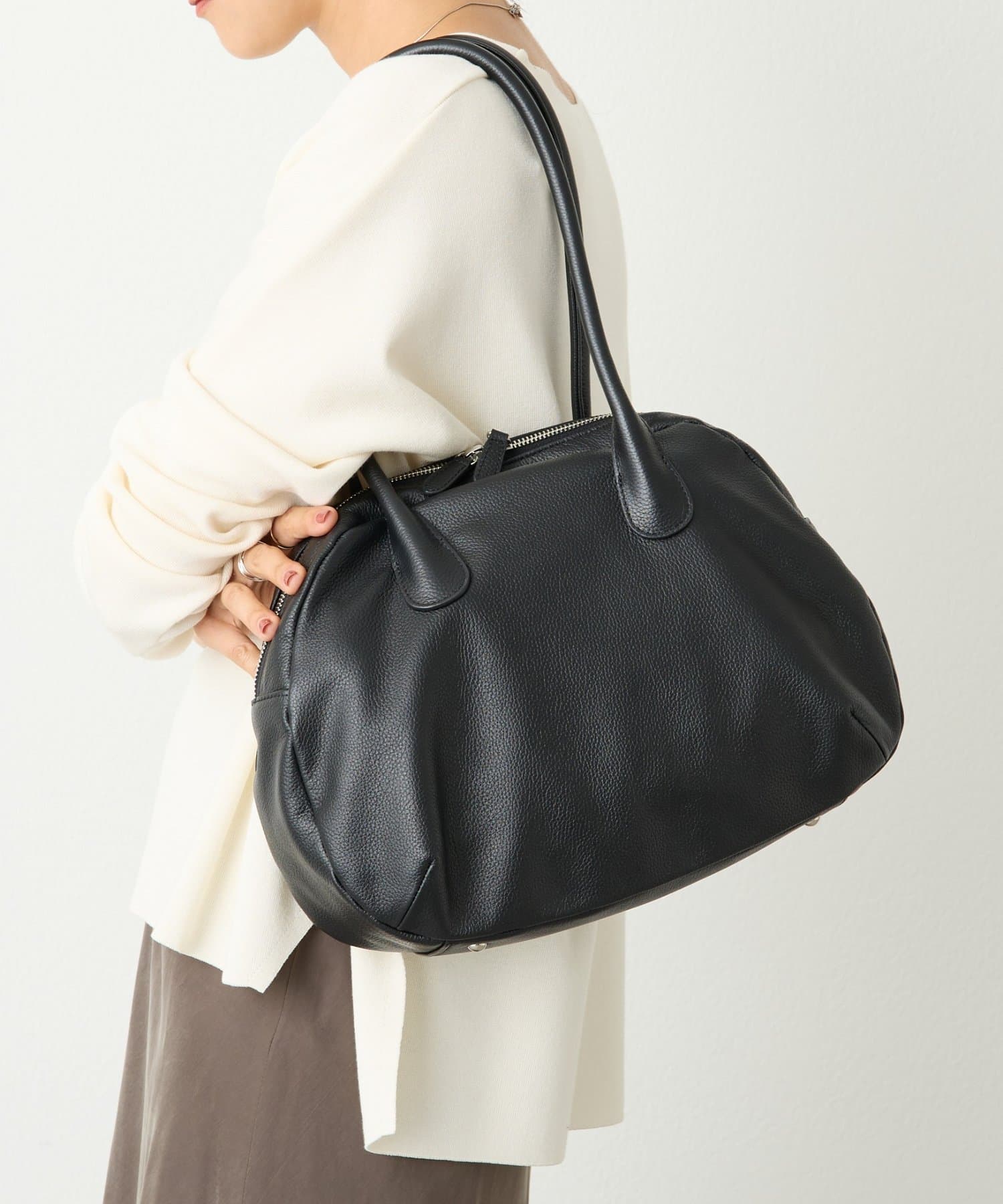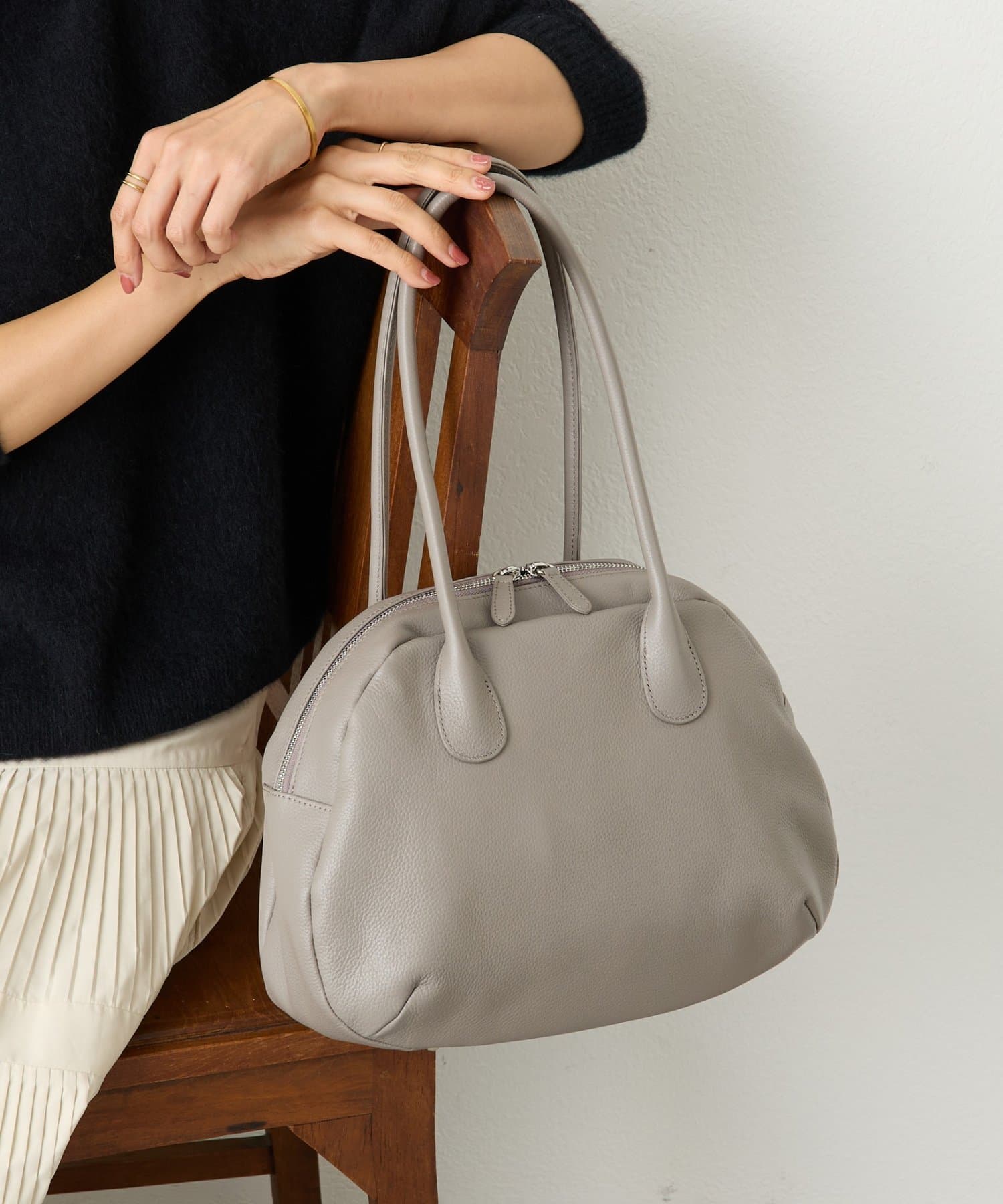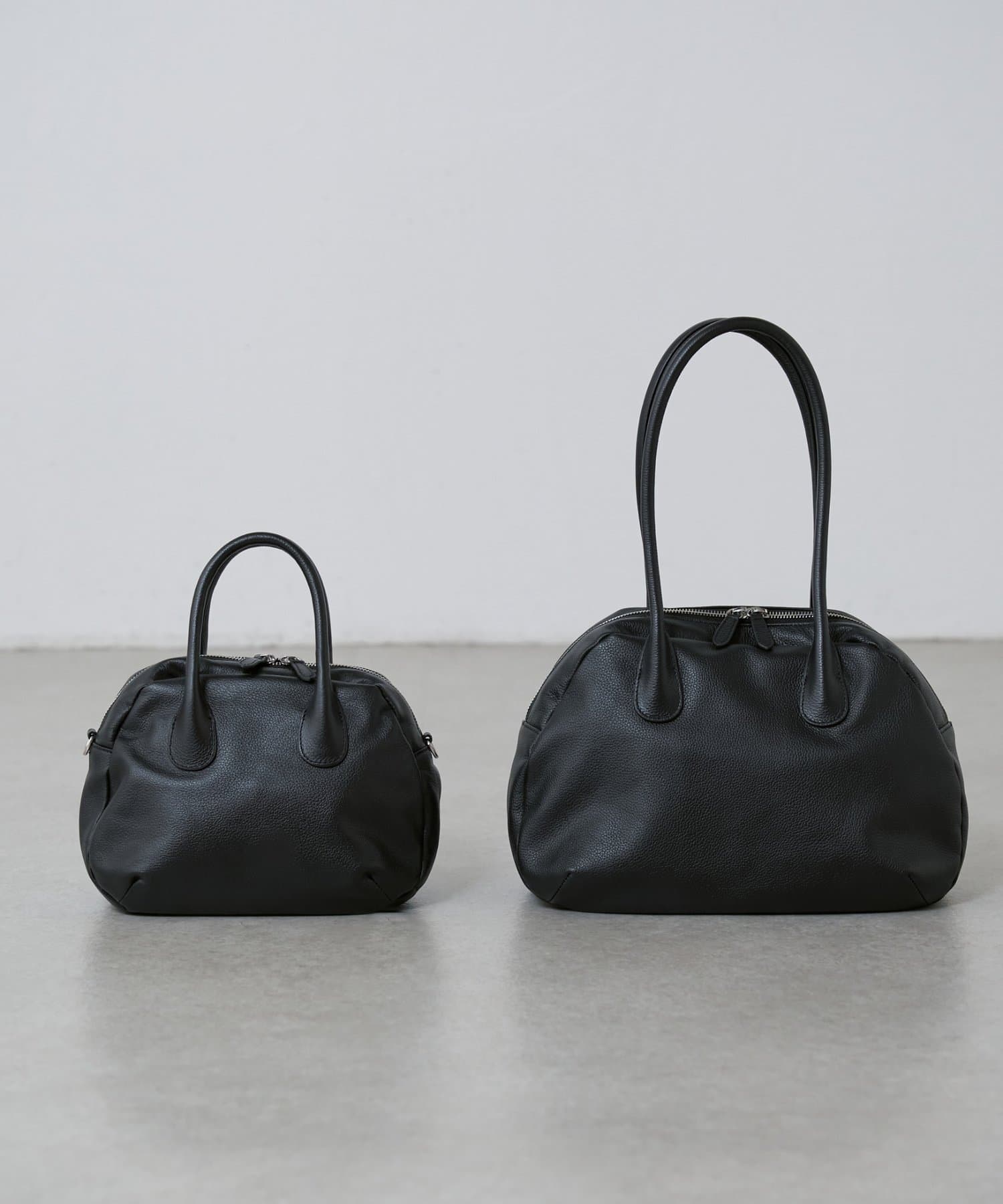 ラウンドミニボストンバッグの丸みのある柔らかなフォルムはそのままに、ひと回り大きなサイズと長めの持ち手で肩掛けもできる仕様になりました。