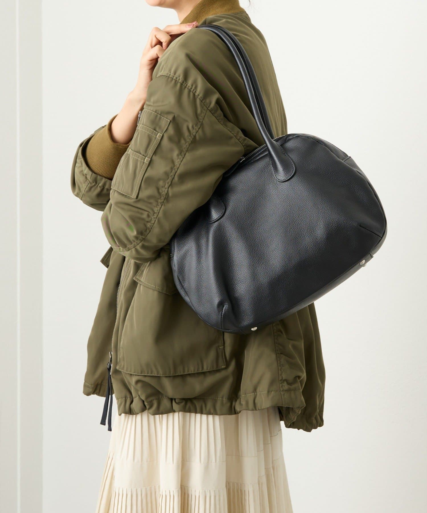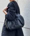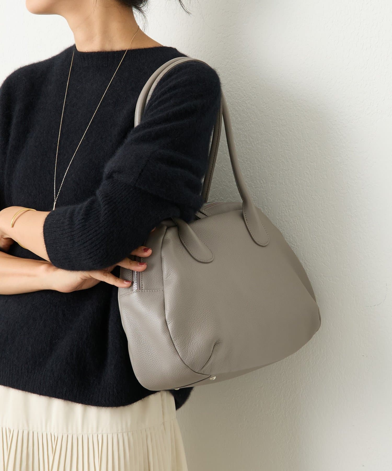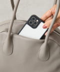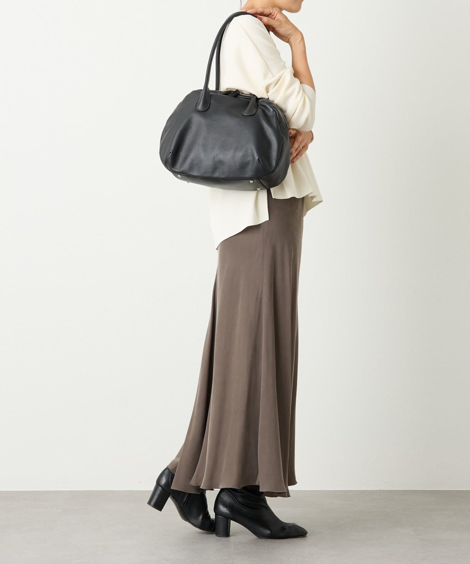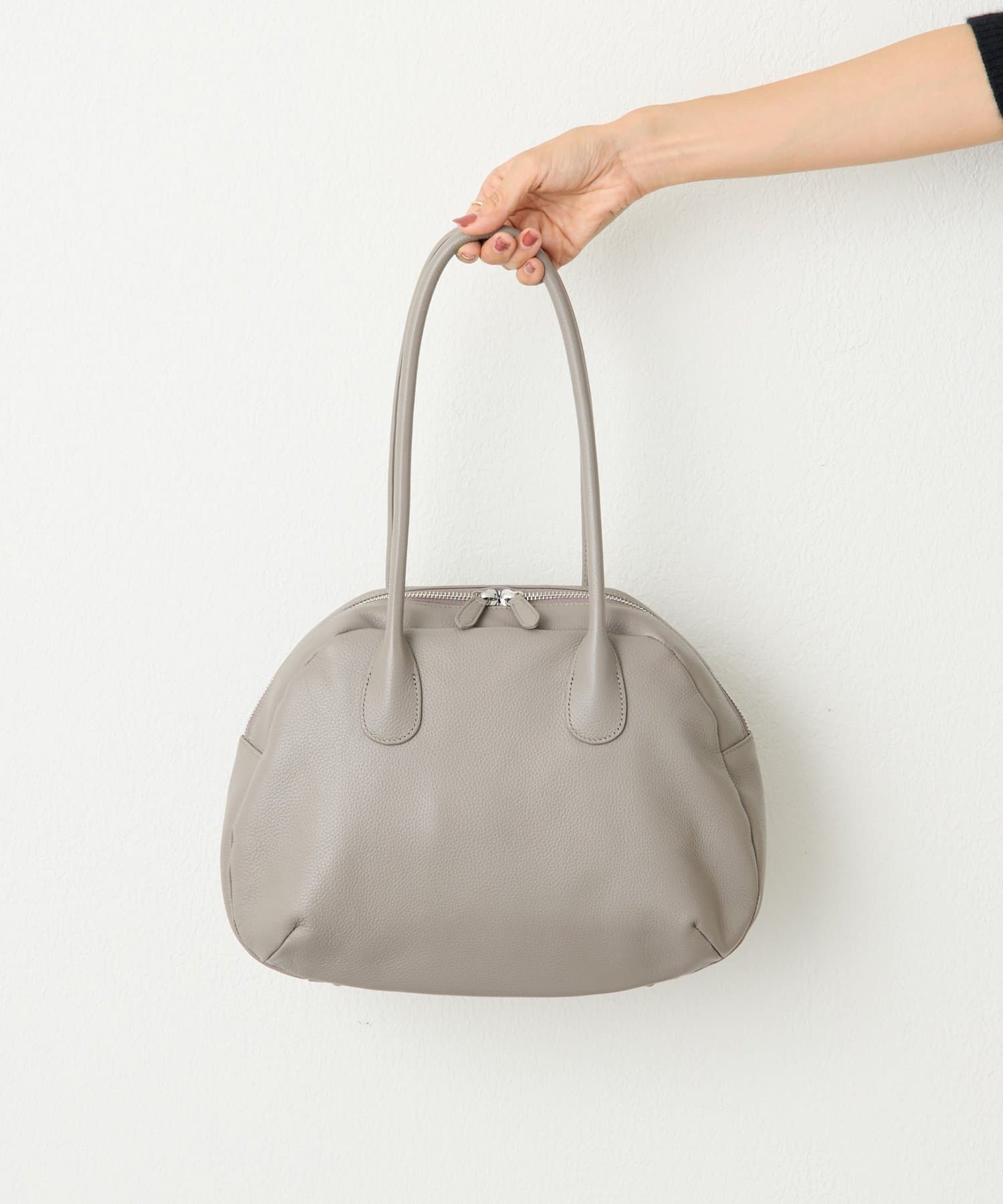 ラウンドミニボストンバッグの丸みのある柔らかなフォルムはそのままに、ひと回り大きなサイズと長めの持ち手で肩掛けもできる仕様になりました。