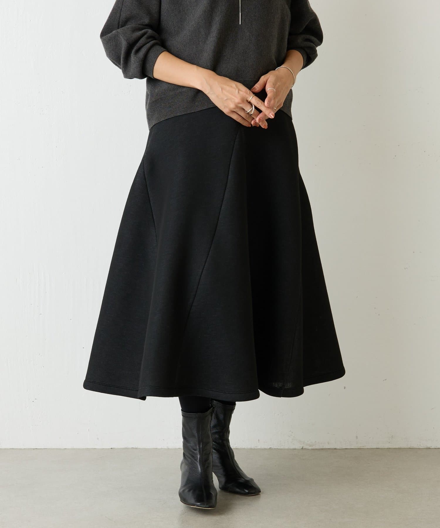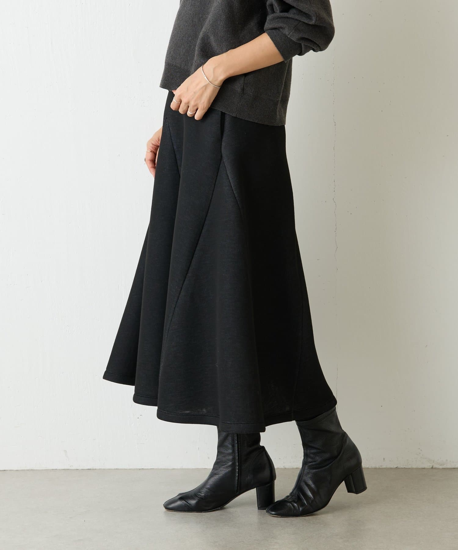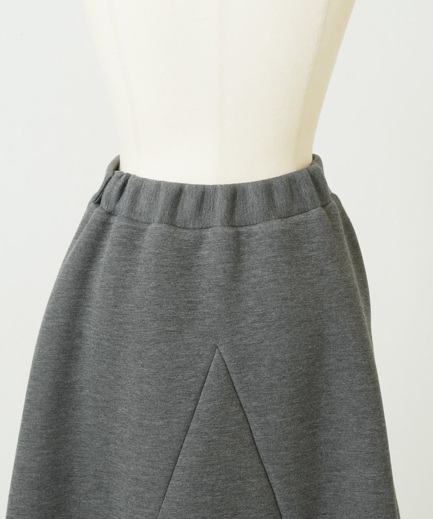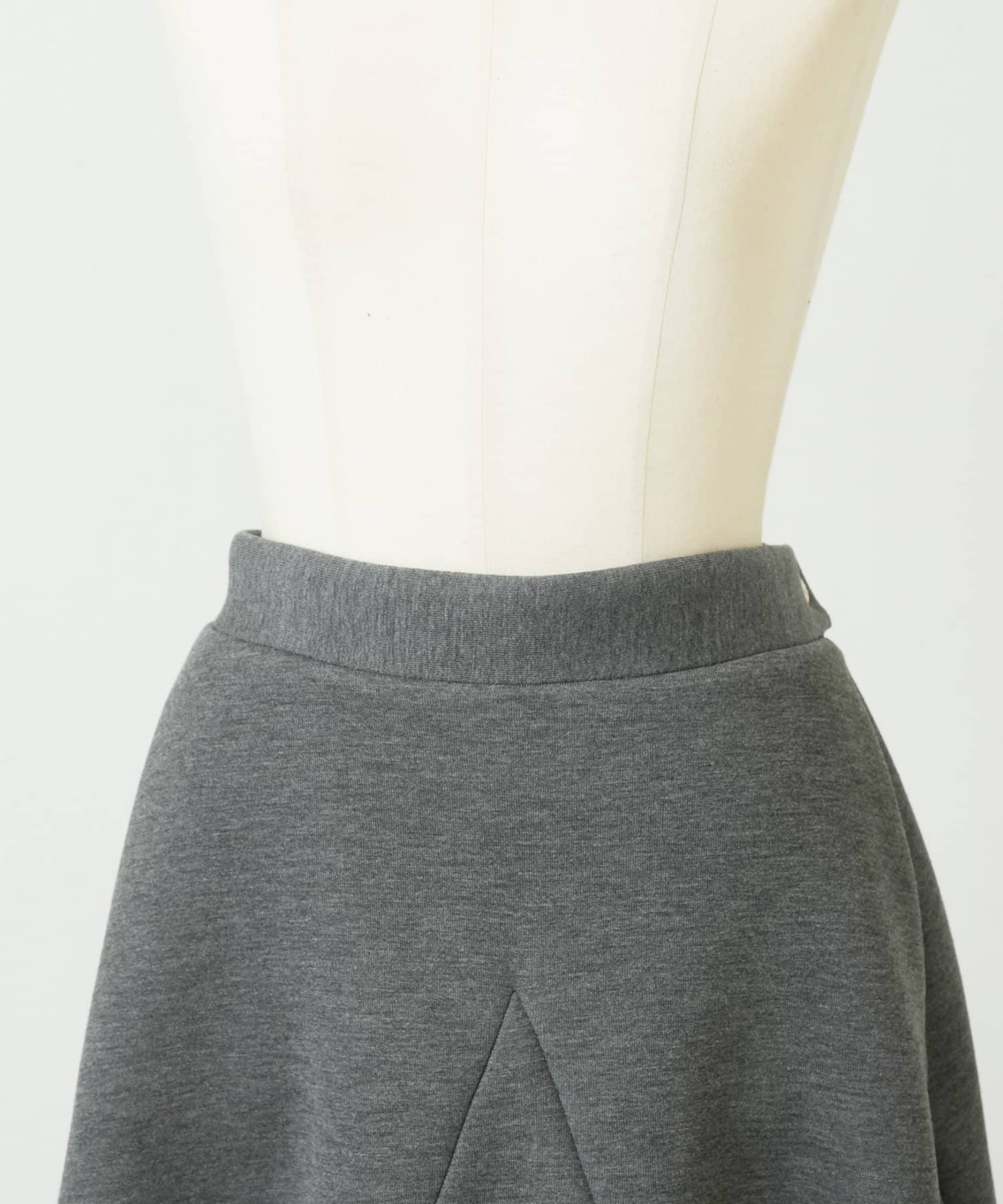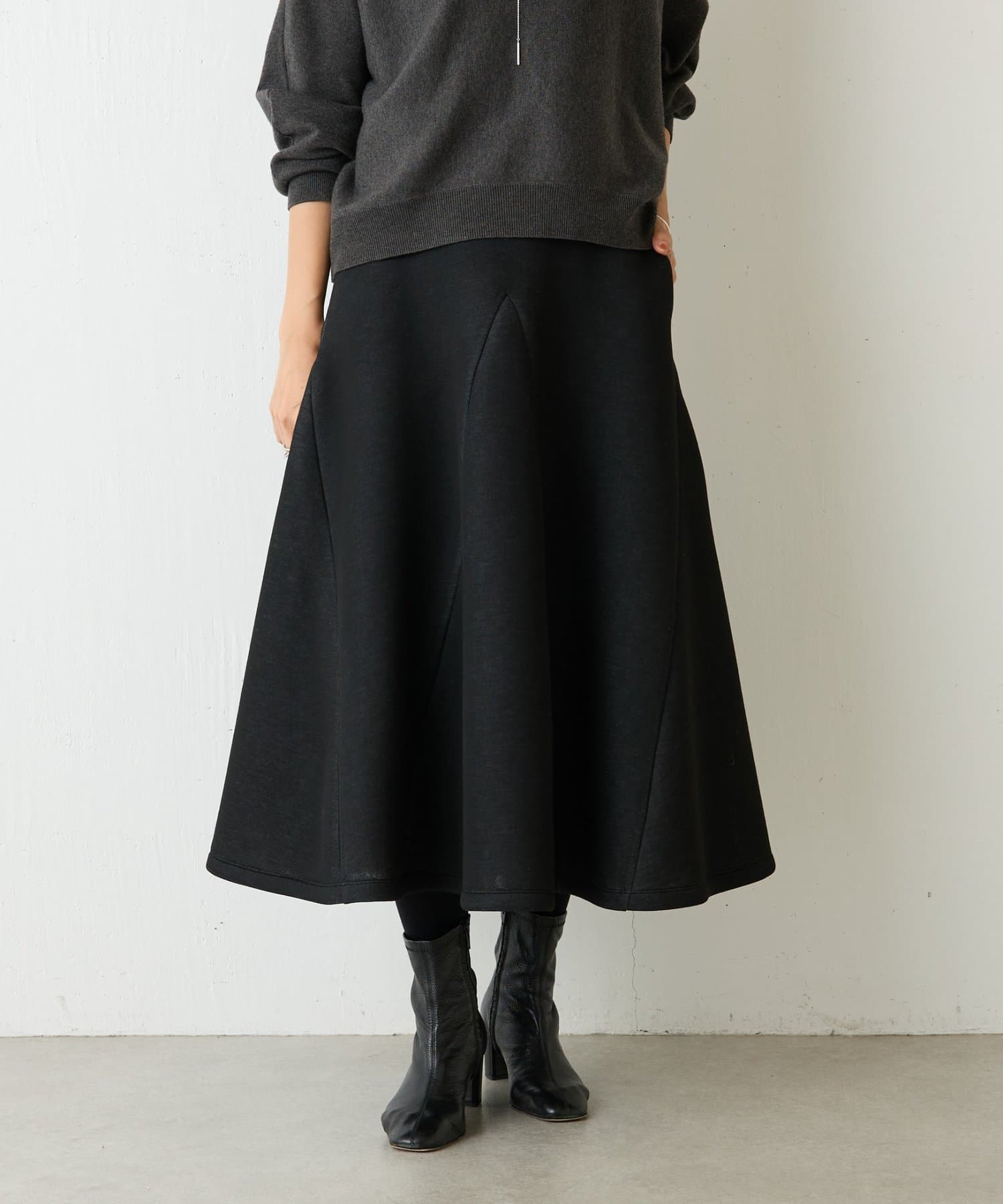 大胆なカッティングと素材感が魅力のミドル丈スカート。