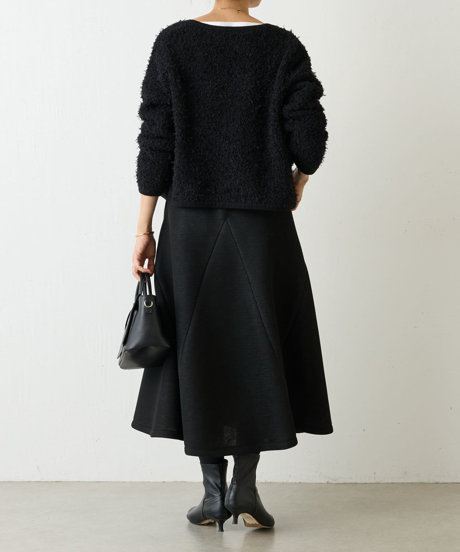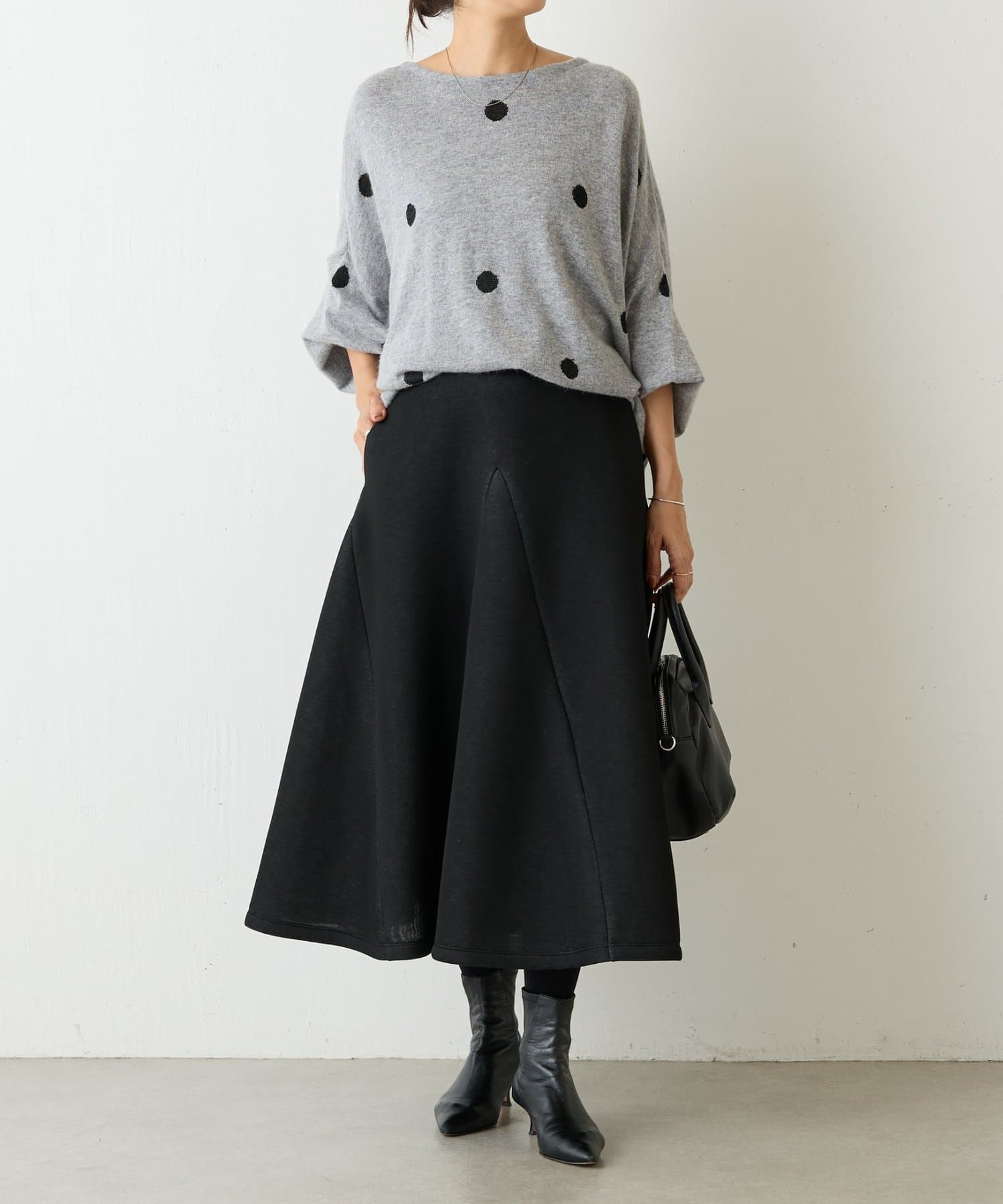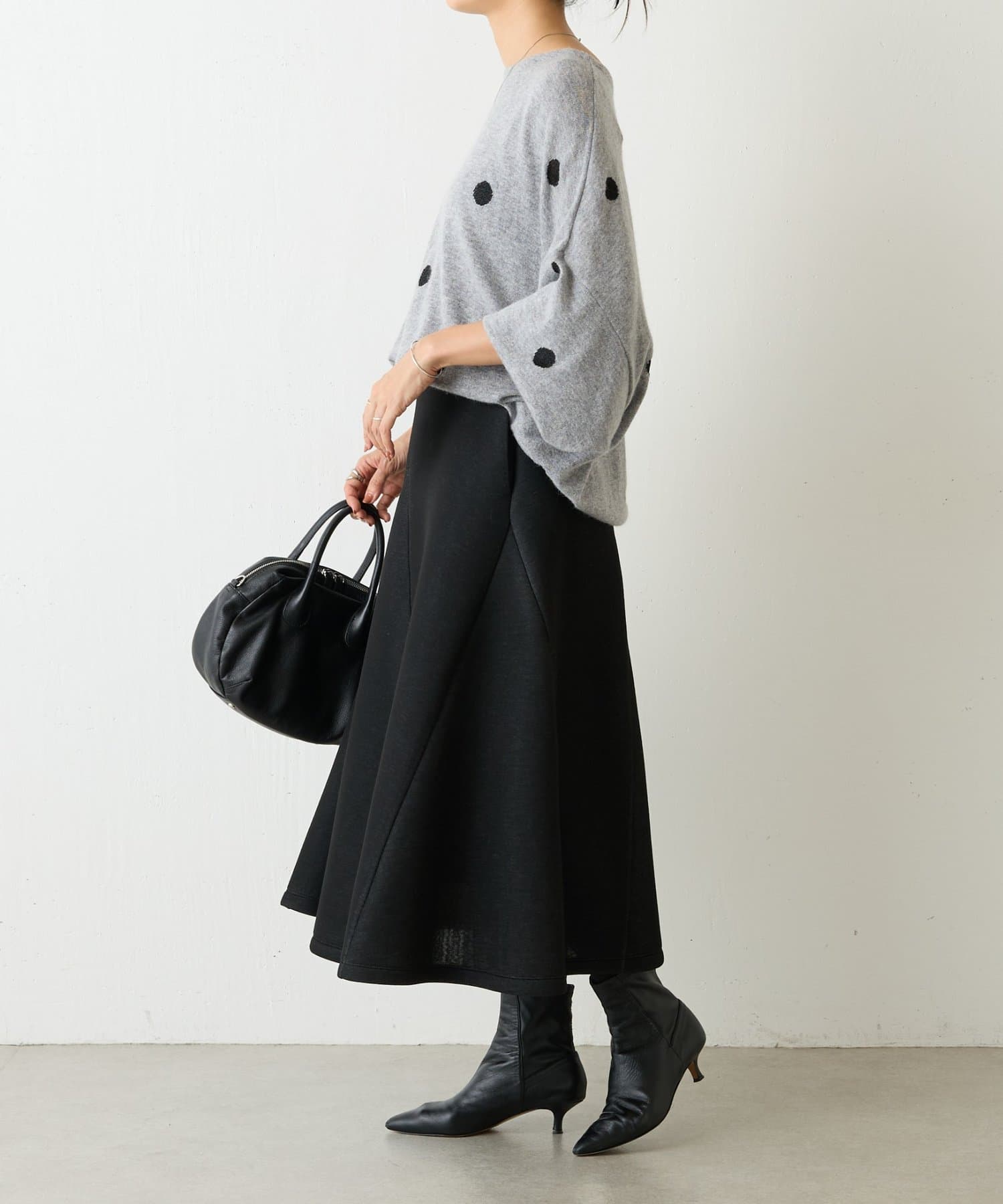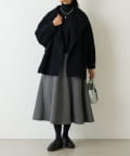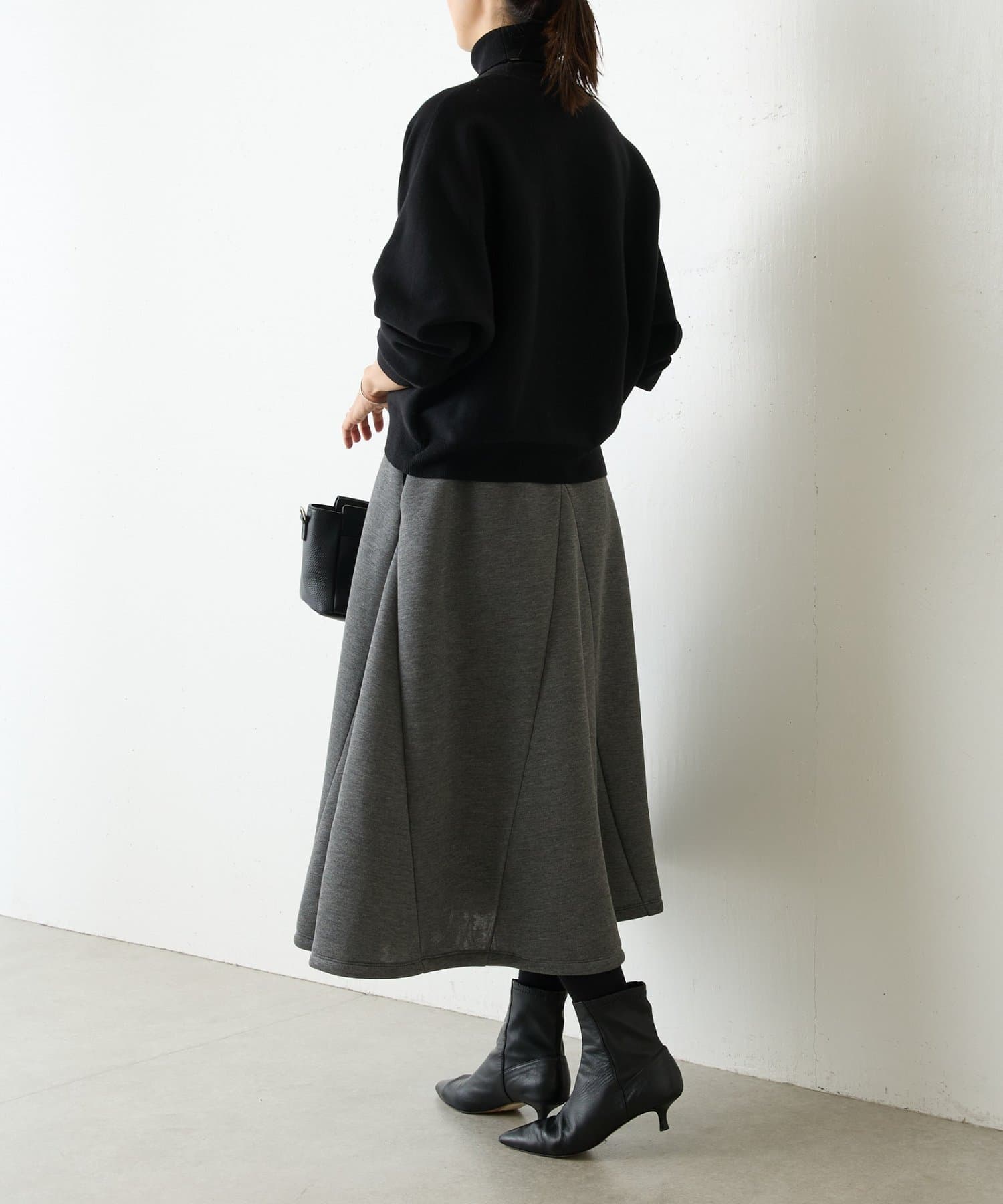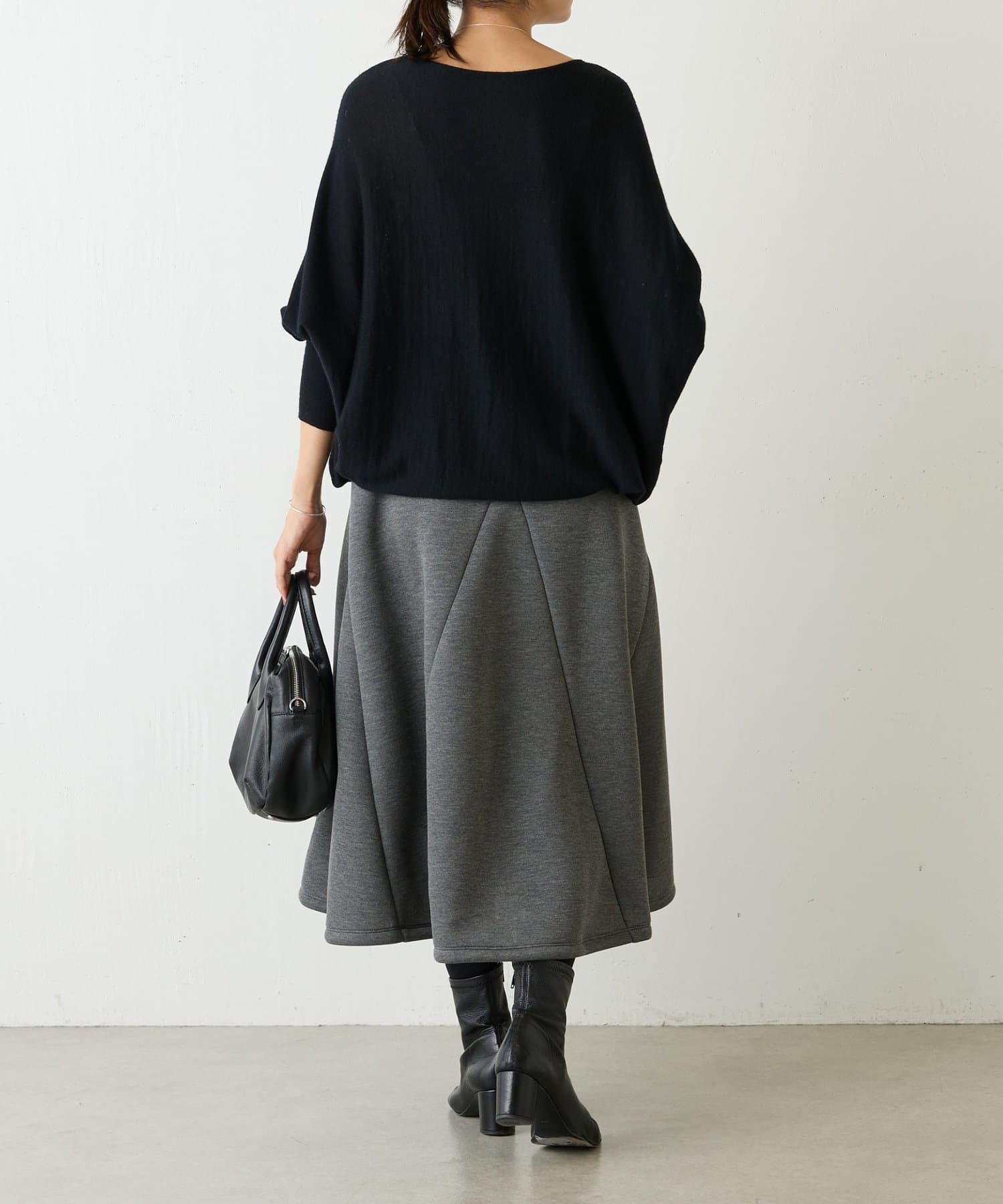 大胆なカッティングと素材感が魅力のミドル丈スカート。