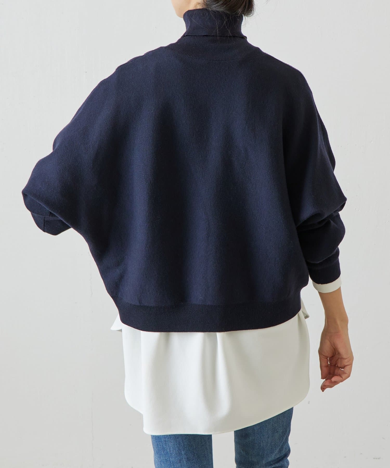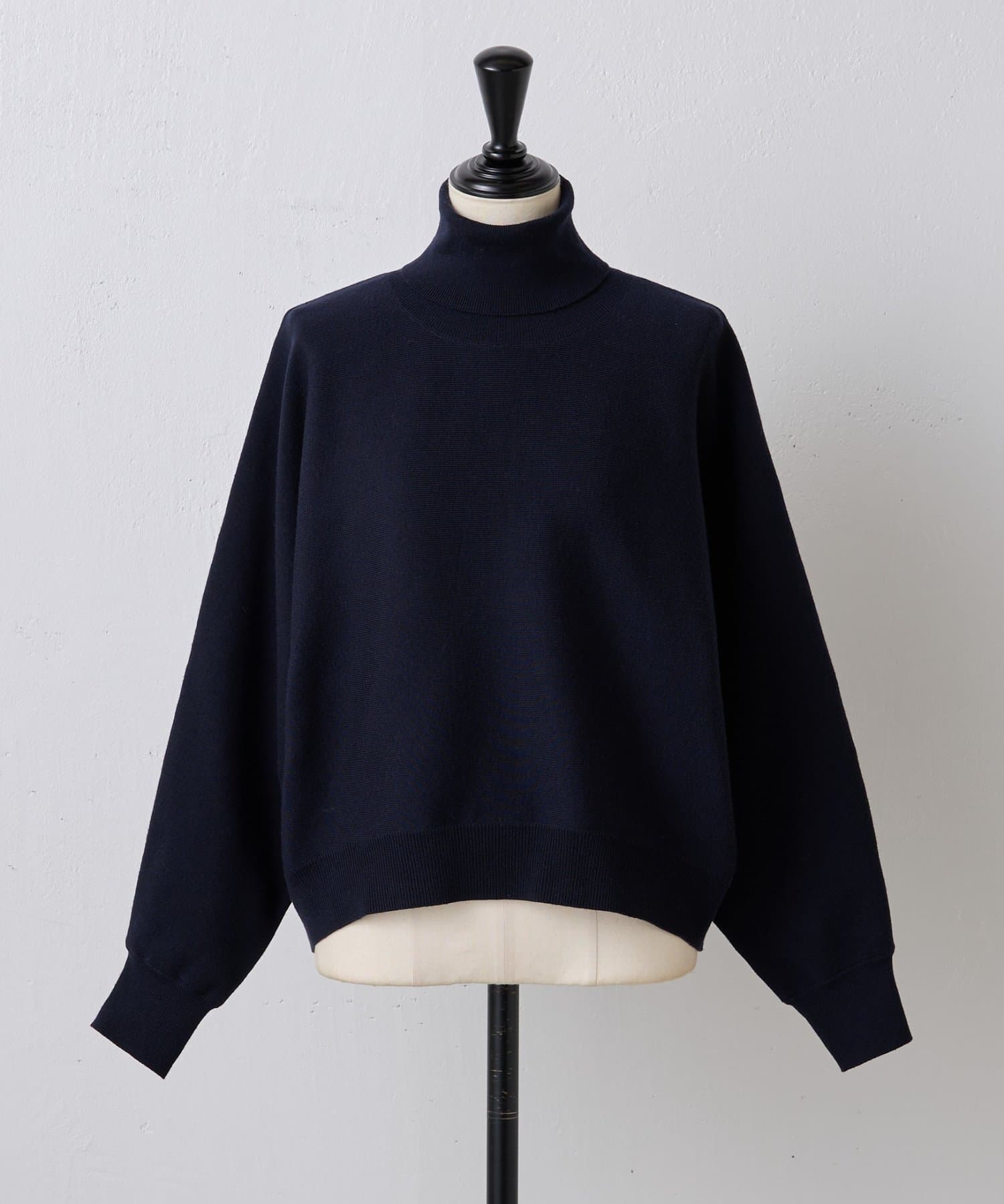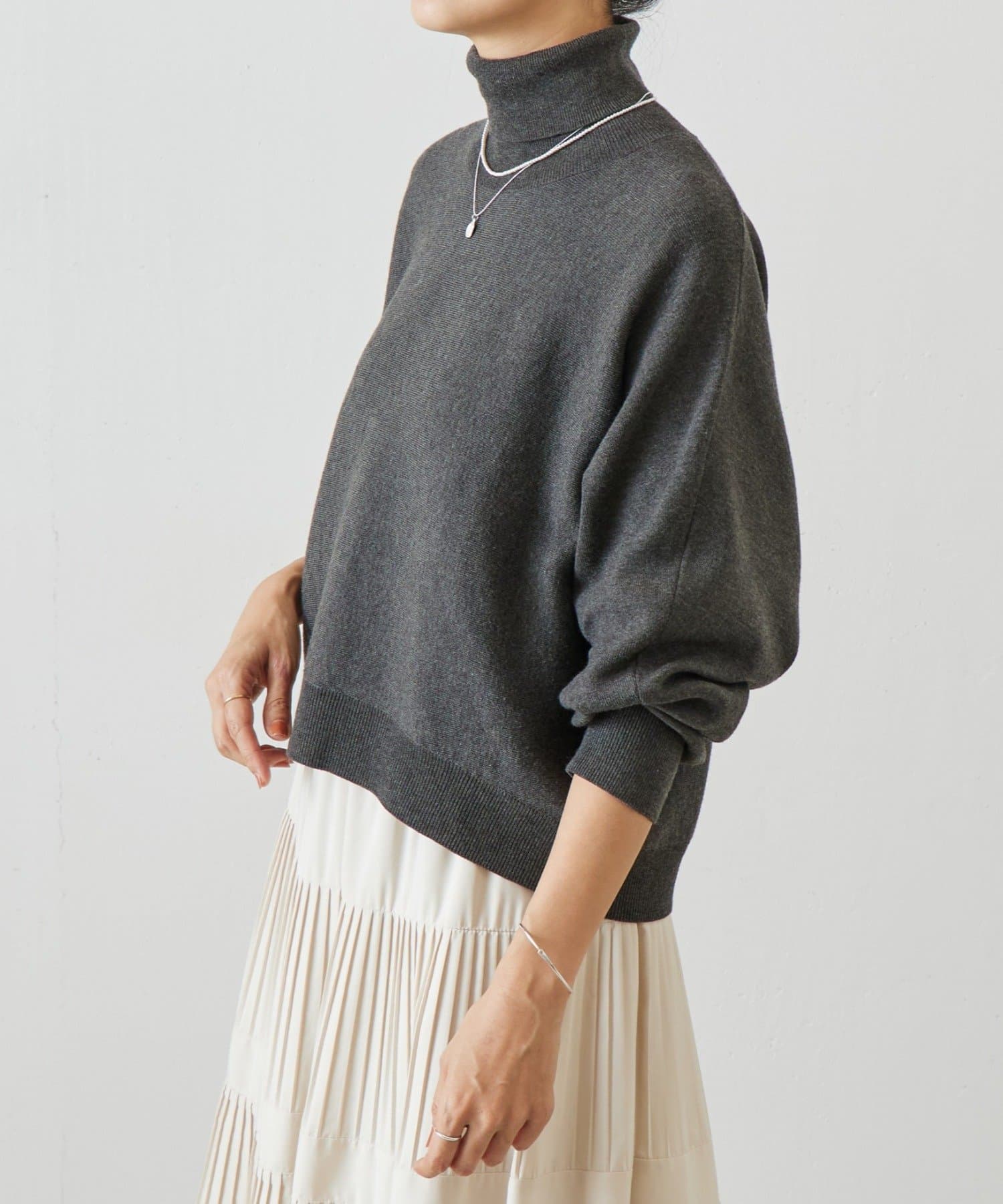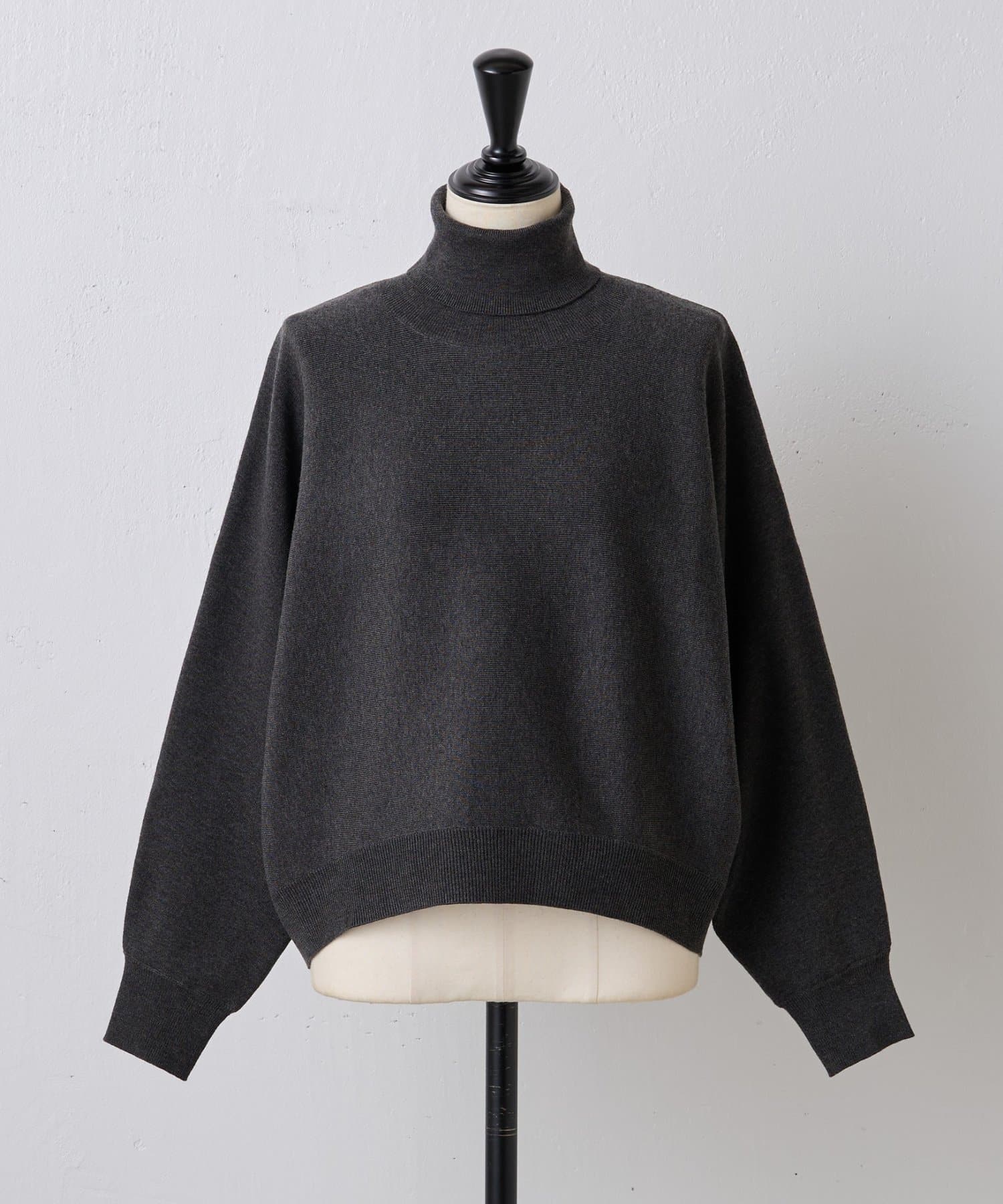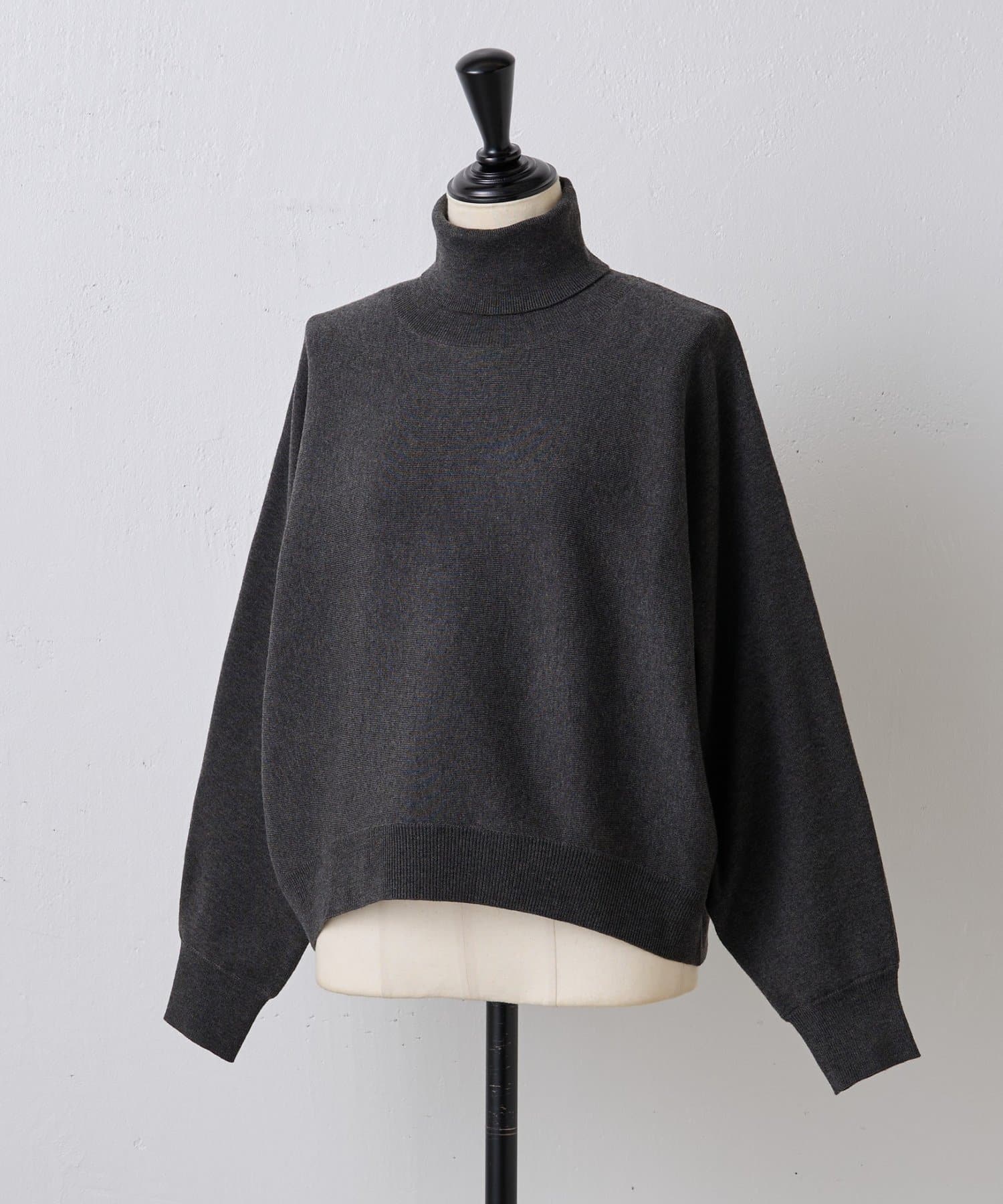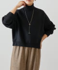 ベーシックな形で着回しやすい、ハイネックのドルマンニット。
