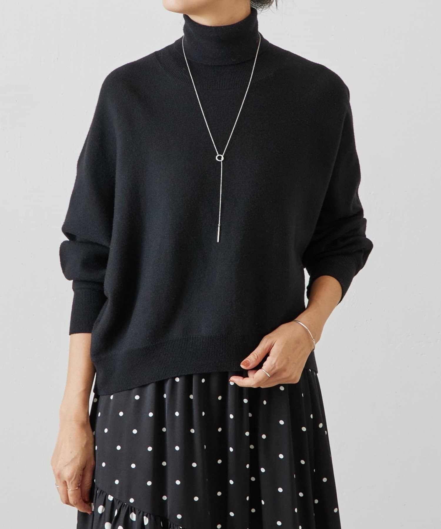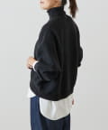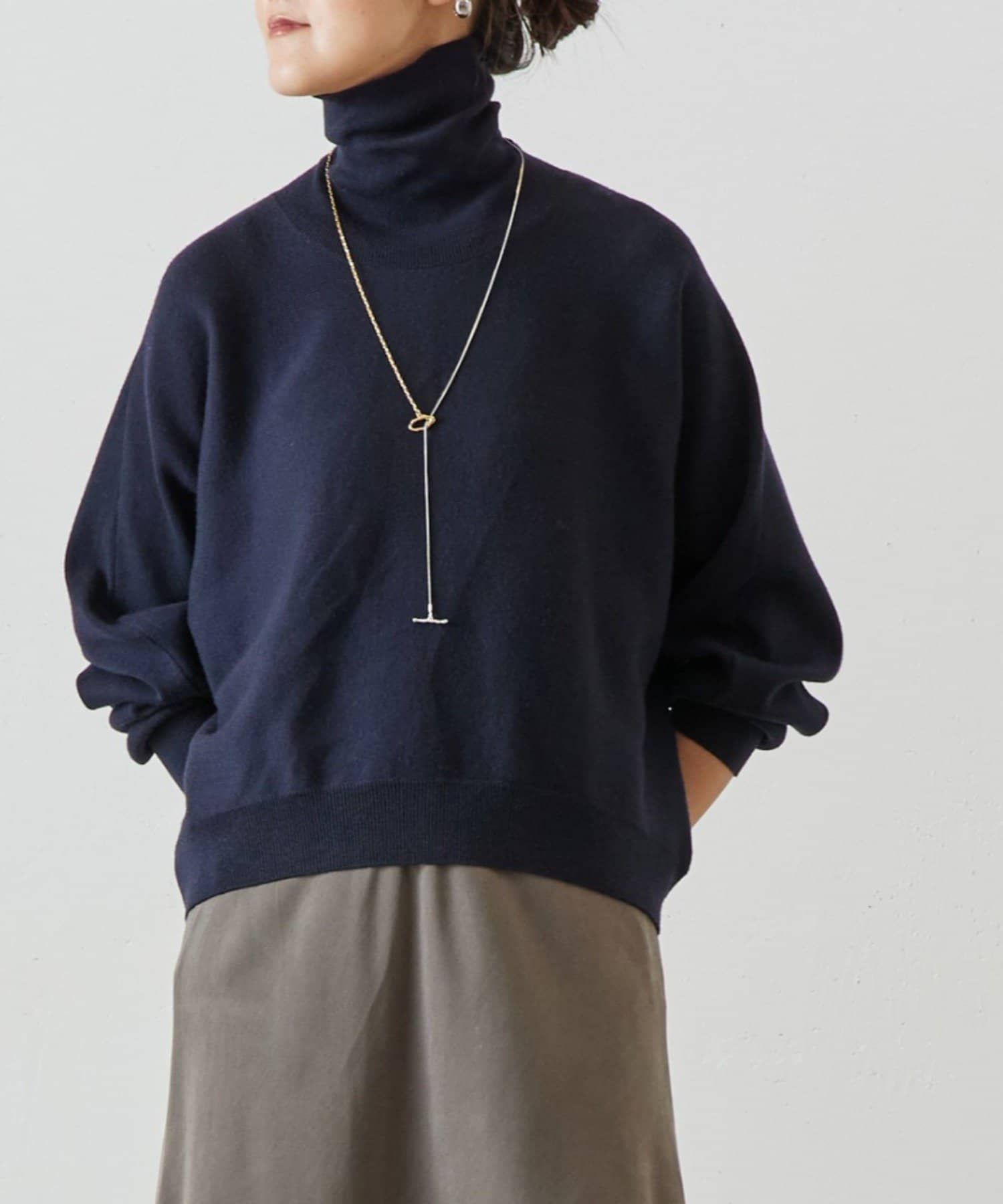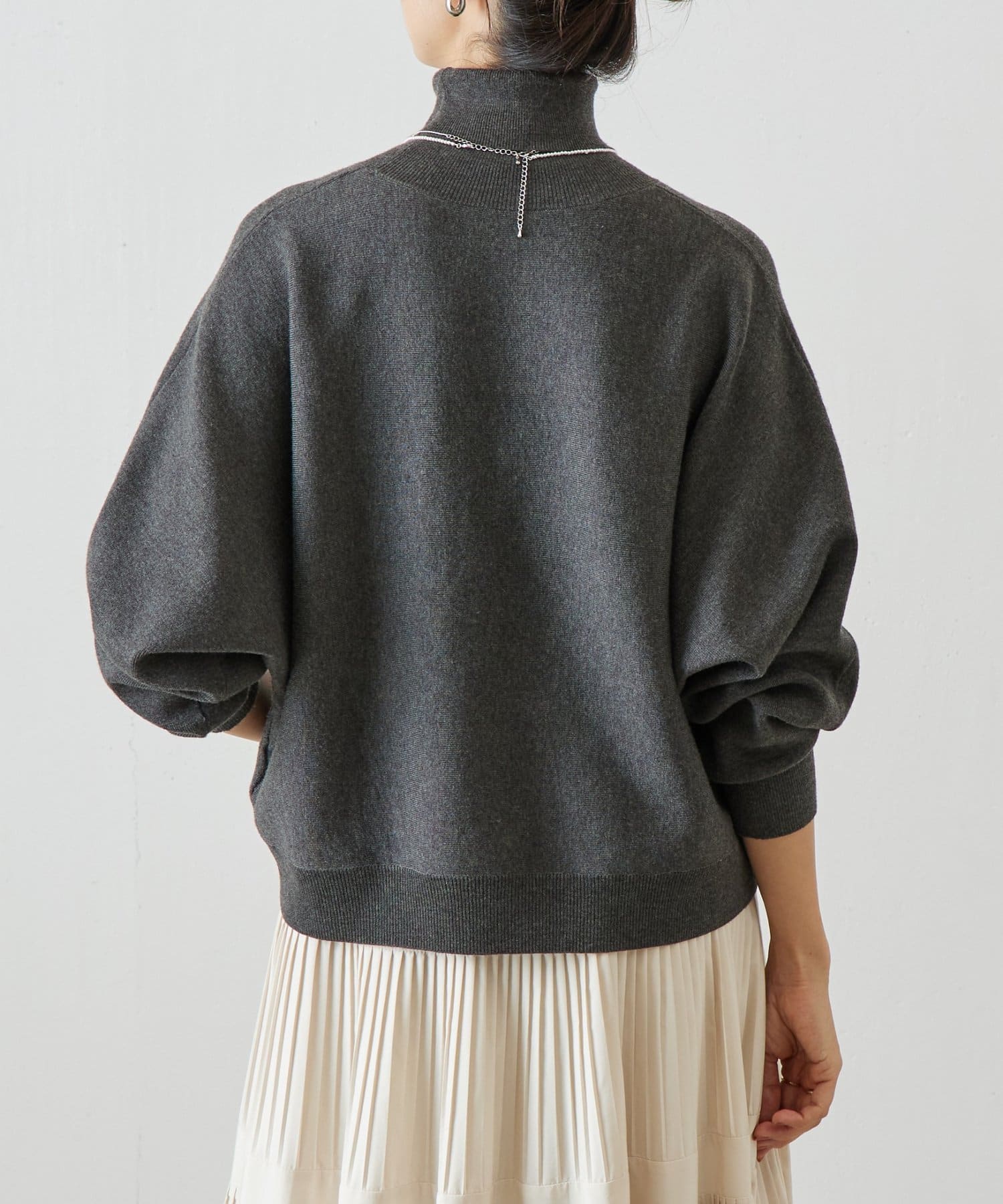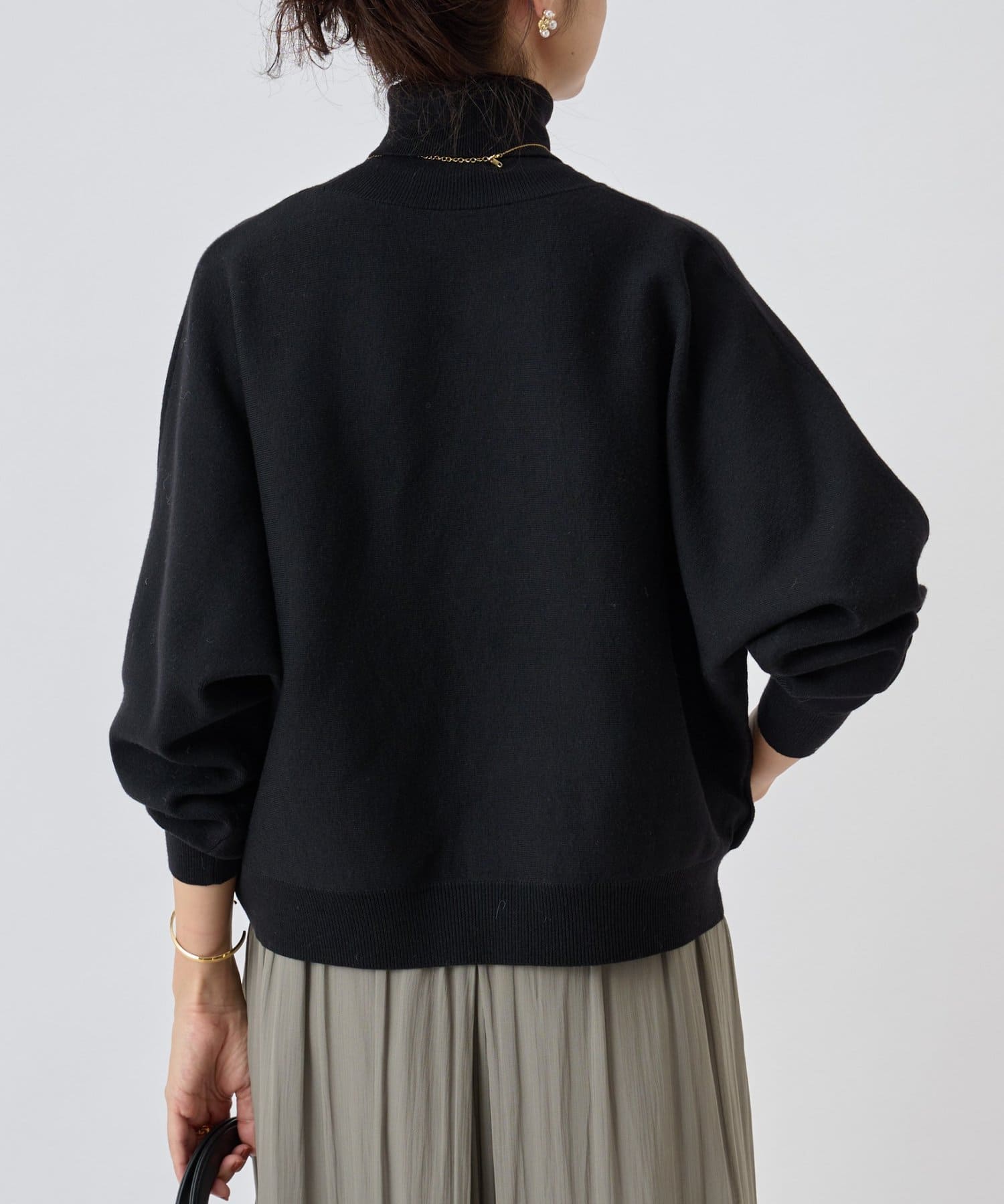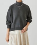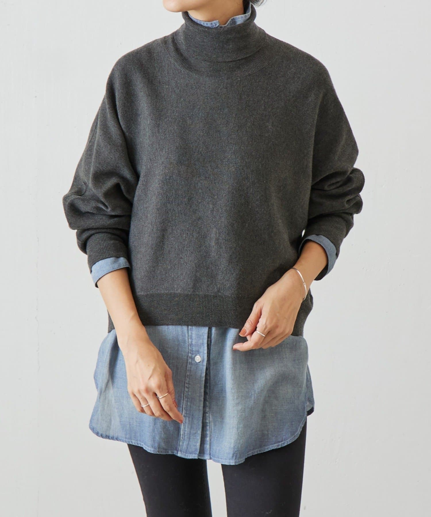 ベーシックな形で着回しやすい、ハイネックのドルマンニット。